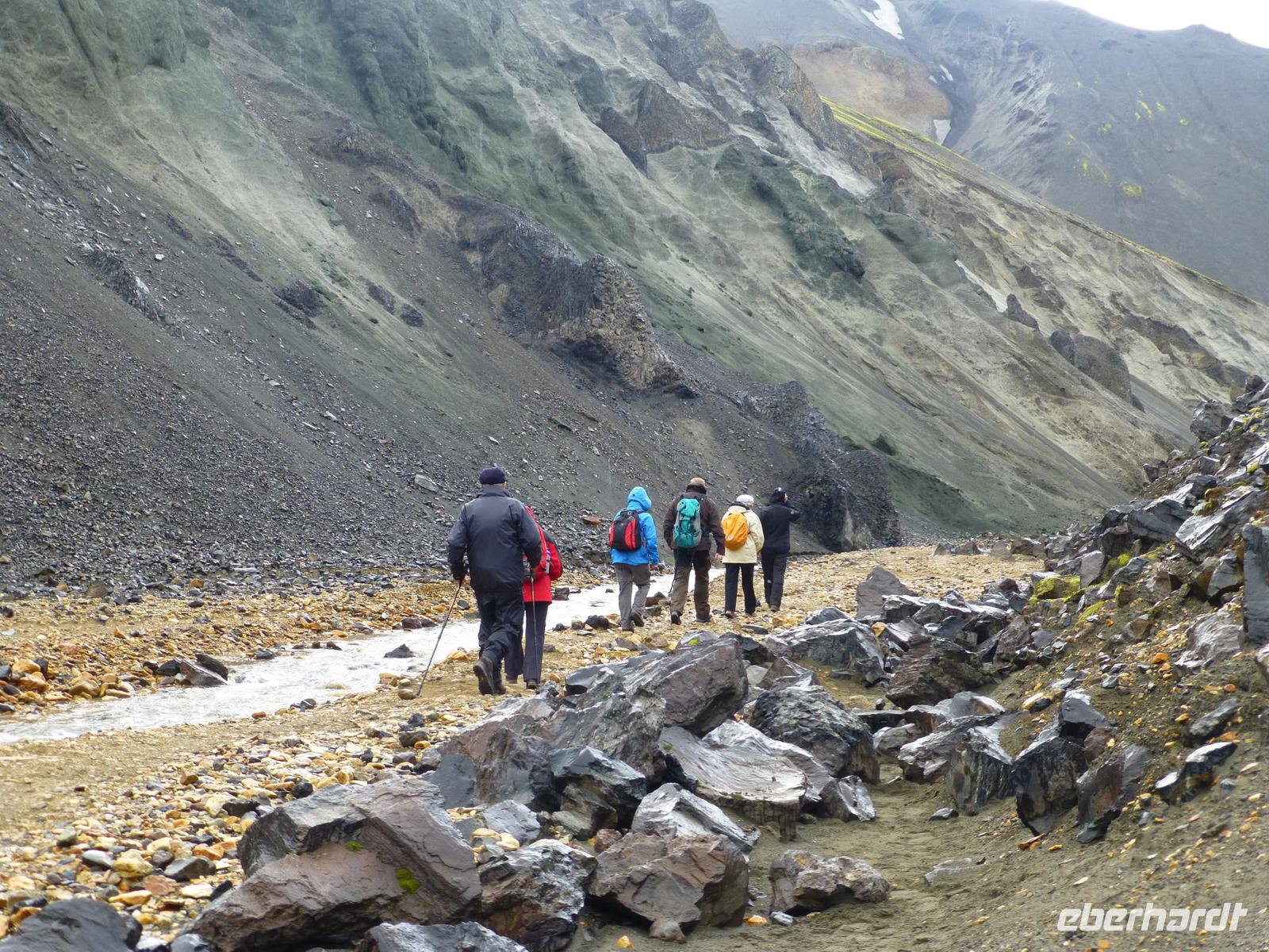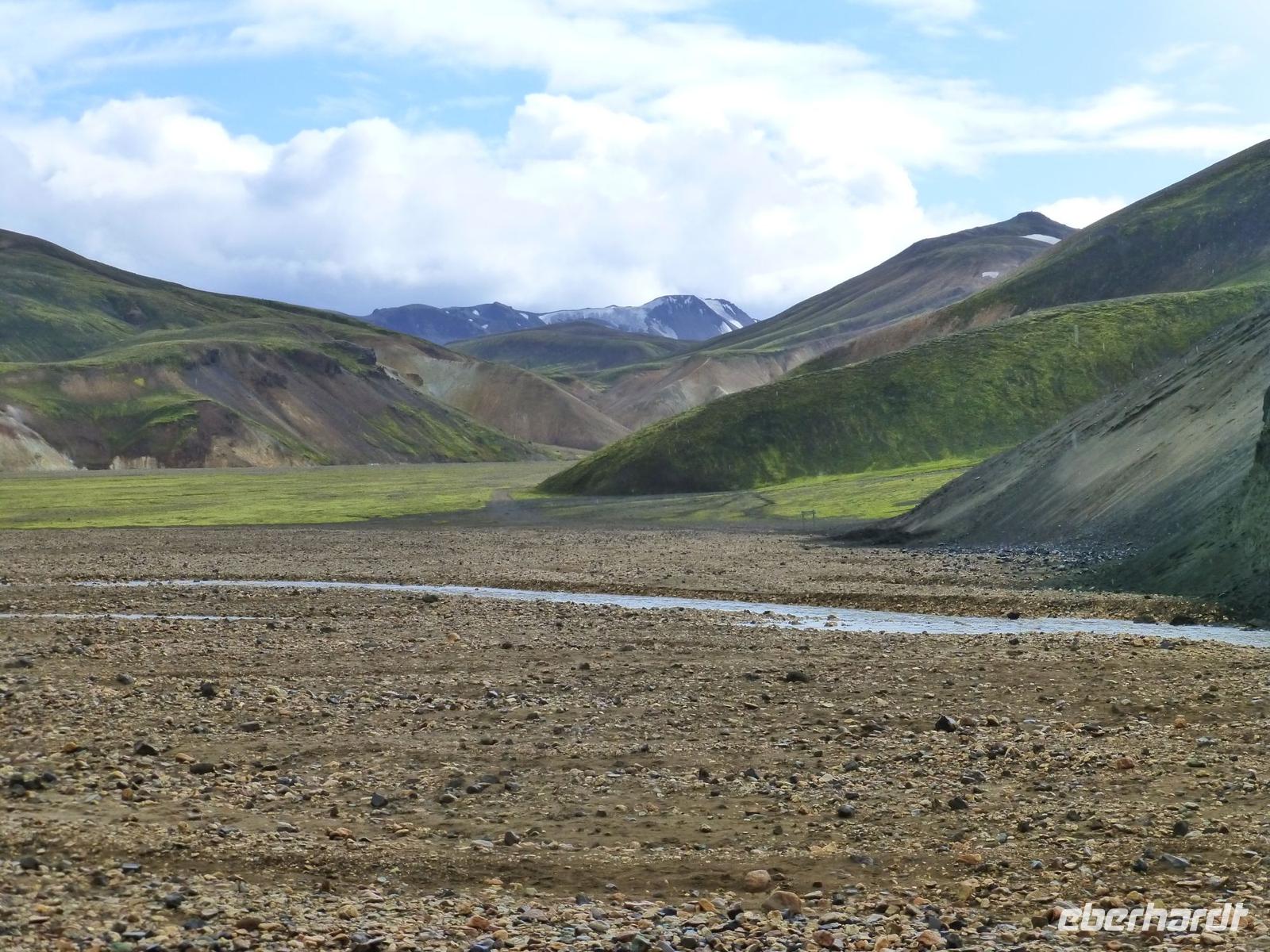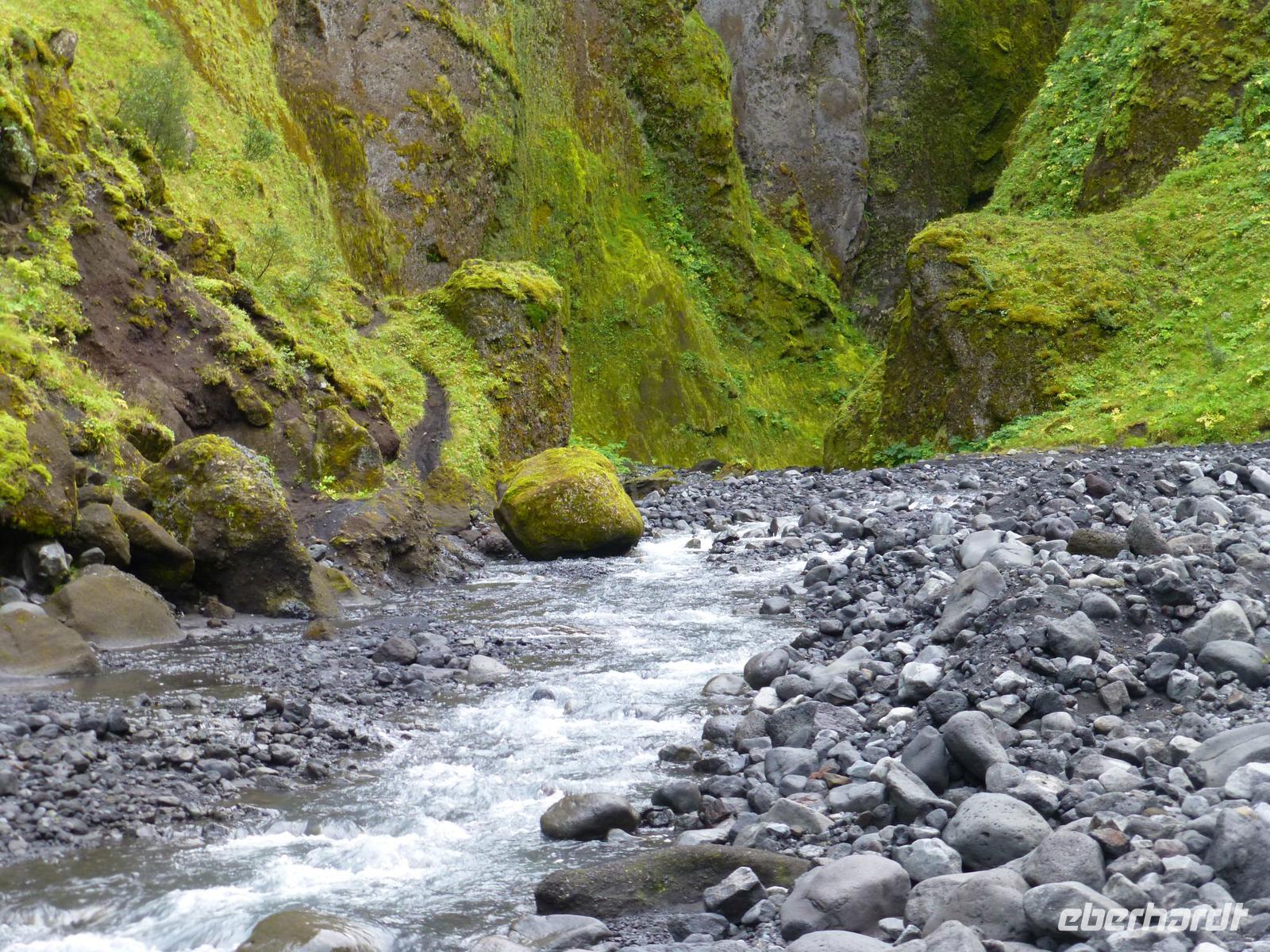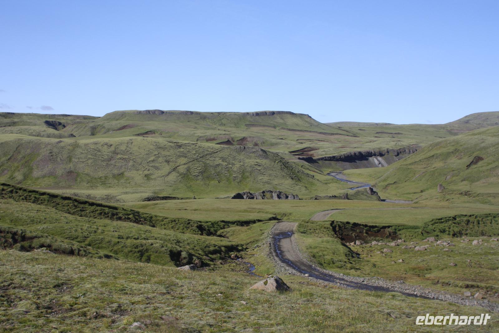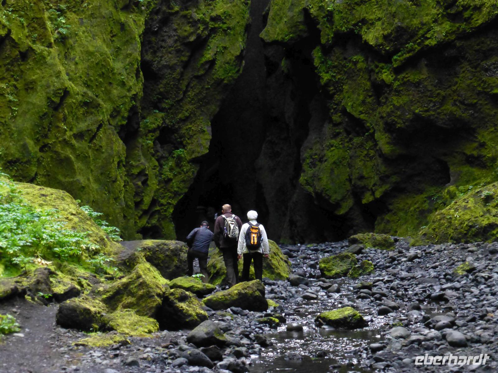 Über eine Schotterstraße ging es dann durch grüne Ebenen ins Gletschertal Thorsmörk, was übersetzt „Thors Wald" bedeutet, also der Wald des alten germanischen Gottes Thor. Das Tal wird flankiert von mächtigen Gletschern, einer davon ist die Gletscherzunge des berühmten Vulkans Eyjafjallajökull, der 2010 den Flugverkehr in ganz Europa zum Stillstand brachte. Einige Fahrtminuten weiter halten wir am Fuße der Bergkette.