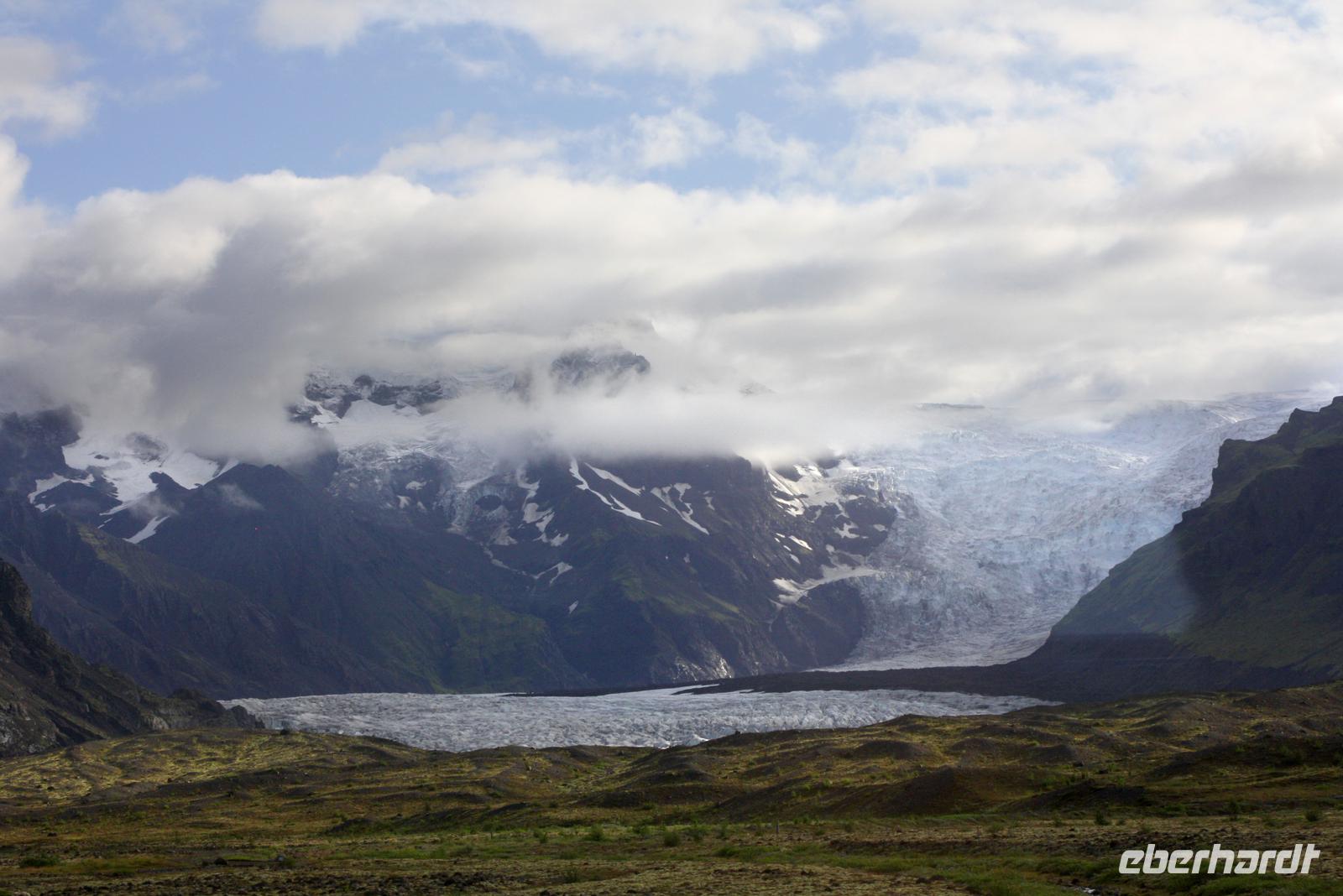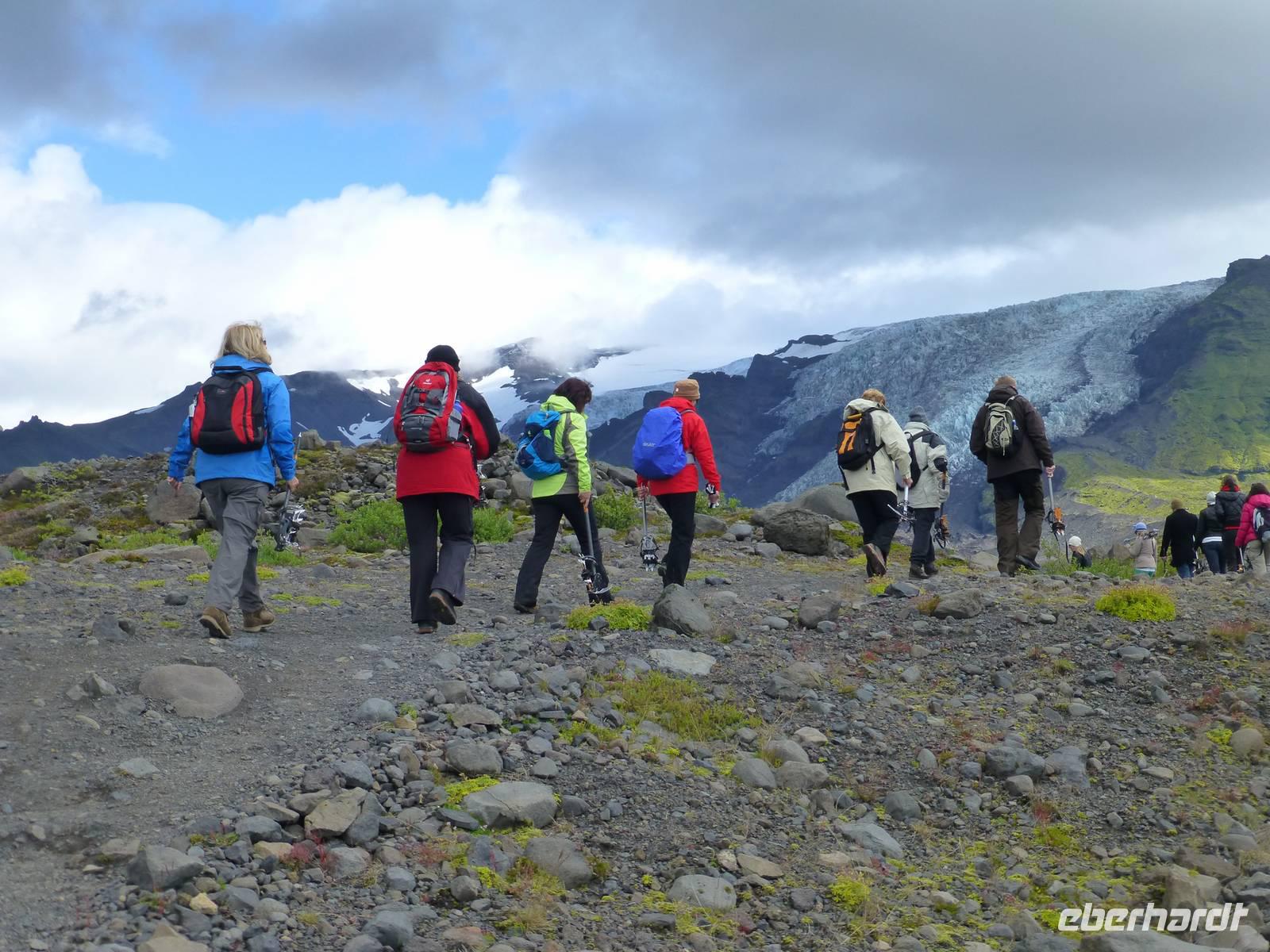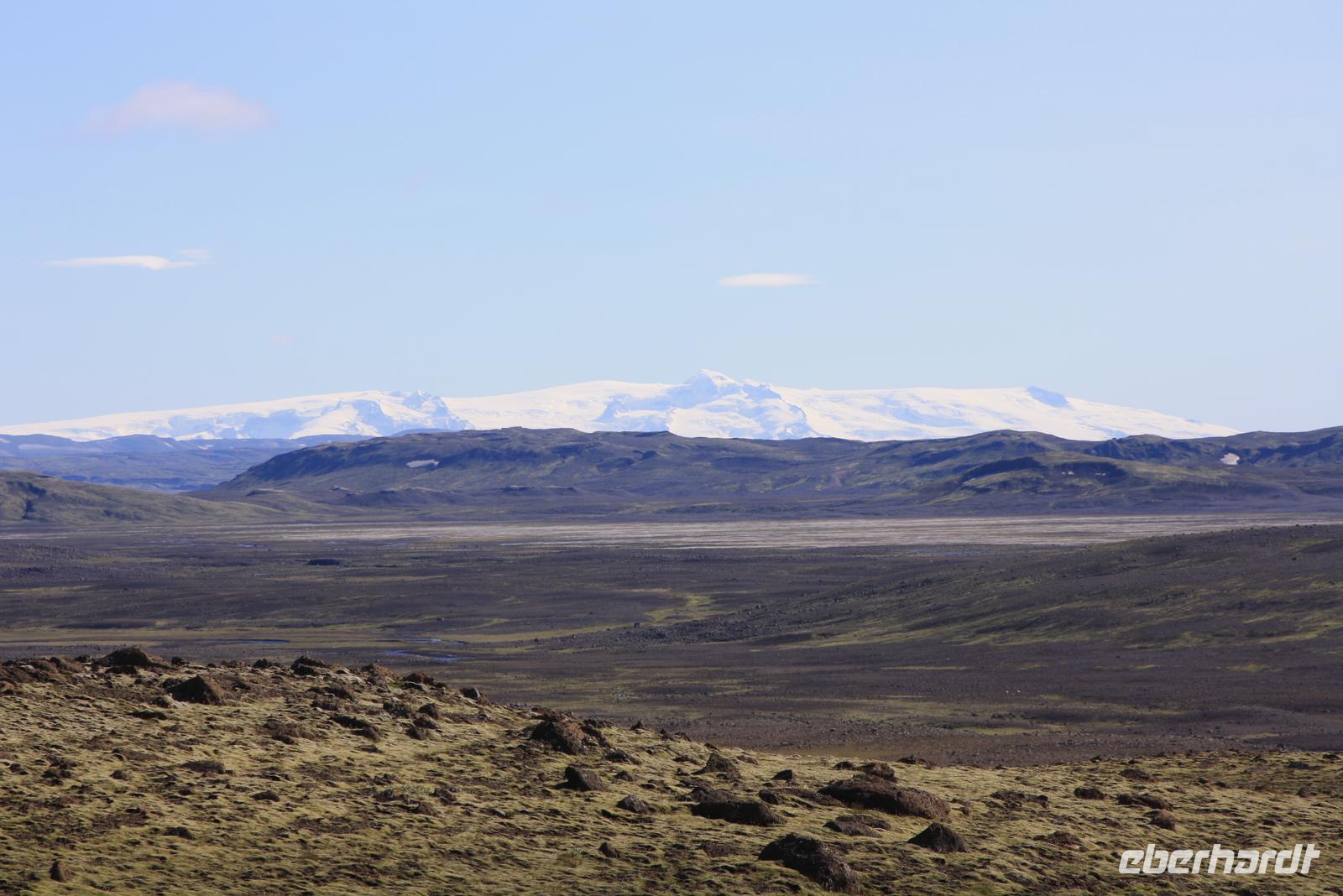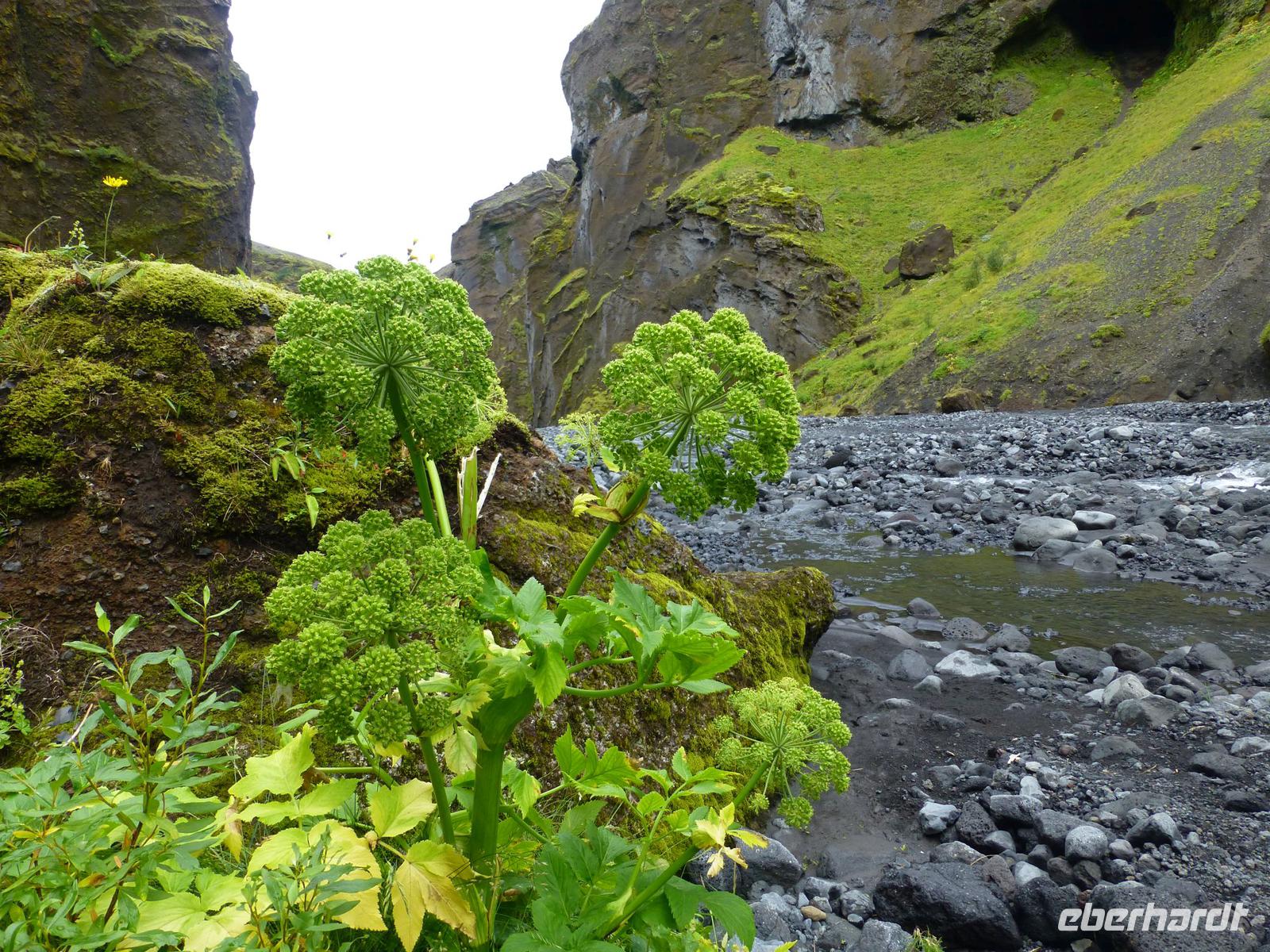 Über eine Schotterstraße ging es dann durch grüne Ebenen ins Gletschertal Thorsmörk, was übersetzt „Thors Wald" bedeutet, also der Wald des alten germanischen Gottes Thor. Das Tal wird flankiert von mächtigen Gletschern, einer davon ist die Gletscherzunge des berühmten Vulkans Eyjafjallajökull, der 2010 den Flugverkehr in ganz Europa zum Stillstand brachte. Einige Fahrtminuten weiter halten wir am Fuße der Bergkette.
