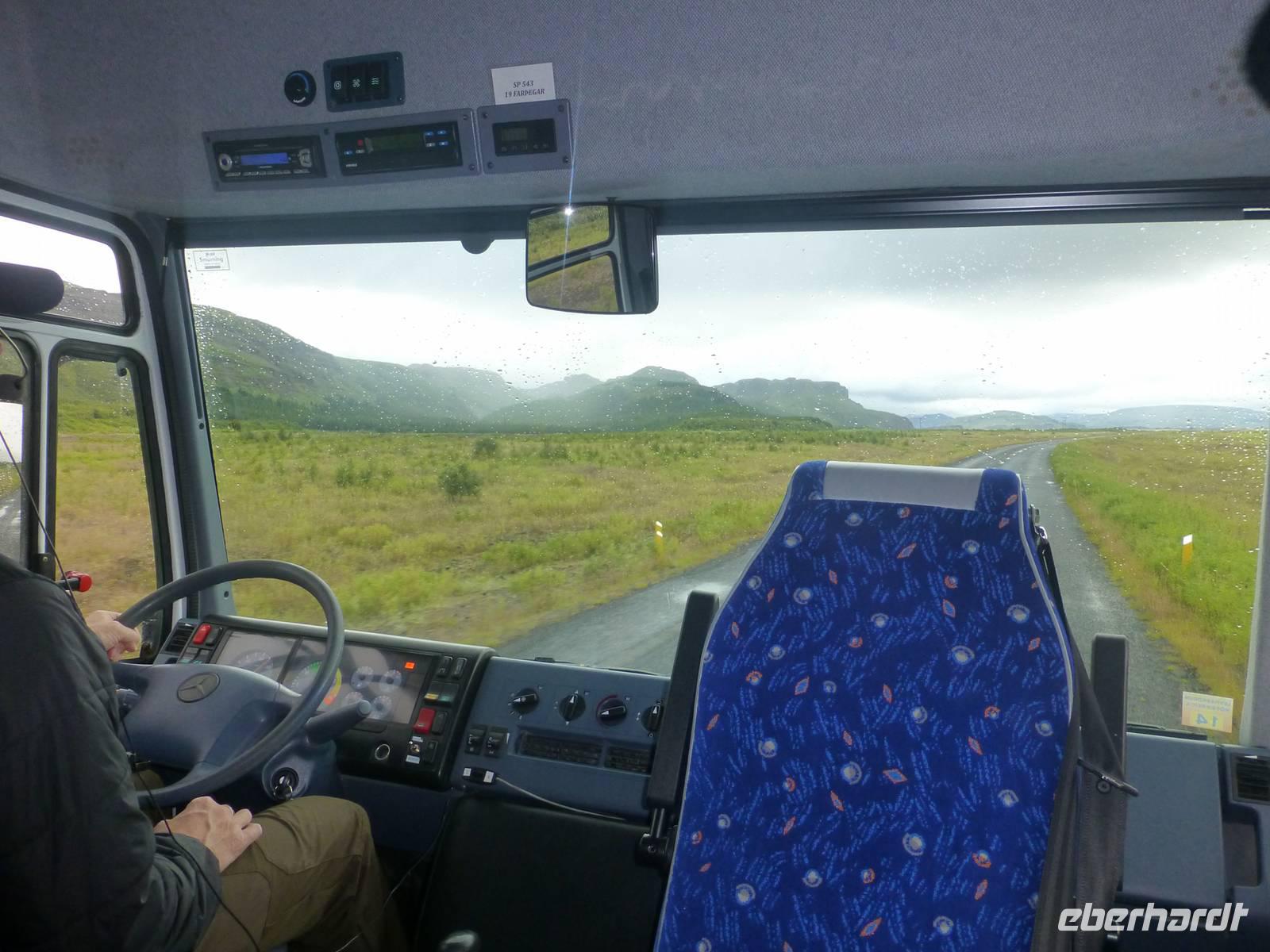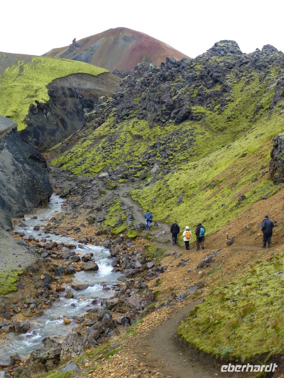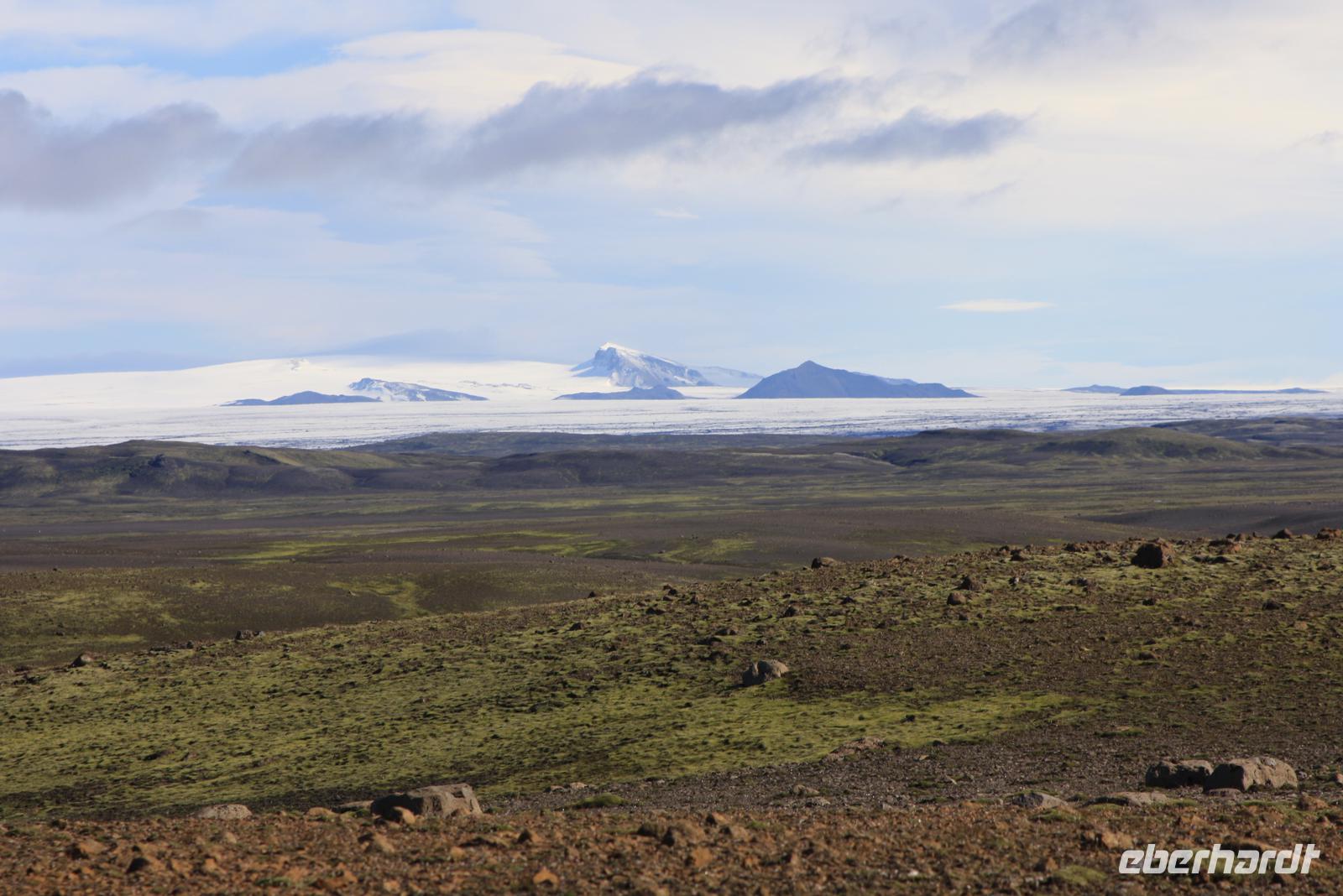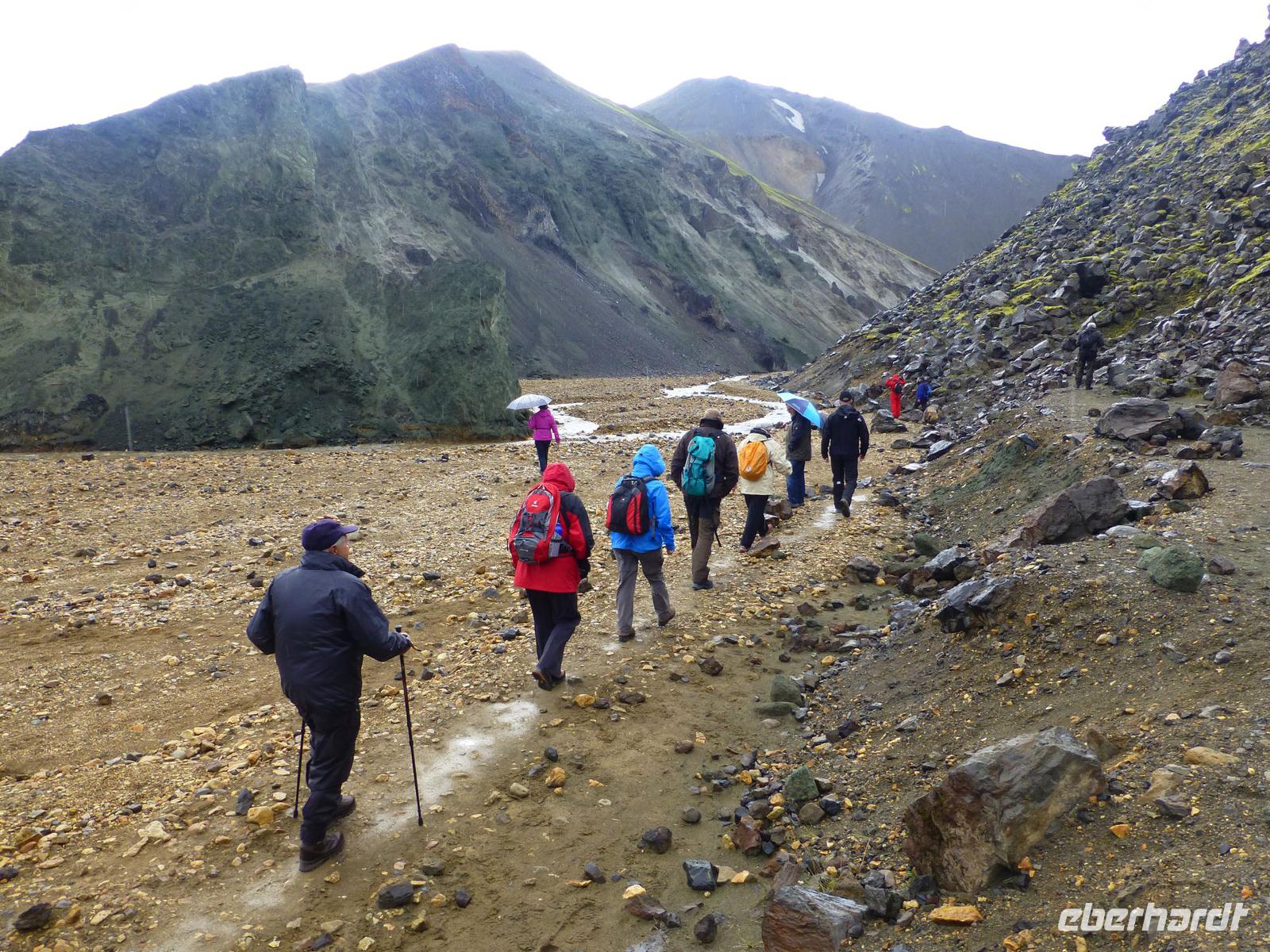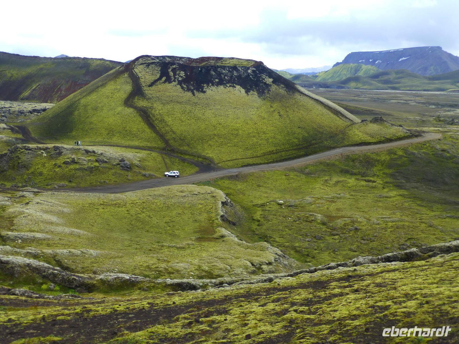 Über eine Schotterstraße ging es dann durch grüne Ebenen ins Gletschertal Thorsmörk, was übersetzt „Thors Wald" bedeutet, also der Wald des alten germanischen Gottes Thor. Das Tal wird flankiert von mächtigen Gletschern, einer davon ist die Gletscherzunge des berühmten Vulkans Eyjafjallajökull, der 2010 den Flugverkehr in ganz Europa zum Stillstand brachte. Einige Fahrtminuten weiter halten wir am Fuße der Bergkette.