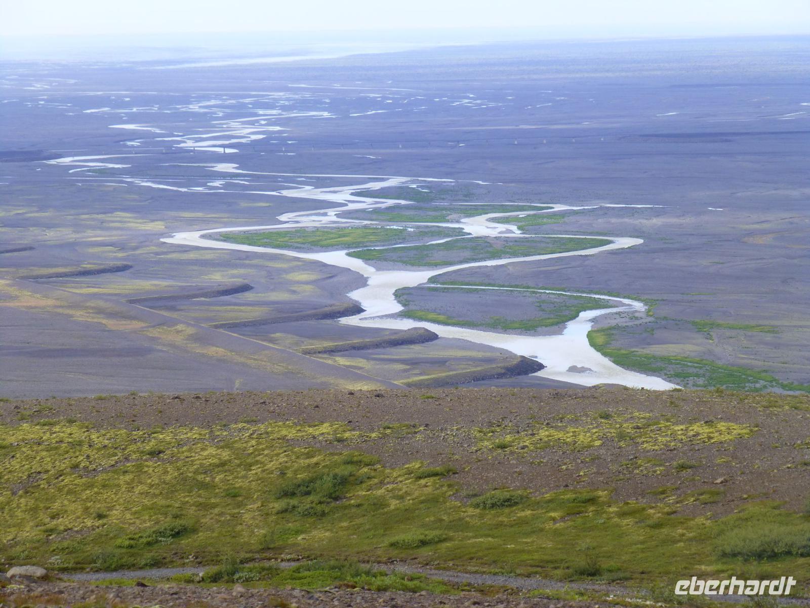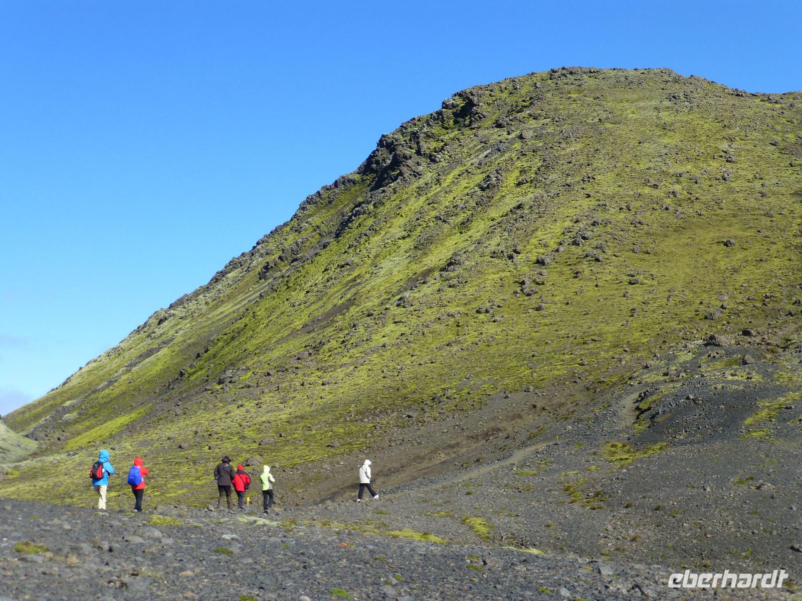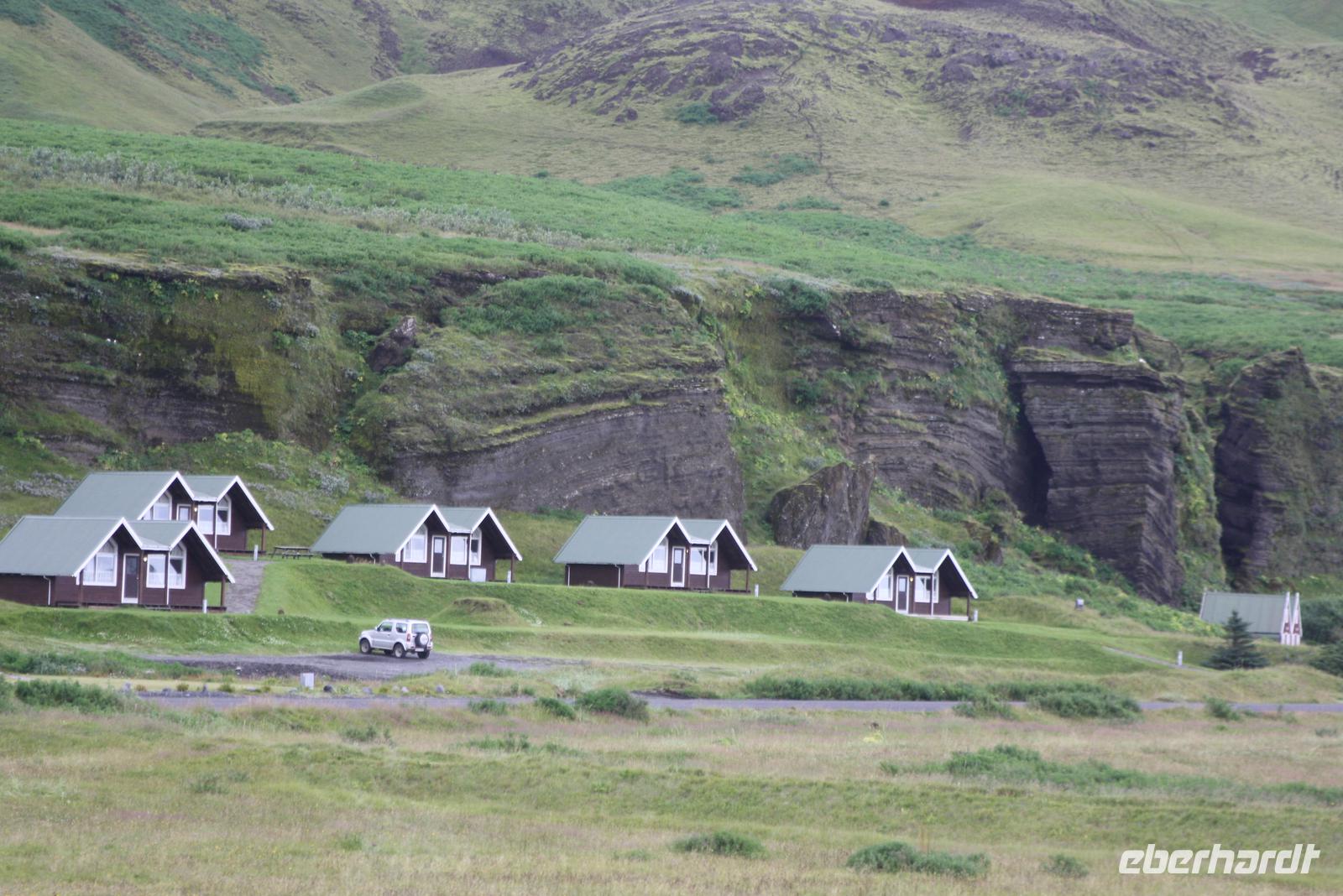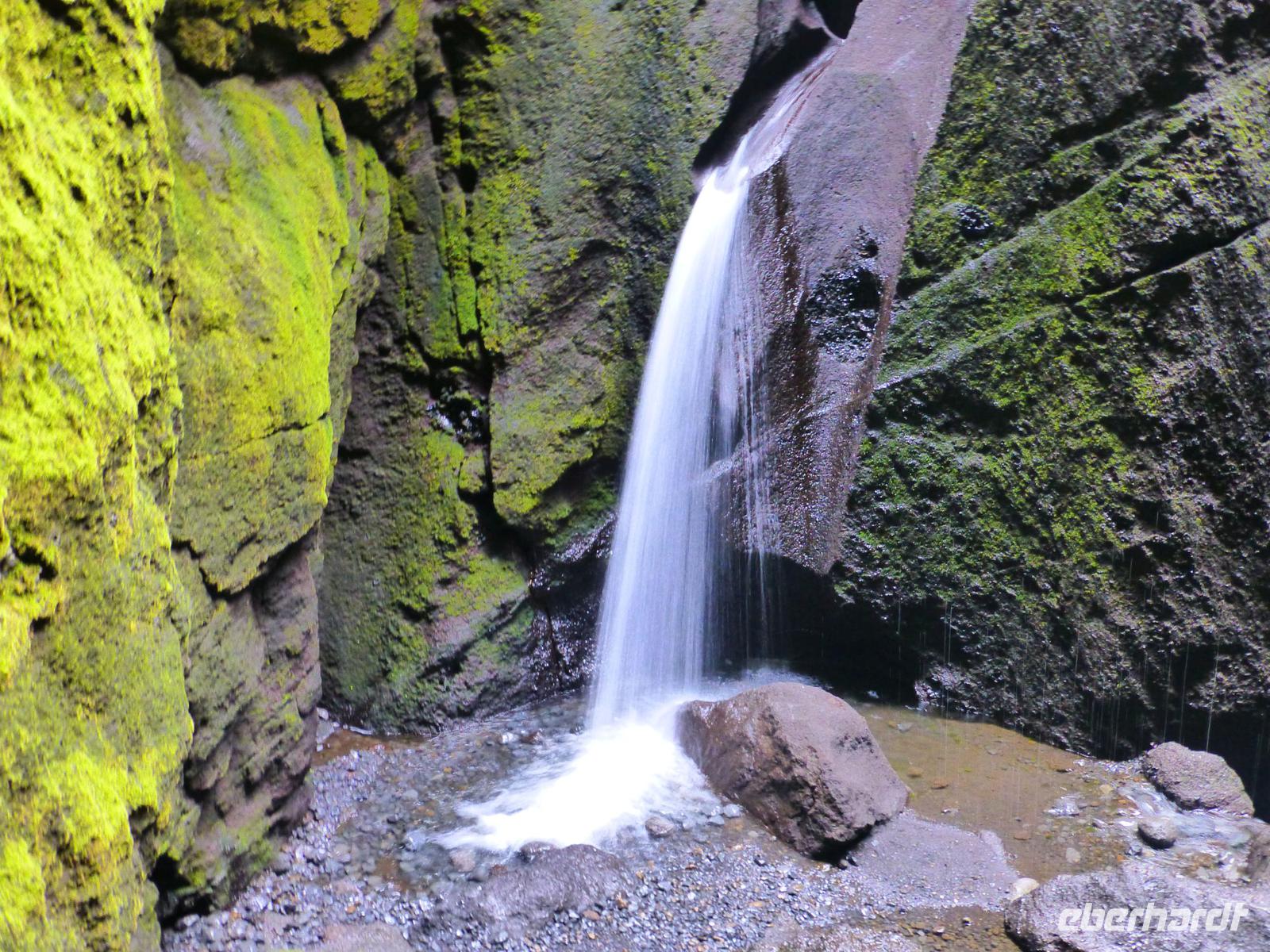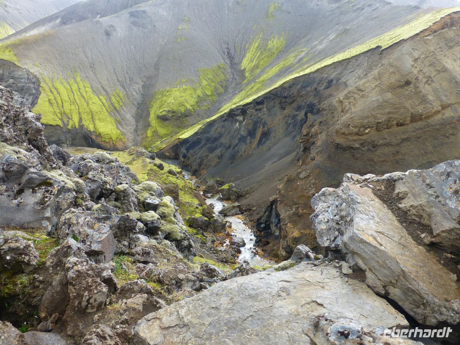 Über eine Schotterstraße ging es dann durch grüne Ebenen ins Gletschertal Thorsmörk, was übersetzt „Thors Wald" bedeutet, also der Wald des alten germanischen Gottes Thor. Das Tal wird flankiert von mächtigen Gletschern, einer davon ist die Gletscherzunge des berühmten Vulkans Eyjafjallajökull, der 2010 den Flugverkehr in ganz Europa zum Stillstand brachte. Einige Fahrtminuten weiter halten wir am Fuße der Bergkette.