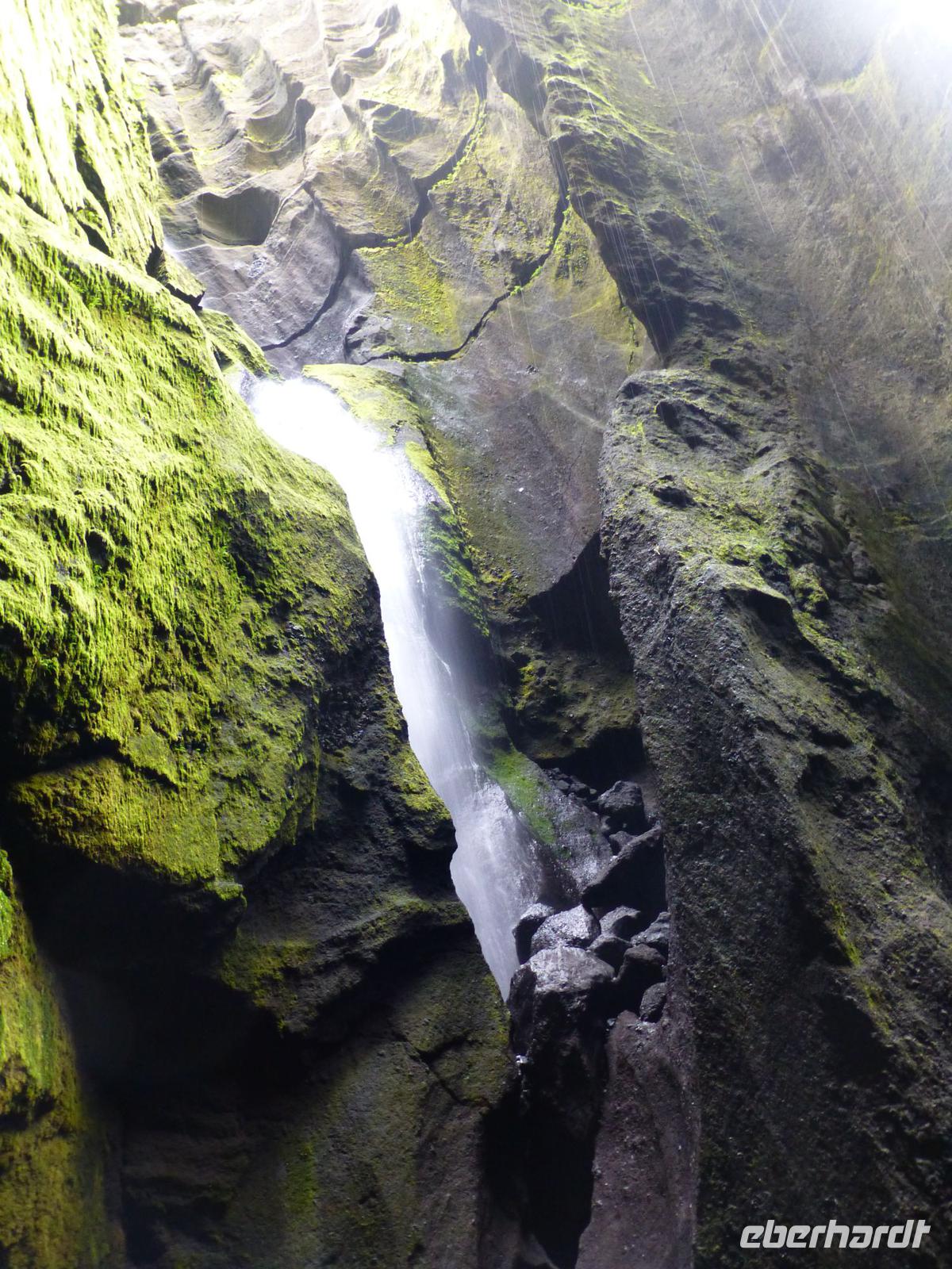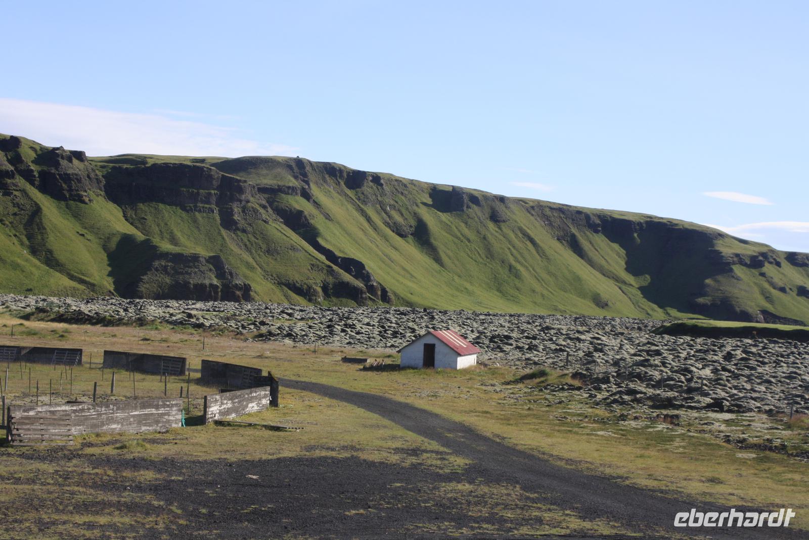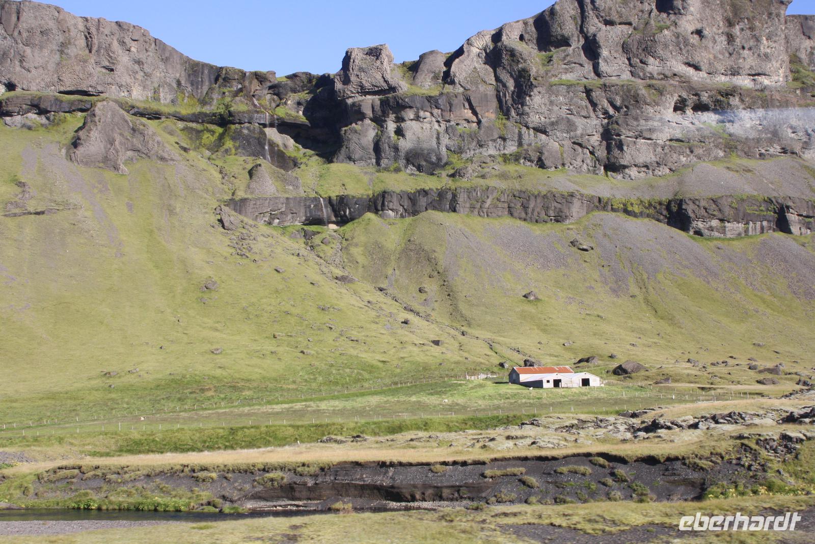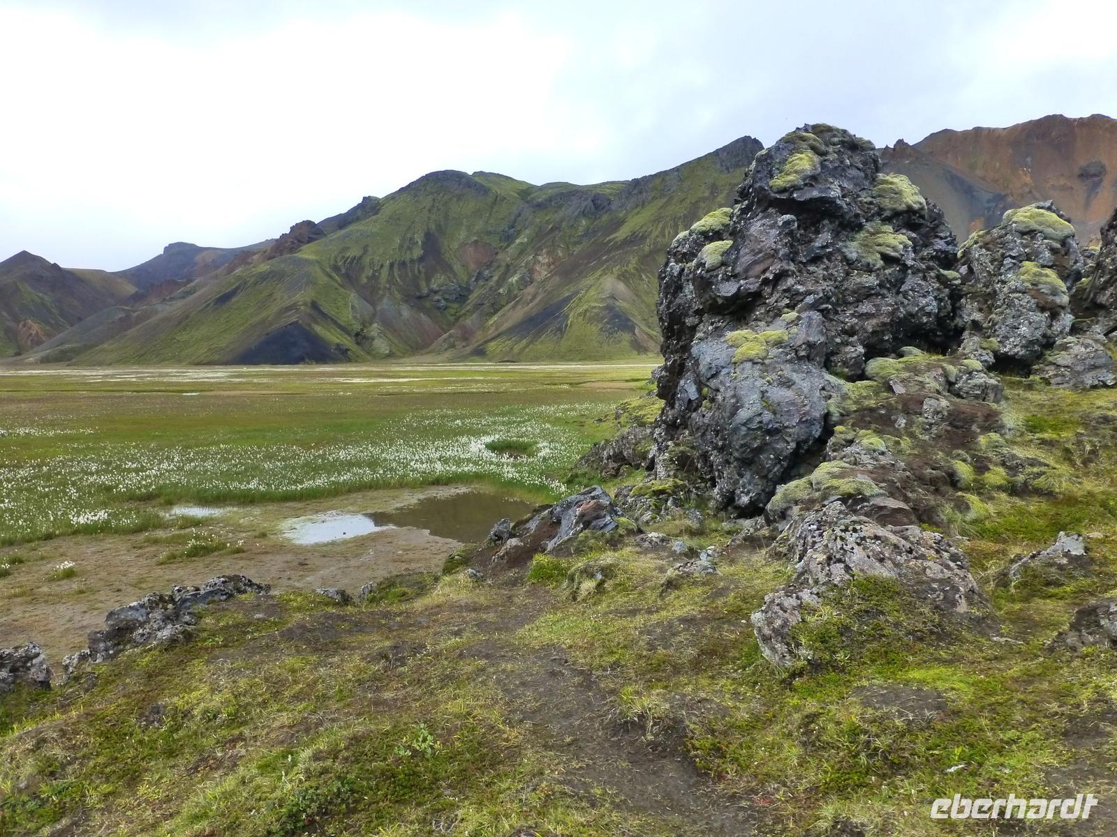 Über eine Schotterstraße ging es dann durch grüne Ebenen ins Gletschertal Thorsmörk, was übersetzt „Thors Wald" bedeutet, also der Wald des alten germanischen Gottes Thor. Das Tal wird flankiert von mächtigen Gletschern, einer davon ist die Gletscherzunge des berühmten Vulkans Eyjafjallajökull, der 2010 den Flugverkehr in ganz Europa zum Stillstand brachte. Einige Fahrtminuten weiter halten wir am Fuße der Bergkette.