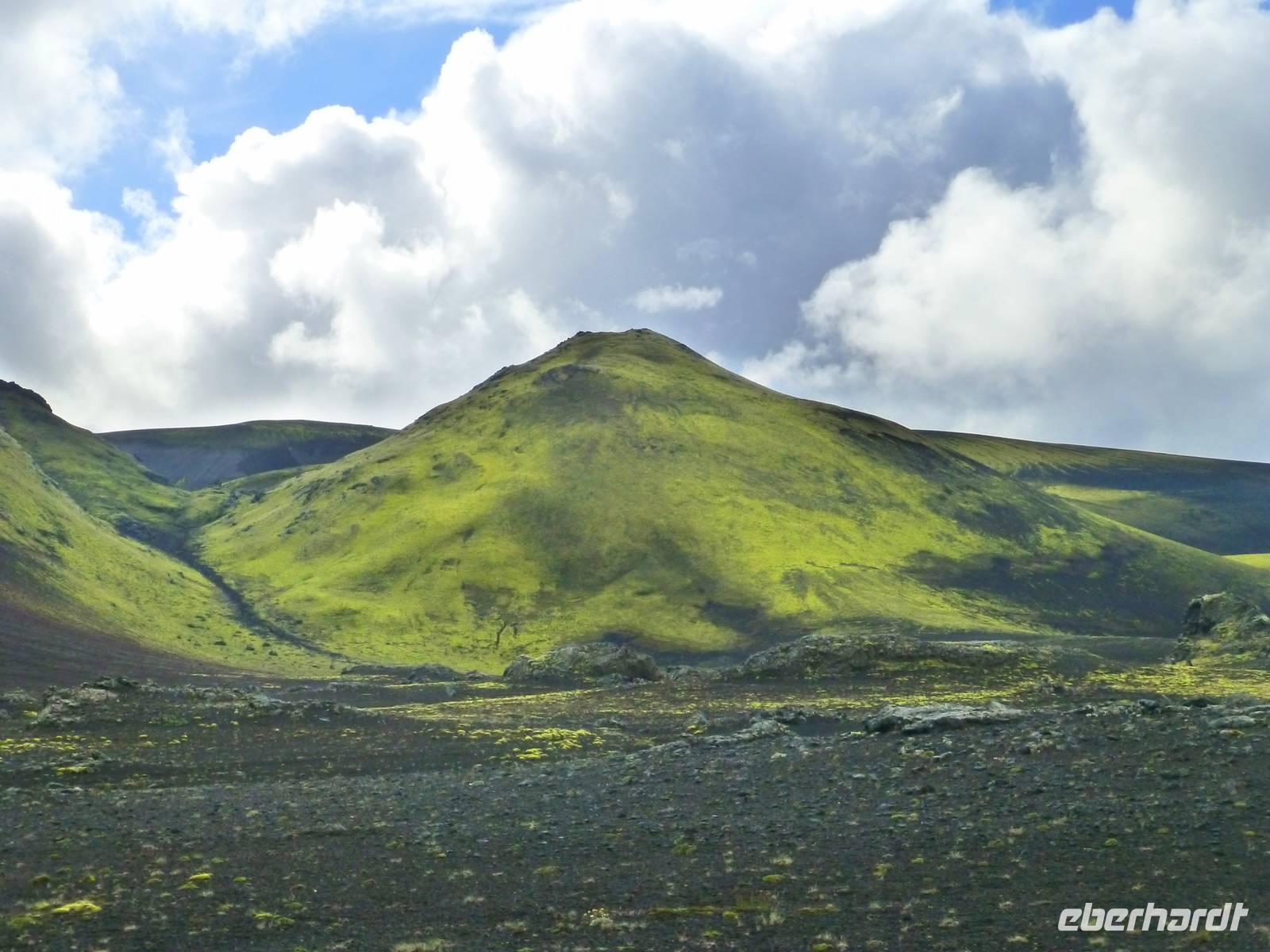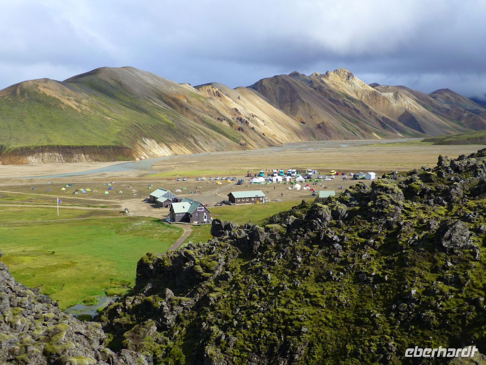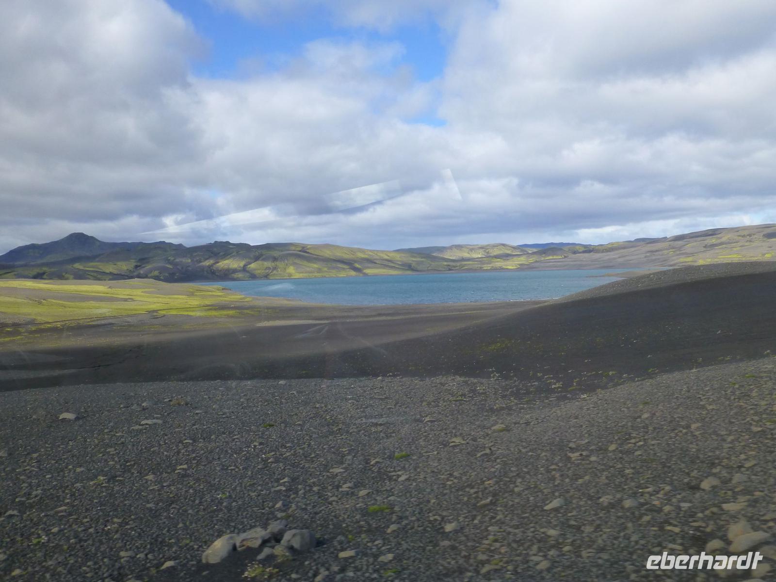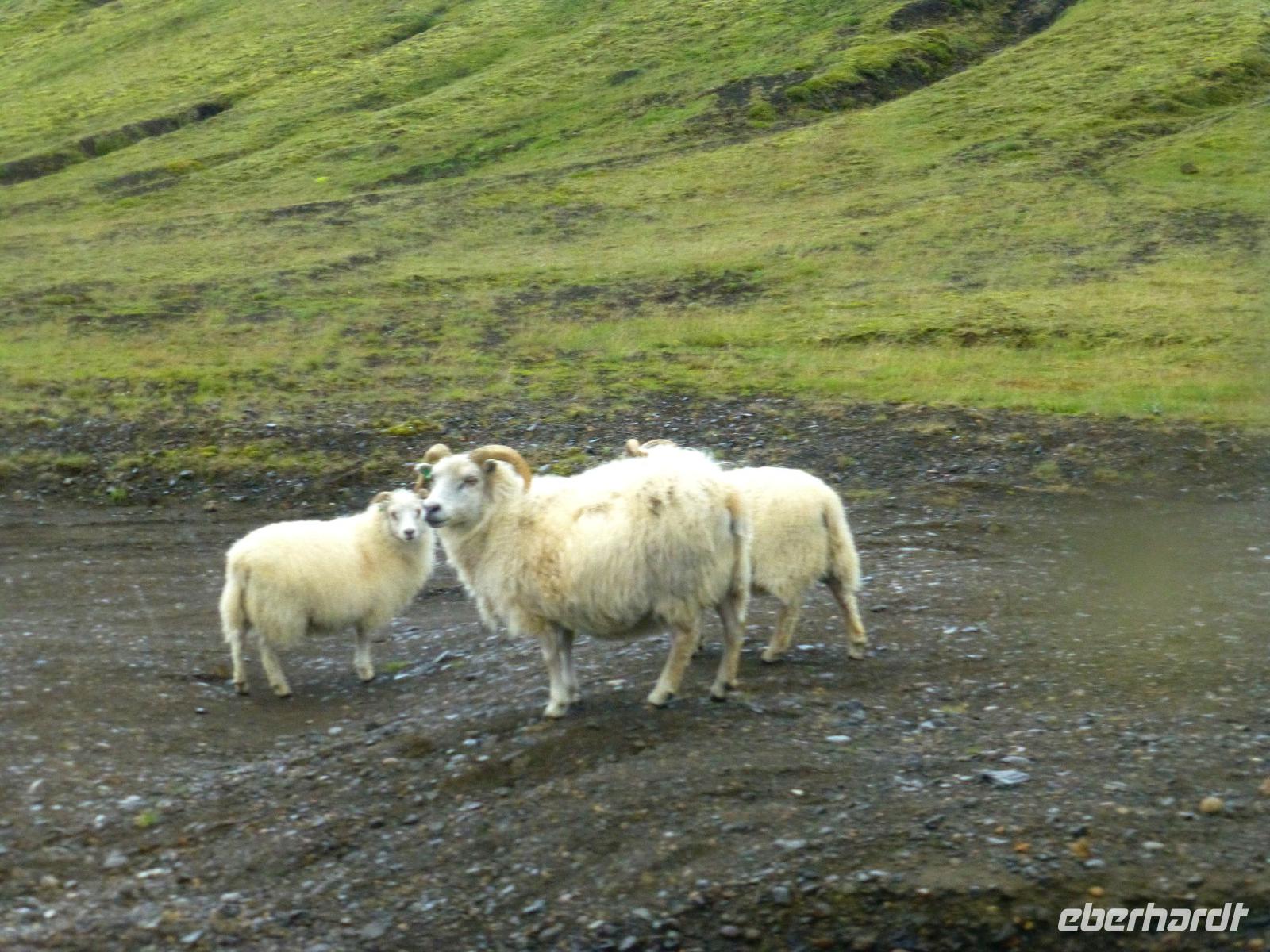 Nach dem Frühstück begann unser Ausflug ins Landesinnere. Mit unserem allradbetriebenen Geländebus verließen wir bald die asphaltierte Ringstraße und weiter ging es über befestigte Schotterwege. Unser erster Wasserfall, der Hjalparfoss, erwartete uns - täglich konnten wir von nun an einen Wasserfall bewundern - einer schöner als der andere! Durch das Hochland aus schwarzem Lavasand und grün bemoosten Hügeln fuhren wir entlang der Schotterstraße bis zum Wandercamp von Landmannalaugar. Unterwegs begegneten uns schon die weit verstreuten Schafe Islands, die lustigerweise fast immer zu dritt auftreten (Mutterschaf und zwei Lämmer) und wie kleine weiße Punkte in der weiten Vulkanlandschaft erscheinen.