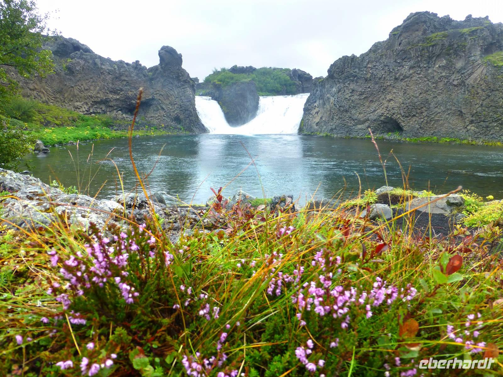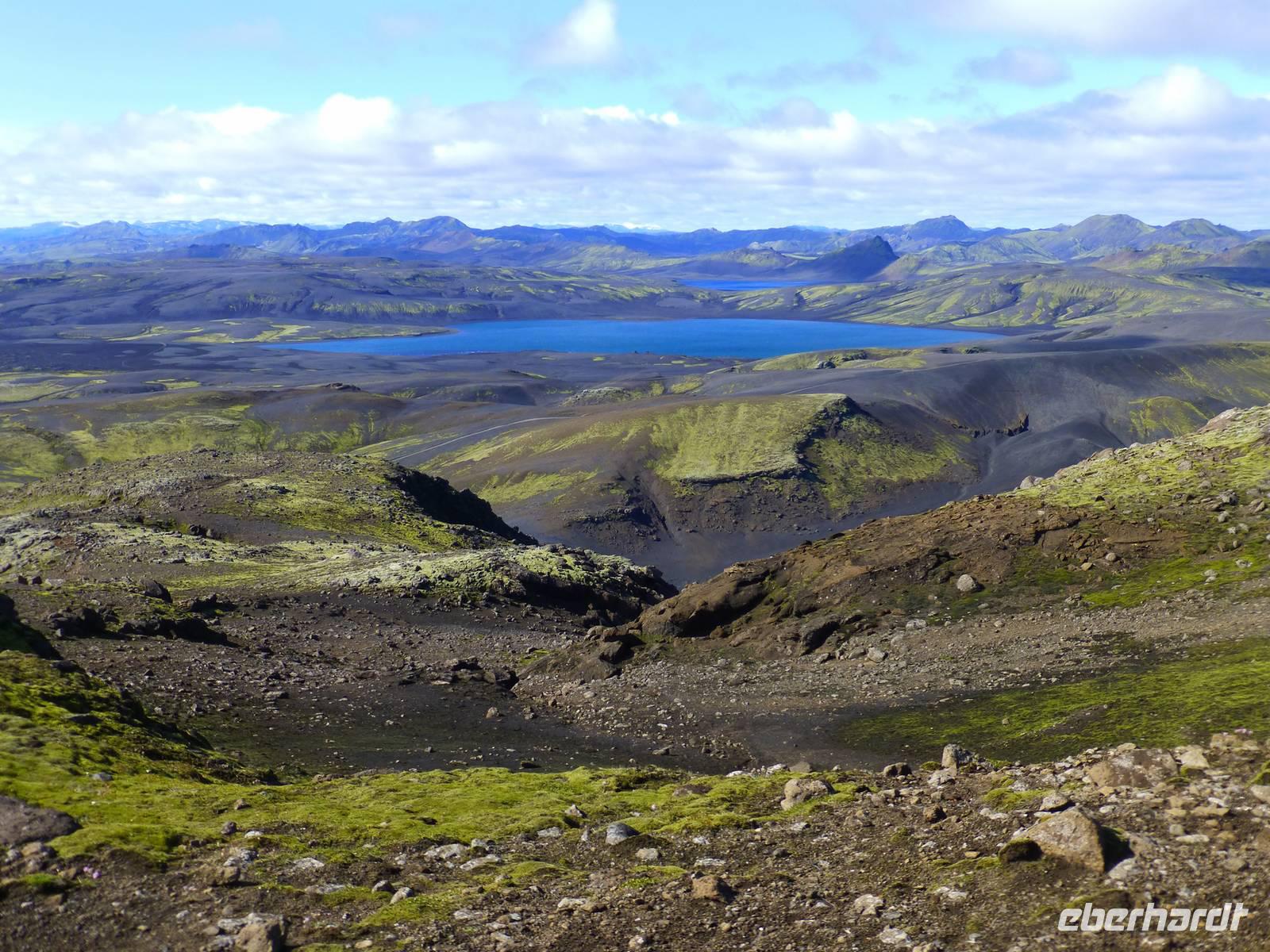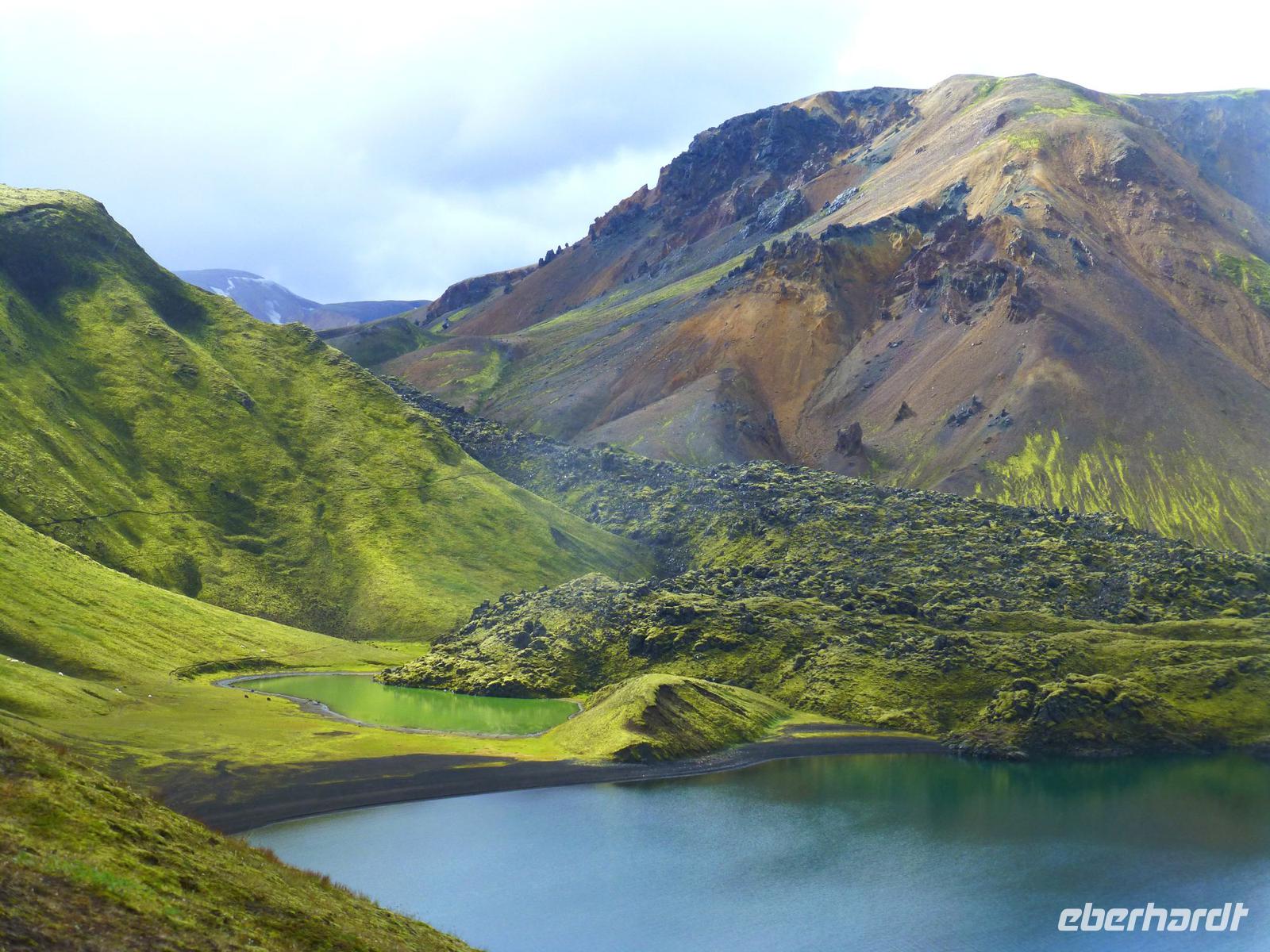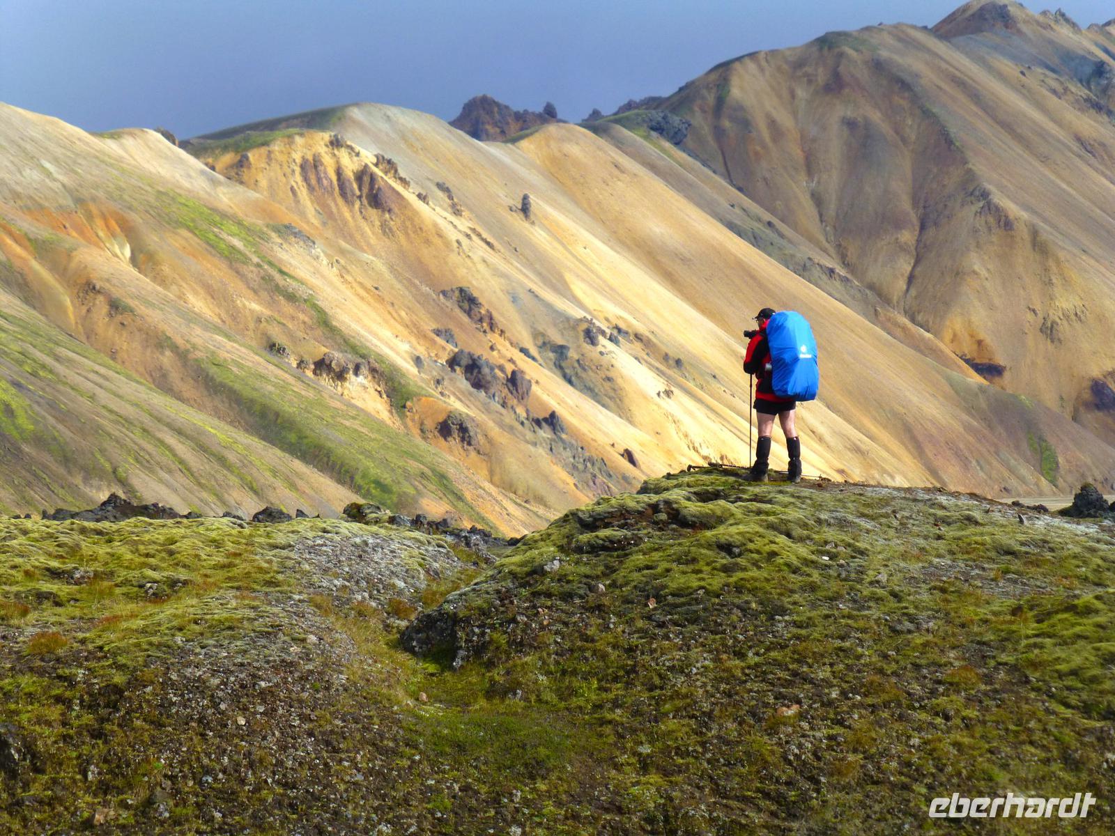 Nach dem Frühstück begann unser Ausflug ins Landesinnere. Mit unserem allradbetriebenen Geländebus verließen wir bald die asphaltierte Ringstraße und weiter ging es über befestigte Schotterwege. Unser erster Wasserfall, der Hjalparfoss, erwartete uns - täglich konnten wir von nun an einen Wasserfall bewundern - einer schöner als der andere! Durch das Hochland aus schwarzem Lavasand und grün bemoosten Hügeln fuhren wir entlang der Schotterstraße bis zum Wandercamp von Landmannalaugar. Unterwegs begegneten uns schon die weit verstreuten Schafe Islands, die lustigerweise fast immer zu dritt auftreten (Mutterschaf und zwei Lämmer) und wie kleine weiße Punkte in der weiten Vulkanlandschaft erscheinen.