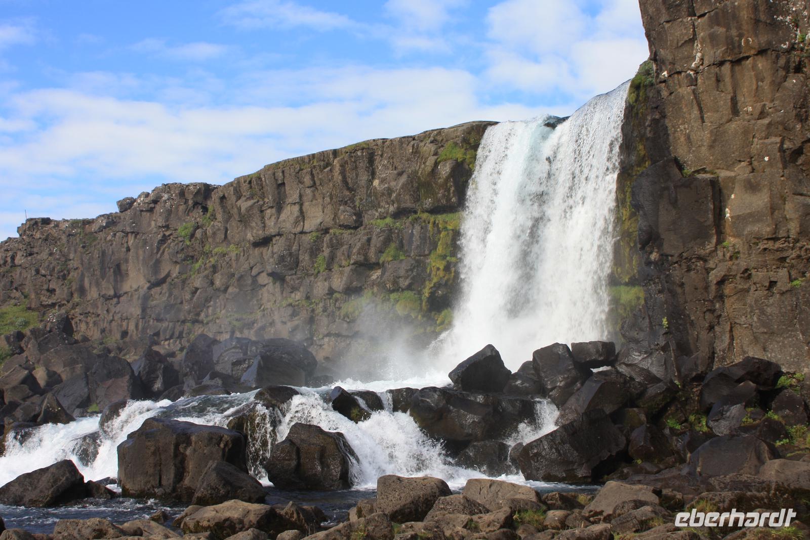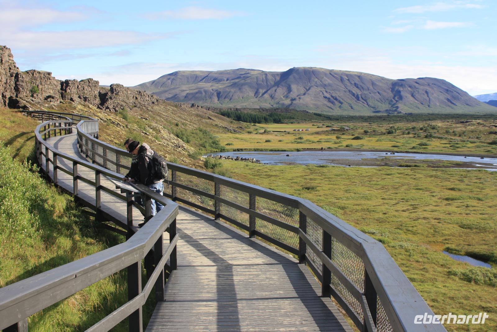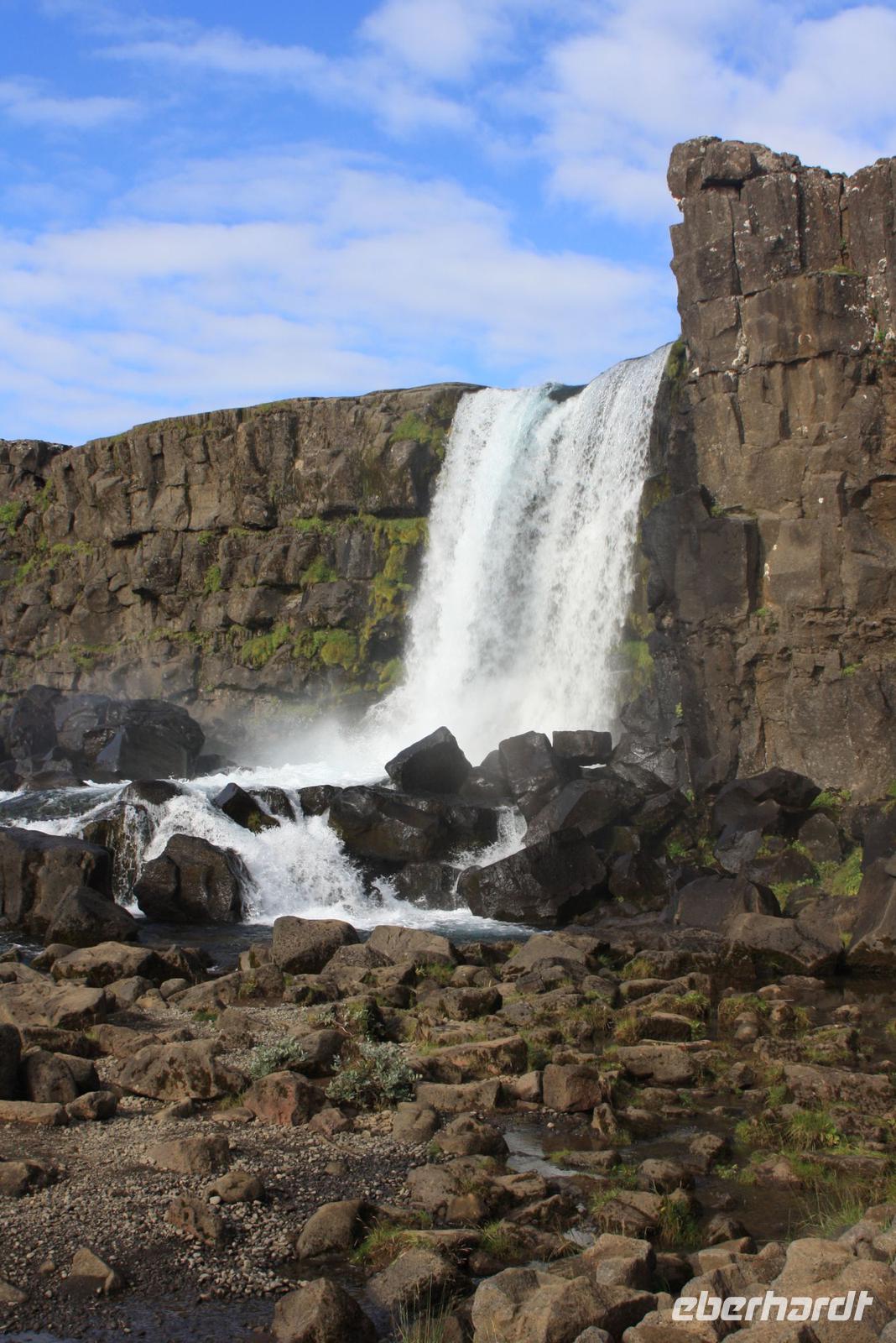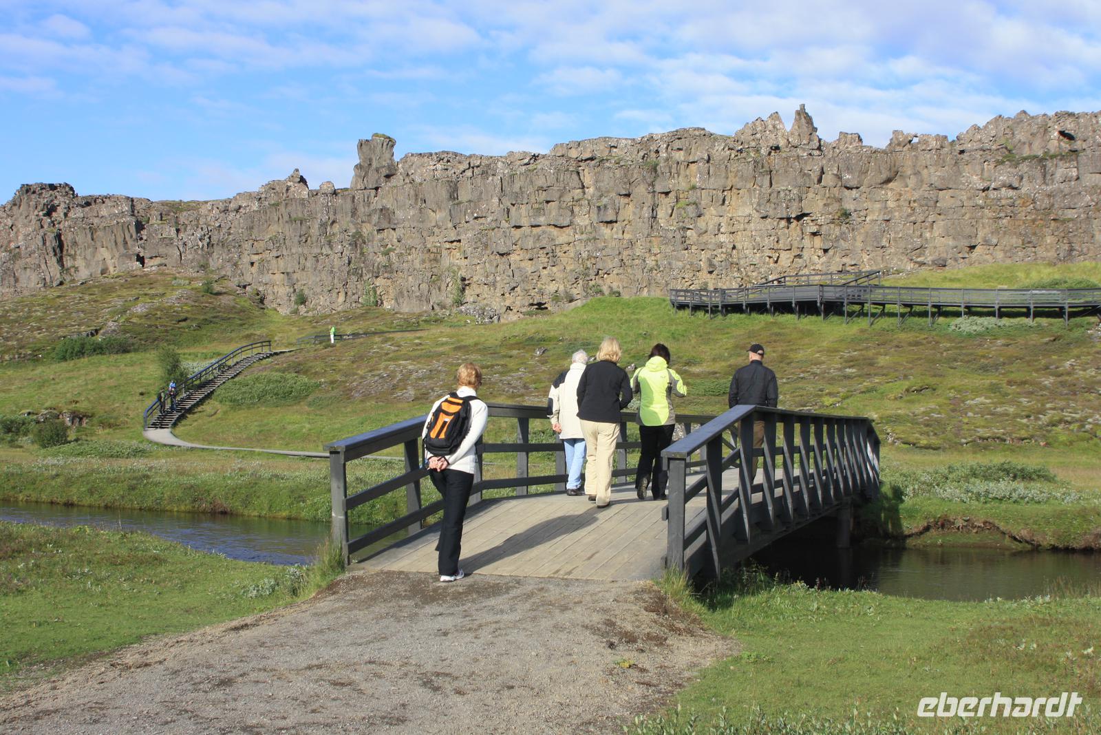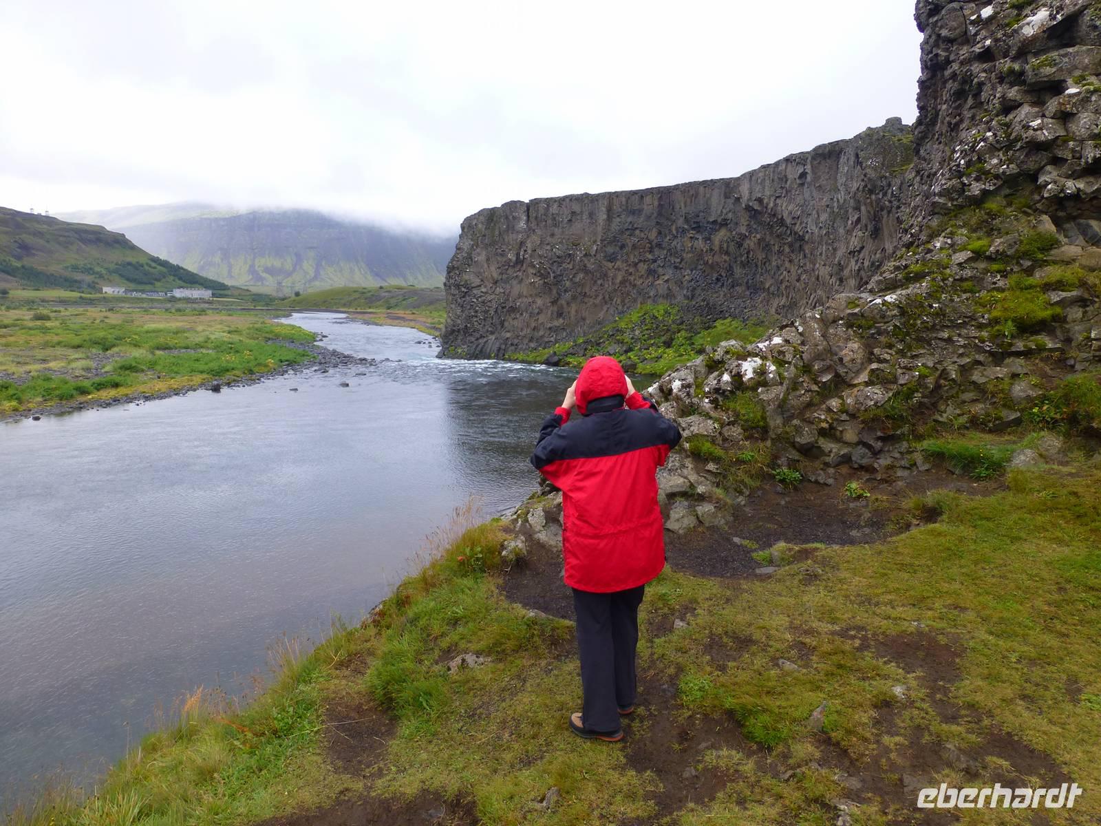 Unser Ganztagesausflug führte uns zum so genannten „Goldenen Kreis" - eine Rundfahrt zu drei der bekanntesten Sehenswürdigkeiten in Süd-Island. Der Nationalpark Thingvellir ist ein Meilenstein in der Geschichte Islands, denn hier liegt die alte Thing-Stätte der frühen Wikinger-Siedler. Thing bedeutet Volksversammlung und es handelt sich damit um eines der ältesten Parlamente der Welt, die hier im Schutz des tektonischen Grabens abgehalten wurden. Das Auseinanderdriften der amerikanischen und eurasischen Platte wird im Nationalpark durch viele Spalten sichtbar. Bei einer kleinen Wanderung entdeckten wir das Flüsschen Öxara, die felsige Steilwand der Plattengrenze und den Wasserfall Öxararfoss.