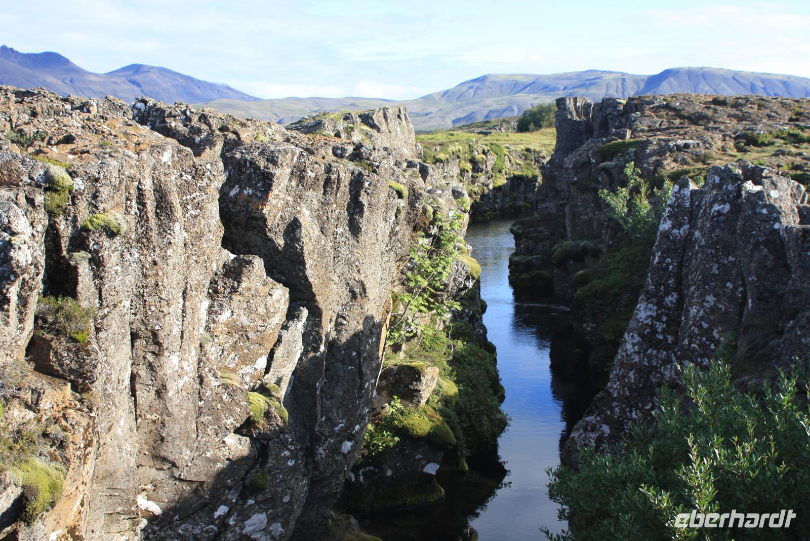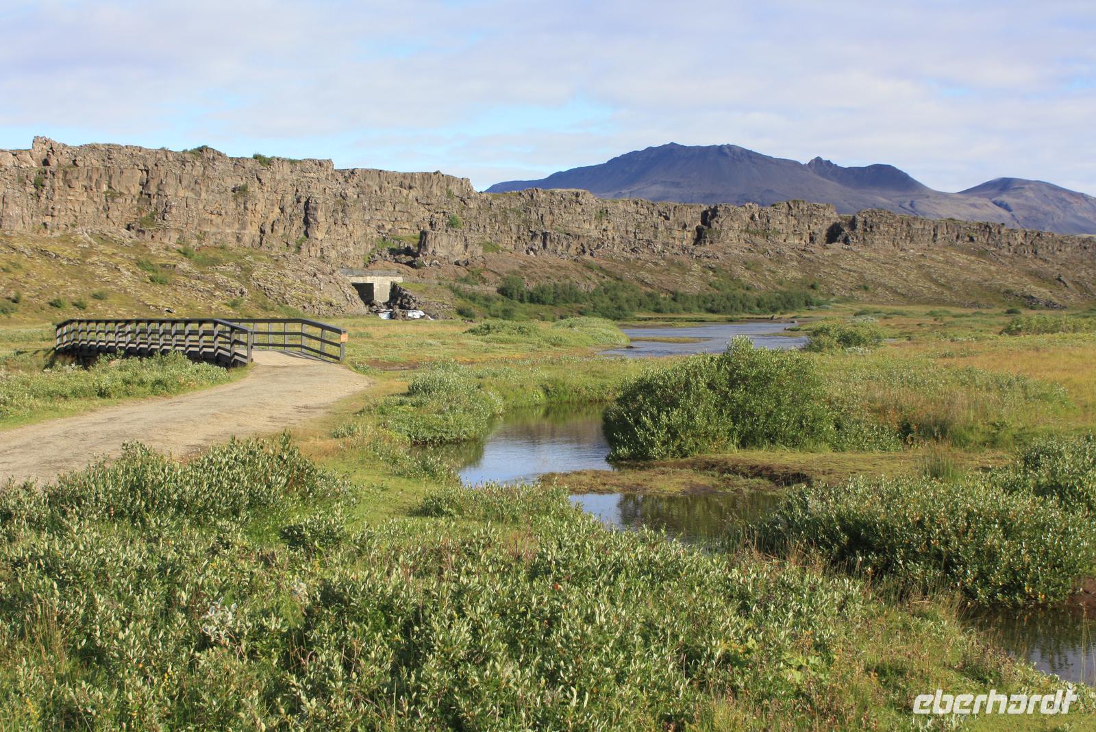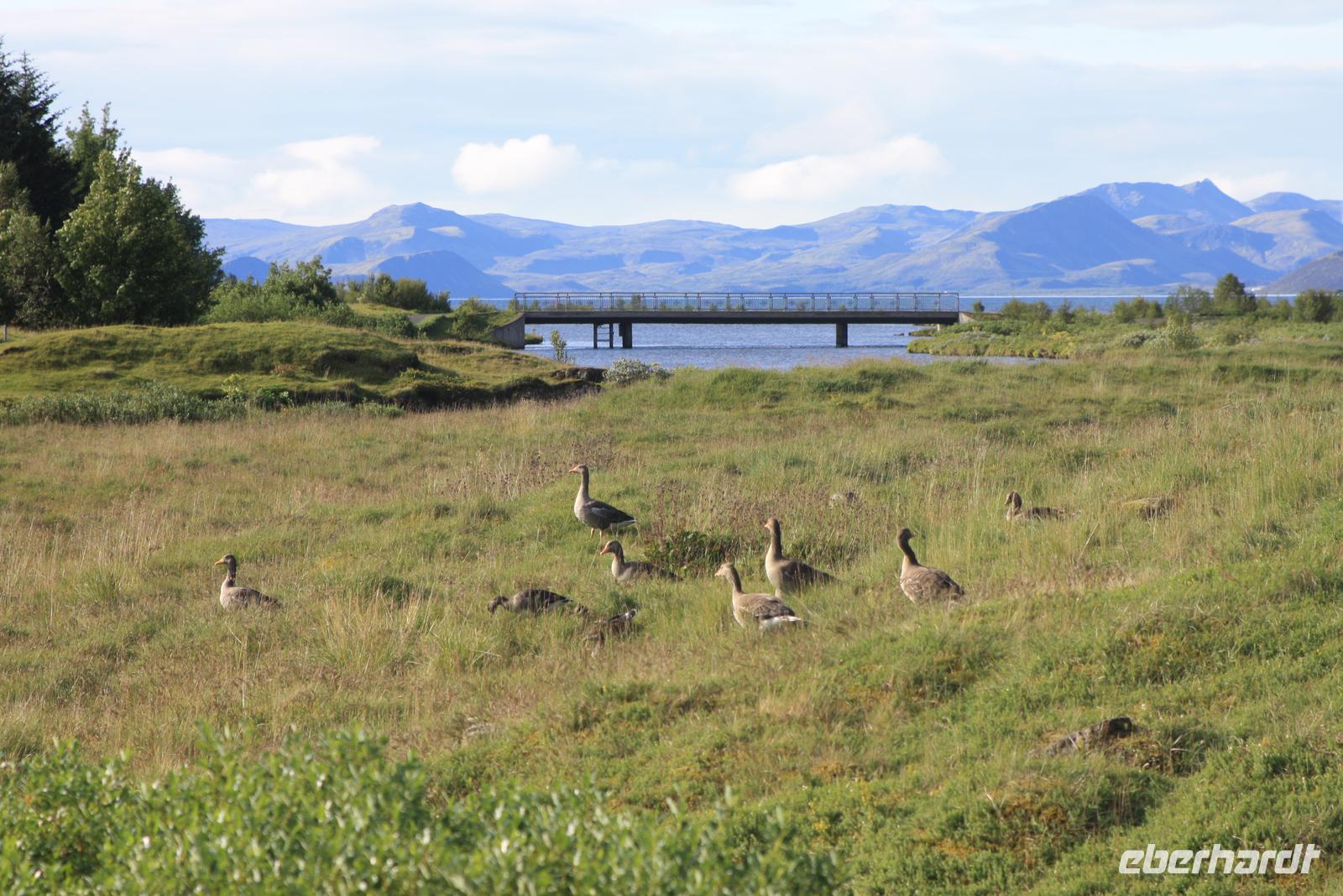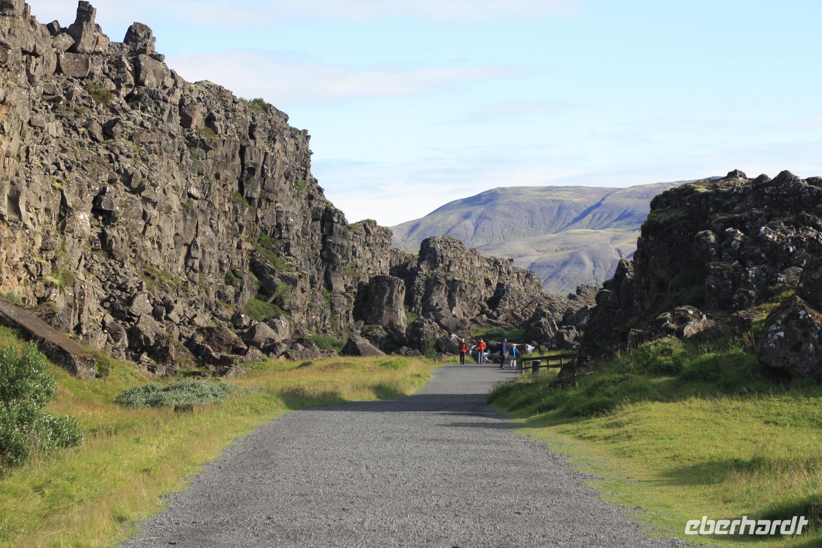 Unser Ganztagesausflug führte uns zum so genannten „Goldenen Kreis" - eine Rundfahrt zu drei der bekanntesten Sehenswürdigkeiten in Süd-Island. Der Nationalpark Thingvellir ist ein Meilenstein in der Geschichte Islands, denn hier liegt die alte Thing-Stätte der frühen Wikinger-Siedler. Thing bedeutet Volksversammlung und es handelt sich damit um eines der ältesten Parlamente der Welt, die hier im Schutz des tektonischen Grabens abgehalten wurden. Das Auseinanderdriften der amerikanischen und eurasischen Platte wird im Nationalpark durch viele Spalten sichtbar. Bei einer kleinen Wanderung entdeckten wir das Flüsschen Öxara, die felsige Steilwand der Plattengrenze und den Wasserfall Öxararfoss.