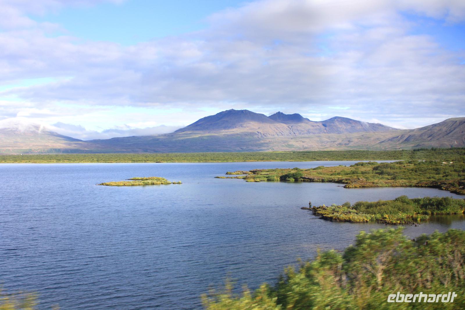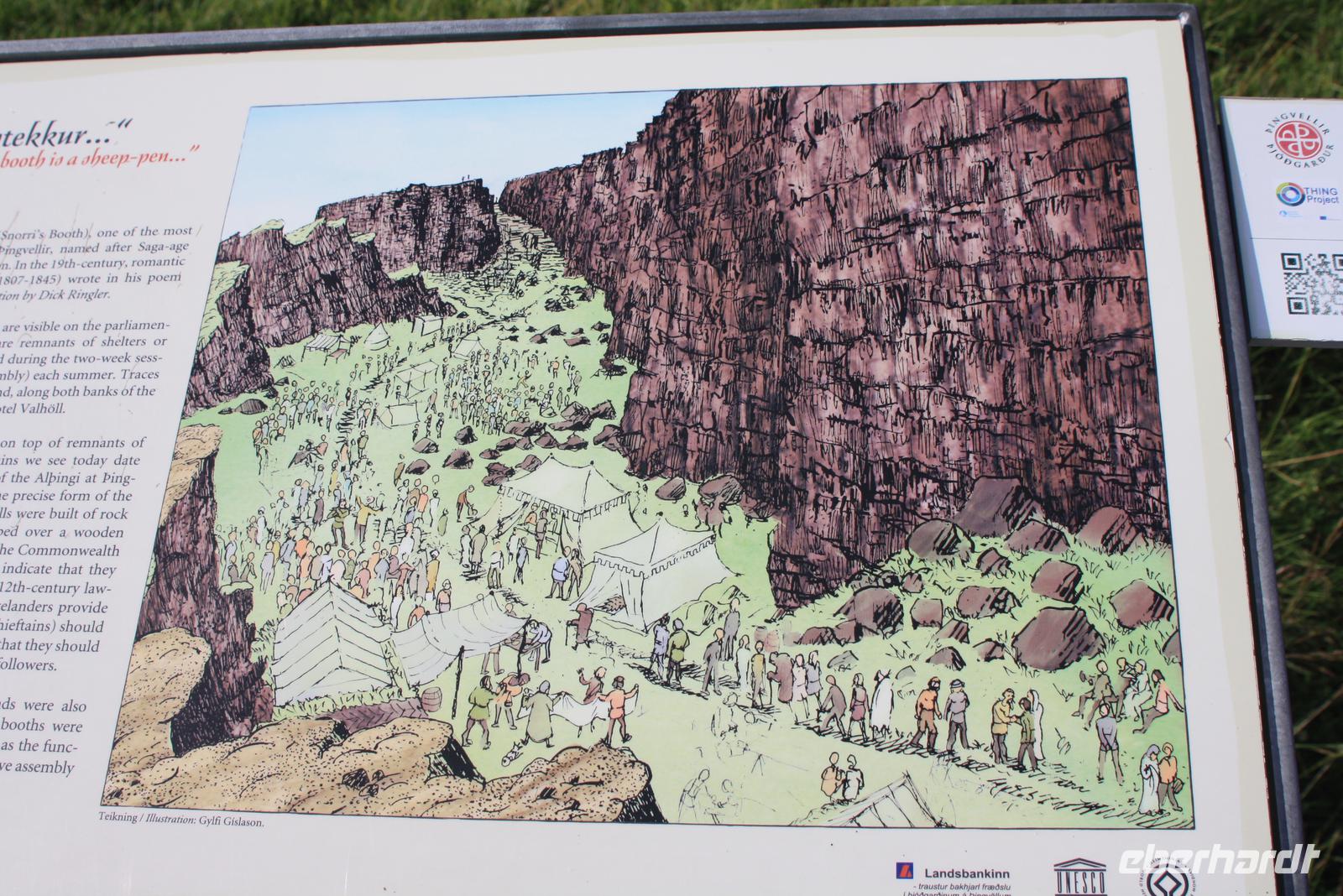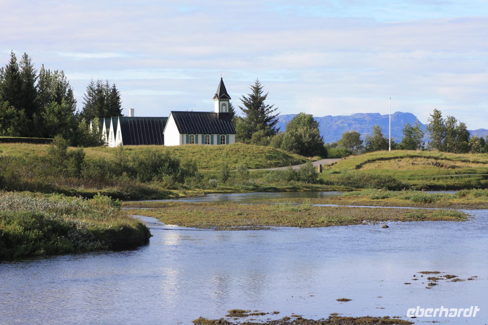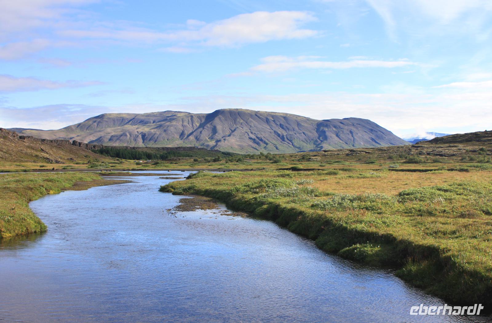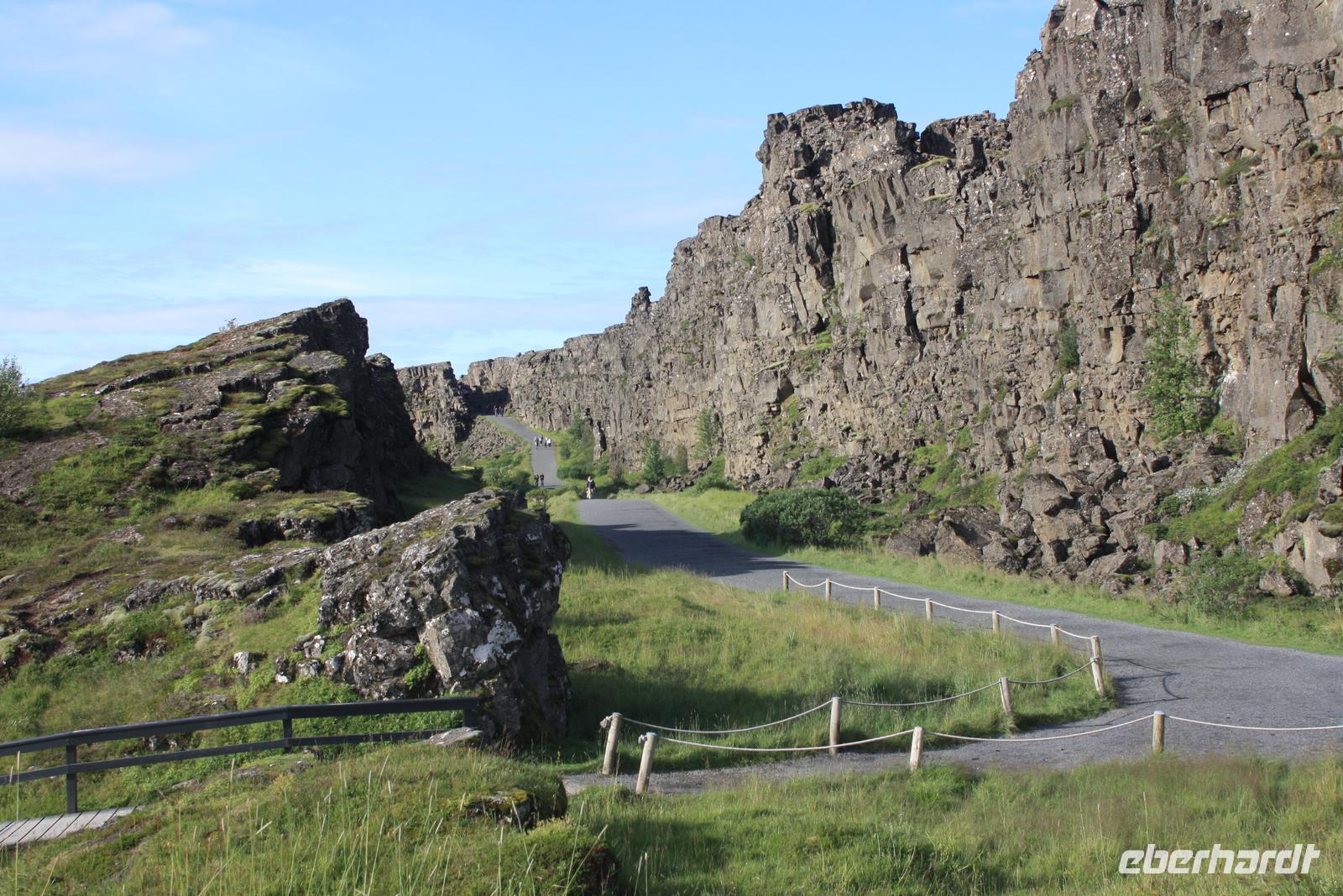 Unser Ganztagesausflug führte uns zum so genannten „Goldenen Kreis" - eine Rundfahrt zu drei der bekanntesten Sehenswürdigkeiten in Süd-Island. Der Nationalpark Thingvellir ist ein Meilenstein in der Geschichte Islands, denn hier liegt die alte Thing-Stätte der frühen Wikinger-Siedler. Thing bedeutet Volksversammlung und es handelt sich damit um eines der ältesten Parlamente der Welt, die hier im Schutz des tektonischen Grabens abgehalten wurden. Das Auseinanderdriften der amerikanischen und eurasischen Platte wird im Nationalpark durch viele Spalten sichtbar. Bei einer kleinen Wanderung entdeckten wir das Flüsschen Öxara, die felsige Steilwand der Plattengrenze und den Wasserfall Öxararfoss.