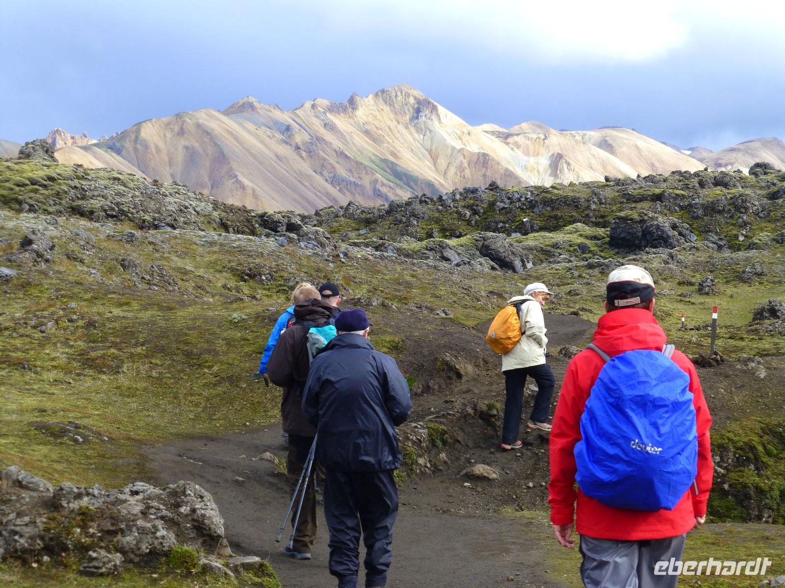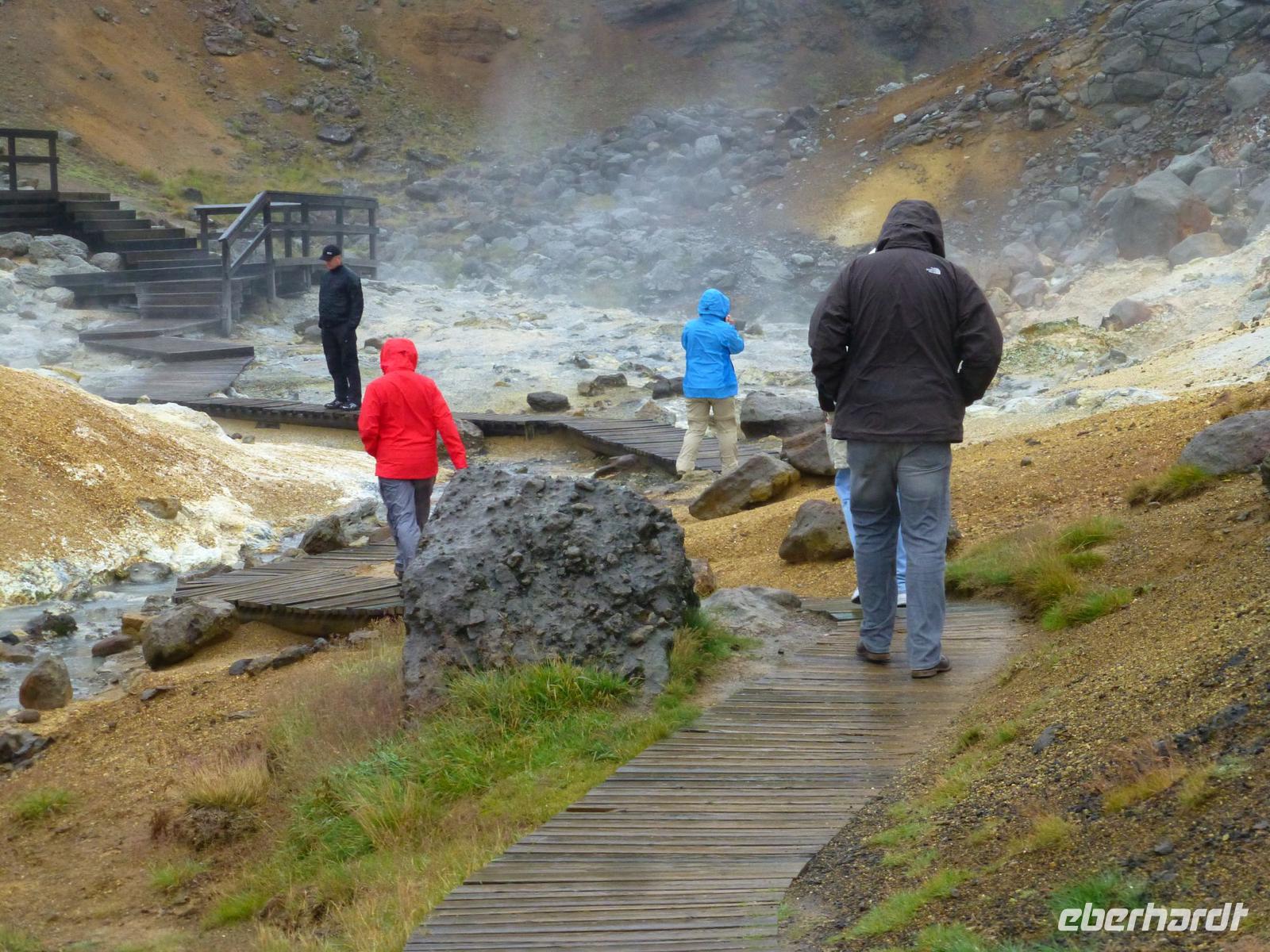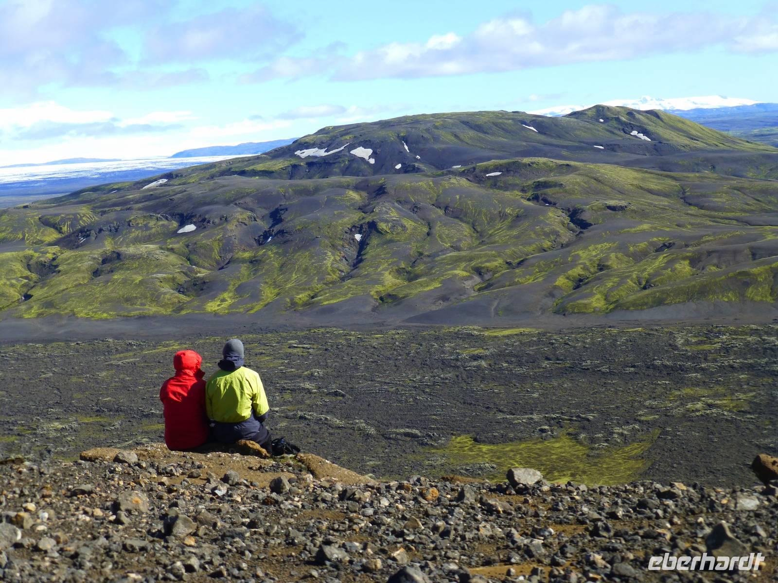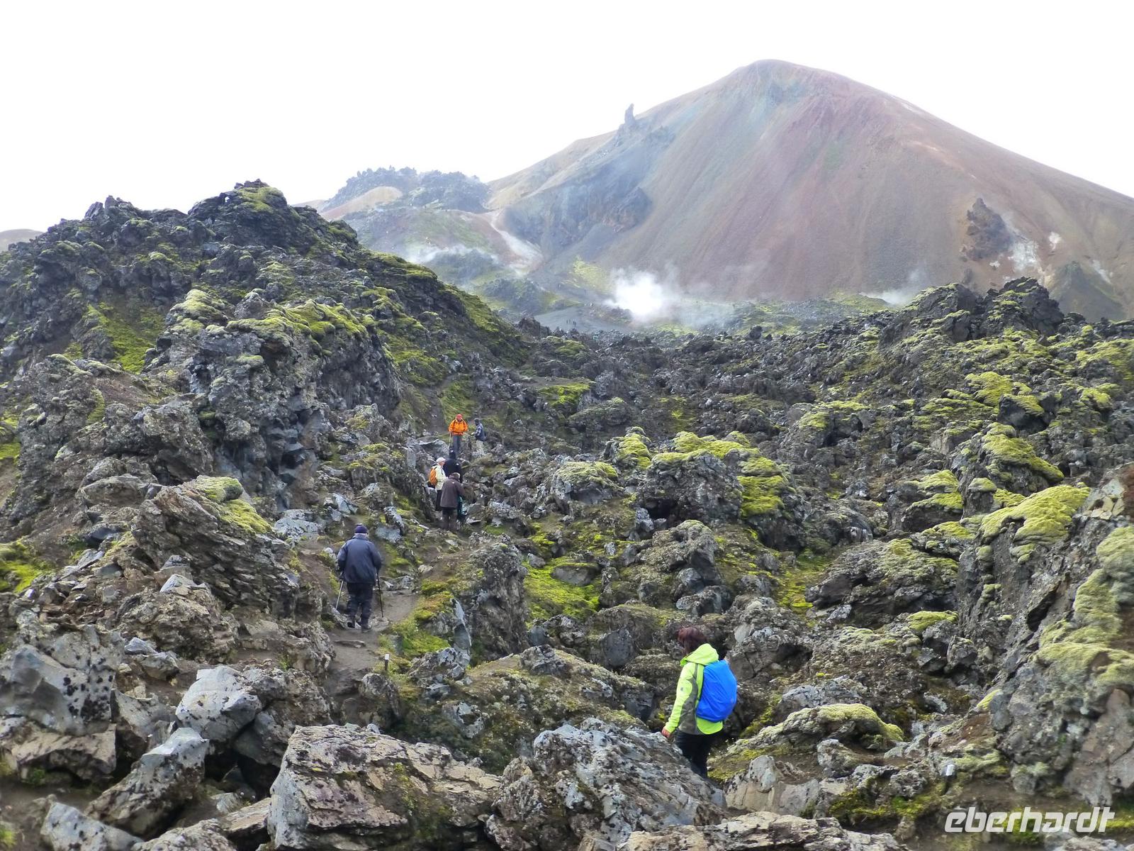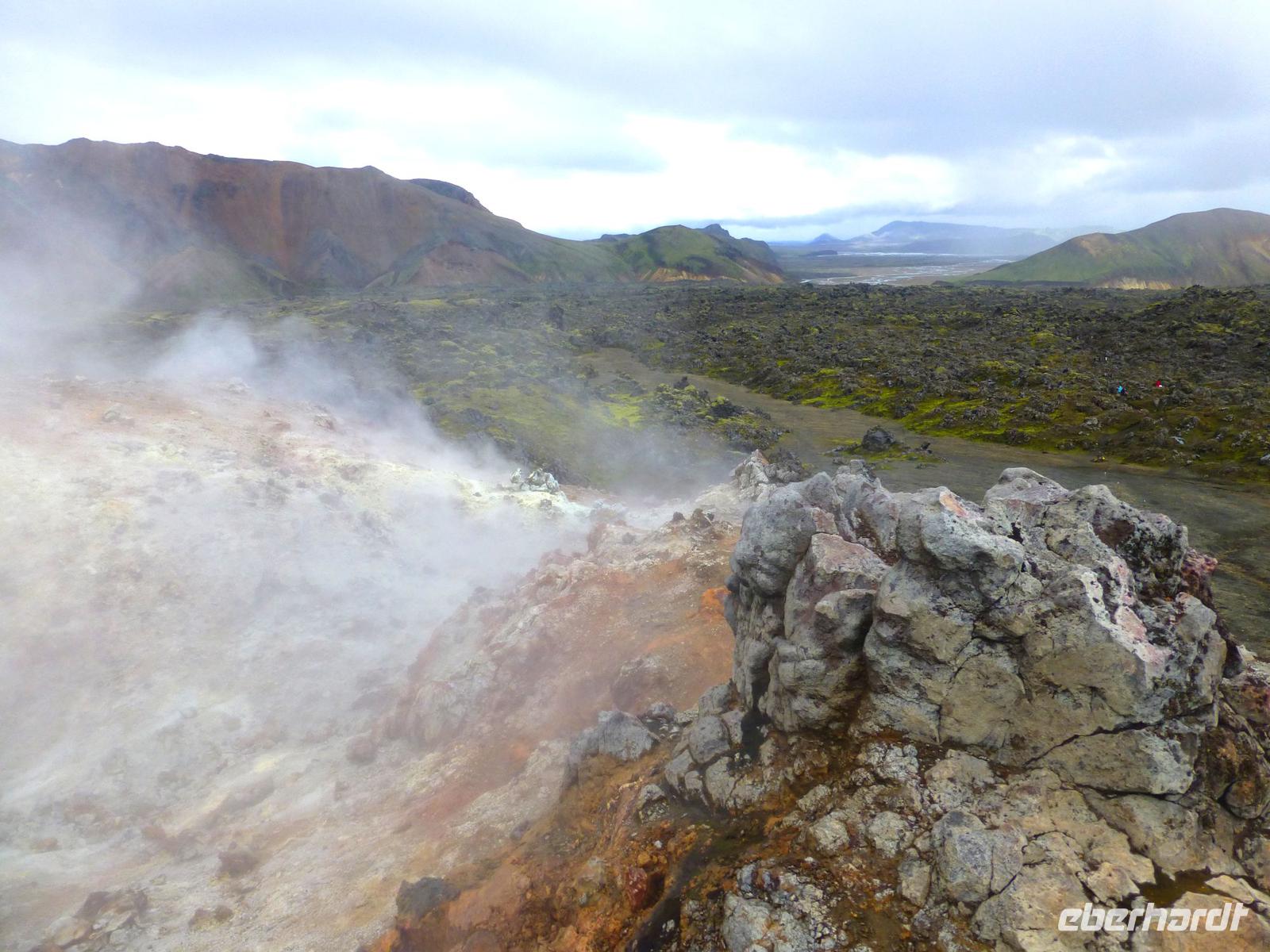 Bevor wir zur Wanderung aufbrachen, stärkten wir uns beim Mittagspicknick, welches Snorri nun jeden Tag für uns im Bus dabei hat. Nach einem Regenschauer klart der Himmel auf und wir wanderten durch die so genannte Grüne Schlucht durch die vielfarbigen Hügel, deren Farben durch verschiedene Gesteine entstehen. Auf einem schmalen Pfad mit kleinen Kletterpassagen ging es durch ein Lavafeld hinauf zum Fuße des Roten Berges. Dampfende Schwefellöcher ließen uns zum ersten Mal mit den geothermalen Aktivitäten Islands in Berührung kommen. Die Landschaft um Landmannalaugar ist wirklich fantastisch!