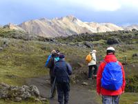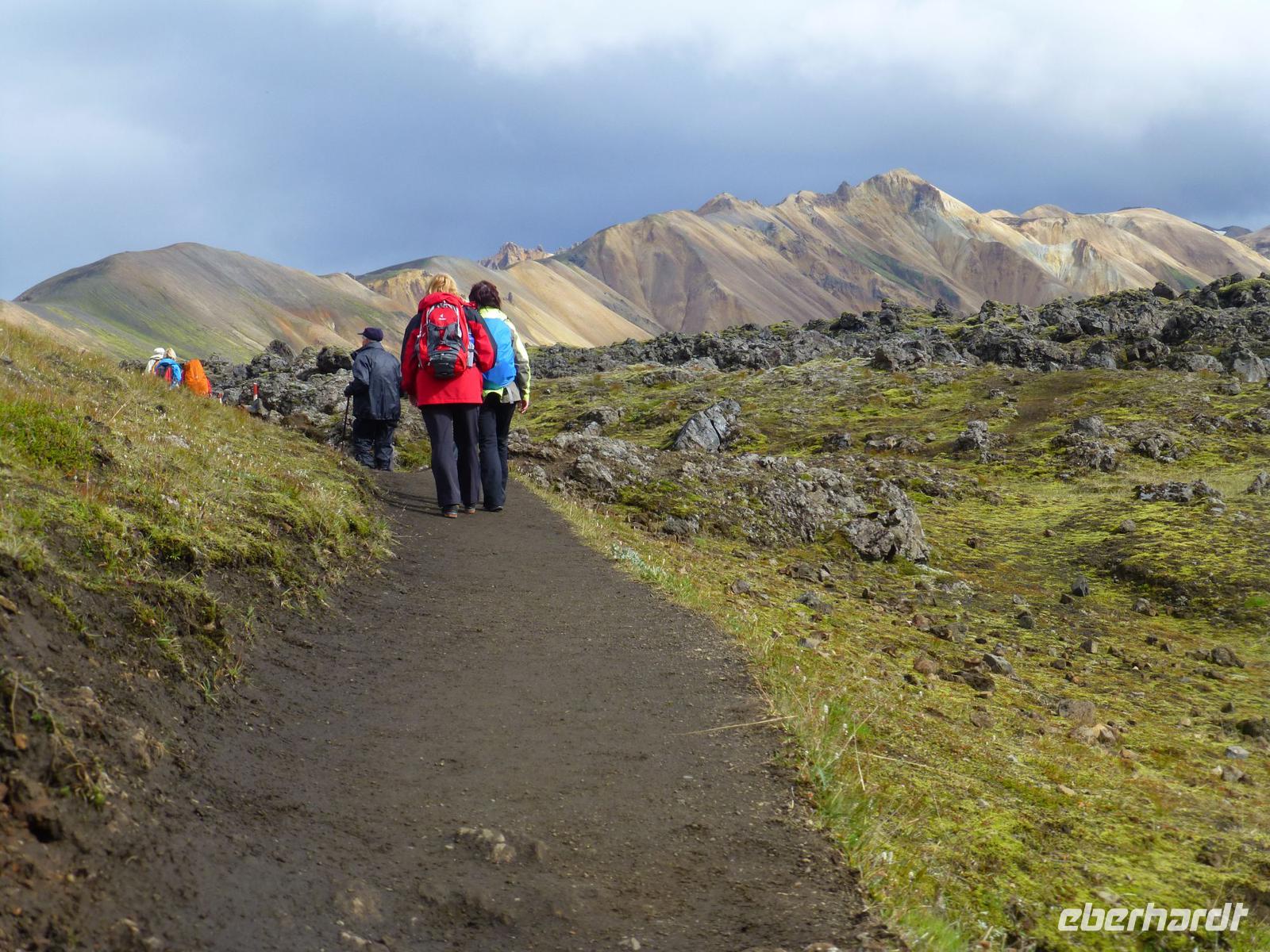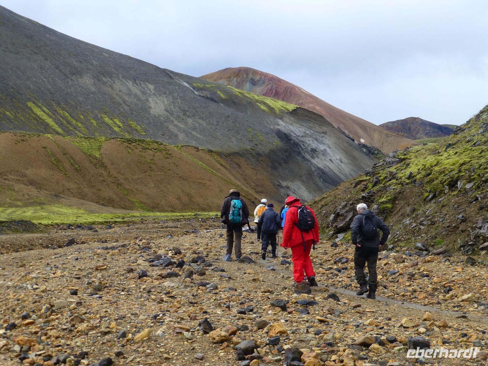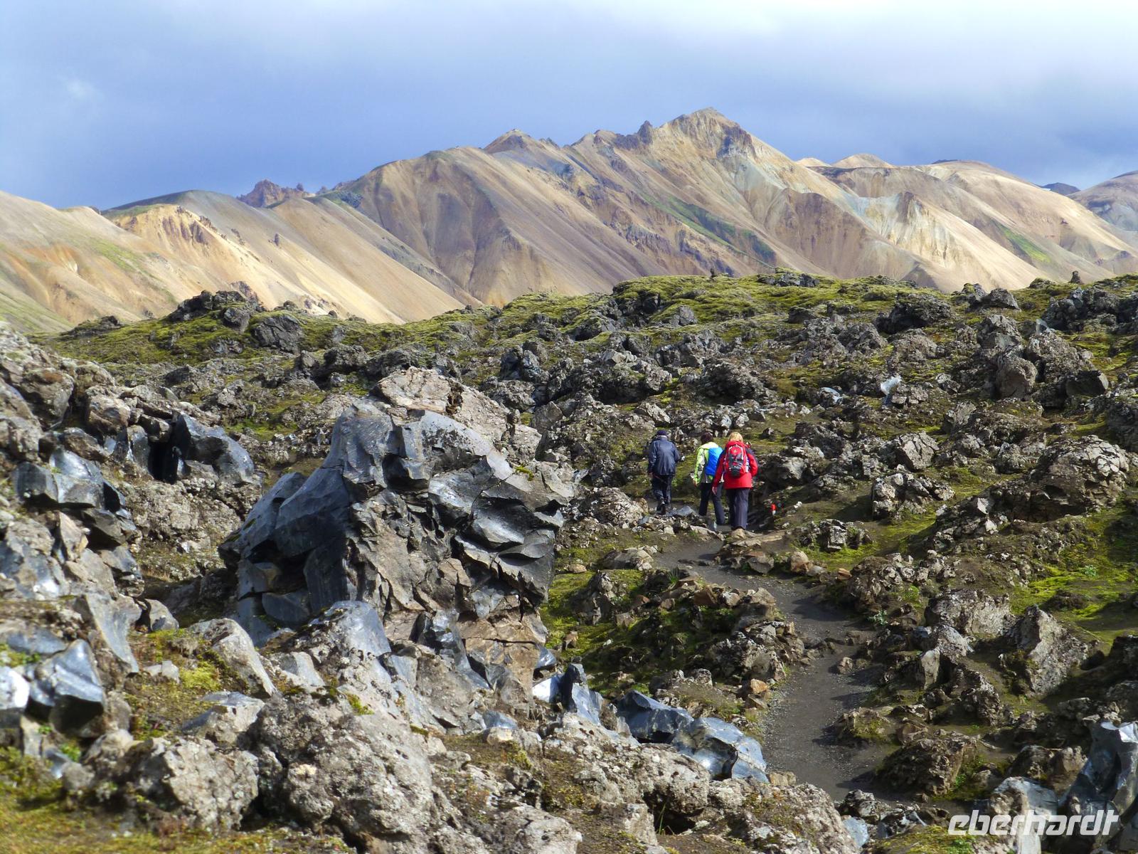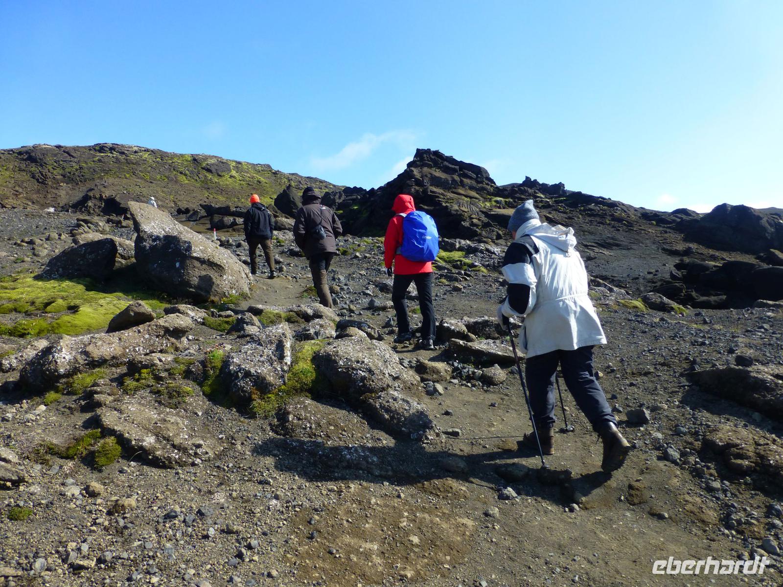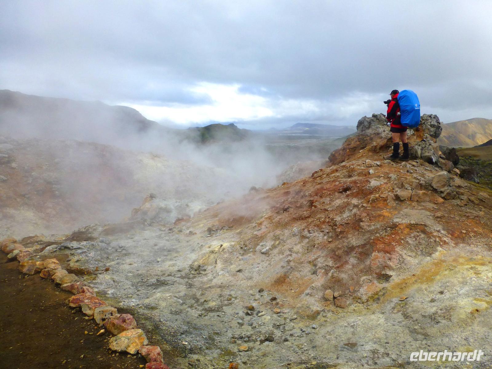 Bevor wir zur Wanderung aufbrachen, stärkten wir uns beim Mittagspicknick, welches Snorri nun jeden Tag für uns im Bus dabei hat. Nach einem Regenschauer klart der Himmel auf und wir wanderten durch die so genannte Grüne Schlucht durch die vielfarbigen Hügel, deren Farben durch verschiedene Gesteine entstehen. Auf einem schmalen Pfad mit kleinen Kletterpassagen ging es durch ein Lavafeld hinauf zum Fuße des Roten Berges. Dampfende Schwefellöcher ließen uns zum ersten Mal mit den geothermalen Aktivitäten Islands in Berührung kommen. Die Landschaft um Landmannalaugar ist wirklich fantastisch!