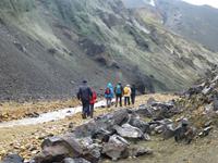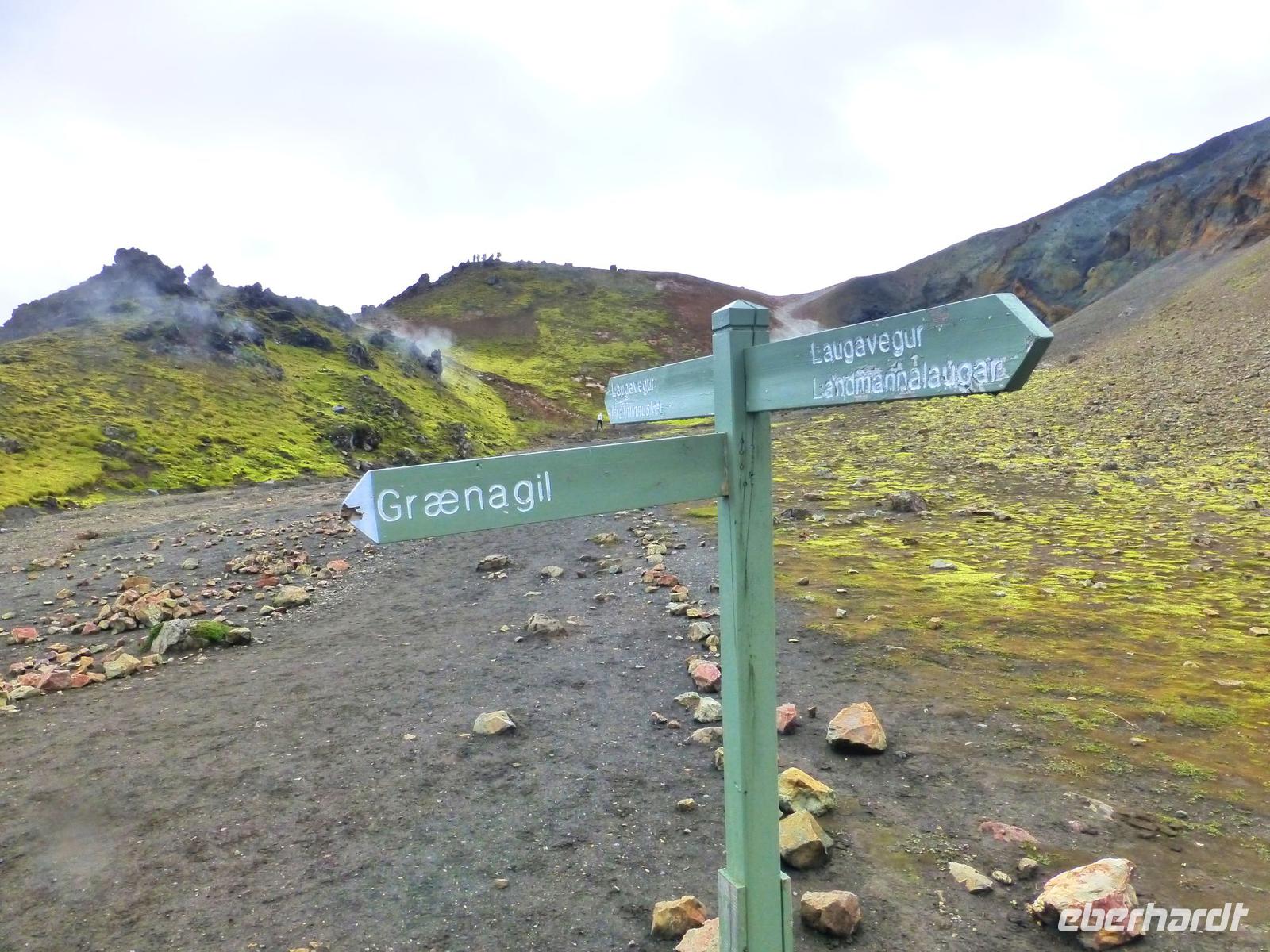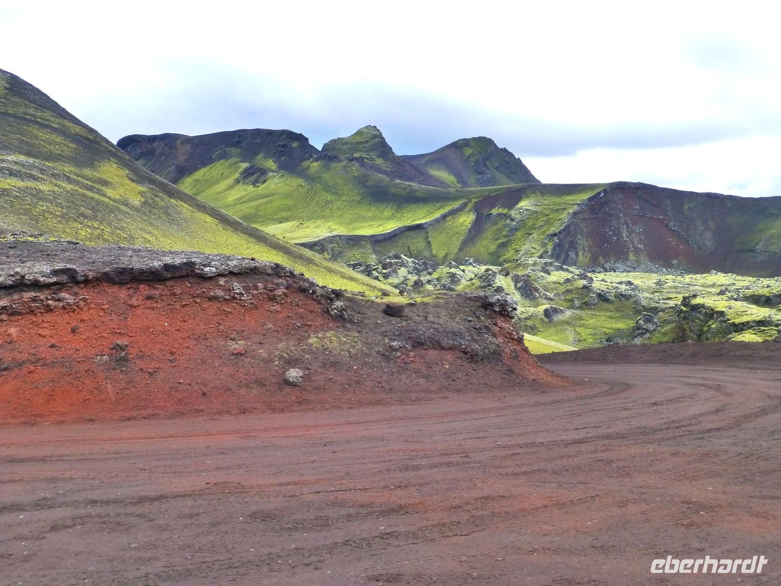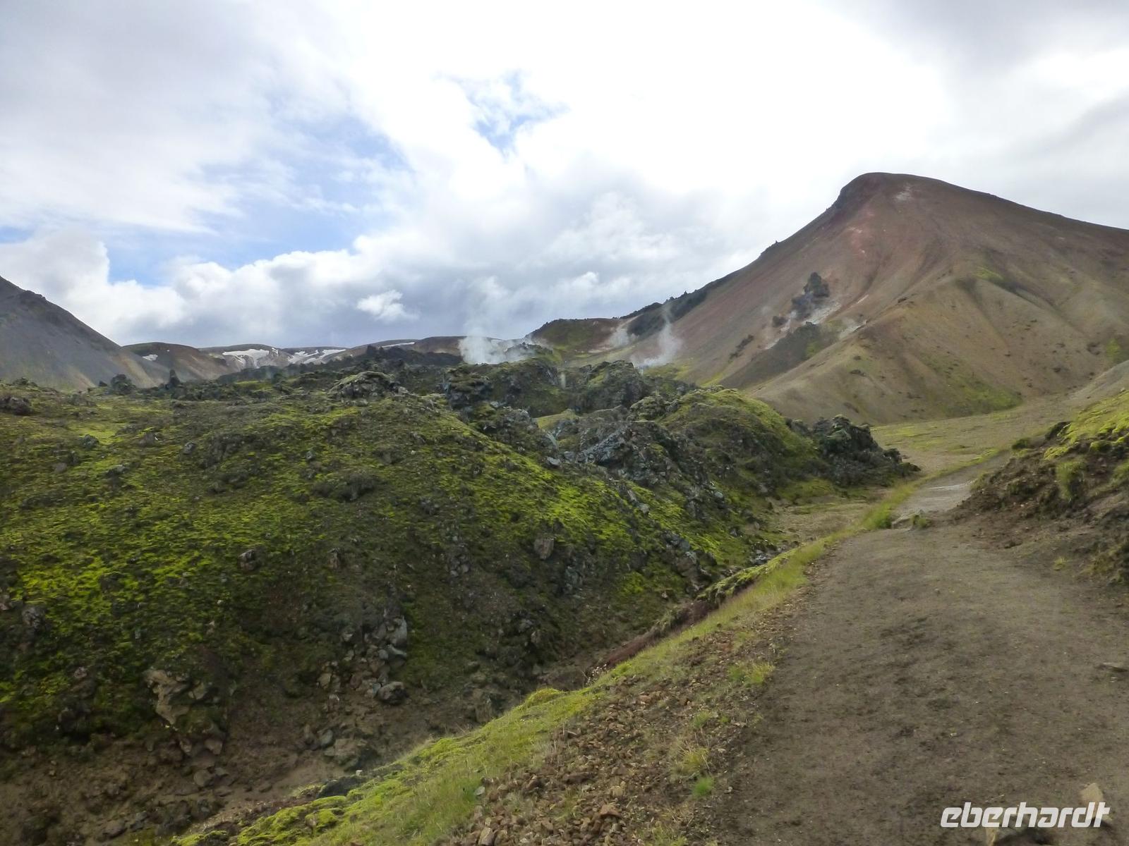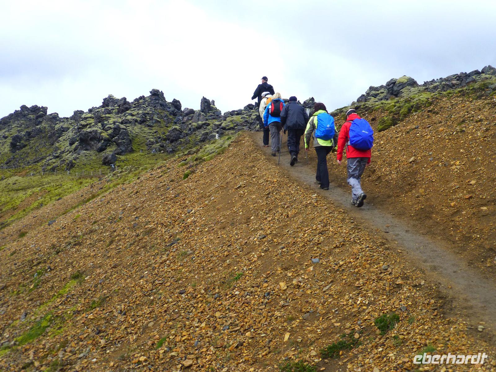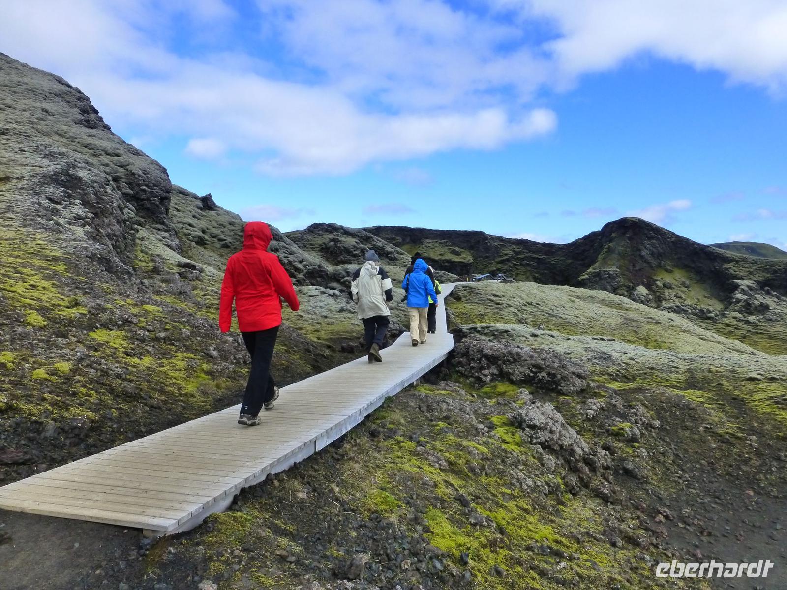 Bevor wir zur Wanderung aufbrachen, stärkten wir uns beim Mittagspicknick, welches Snorri nun jeden Tag für uns im Bus dabei hat. Nach einem Regenschauer klart der Himmel auf und wir wanderten durch die so genannte Grüne Schlucht durch die vielfarbigen Hügel, deren Farben durch verschiedene Gesteine entstehen. Auf einem schmalen Pfad mit kleinen Kletterpassagen ging es durch ein Lavafeld hinauf zum Fuße des Roten Berges. Dampfende Schwefellöcher ließen uns zum ersten Mal mit den geothermalen Aktivitäten Islands in Berührung kommen. Die Landschaft um Landmannalaugar ist wirklich fantastisch!