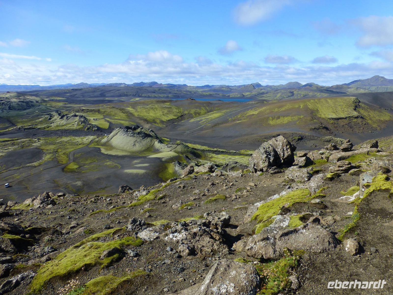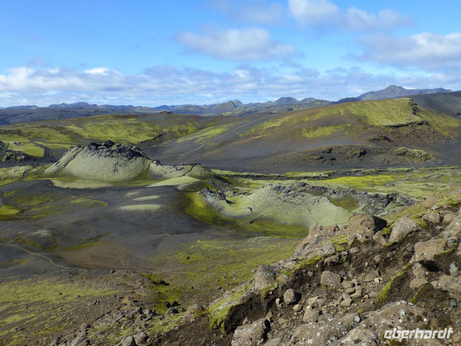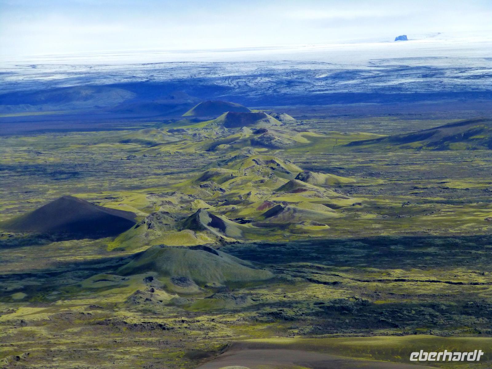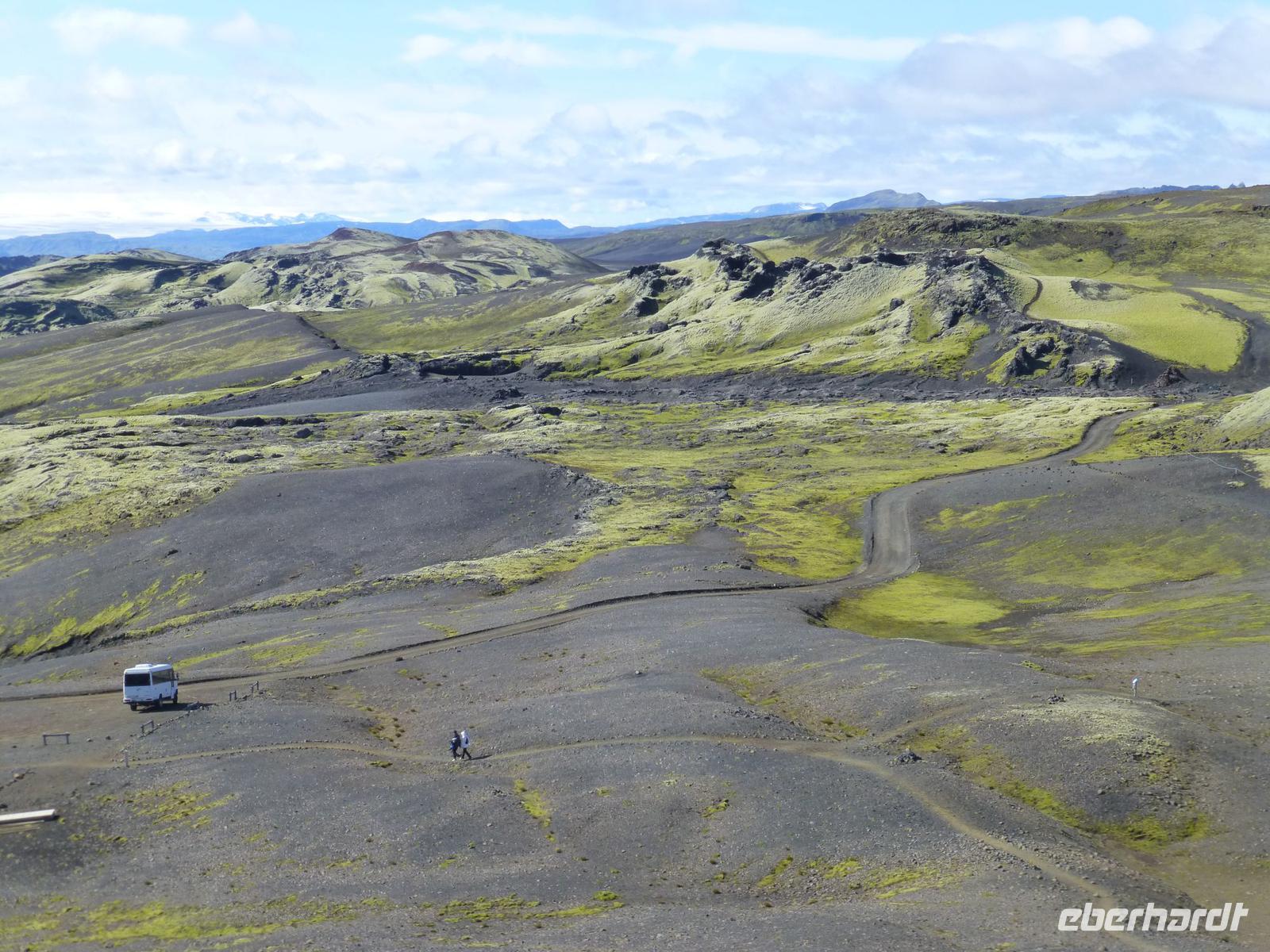 Nach unserem Mittagspicknick am Laki fuhren wir zum Kratersee Tjarnargigur, wo wir einen kleinen Spaziergang zum Kraterkegel unternahmen. Auf einer abschließenden Panorama-Rundfahrt durch das Lakagigar-Gebiet sahen wir noch einmal die Weite der Lavafelder und die gigantischen Krater, bevor wir die Rückfahrt antraten und unser Hotel „Klaustur" in Kirkjubaejarklaustur erreichten.