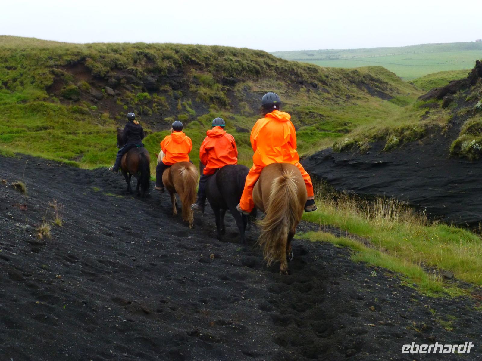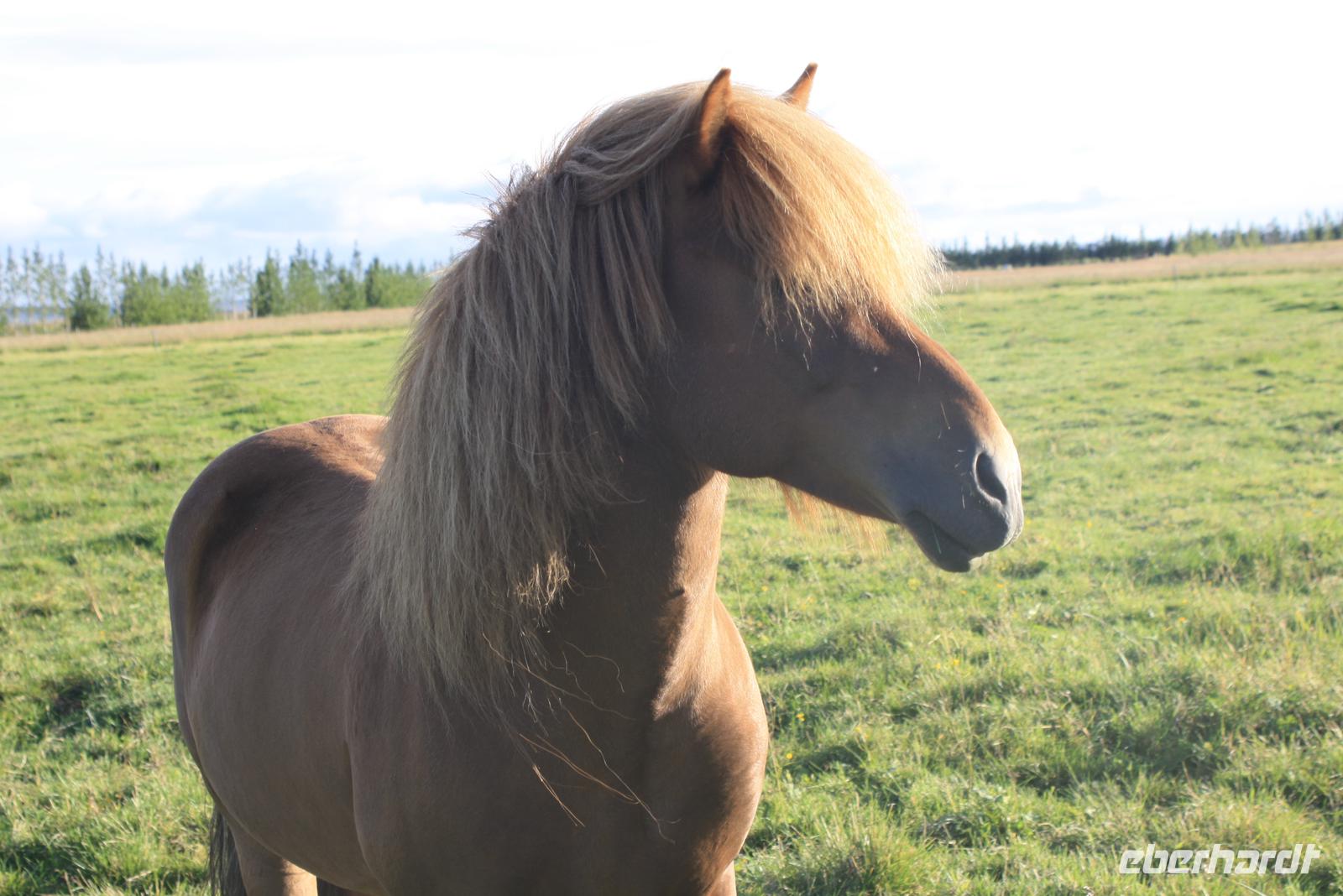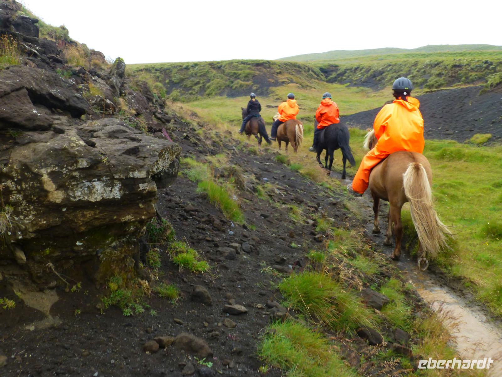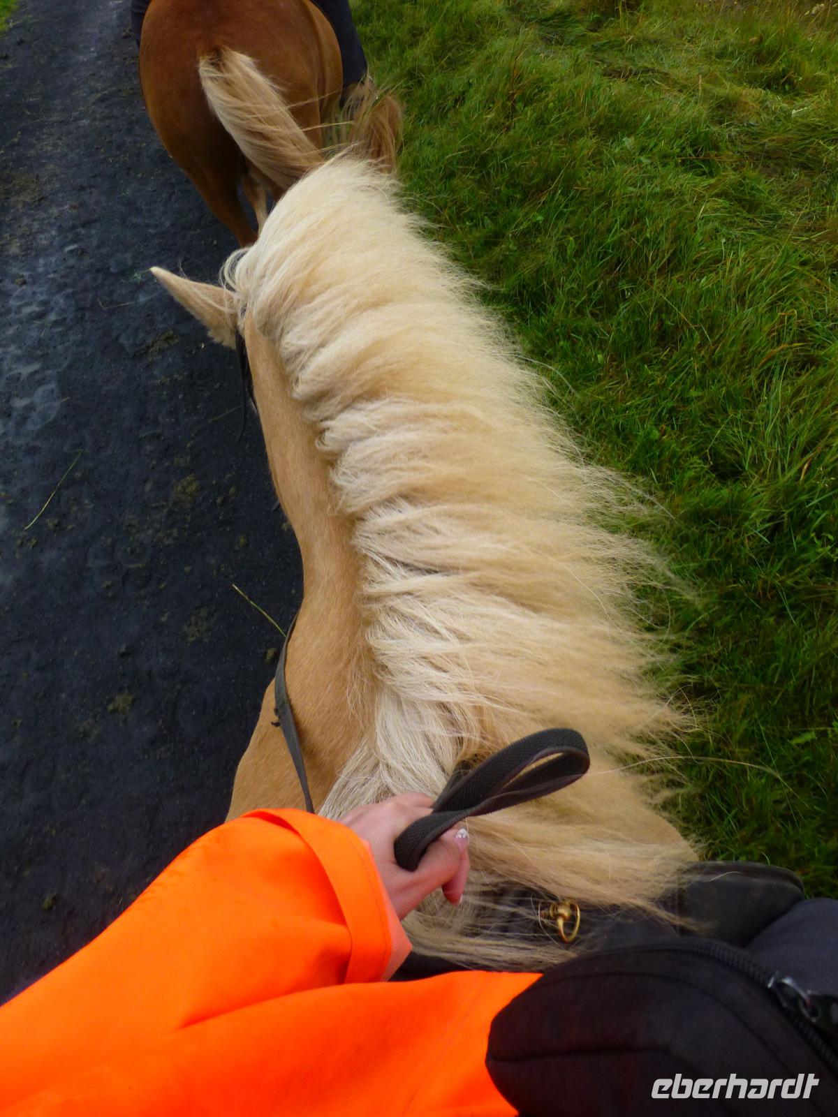 Am Nachmittag erwartete uns der nächste aktive Höhepunkt der Reise - unsere Reittour auf Islandpferden. Auf dem Reiterhof Hestheimar Wurden wir bereits mit gesattelten Pferden erwartet. Zunächst gab es für jeden einen Reithelm und wetterfeste Überziehkleidung. Nach einer kurzen Einweisung stiegen wir auf die gutmütigen und mit etwa 130 cm Stockmaß nicht allzu großen Islandpferde. Nach ein paar Proberunden in der Reithalle ging es mit zwei Begleit-Reiterinnen nach draußen ins Gelände. Im gemächlichen Schritttempo trugen uns die Pferde trittsicher entlang der schmalen Trampelpfade und durch mehrere kleine Flüsse. Das die meisten von uns noch keinerlei Reiterfahrung hatten, war kein Problem. Sicher und trockenen Fußes erreichten wir wieder den Reiterhof. Das war ein tierisches Naturerlebnis!