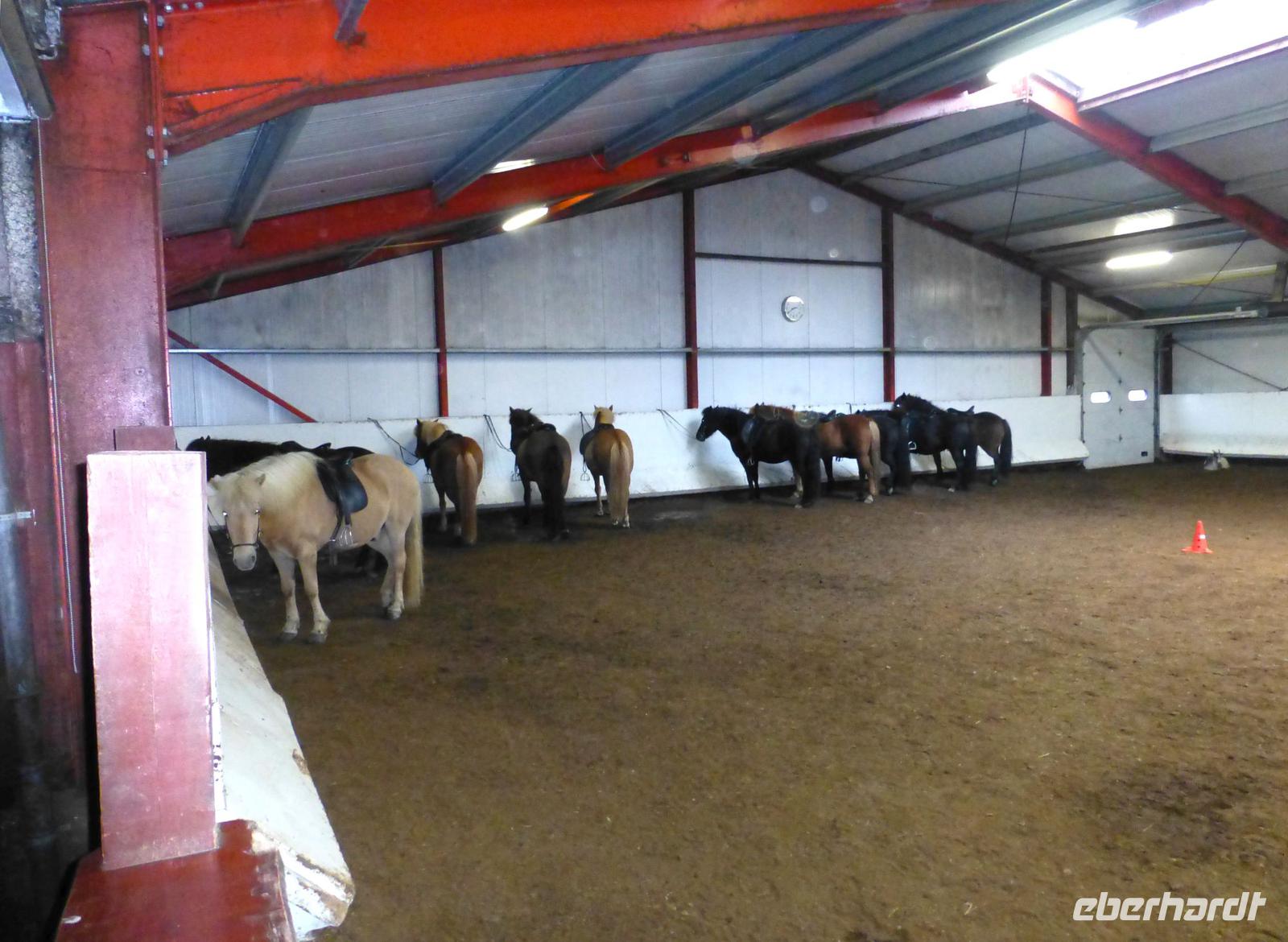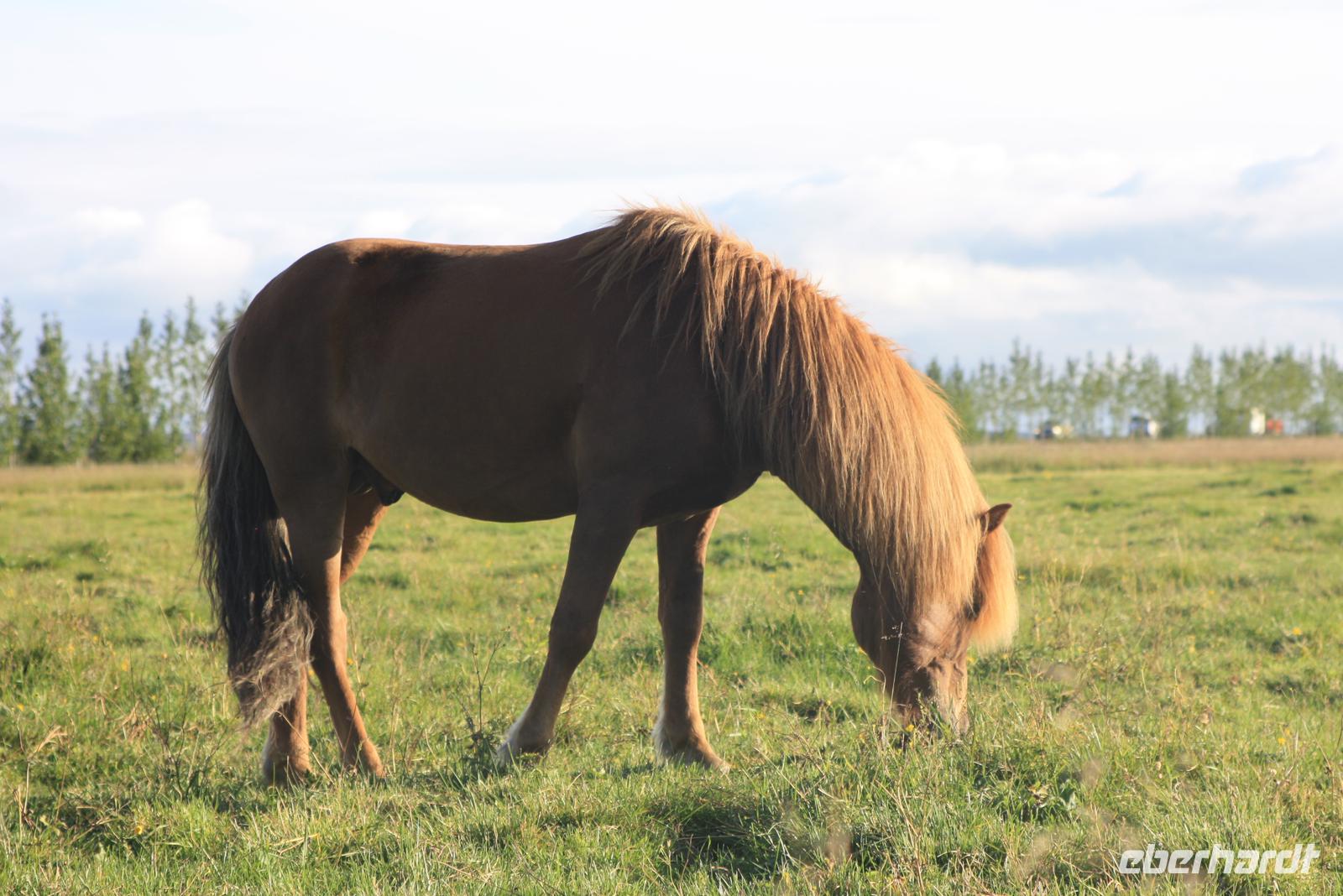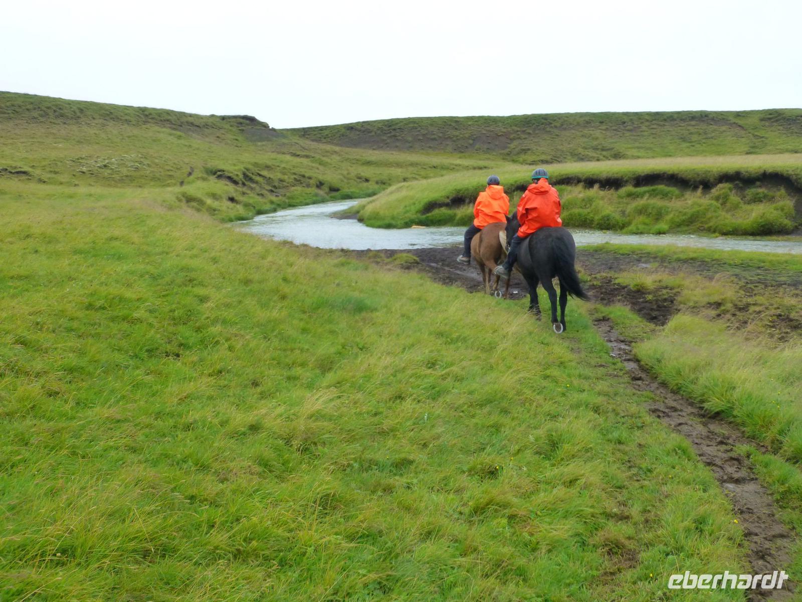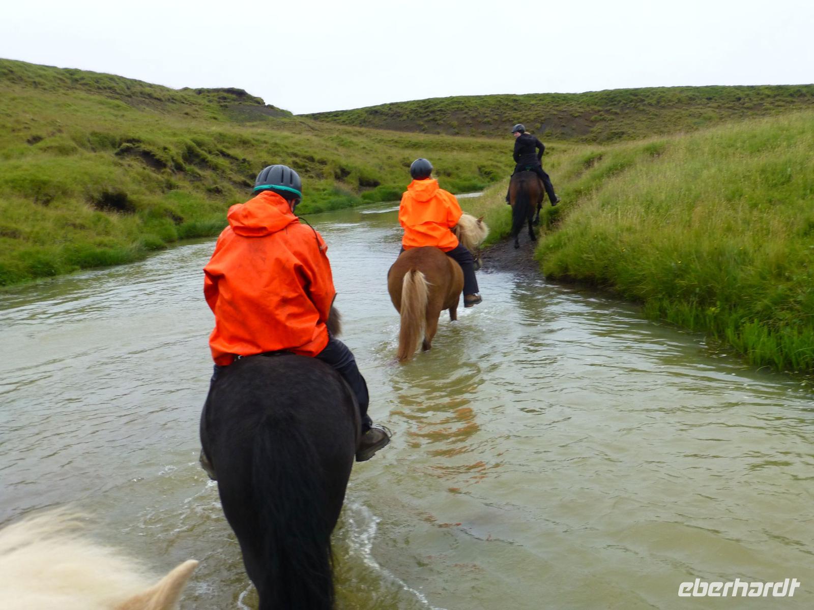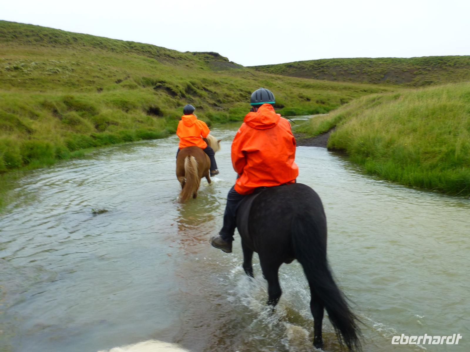 Am Nachmittag erwartete uns der nächste aktive Höhepunkt der Reise - unsere Reittour auf Islandpferden. Auf dem Reiterhof Hestheimar Wurden wir bereits mit gesattelten Pferden erwartet. Zunächst gab es für jeden einen Reithelm und wetterfeste Überziehkleidung. Nach einer kurzen Einweisung stiegen wir auf die gutmütigen und mit etwa 130 cm Stockmaß nicht allzu großen Islandpferde. Nach ein paar Proberunden in der Reithalle ging es mit zwei Begleit-Reiterinnen nach draußen ins Gelände. Im gemächlichen Schritttempo trugen uns die Pferde trittsicher entlang der schmalen Trampelpfade und durch mehrere kleine Flüsse. Das die meisten von uns noch keinerlei Reiterfahrung hatten, war kein Problem. Sicher und trockenen Fußes erreichten wir wieder den Reiterhof. Das war ein tierisches Naturerlebnis!