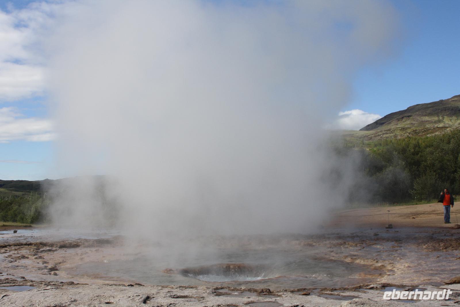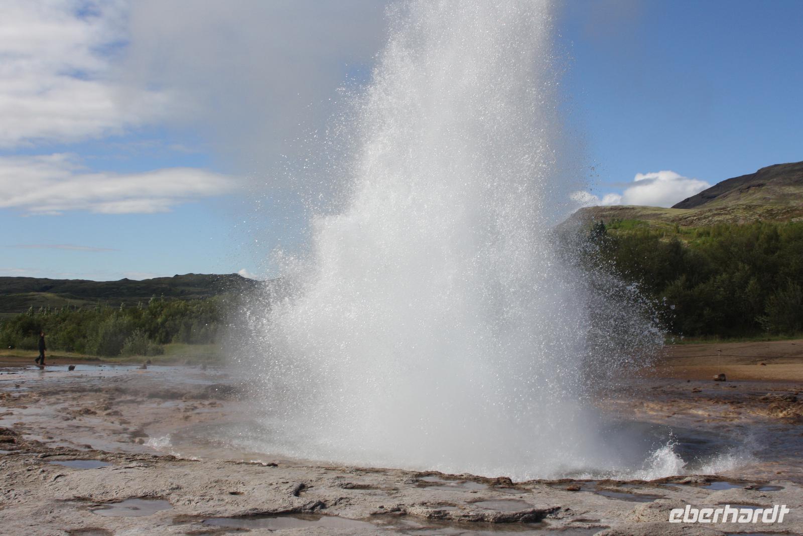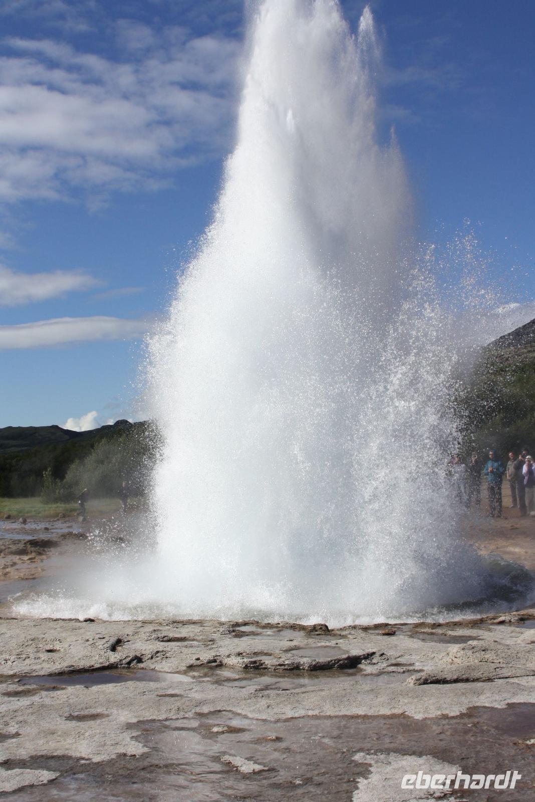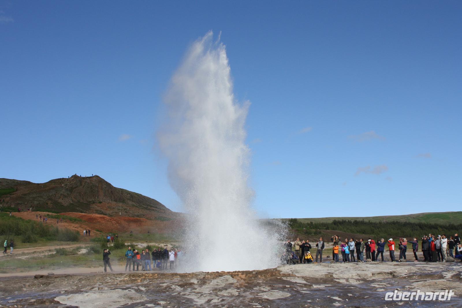 Weiter ging es mit dem Bus zum Geysirfeld, wo wir uns nach einer Verkostung isländischer Spezialitäten auf einen Rundgang zu den heißen Quellen und Geysiren begaben. Der aktive Geysir Strokkur spannte uns ein paar Mal auf die Folter, bis er sich mit lautem Getöse in eine bis zu 30 Meter hohe Wassersäule aufbäumte. Wahnsinn! Der alte Geysir, nach dem alle Geysire der Welt benannt sind, soll zu seinen aktiven Zeiten bis zu 100 Meter emporgeschossen sein. Heutzutage ist er leider inaktiv und man sieht nur den riesigen, mit heißem Wasser gefüllten Krater.