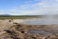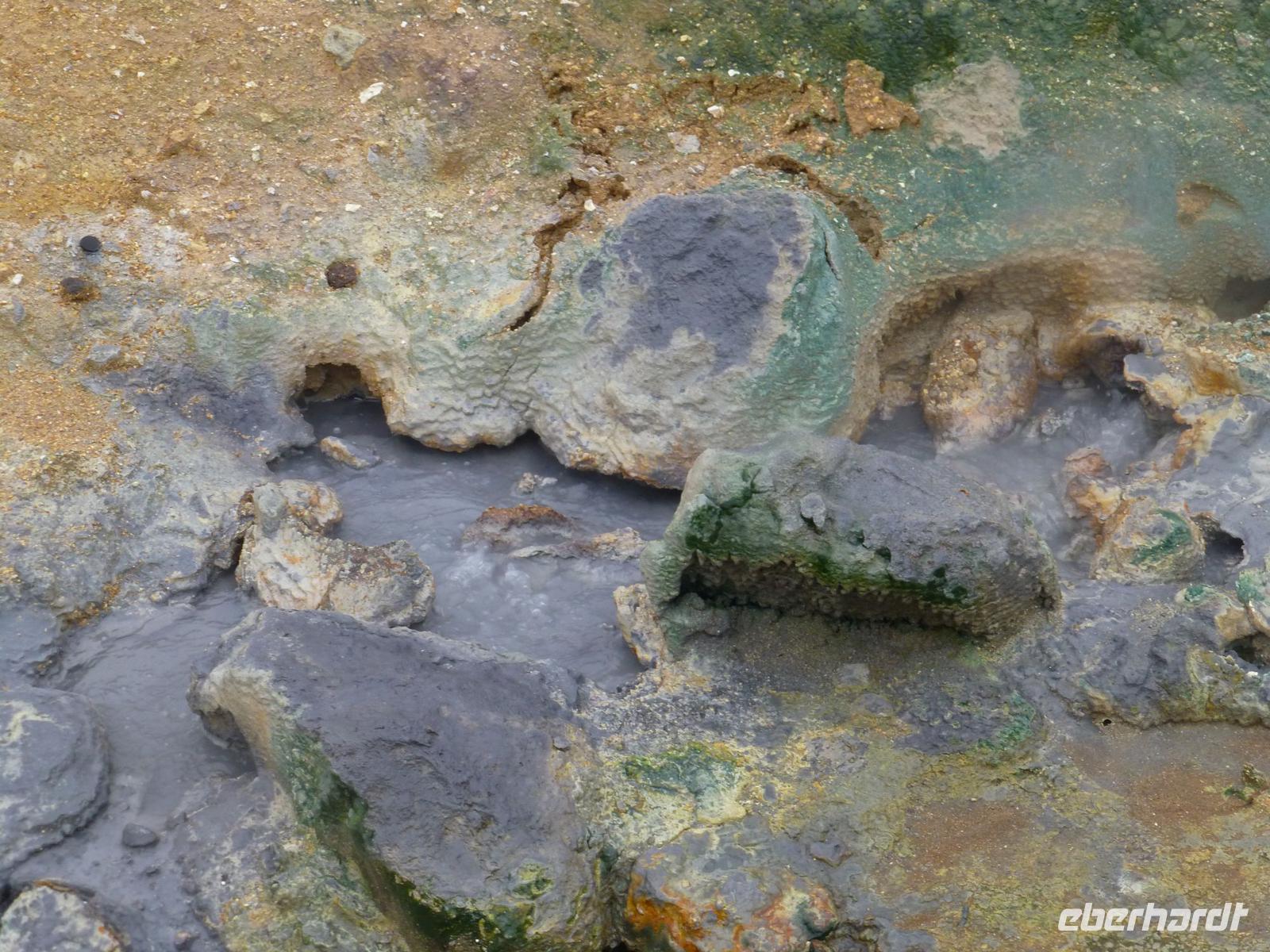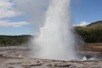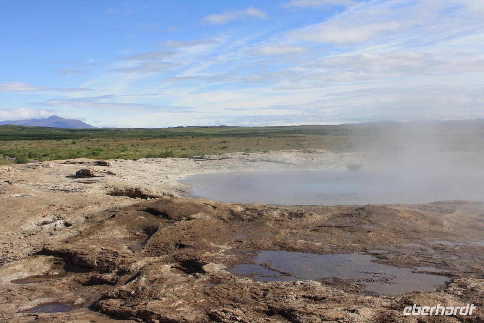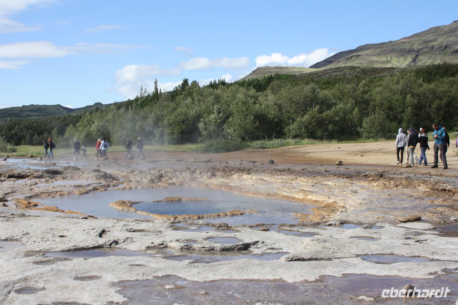 Weiter ging es mit dem Bus zum Geysirfeld, wo wir uns nach einer Verkostung isländischer Spezialitäten auf einen Rundgang zu den heißen Quellen und Geysiren begaben. Der aktive Geysir Strokkur spannte uns ein paar Mal auf die Folter, bis er sich mit lautem Getöse in eine bis zu 30 Meter hohe Wassersäule aufbäumte. Wahnsinn! Der alte Geysir, nach dem alle Geysire der Welt benannt sind, soll zu seinen aktiven Zeiten bis zu 100 Meter emporgeschossen sein. Heutzutage ist er leider inaktiv und man sieht nur den riesigen, mit heißem Wasser gefüllten Krater.