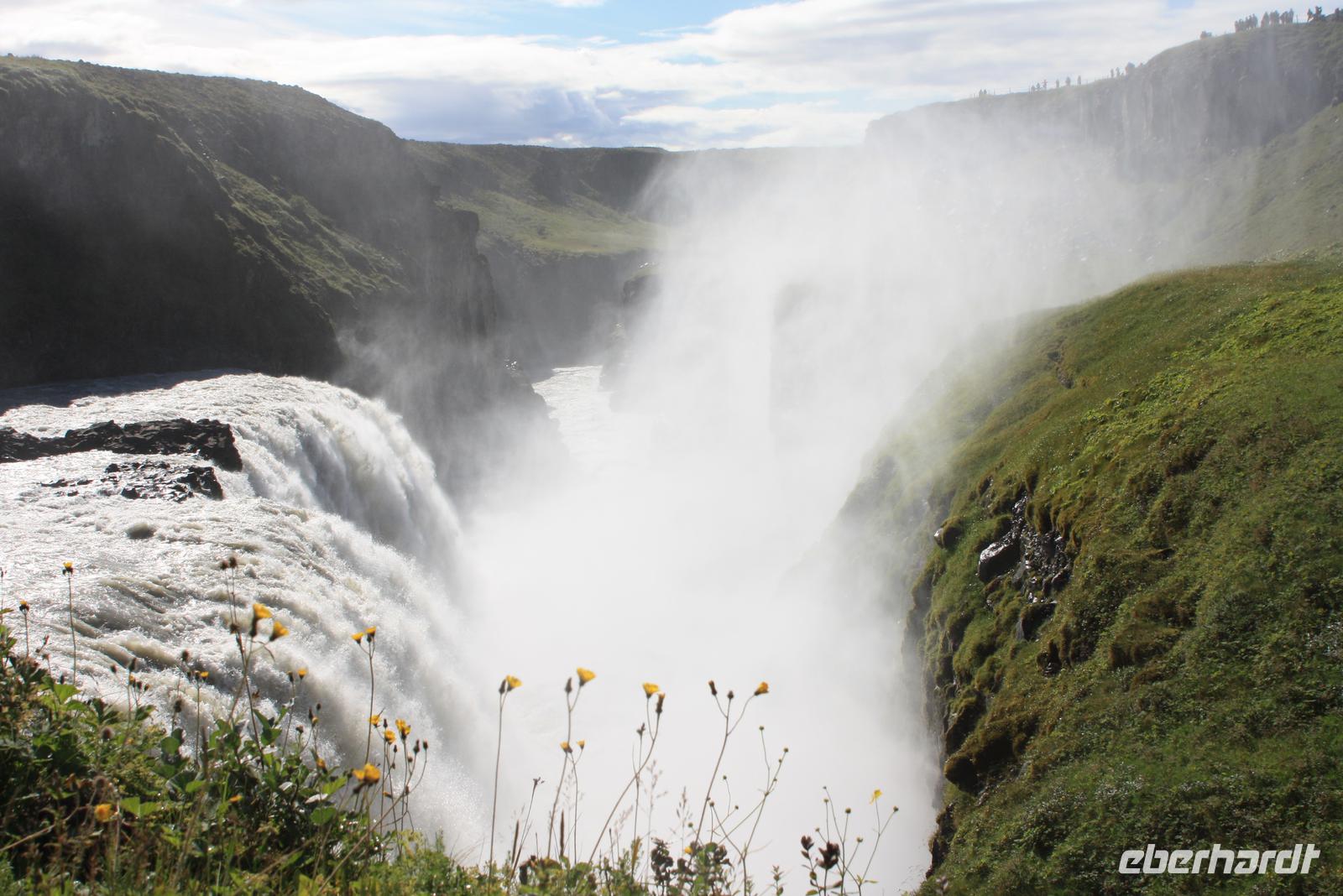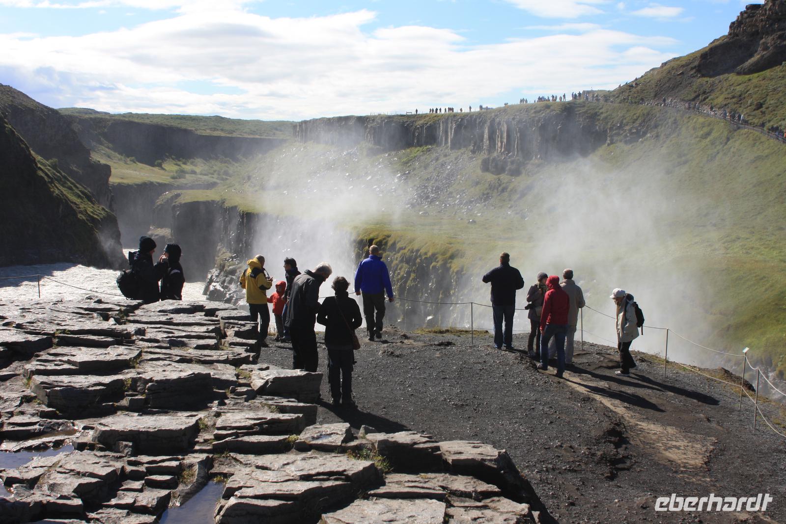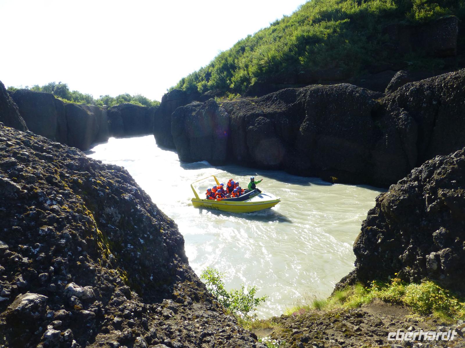 Nächster Besichtigungspunkt war der „Goldene Wasserfall" Gullfoss. Der Fluss Hvita rauscht hier in zwei Stufen hinab. Wir unternahmen eine kleine Wanderung zu den verschiedenen Aussichtsterrassen und stärkten uns bei einem Mittagspicknick, bevor wir zu unserem Rafting-Abenteuer aufbrachen. Mit unserem Bus fuhren wir flussabwärts zum Basiscamp auf einem Bauernhof. Gemeinsam mit anderen Rafting-Lustigen bekamen wir hier unsere Ausrüstung aus Neopren-Anzug, Schwimmweste, Helm und Schuhen. Mit den typischen gelben Schulbussen ging es über die Schotterpiste bis zur Einstiegsstelle am Fluss Hvita. Wir bekamen jeder ein Paddel und eine Einweisung zum Verhalten im Boot und zur Paddeltechnik, bevor wir mit unserem Rafting-Guide unser großes Schlauchboot bestiegen. Nach ein paar Übungen im ruhigen Wasser wagten wir uns schließlich auf die Rafting-Strecke. Mit Ausstiegspause zwischendurch dauerte die Tour etwa zwei Stunden. Wilde Stromschnellen, Kurven und Felsentore machten die Fahrt wahrlich erlebnisreich. Wir wurden ziemlich nass, aber keiner ist aus dem Boot gefallen . Das war ein Gaudi und ein echtes arktisches Abenteuer!