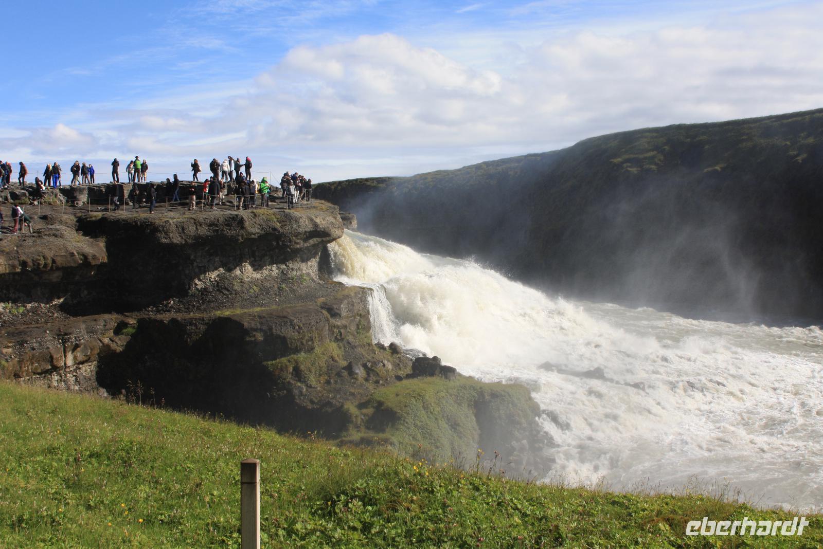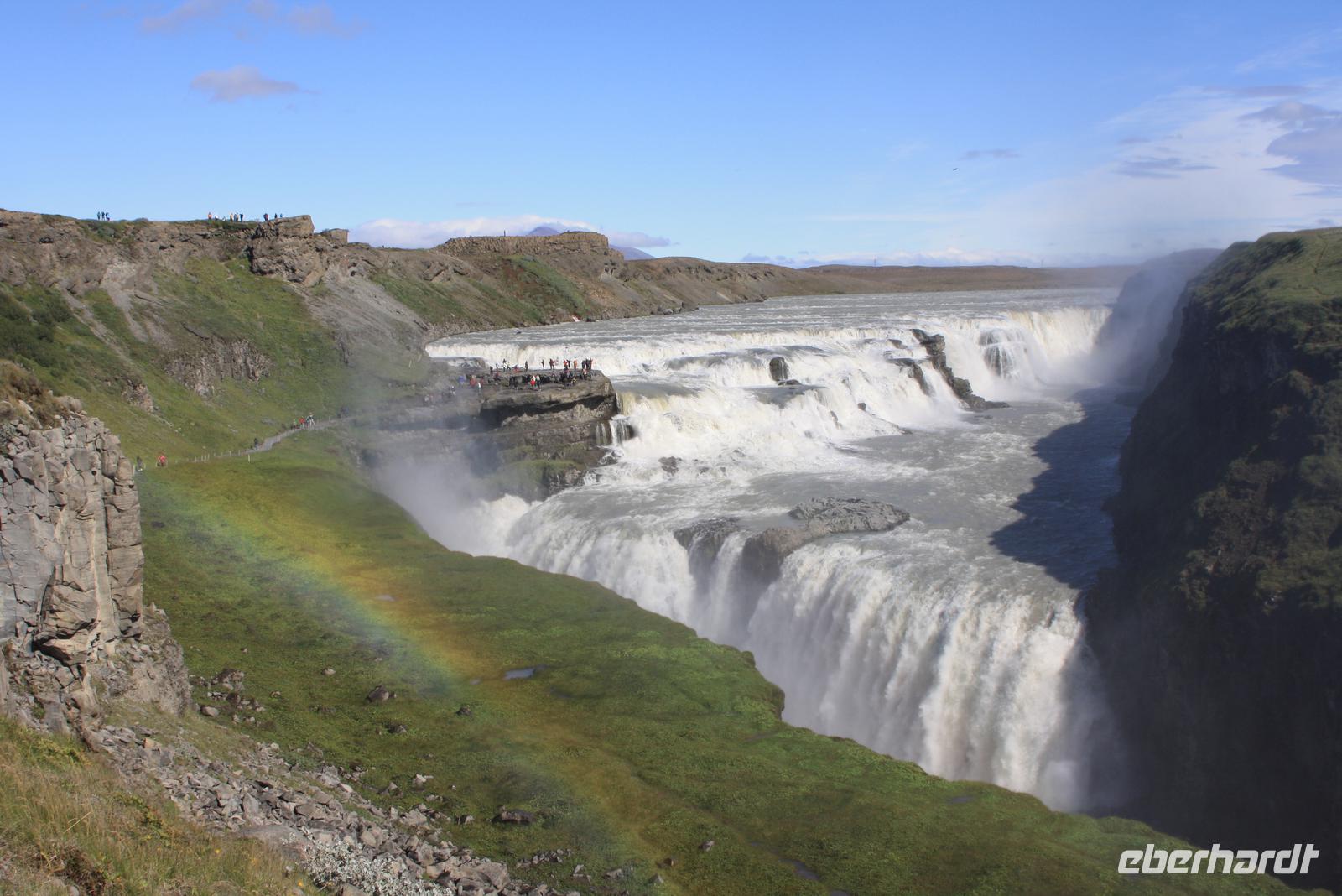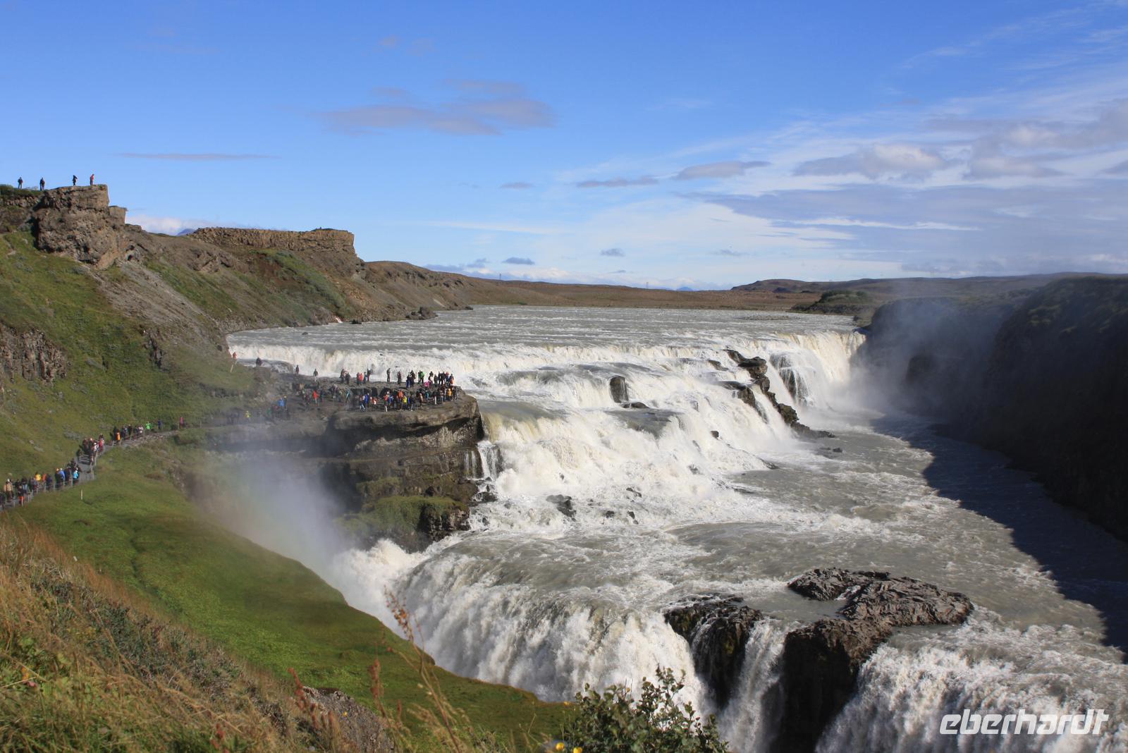 Nächster Besichtigungspunkt war der „Goldene Wasserfall" Gullfoss. Der Fluss Hvita rauscht hier in zwei Stufen hinab. Wir unternahmen eine kleine Wanderung zu den verschiedenen Aussichtsterrassen und stärkten uns bei einem Mittagspicknick, bevor wir zu unserem Rafting-Abenteuer aufbrachen. Mit unserem Bus fuhren wir flussabwärts zum Basiscamp auf einem Bauernhof. Gemeinsam mit anderen Rafting-Lustigen bekamen wir hier unsere Ausrüstung aus Neopren-Anzug, Schwimmweste, Helm und Schuhen. Mit den typischen gelben Schulbussen ging es über die Schotterpiste bis zur Einstiegsstelle am Fluss Hvita. Wir bekamen jeder ein Paddel und eine Einweisung zum Verhalten im Boot und zur Paddeltechnik, bevor wir mit unserem Rafting-Guide unser großes Schlauchboot bestiegen. Nach ein paar Übungen im ruhigen Wasser wagten wir uns schließlich auf die Rafting-Strecke. Mit Ausstiegspause zwischendurch dauerte die Tour etwa zwei Stunden. Wilde Stromschnellen, Kurven und Felsentore machten die Fahrt wahrlich erlebnisreich. Wir wurden ziemlich nass, aber keiner ist aus dem Boot gefallen . Das war ein Gaudi und ein echtes arktisches Abenteuer!