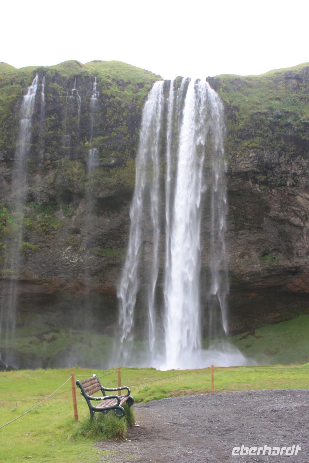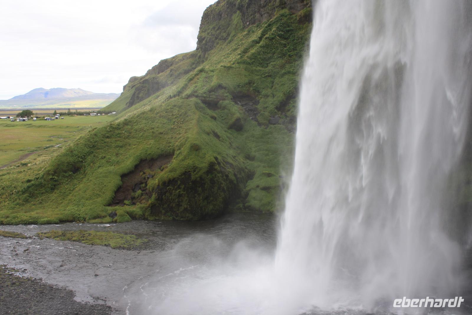 Bevor wir heute ins Landesinnere aufbrachen, besuchten wir unseren nächsten Wasserfall - den schönen Seljalandsfoss. Das Besondere an ihm ist, dass man auf einem kleinen Wanderweg hinter den Wasserfall entlang gehen kann, natürlich mit Regenjacke und guten Wanderschuhen ausgestattet. So konnten wir den Seljalandsfoss mit allen Sinnen genießen - das Hinabrauschen des Wassers, den Sprühnebel auf der Haut und die einmalige Kulisse hinter dem Wasserschleier.