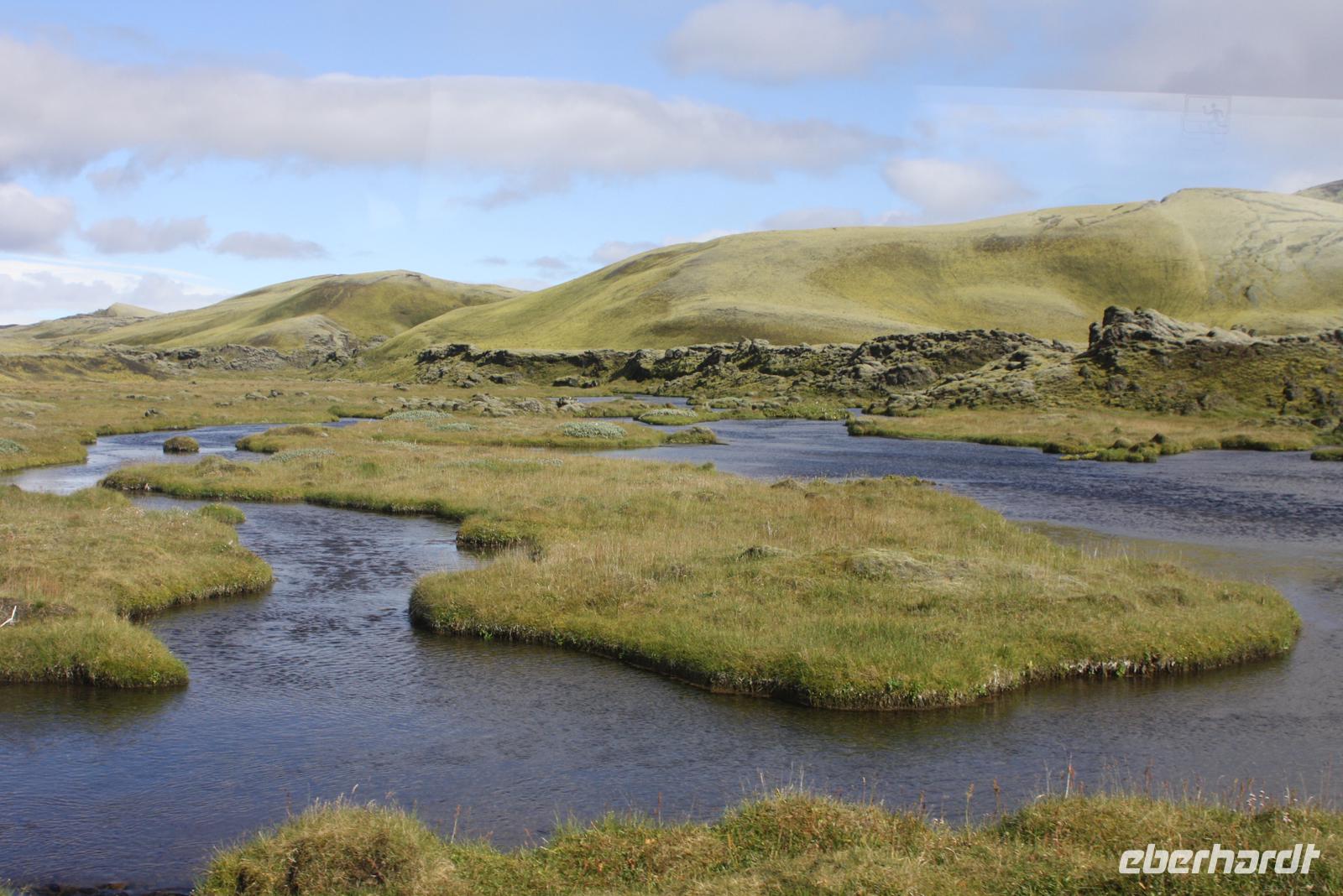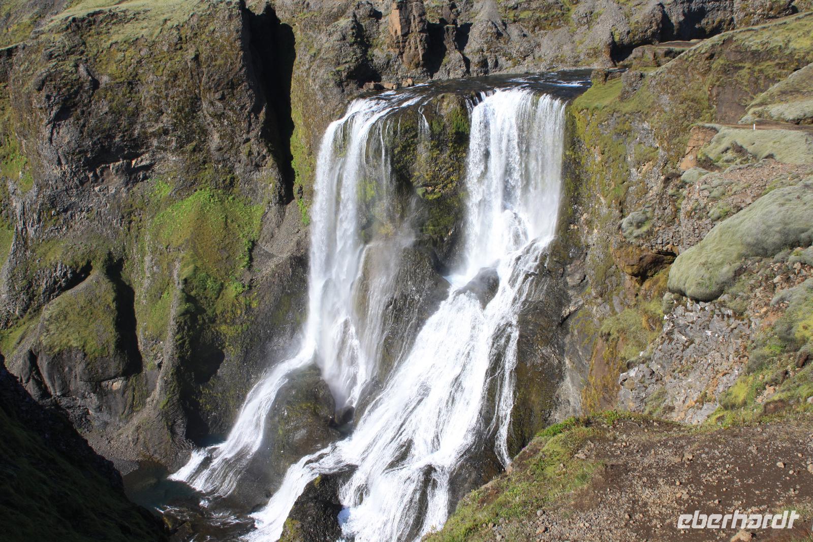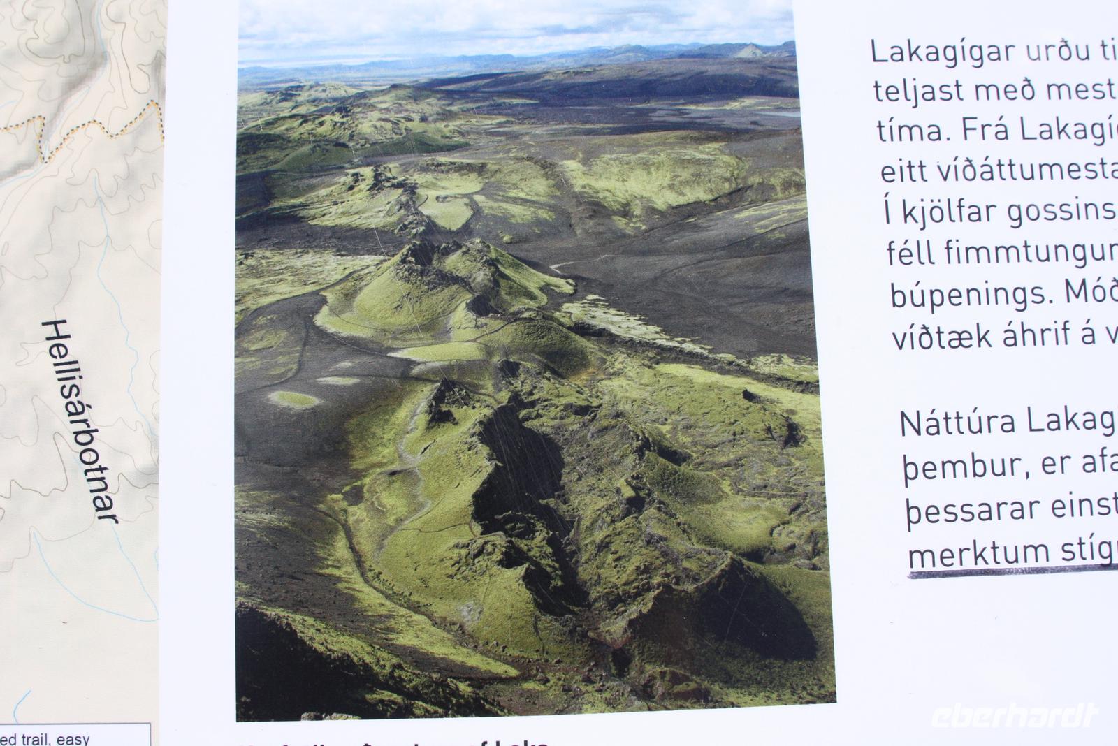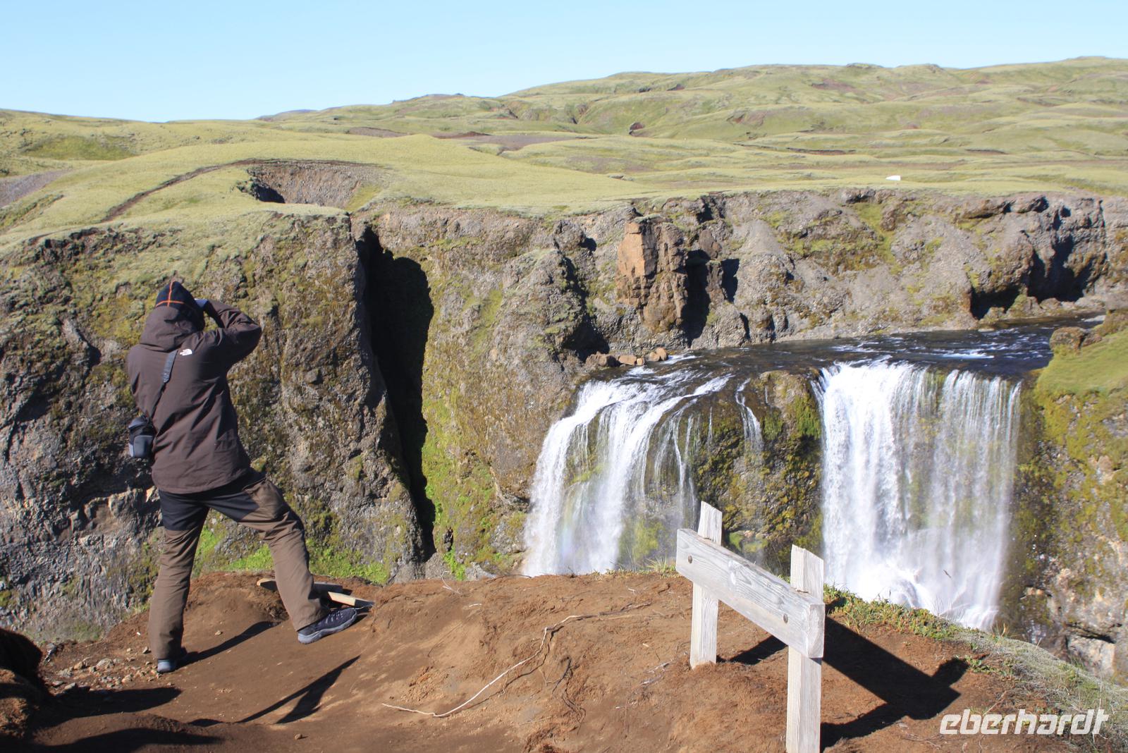 Unser eigentliches Tagesziel war aber die Laki-Kraterreihe (Lakagigar), die dem Vulkansystem der Grimsvötn zugerechnet wird. Im Jahr 1783 gab es hier mehrere Erdbeben und Vulkanausbrüche entlang der 25 Kilometer langen Spalte, die so gewaltig waren, dass sie Auswirkungen auf das weltweite Klima hatten. Das größte Lavafeld seit Geschichte der Menschheit - das Laki-Lavafeld - entstand. Die Dimension dieses Lavafelds konnten wir bei der Fahrt entlang der Südküste und zur Laki-Kraterreihe selbst bestaunen. Etwa zwei Stunden dauerte die Fahrt entlang der Schotterpiste ins Hochland. Auf halbem Weg legten wir einen Stopp am „Schönen Wasserfall" - dem Fagrifoss - ein, der hier mitten im Hochland des Vatnajökull-Nationalparks liegt.