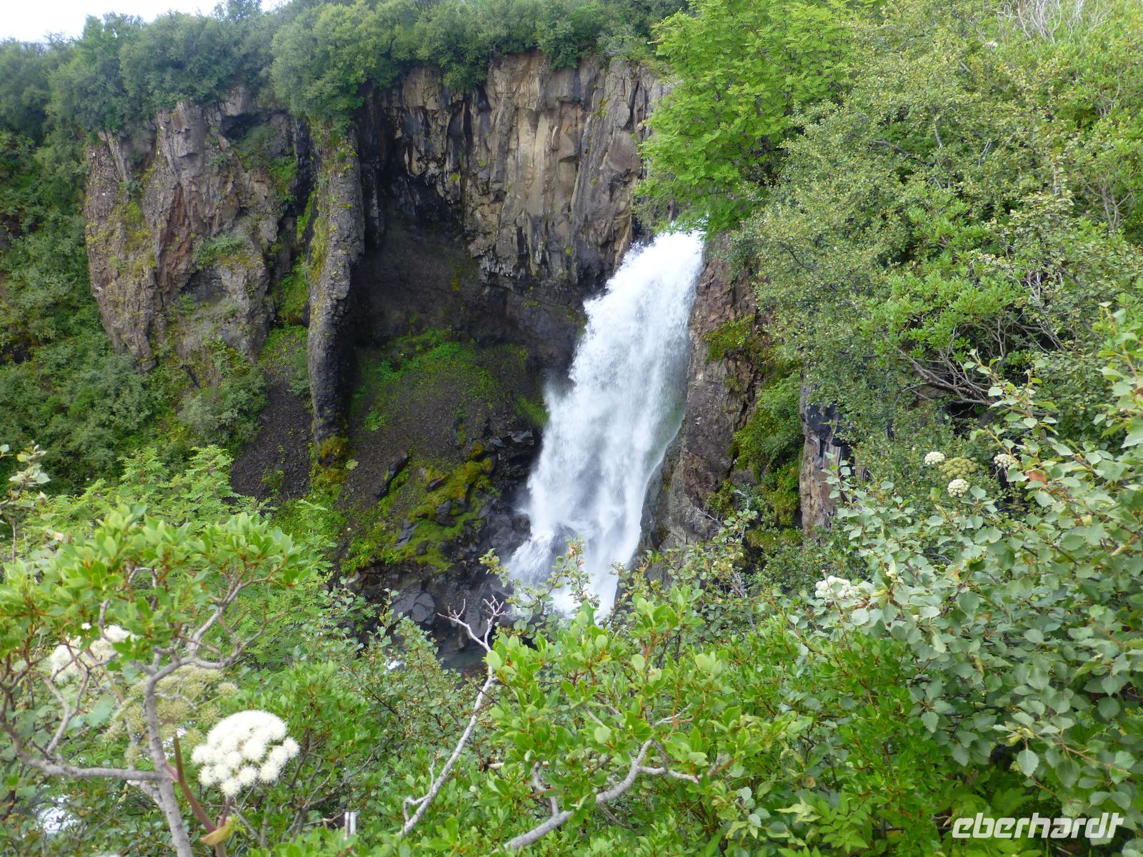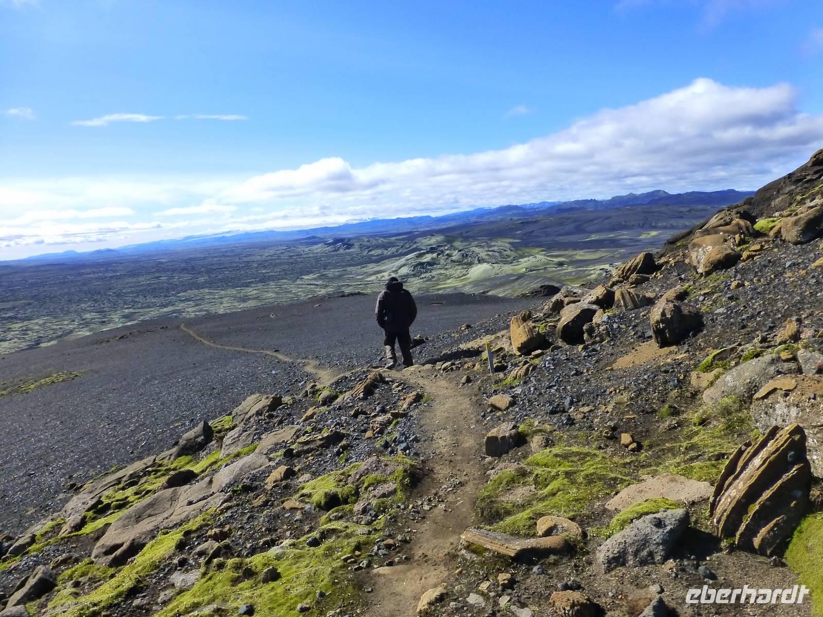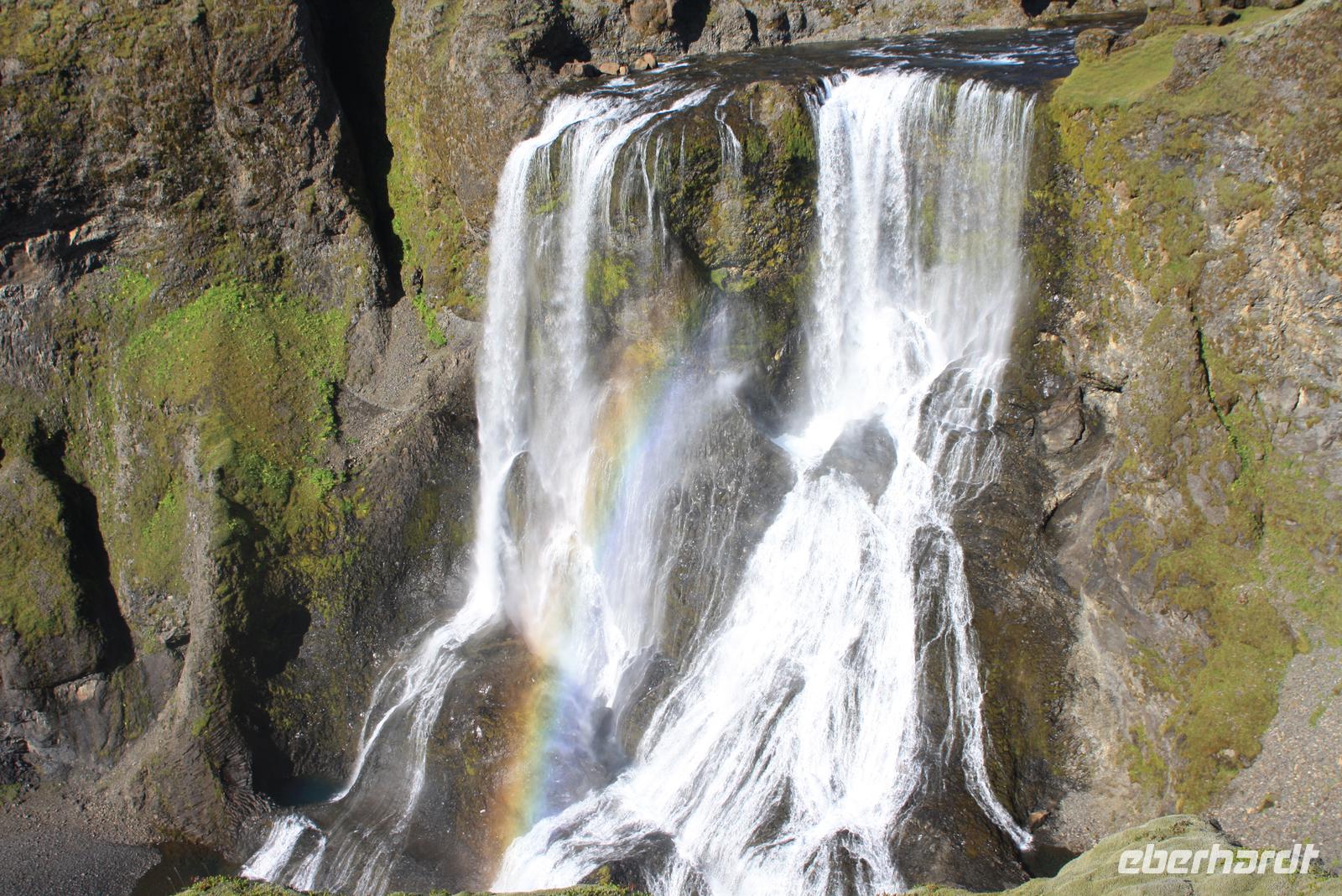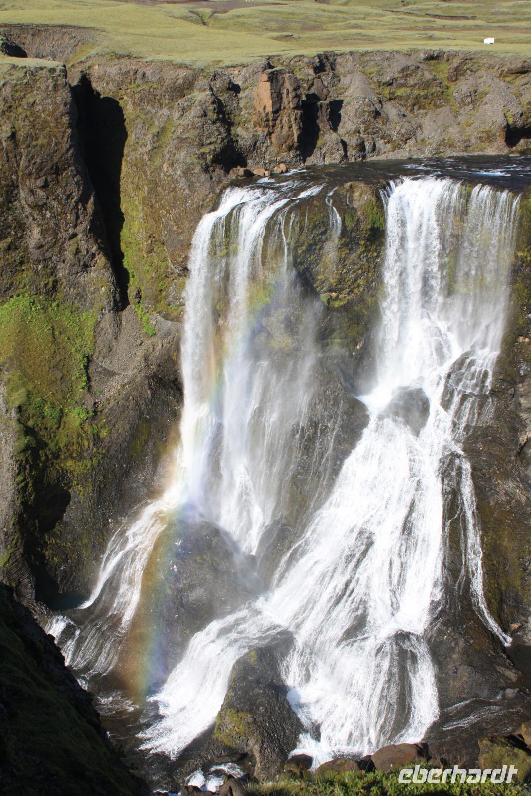 Unser eigentliches Tagesziel war aber die Laki-Kraterreihe (Lakagigar), die dem Vulkansystem der Grimsvötn zugerechnet wird. Im Jahr 1783 gab es hier mehrere Erdbeben und Vulkanausbrüche entlang der 25 Kilometer langen Spalte, die so gewaltig waren, dass sie Auswirkungen auf das weltweite Klima hatten. Das größte Lavafeld seit Geschichte der Menschheit - das Laki-Lavafeld - entstand. Die Dimension dieses Lavafelds konnten wir bei der Fahrt entlang der Südküste und zur Laki-Kraterreihe selbst bestaunen. Etwa zwei Stunden dauerte die Fahrt entlang der Schotterpiste ins Hochland. Auf halbem Weg legten wir einen Stopp am „Schönen Wasserfall" - dem Fagrifoss - ein, der hier mitten im Hochland des Vatnajökull-Nationalparks liegt.