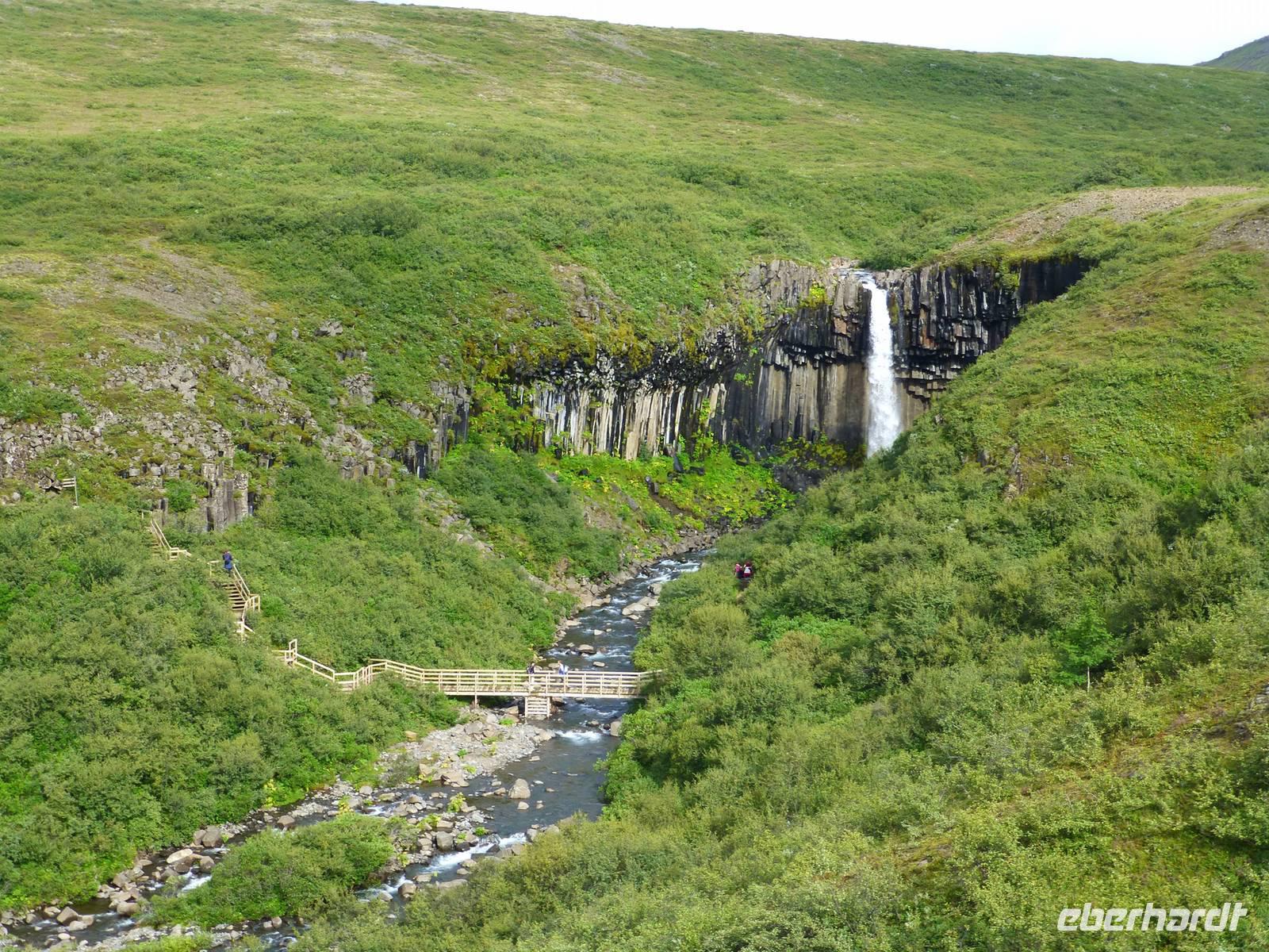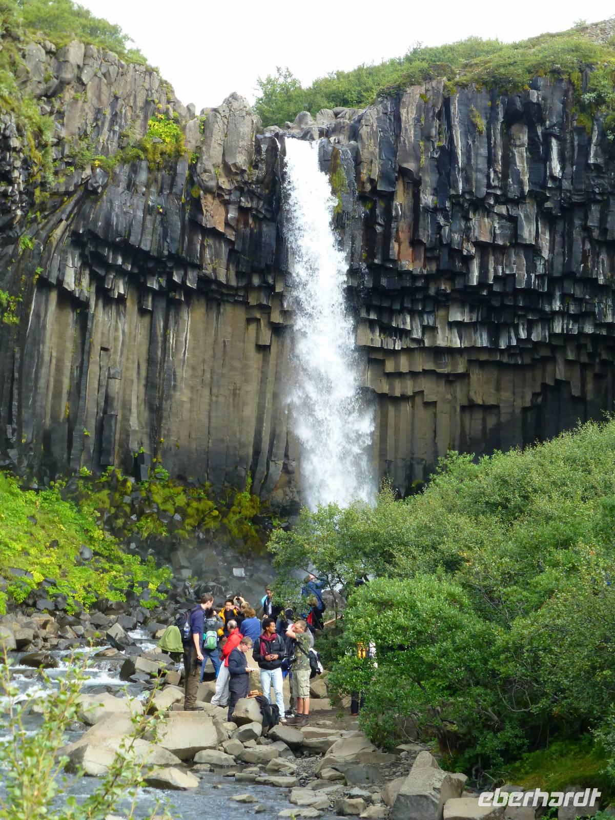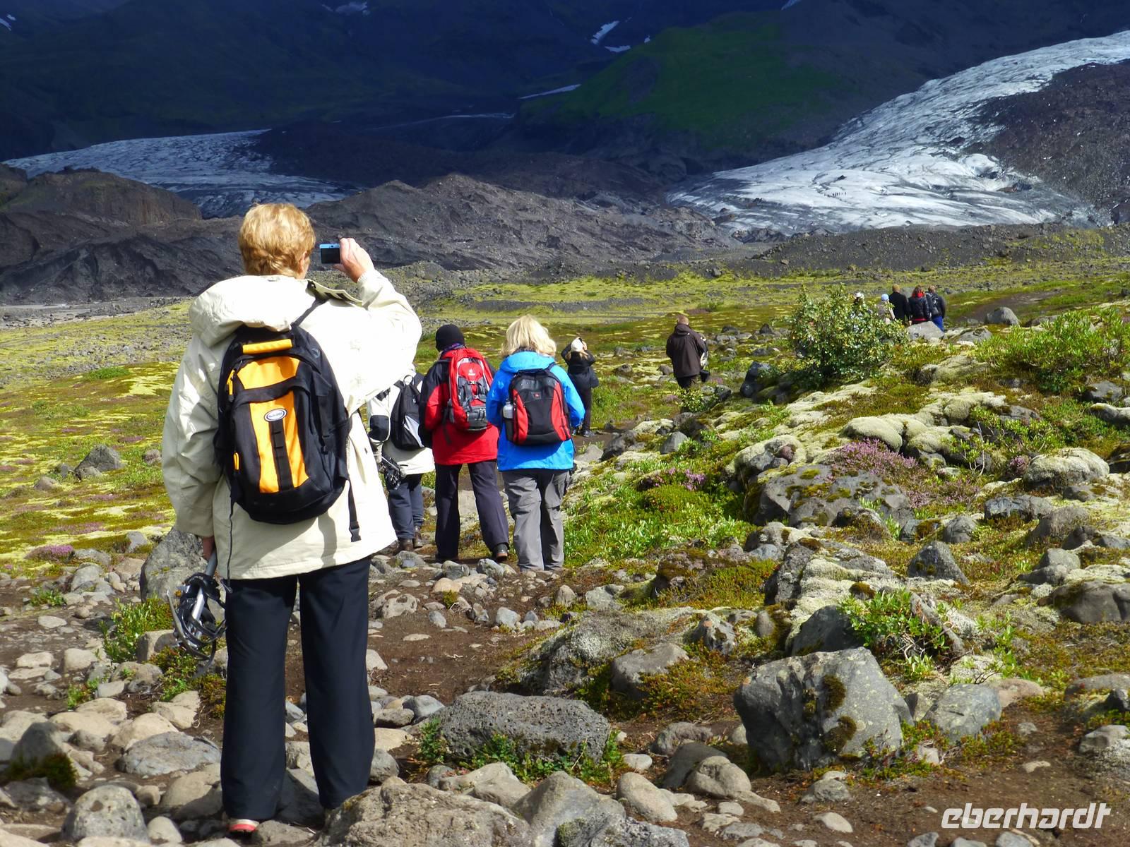 Am nächsten Tag unternahmen wir einen Aktiv-Ausflug in den Skaftafell-Nationalpark. Außerdem sollte es der „Tag der Gletscher" werden, dazu aber später mehr. Nur wenige Fahrtminuten von unserem Hotel entfernt, erreichten wir das Besucherzentrum des Skaftafell-Nationalparks. Hier begannen wir mit Reiseleiter Snorri unsere Wanderung bergauf auf schmalen Pfaden und vorbei an einem Fluss und kleinen Wasserfall zum Aussichtspunkt. Von hier hatten wir einen wunderbaren Blick auf die umliegenden Gletscherfelder und die Gletscherflüsse unten im Tal bis hin zur Atlantikküste. Dann wanderten wir hinunter zum Flusstal und bis zum „Schwarzen Wasserfall", dem Svartifoss, der versteckt hier oben in den Hügeln liegt. Seinen Namen verdankt er den schwarzen Basaltsäulen, die ihn eindrucksvoll umrahmen.