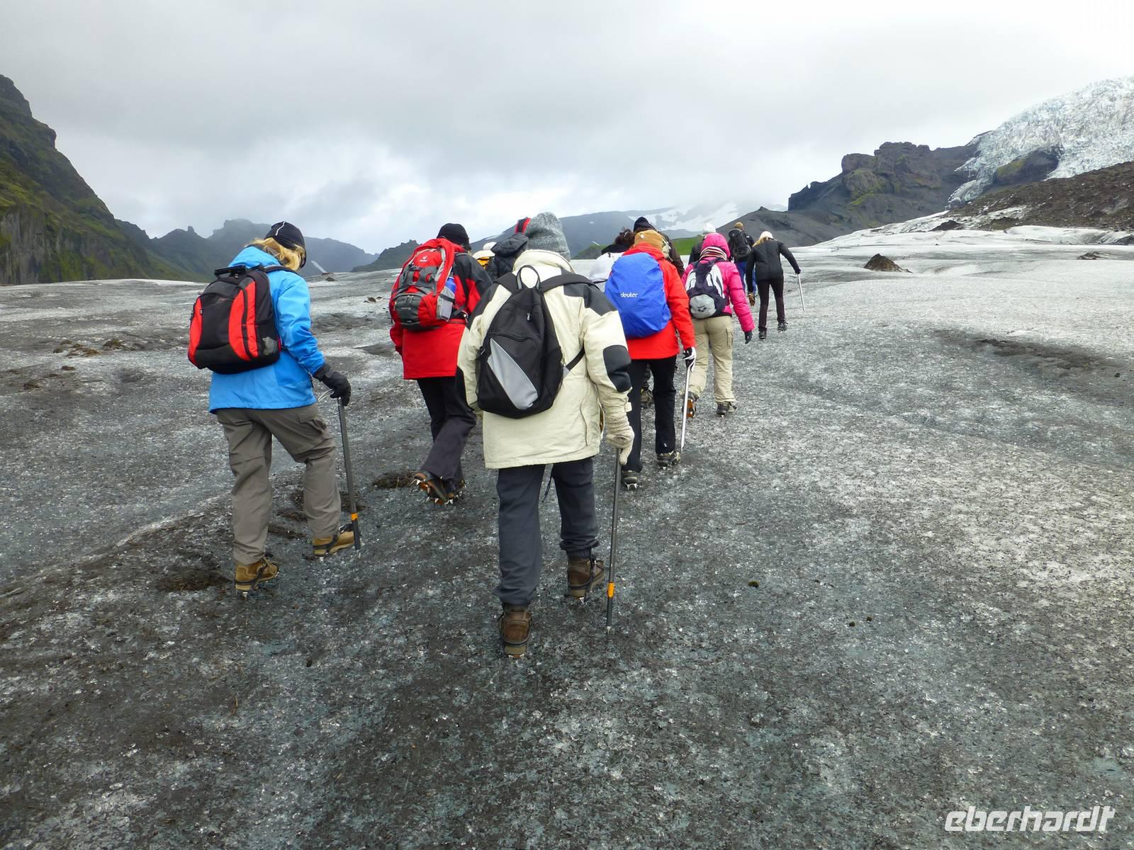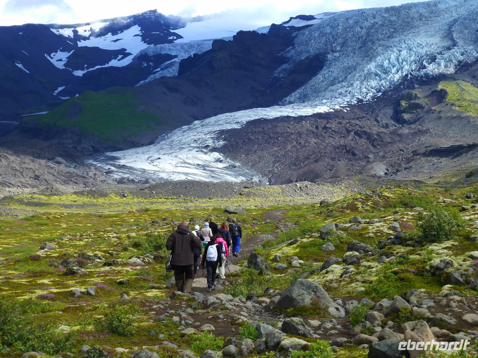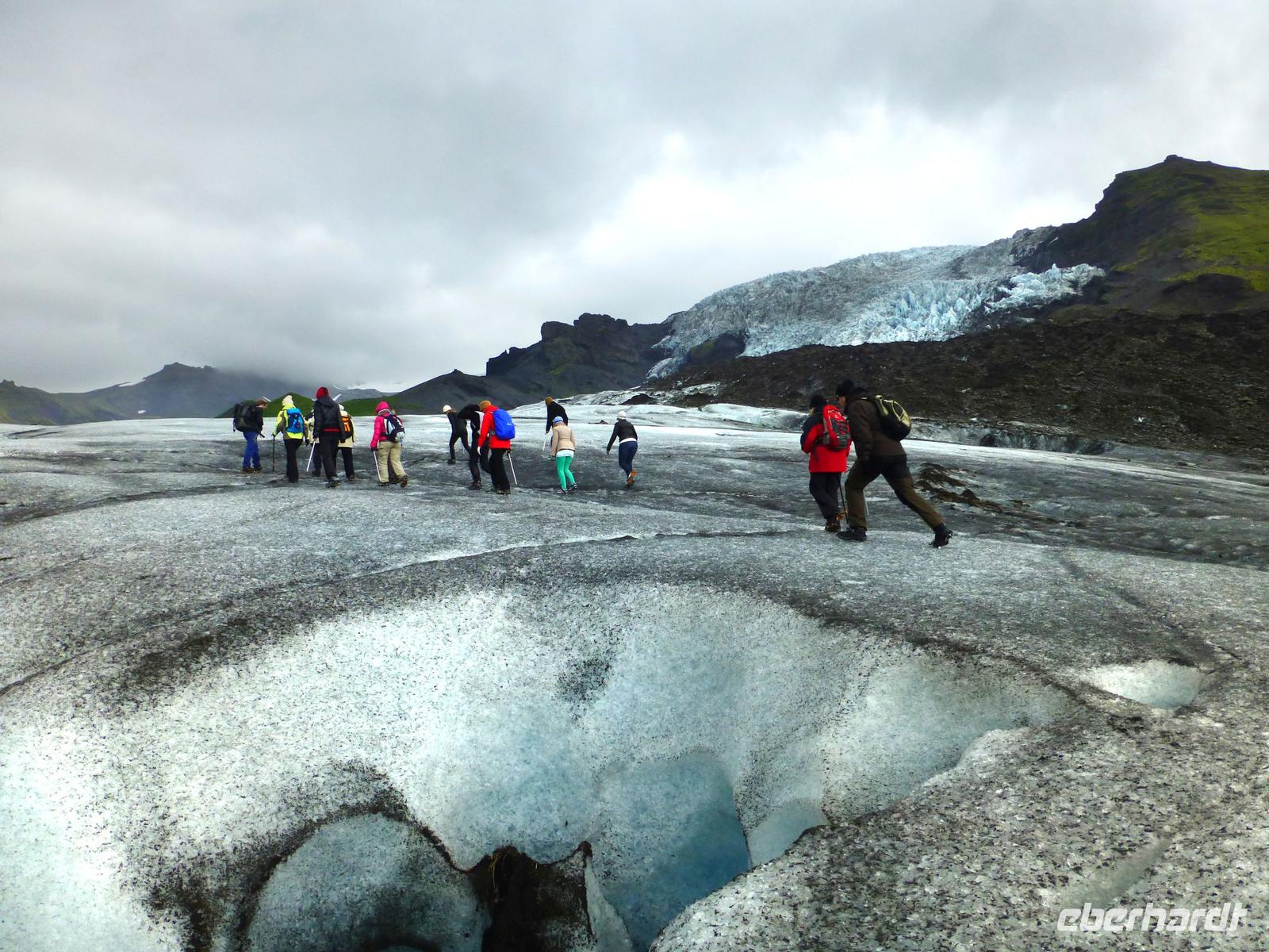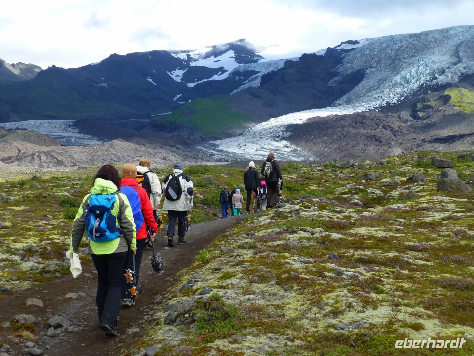Am Besucherzentrum befindet sich auch die Basisstation für die Gletschertouren im Skaftafell-Nationalpark. Wir bekamen unsere Ausrüstung für die Gletscherwanderung - Steigeisen und Eispickel, echt cool! Mit warmen Sachen, Wanderschuhen und möglichst wetterfester Hose und Jacke ausgestattet, fuhren wir zunächst mit einem gelben Schulbus und unseren Gletscherführern zum Fuß des Falljökull. Etwa 30 Minuten dauerte die Wanderung zum Ausläufer der Gletscherzunge, wo wir unter fachkundiger Anleitung unsere Steigeisen unter die Wanderschuhe schnallten. Dann ging es hinauf auf das Jahrtausende alte Gletschereis. Nach einer Einweisung ließ es sich mit den Steigeisen ganz gut laufen. Unser Gletscher-Guide Gisli zeigte uns die Besonderheiten wie Gletscherspalten, tiefe Eislöcher und unterirdische Bachläufe. Nach etwa einer Stunde auf dem Gletscher stiegen wir wieder ab ins Tal und fuhren zurück zum Nationalpark-Zentrum - wieder haben wir ein unvergessliches arktisches Abenteuer erlebt!