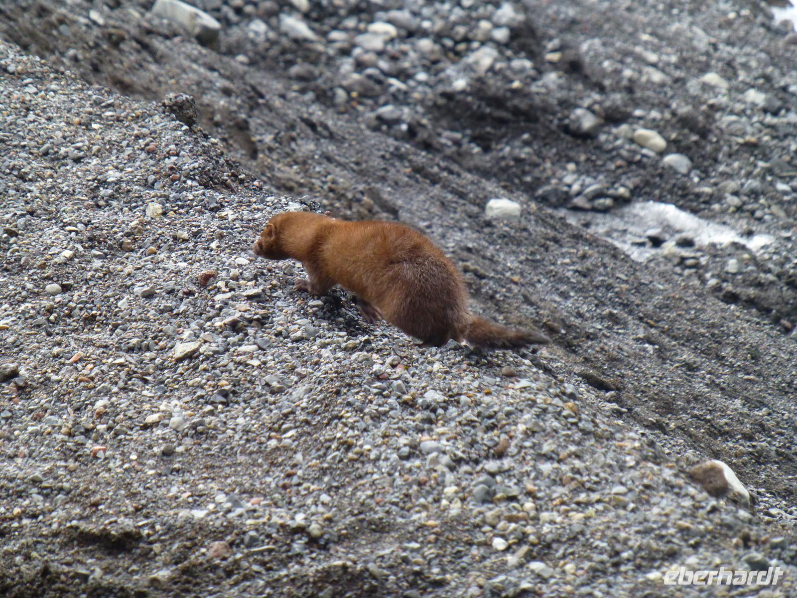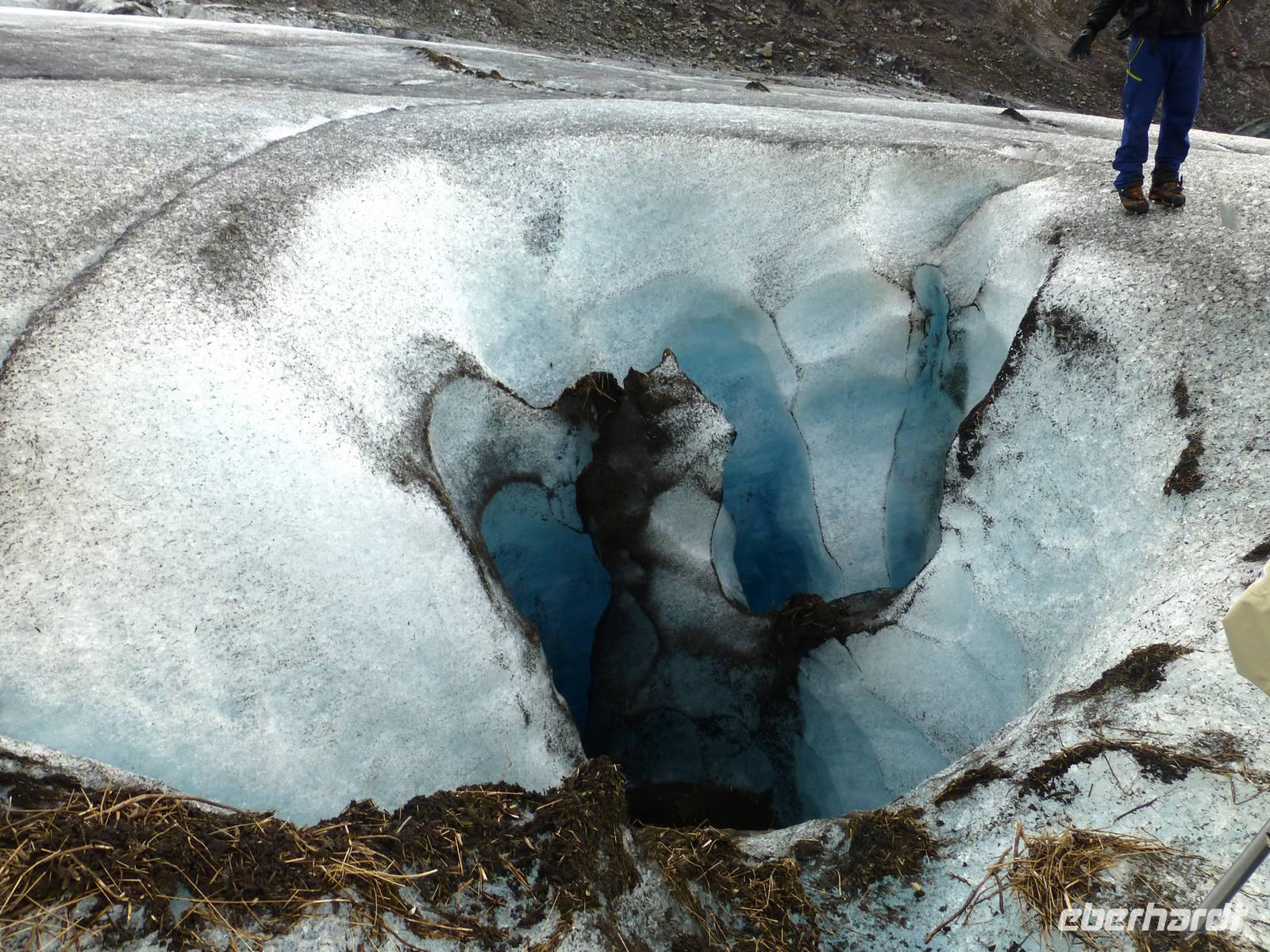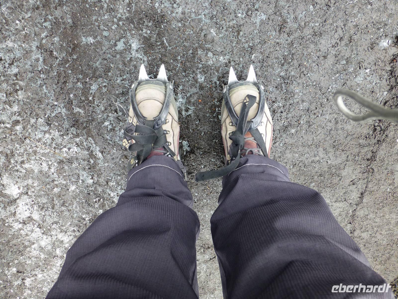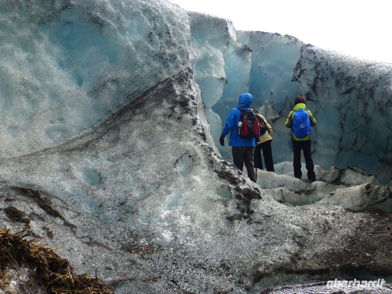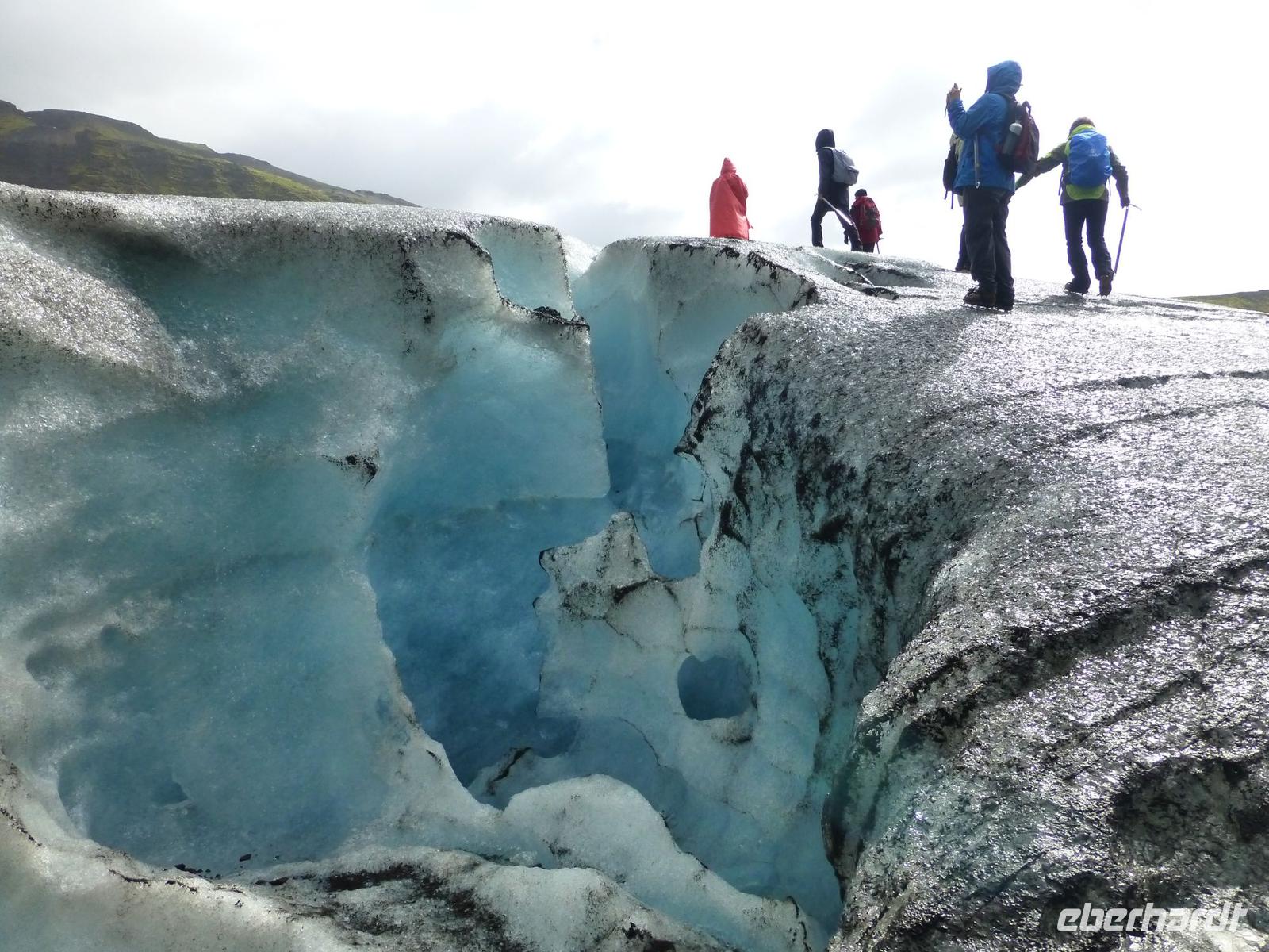 Am Besucherzentrum befindet sich auch die Basisstation für die Gletschertouren im Skaftafell-Nationalpark. Wir bekamen unsere Ausrüstung für die Gletscherwanderung - Steigeisen und Eispickel, echt cool! Mit warmen Sachen, Wanderschuhen und möglichst wetterfester Hose und Jacke ausgestattet, fuhren wir zunächst mit einem gelben Schulbus und unseren Gletscherführern zum Fuß des Falljökull. Etwa 30 Minuten dauerte die Wanderung zum Ausläufer der Gletscherzunge, wo wir unter fachkundiger Anleitung unsere Steigeisen unter die Wanderschuhe schnallten. Dann ging es hinauf auf das Jahrtausende alte Gletschereis. Nach einer Einweisung ließ es sich mit den Steigeisen ganz gut laufen. Unser Gletscher-Guide Gisli zeigte uns die Besonderheiten wie Gletscherspalten, tiefe Eislöcher und unterirdische Bachläufe. Nach etwa einer Stunde auf dem Gletscher stiegen wir wieder ab ins Tal und fuhren zurück zum Nationalpark-Zentrum - wieder haben wir ein unvergessliches arktisches Abenteuer erlebt!