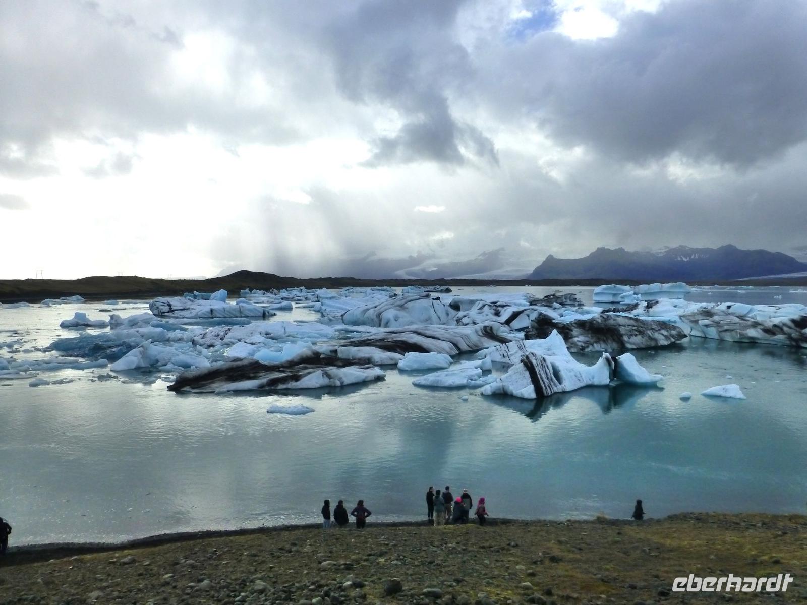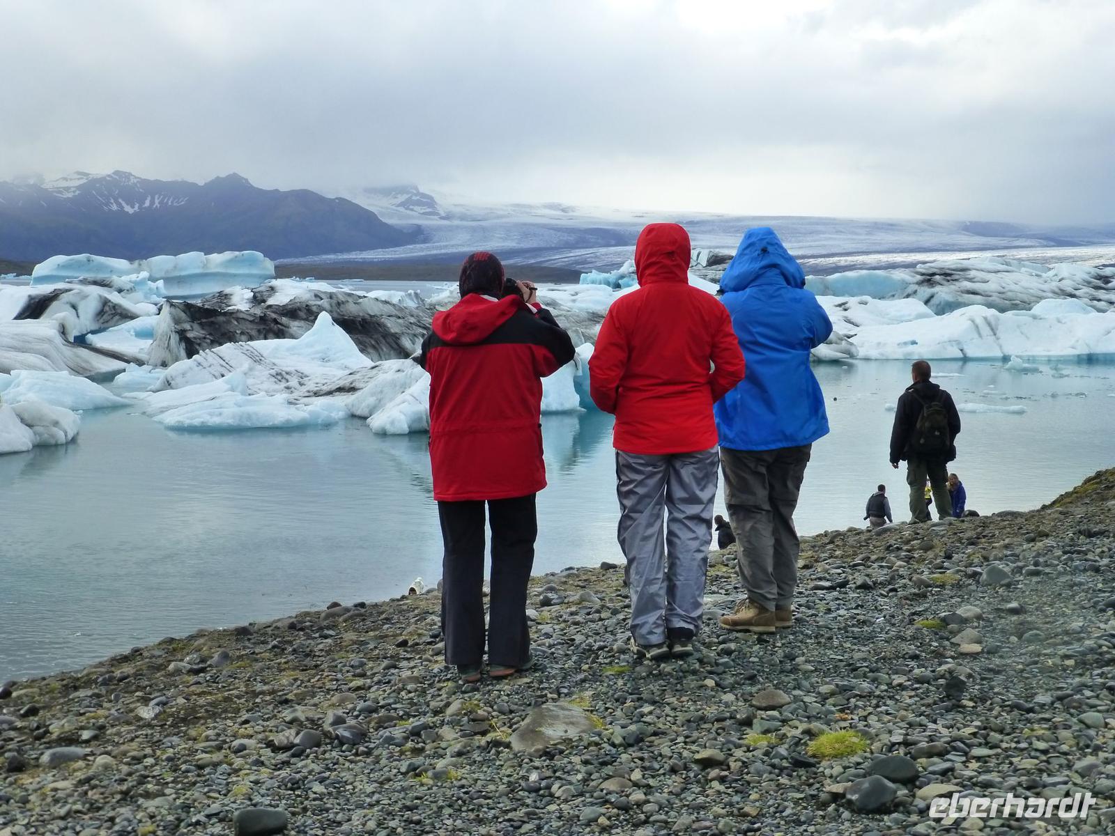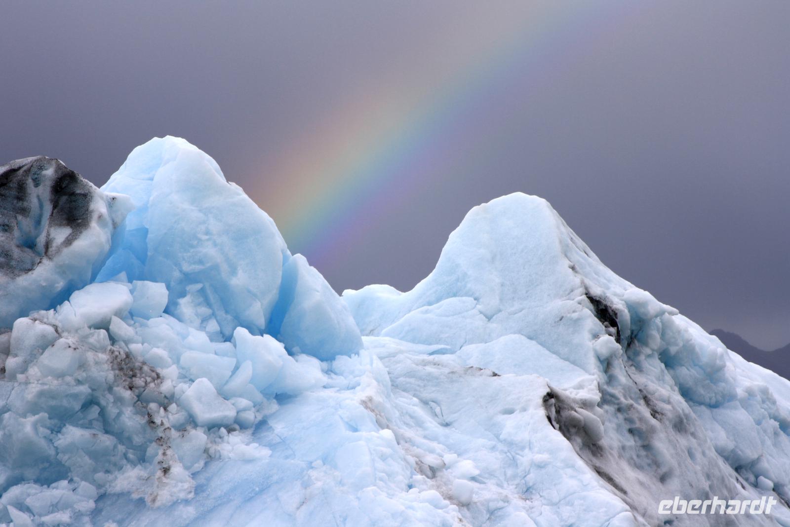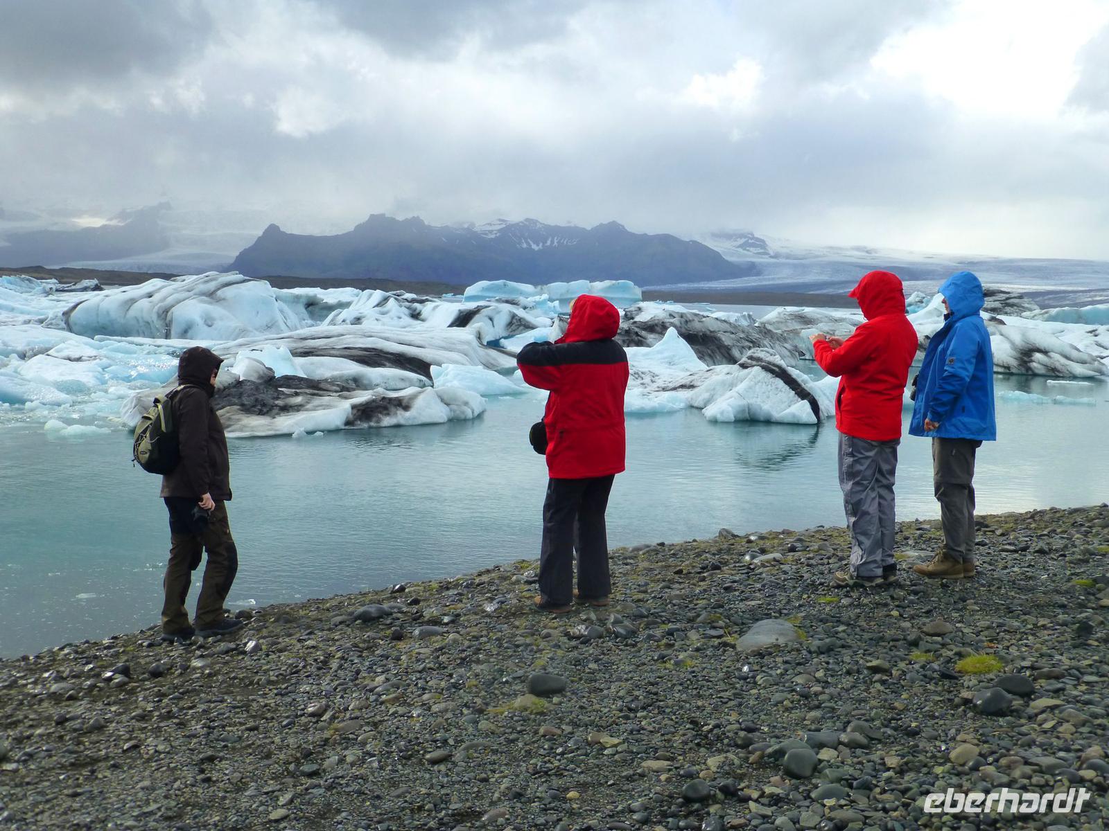 Nach der Mittagspause in Skaftafell lag noch ein weiterer Höhepunkt des Tages vor uns - ein Ausflug zur Gletscherlagune Jökulsarlon. Nach einer knappen Stunde Fahrtzeit mit dem Bus erreichten wir die Lagune am Fuße der Vatnajökull-Gletscherzunge, die auf der anderen Seite in den Atlantik mündet. Die riesigen Eisberge auf dem See versetzen uns schon bei der Ankunft in Staunen! Ein wirklich fantastischer Anblick, wie die blau leuchtenden Gletscherbrocken im Wasser schwimmen und sich ab und zu mit lautem Getöse drehen. Dazwischen beobachteten wir sogar Robben, die aus dem Atlantik kommen und hier in der Gletscherlagune jagen. Dann hieß es einsteigen in eines der Amphibienboote, die sowohl auf dem Land, als auch auf dem Wasser fahren können. Auch hier sollte man sich warm und regensicher anziehen, denn die Boote sind offen. Jeder bekam eine Schwimmweste und die etwa 45-minütige Bootsfahrt auf der Lagune begann. In jeder Minute ergaben sich neue spannende Fotomotive, die mit einem herrlichen Regenbogen gekrönt wurden.