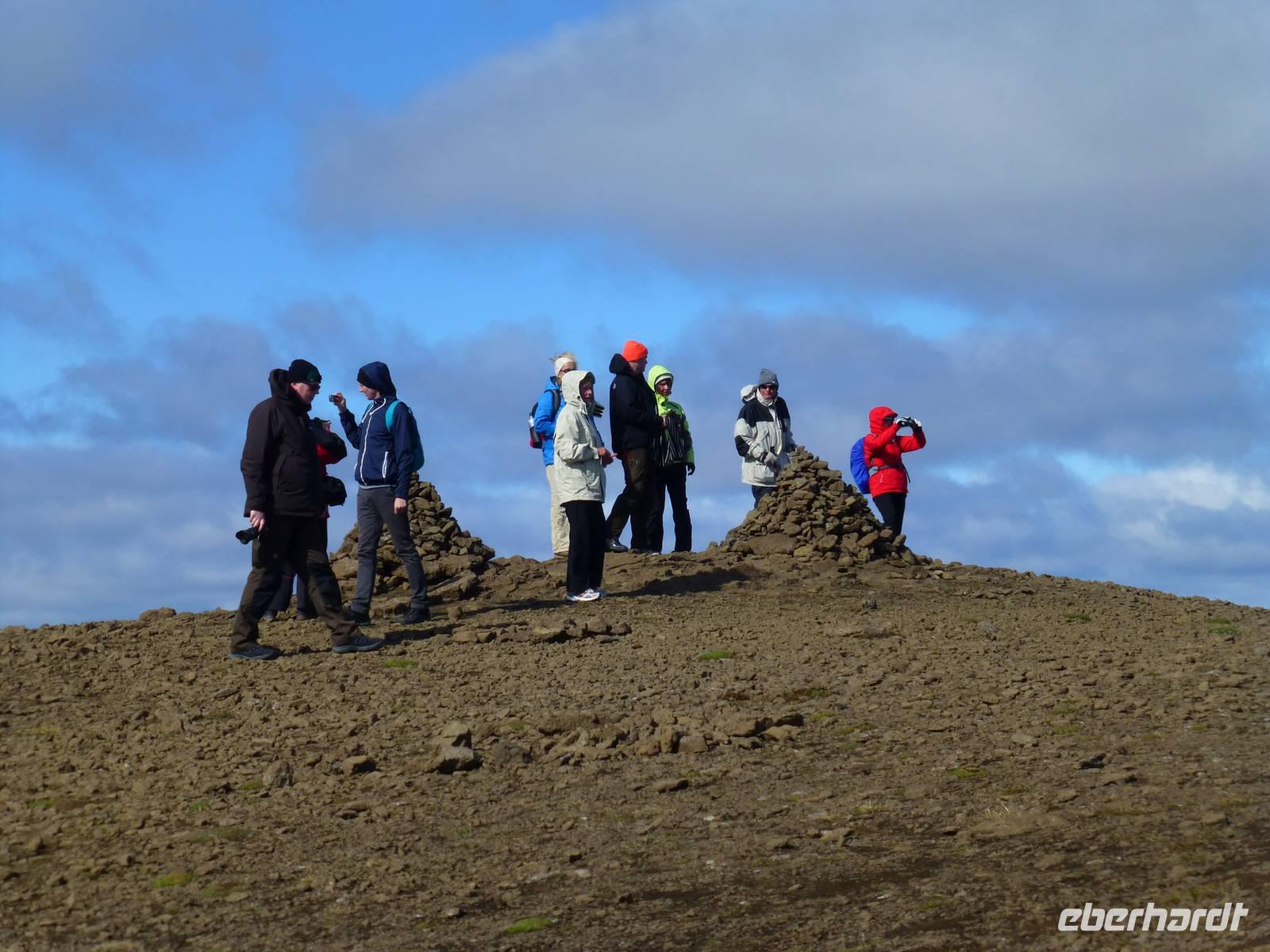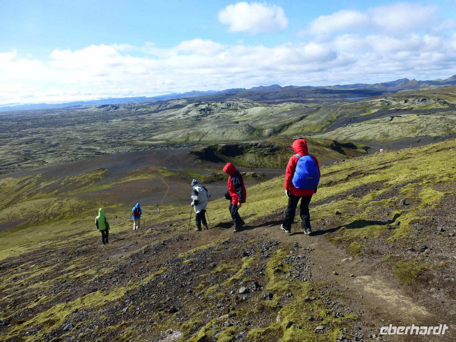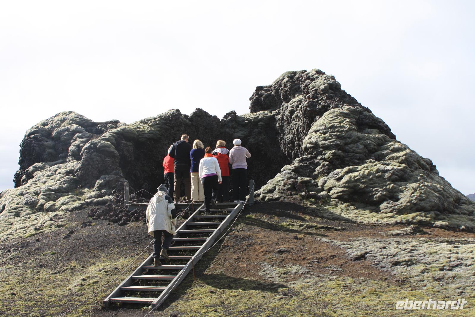 Nach einer weiteren Stunde Fahrt durch atemberaubende grün-schwarze Hügellandschaften erreichten wir das Basiscamp am Fuße des Laki-Vulkans. Mit windfester Jacke ausgestattet begannen wir den Aufstieg zum etwa 530 Meter hohen Gipfel des Laki über einen schmalen Wanderpfad mit einigen Steinstufen. Bei klarer Sicht und Sonnenschein genossen wir die Ausblicke auf die Kraterreihe und den See Lambavatn im Hintergrund. Von oben konnten wir die kilometerlange Ausbruchsspalte, die Krater und die Lavafelder sehr gut erkennen. Es muss ein wahnsinniges Naturschauspiel gewesen sein, als sich die Erde damals entlang der großen Spalte öffnete und glühende Lava emporstieg. Auf dem Gipfel tranken wir einen Brennevin Gipfelschnaps, bevor wir den Rückweg über den flacheren Kamm des Berges antraten. Insgesamt dauerte unsere Wanderung etwa 1,5 Stunden und ist wegen ihrer einmaligen Ausblicke unbedingt zu empfehlen.