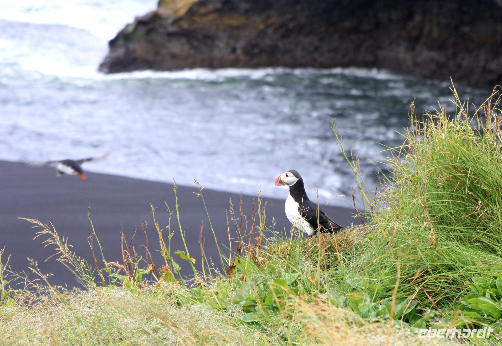 Wir verließen den Osten der Insel und fuhren entlang der Südküste in Richtung Reykjavik. Nach einem Einkaufsstopp in Vik besuchten wir die Halbinsel Dyrholaey (übersetzt „Türlochinsel"), die für ihre wilde Küste, das Felsenloch und als Vogelparadies bekannt ist. Wir beobachteten sogar die seltenen Papageientaucher mit ihren hübschen bunten Gesichtern. Es war gar nicht so einfach, sie mit der Kamera einzufangen!