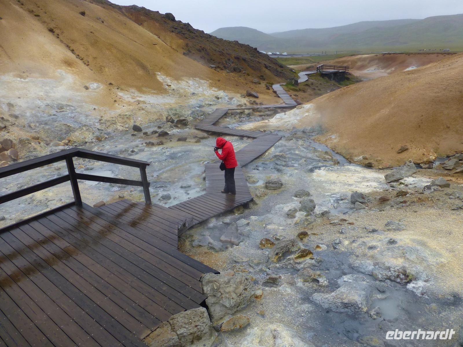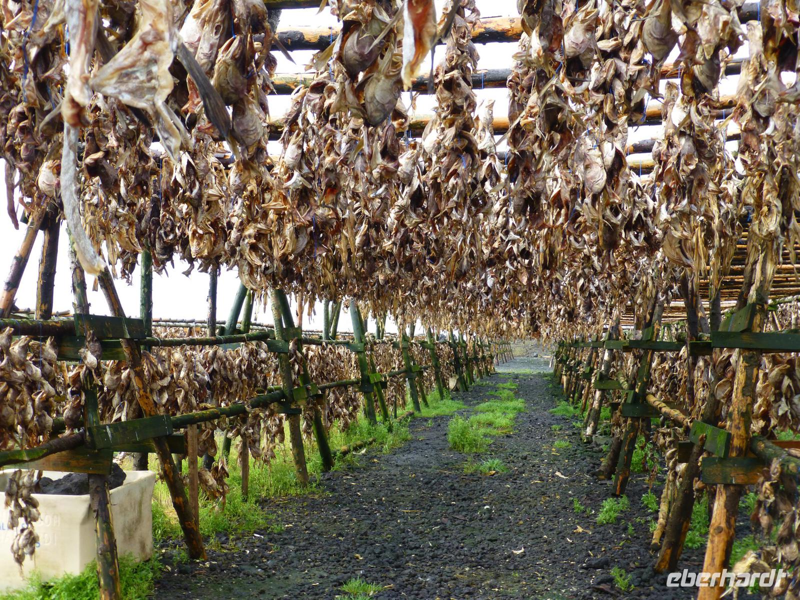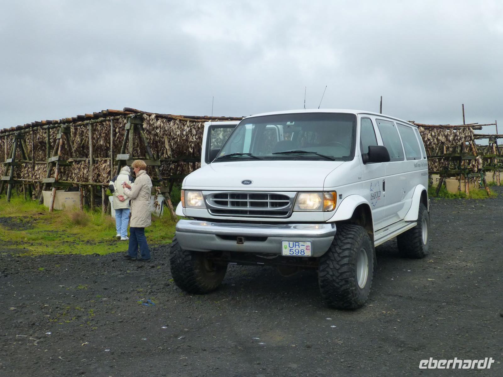 Mit dem Jeep ging es aus der Stadt hinaus zu einer Rundfahrt auf der Halbinsel Reykjanes. Bei einem Fotostopp sahen wir eine große Fischtrocknungsanlage im Freien, an der es entsprechend streng roch. Hier werden Fischköpfe für den Export nach Afrika getrocknet. Über eine Schotterpiste fuhren wir zum interessanten Geothermalgebiet Krysuvik. Bei einem Rundgang über Holzstege kann man hier noch einmal Islands Naturphänomene wie kochende Schlammlöcher, heiße Quellen und dampfende Fumarolen sehen. Am Vogelfelsen Eldey an der Südspitze der Halbinsel Reykjanes ließen wir uns den stürmischen Küstenwind um die Nase wehen und bestaunten die gut sichtbare Trennungsspalte zwischen Eurasischer und Amerikanischer Platte hier im Süden Islands.