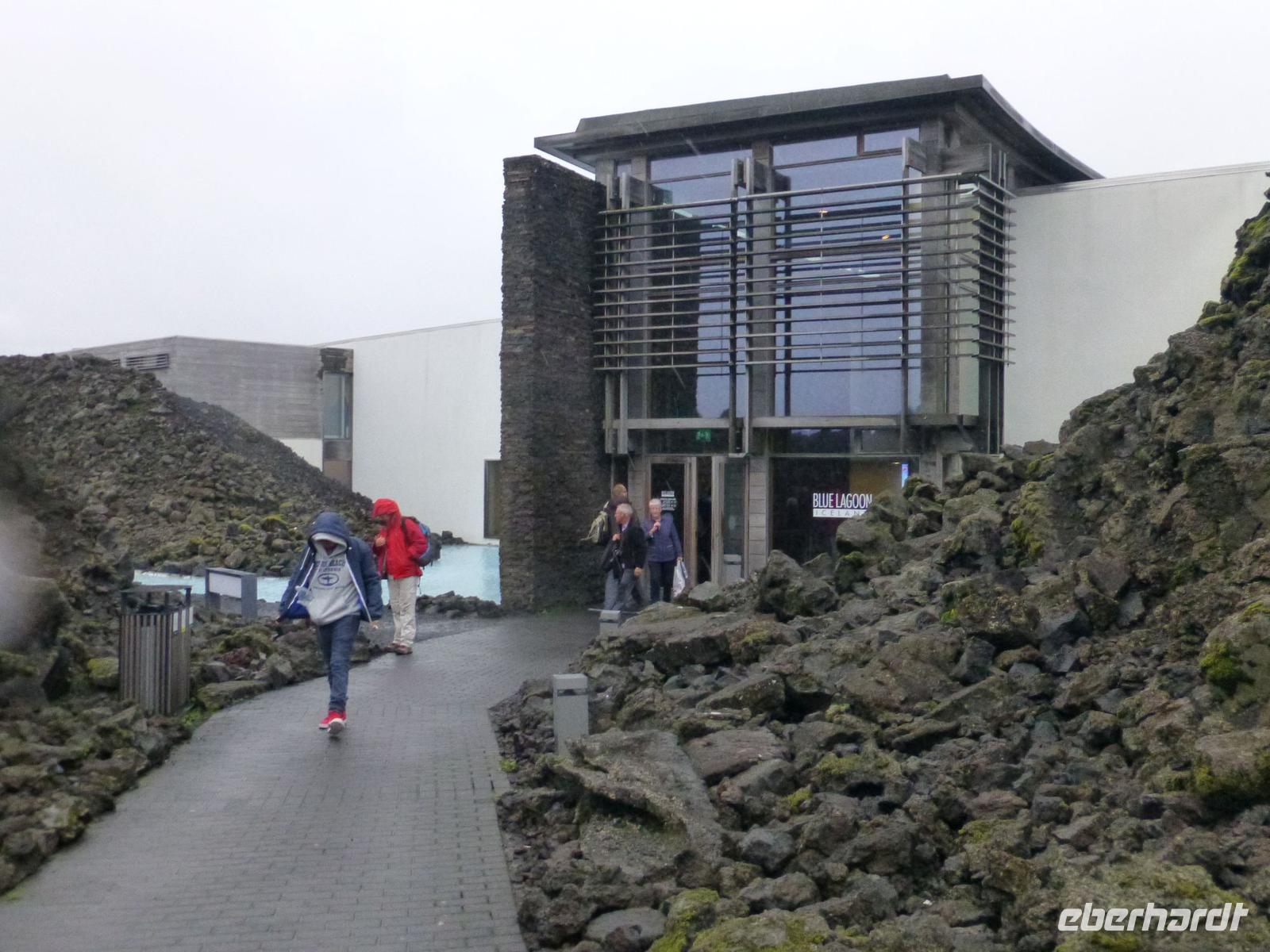 Zum Abschluss der Reise stand ein letzter Höhepunkt auf unserem Reiseprogramm: der Besuch der bekannten Blauen Lagune - einem Thermalfreibad zwischen den Orten Grindavik und Keflavik. Es wird mit dem Wasser des Geothermalkraftwerkes Svartsengi gespeist. Das Badewasser ist 37 bis 42 °C warm und enthält für die Haut gesunde Mineralsalze, Kieselerde und Algen. Die milchig-türkise Farbe des Thermalwassers wird durch die enthaltene Kieselsäure erzeugt. Sie bildet zusammen mit der Umgebung aus schwarzem Lavagestein und den dampfenden weißen Schwaden die mystische Kulisse der Blauen Lagune. Mit Leihhandtuch und Chiparmband ausgestattet, genossen wir unseren zweistündigen Aufenthalt in der Badelandschaft. An einem Kiosk im Wasser kann man mit dem Chiparmband Getränke kaufen, die man zum Schluss an der Kasse bezahlt. An der Lagune stehen auch Saunen und Dampfbäder zur Verfügung sowie Bottiche mit weißem Kieselerdeschlamm zum Einreiben der Haut.