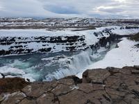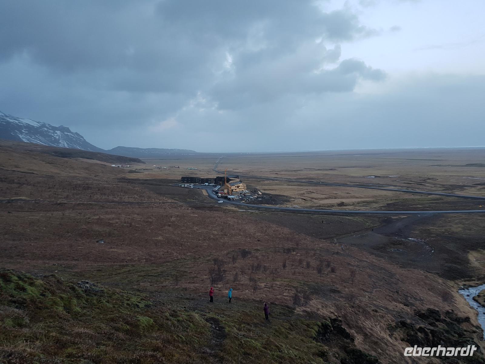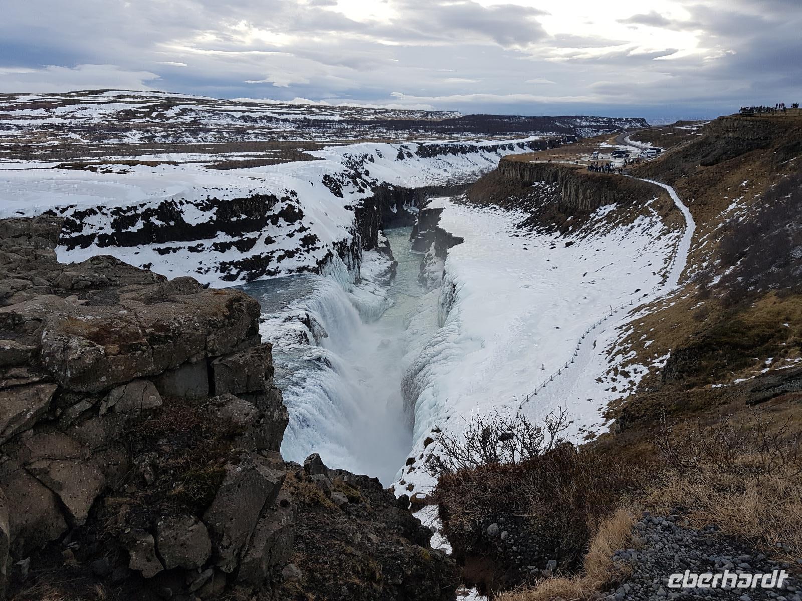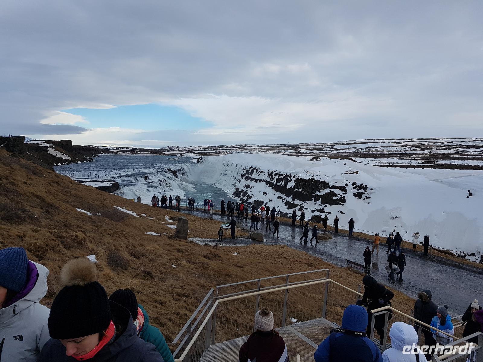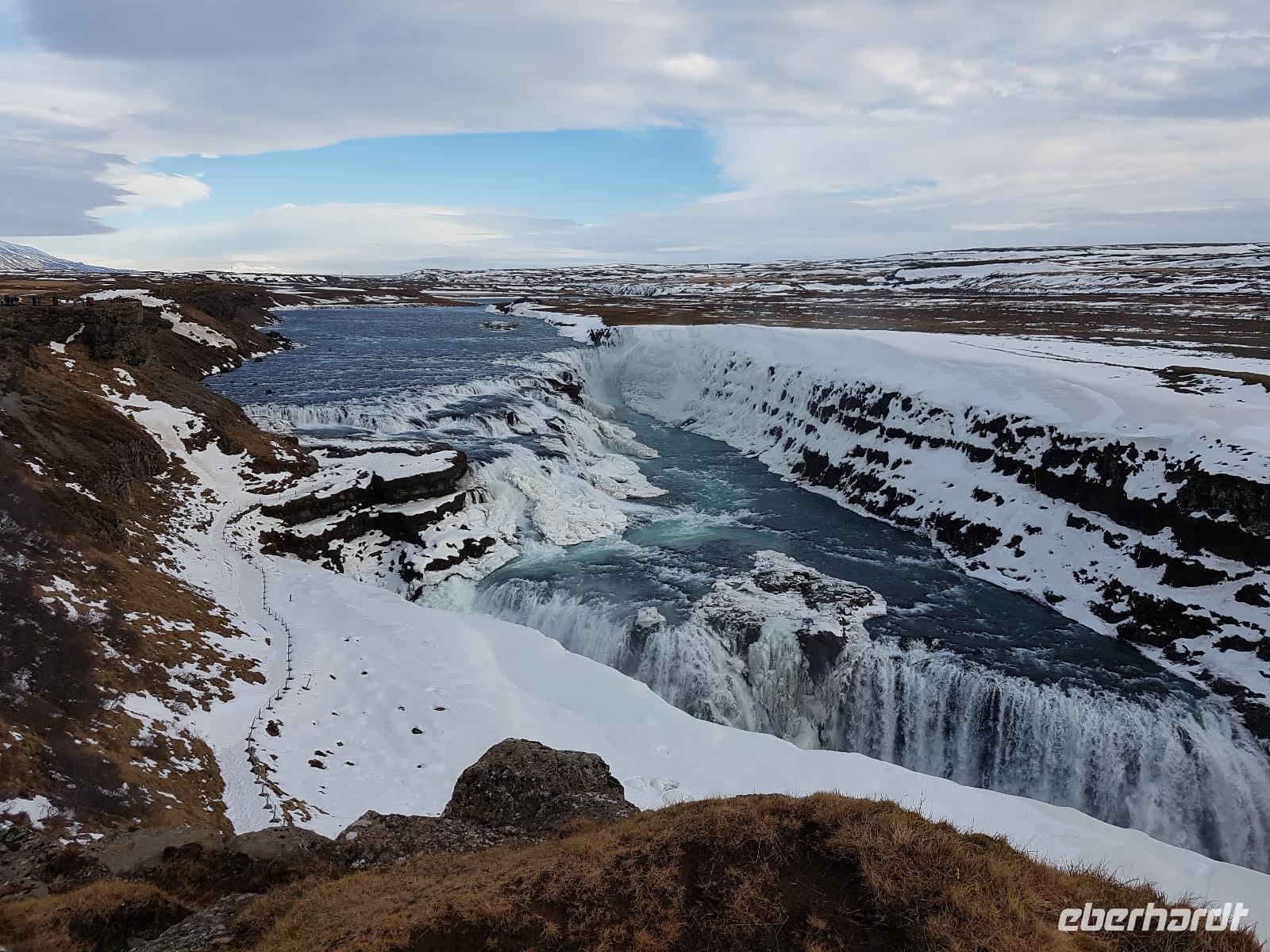 Ein Stück weiter wartete mit dem Gullfoss Wasserfall die nächste Überraschung. Grosse Teile waren vereist und so erschien der Wasserfall noch spektakulärer als im Sommer. Bei unserem Rundgang am Wasserfall zunächst oben und dann auch noch unten machten wir wieder viele Fotos. Im Informationszentrum stärkten wir uns dann für die noch lange Weiterfahrt. Am späten Nachmittag erreichten wir Fridheimar mit den Islandpferden und den Tomatengewächshäusern. Zunächst bekamen wir einen Kaffee, besuchten die Stallungen und eine Reiterin mit Pferd demonstrierte die verschiedenen Gangarten der Islandpferde. Dann liefen wir hinüber zu den Gewächshäusern und waren überwältigt. 4 Tomatensorten werden angebaut und man nutzt das Wasser einer benachbarten heissen Quelle zur Heizung und zur Stromgewinnung, denn die Tomatenpflanzen brauchen viel Licht. Neben den reifen wohlschmeckenden Tomaten konnten wir verschiedene Produkte aus Tomaten einkaufen und im dazugehörigen Restaurant auch etwas probieren. Auf der Weiterfahrt zu unserem Hotel in Hvolsvöllur wehte ein kräftiger Wind und Anna Lara hatte zu tun, das Lenkrad fest zu halten.