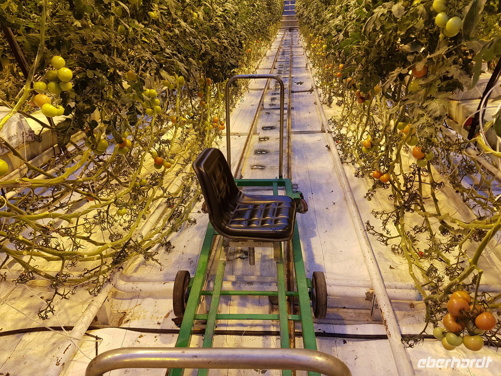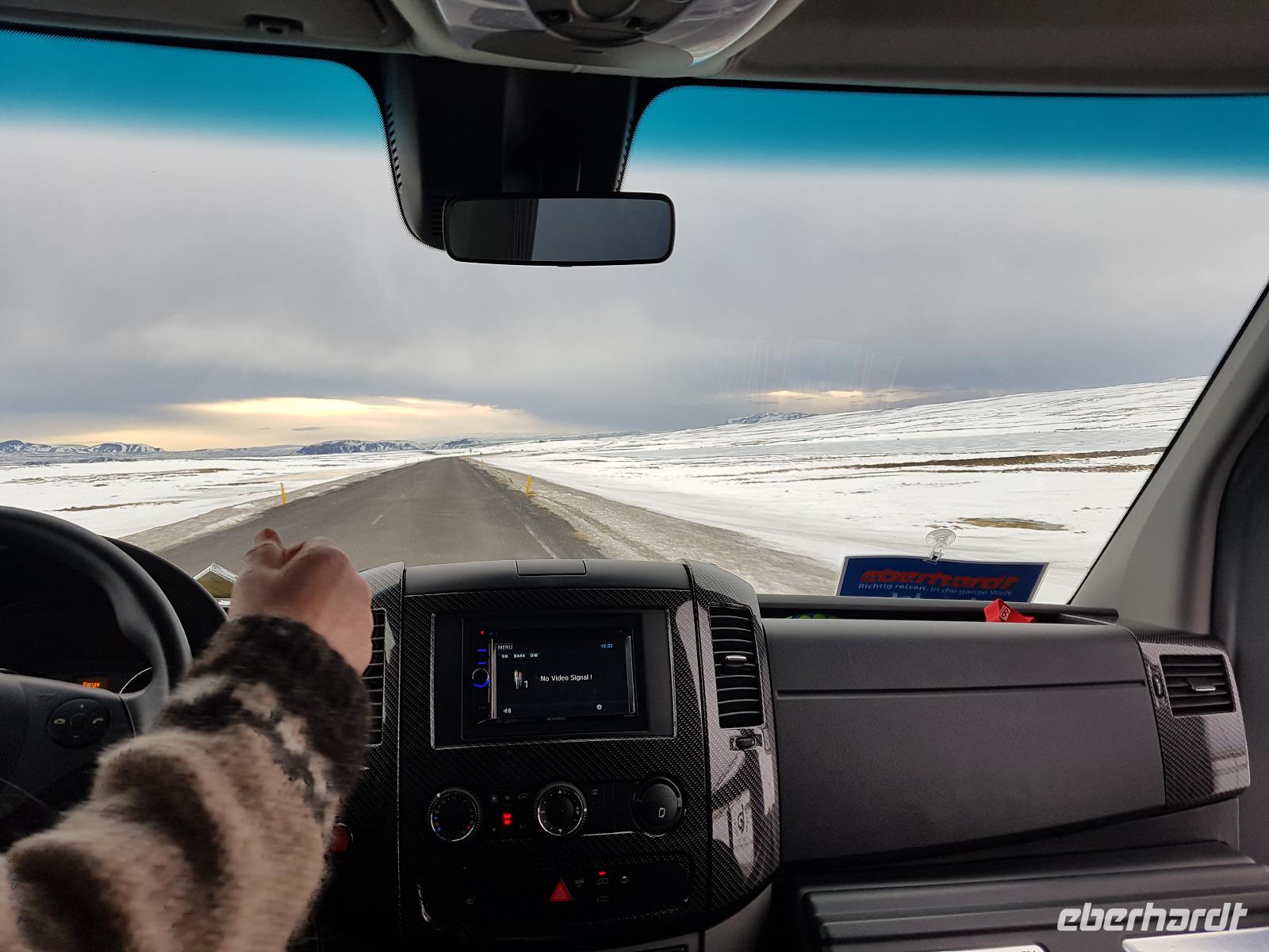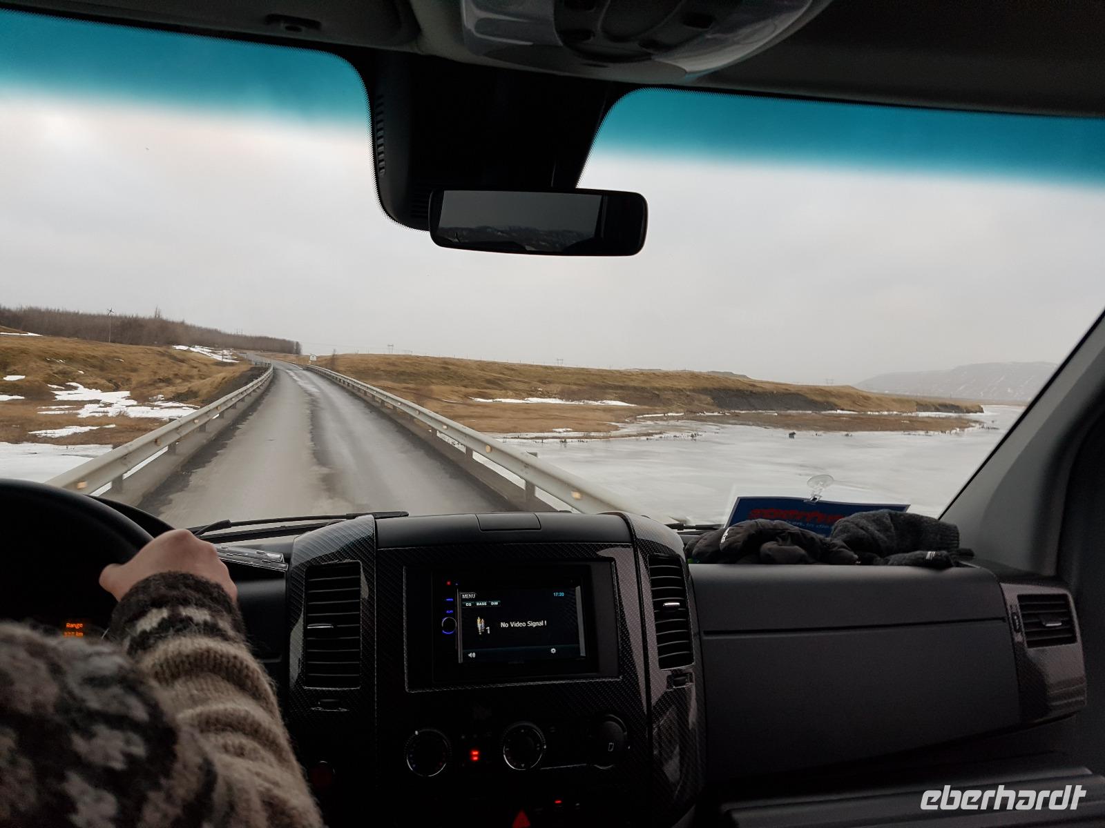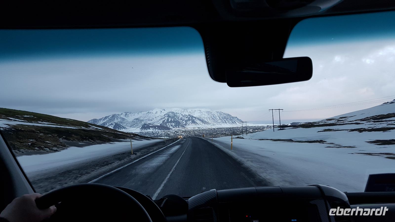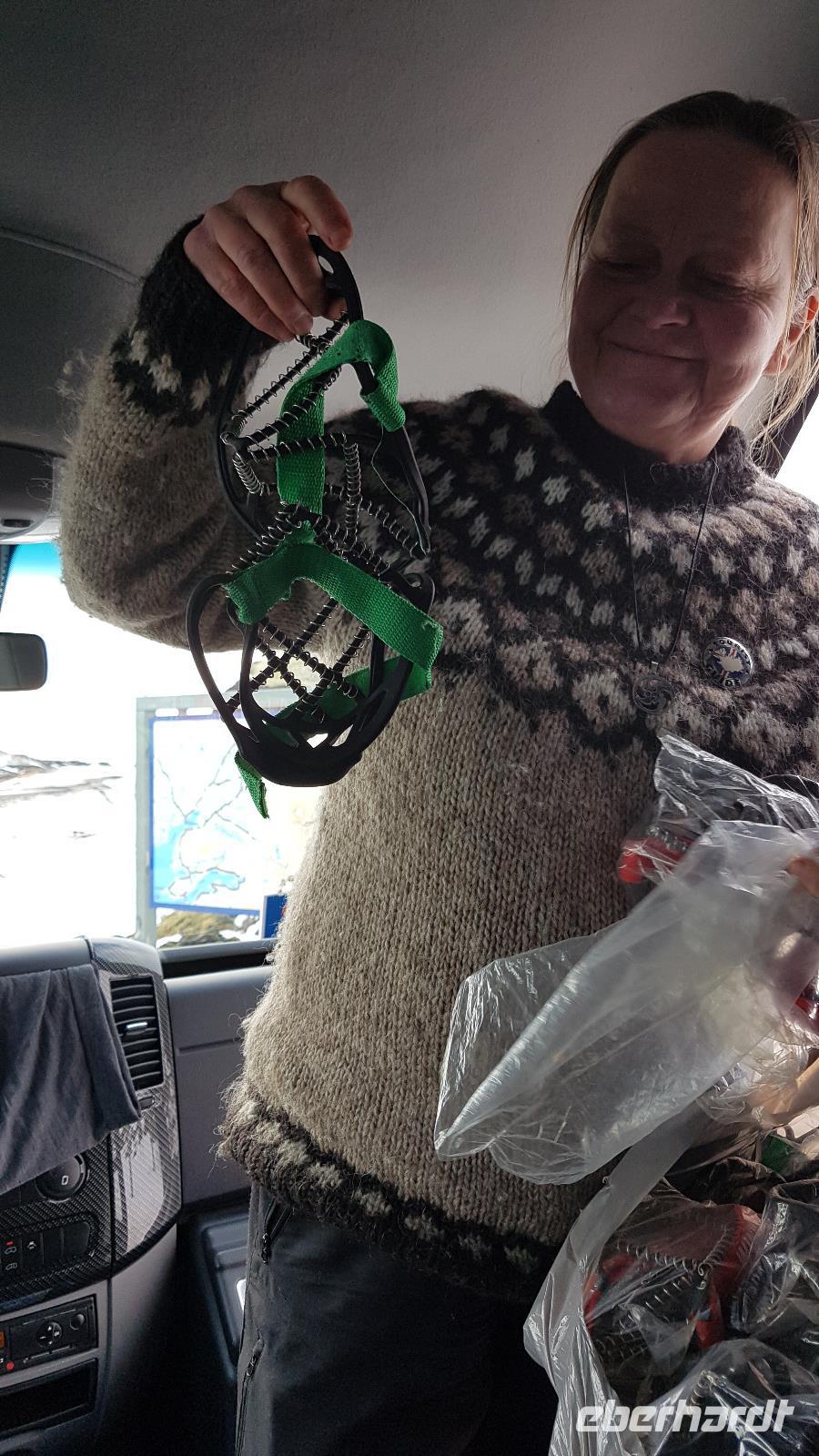 Ein Stück weiter wartete mit dem Gullfoss Wasserfall die nächste Überraschung. Grosse Teile waren vereist und so erschien der Wasserfall noch spektakulärer als im Sommer. Bei unserem Rundgang am Wasserfall zunächst oben und dann auch noch unten machten wir wieder viele Fotos. Im Informationszentrum stärkten wir uns dann für die noch lange Weiterfahrt. Am späten Nachmittag erreichten wir Fridheimar mit den Islandpferden und den Tomatengewächshäusern. Zunächst bekamen wir einen Kaffee, besuchten die Stallungen und eine Reiterin mit Pferd demonstrierte die verschiedenen Gangarten der Islandpferde. Dann liefen wir hinüber zu den Gewächshäusern und waren überwältigt. 4 Tomatensorten werden angebaut und man nutzt das Wasser einer benachbarten heissen Quelle zur Heizung und zur Stromgewinnung, denn die Tomatenpflanzen brauchen viel Licht. Neben den reifen wohlschmeckenden Tomaten konnten wir verschiedene Produkte aus Tomaten einkaufen und im dazugehörigen Restaurant auch etwas probieren. Auf der Weiterfahrt zu unserem Hotel in Hvolsvöllur wehte ein kräftiger Wind und Anna Lara hatte zu tun, das Lenkrad fest zu halten.