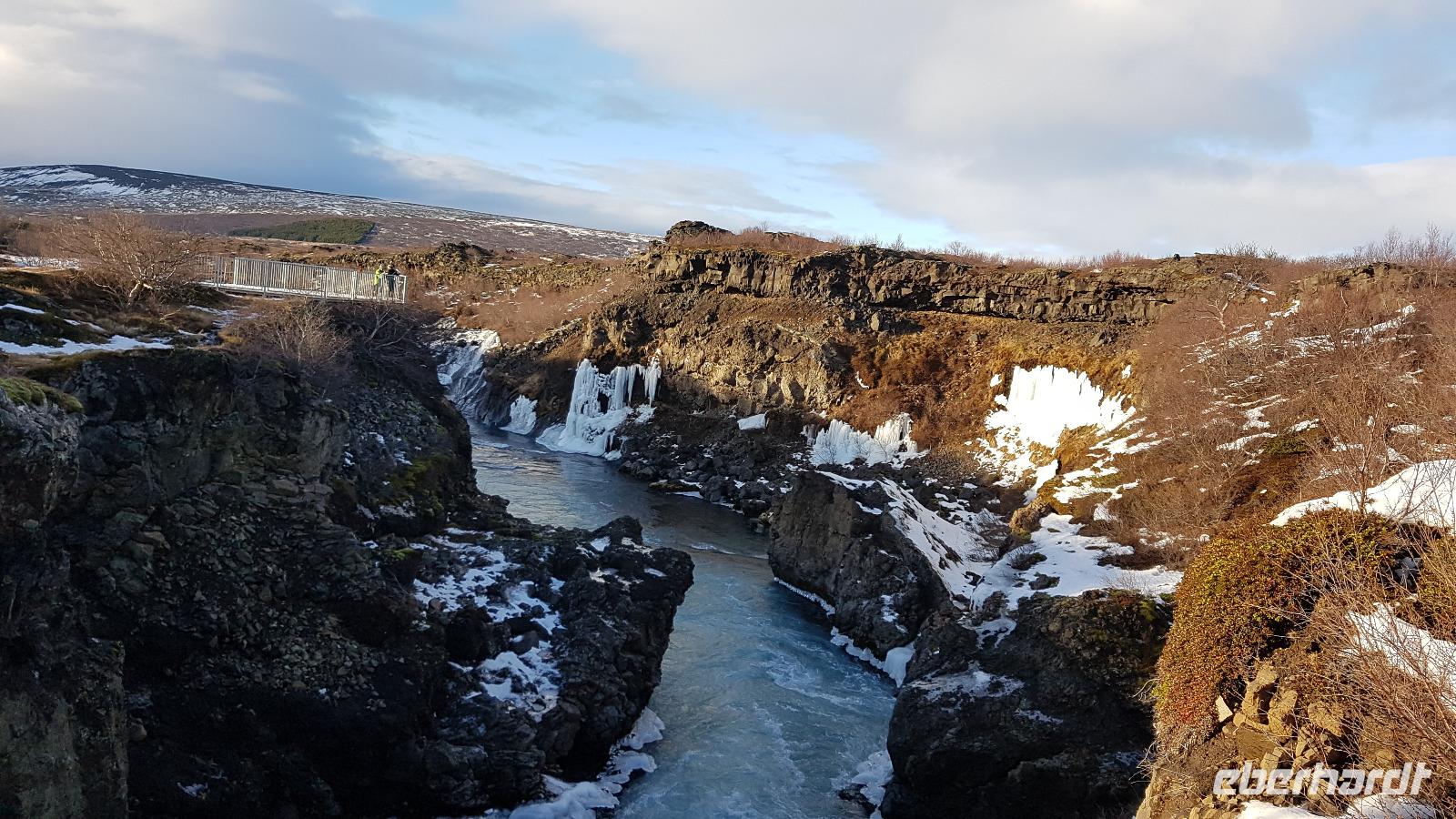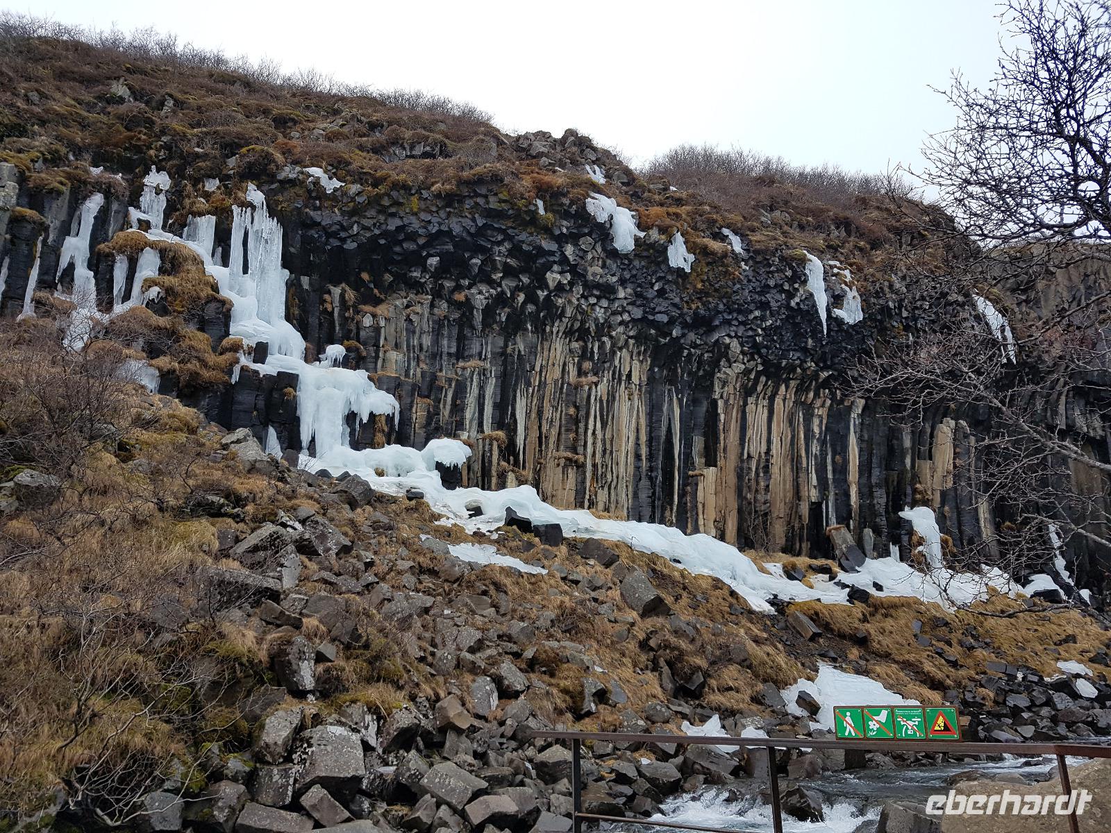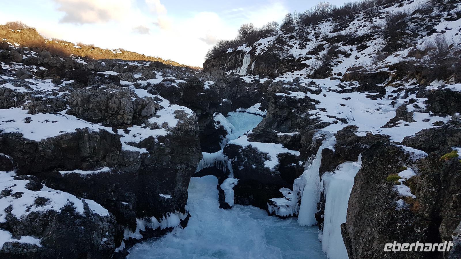 Nach einem kurzen Einkaufsbummel in Borganes fuhren wir weiter nach Norden zum Krater Grabrok. Es lag noch viel Schnee und der Weg mit den vielen Stufen hinauf war vereist. Anna Lara verteilte Schuhüberzieher mit Metallspiralen und so schafften wir alle problemlos den Weg hinauf und wieder hinunter. Vom Krater hatten wir einen weiten Blick ins Land und liessen uns den Wind um die Nase wehen. Dann fuhren wir wieder ein Stück zurück und bogen ab zu den Lavawasserfällen. Die Sonne schien und unser Spaziergang führte zunächst zu den vielen kleinen aus dem Lavagestein austretenden Wasserfällen. Wir gingen den Weg weiter bis zum Kinderwasserfall, der seinen Namen von 2 verunglückten Kindern bekam und deren Mutter dann die Brücke über den Wasserfall zerstörte. Der Kinderwasserfall war stark vereist und im Fluss sehr viel Wasser. Noch einen letzten Fotostopp machten wir bei den heissen Quellen von Krauma. Dort steht seit kurzem ein neues Hotel und die Hotpots des Hotels werden von den heissen Quellen gespeist. Kurz vor 18 Uhr erreichten wir unser Hotel Hamar und da war es immer noch hell ! Nach dem Checkin trafen wir uns zum ersten Seminar zum Thema Nordlicht-fotografie. Im Anschluss gab es ein sehr leckeres Abendessen und bis 23 Uhr waren wir unterwegs auf der Suche nach Nordlichtern. Leider vergebens.