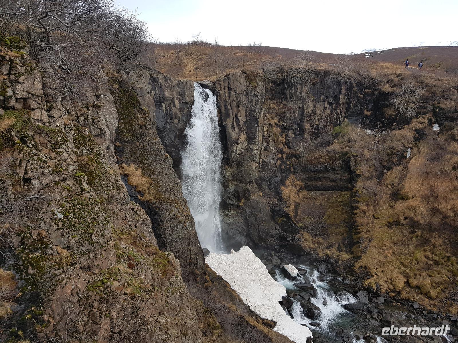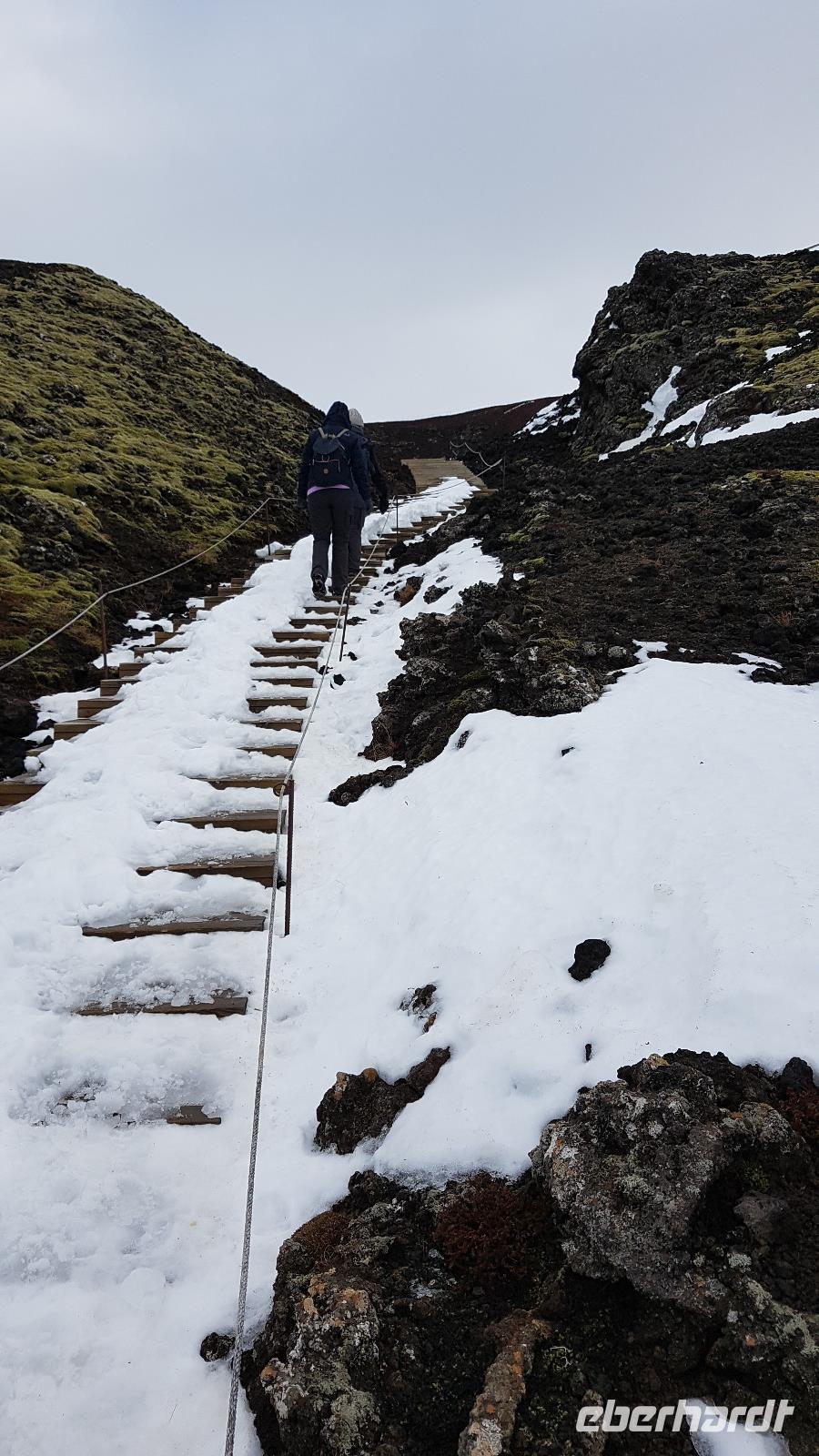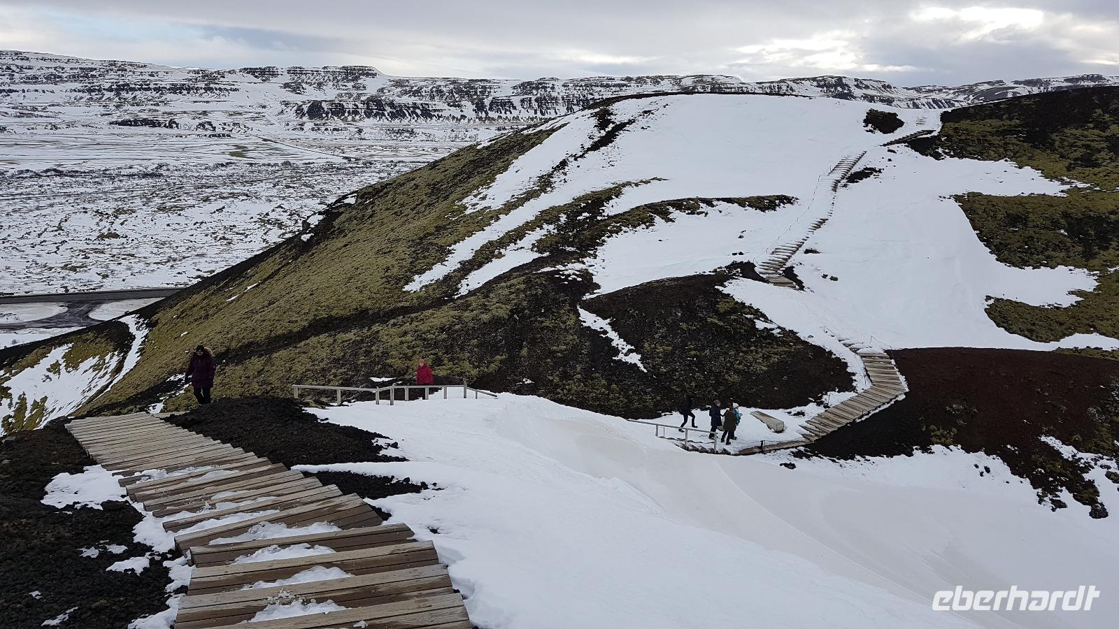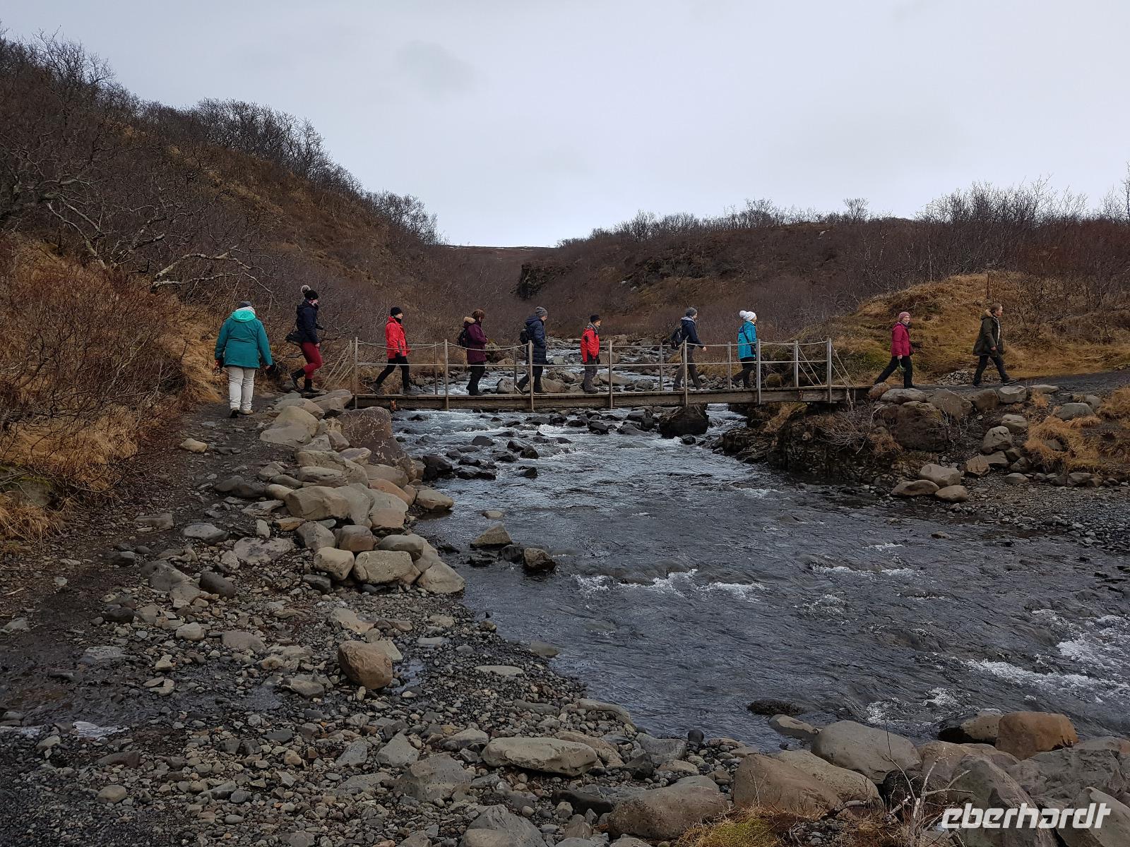 Nach einem kurzen Einkaufsbummel in Borganes fuhren wir weiter nach Norden zum Krater Grabrok. Es lag noch viel Schnee und der Weg mit den vielen Stufen hinauf war vereist. Anna Lara verteilte Schuhüberzieher mit Metallspiralen und so schafften wir alle problemlos den Weg hinauf und wieder hinunter. Vom Krater hatten wir einen weiten Blick ins Land und liessen uns den Wind um die Nase wehen. Dann fuhren wir wieder ein Stück zurück und bogen ab zu den Lavawasserfällen. Die Sonne schien und unser Spaziergang führte zunächst zu den vielen kleinen aus dem Lavagestein austretenden Wasserfällen. Wir gingen den Weg weiter bis zum Kinderwasserfall, der seinen Namen von 2 verunglückten Kindern bekam und deren Mutter dann die Brücke über den Wasserfall zerstörte. Der Kinderwasserfall war stark vereist und im Fluss sehr viel Wasser. Noch einen letzten Fotostopp machten wir bei den heissen Quellen von Krauma. Dort steht seit kurzem ein neues Hotel und die Hotpots des Hotels werden von den heissen Quellen gespeist. Kurz vor 18 Uhr erreichten wir unser Hotel Hamar und da war es immer noch hell ! Nach dem Checkin trafen wir uns zum ersten Seminar zum Thema Nordlicht-fotografie. Im Anschluss gab es ein sehr leckeres Abendessen und bis 23 Uhr waren wir unterwegs auf der Suche nach Nordlichtern. Leider vergebens.