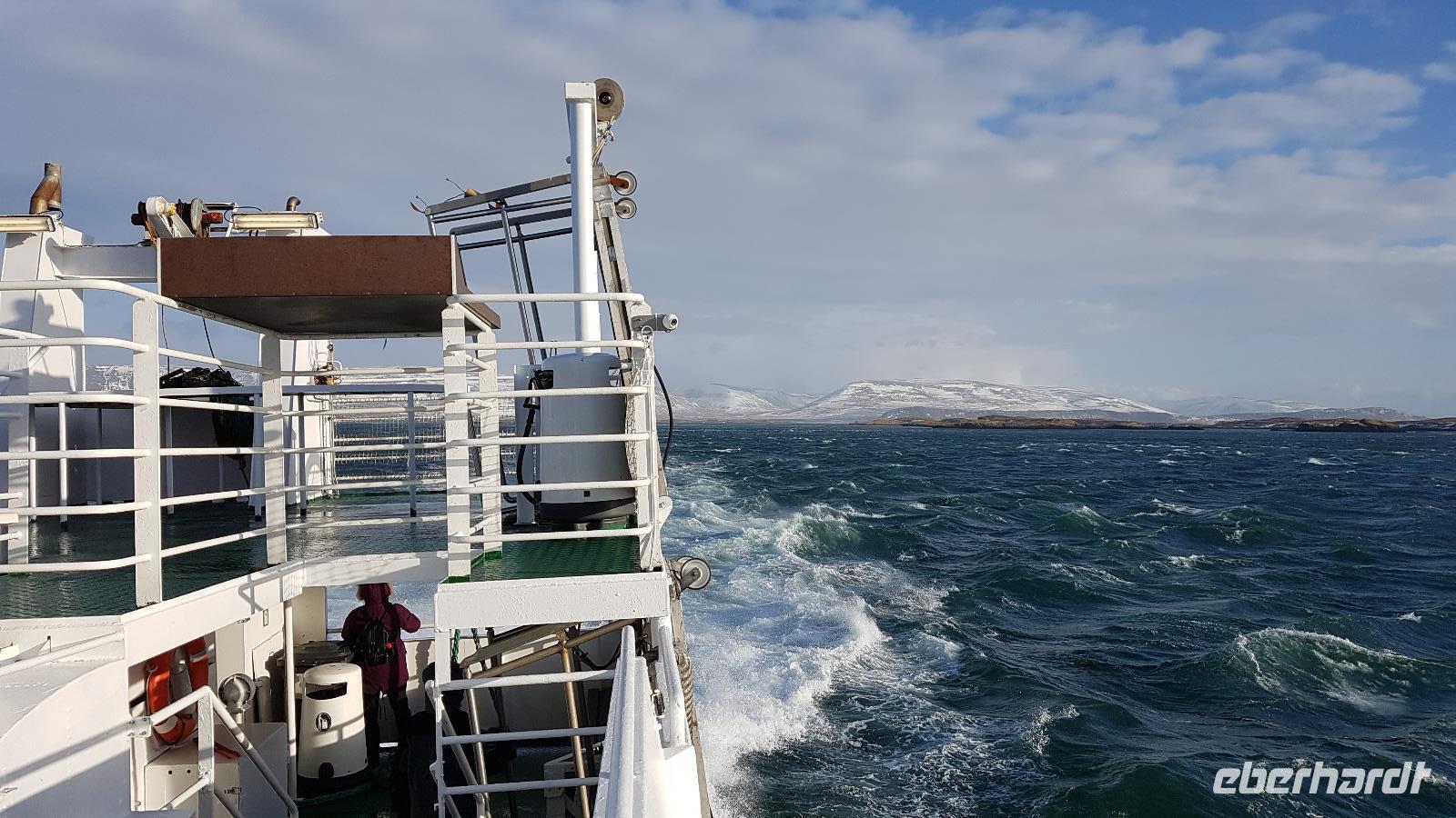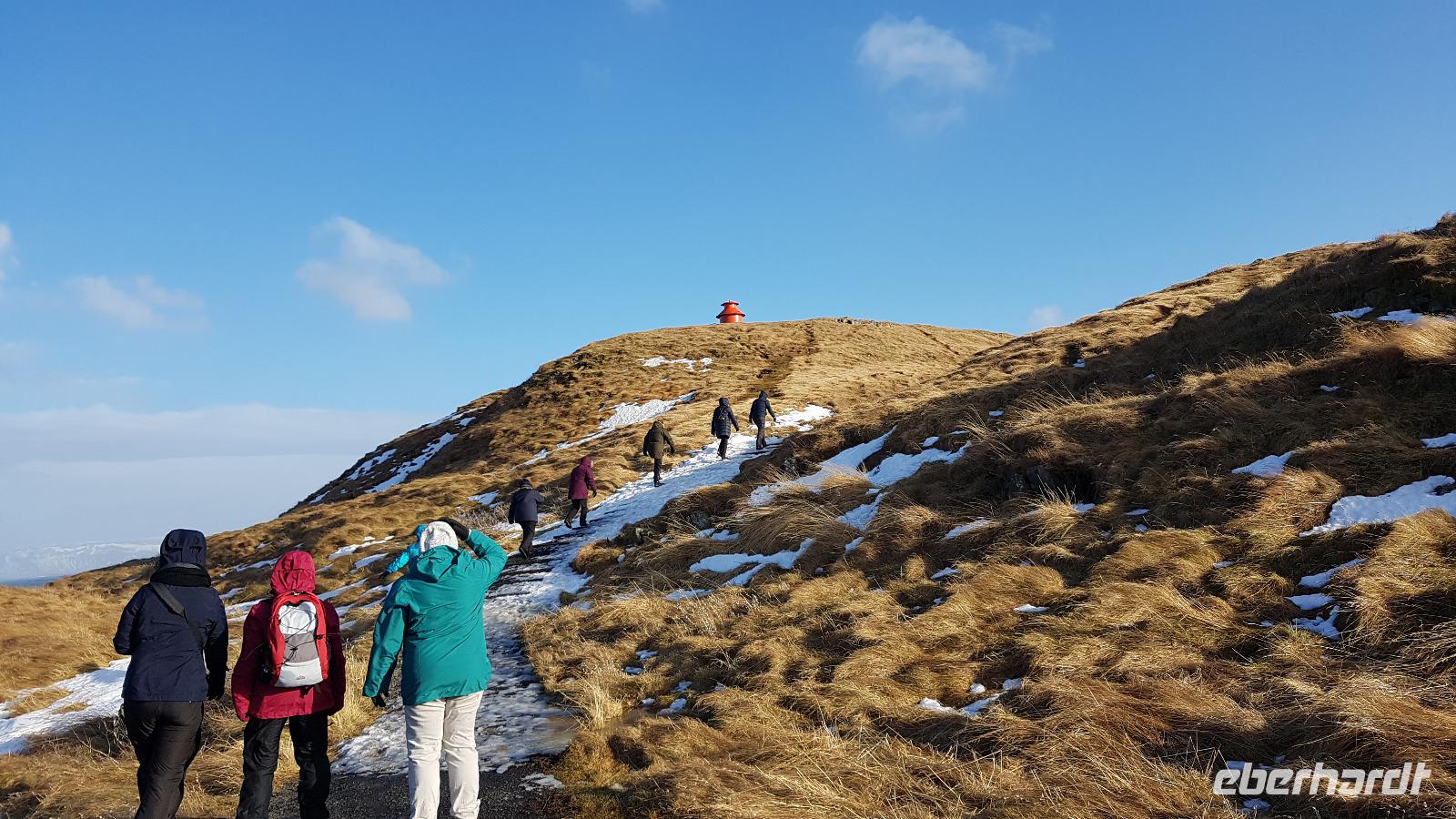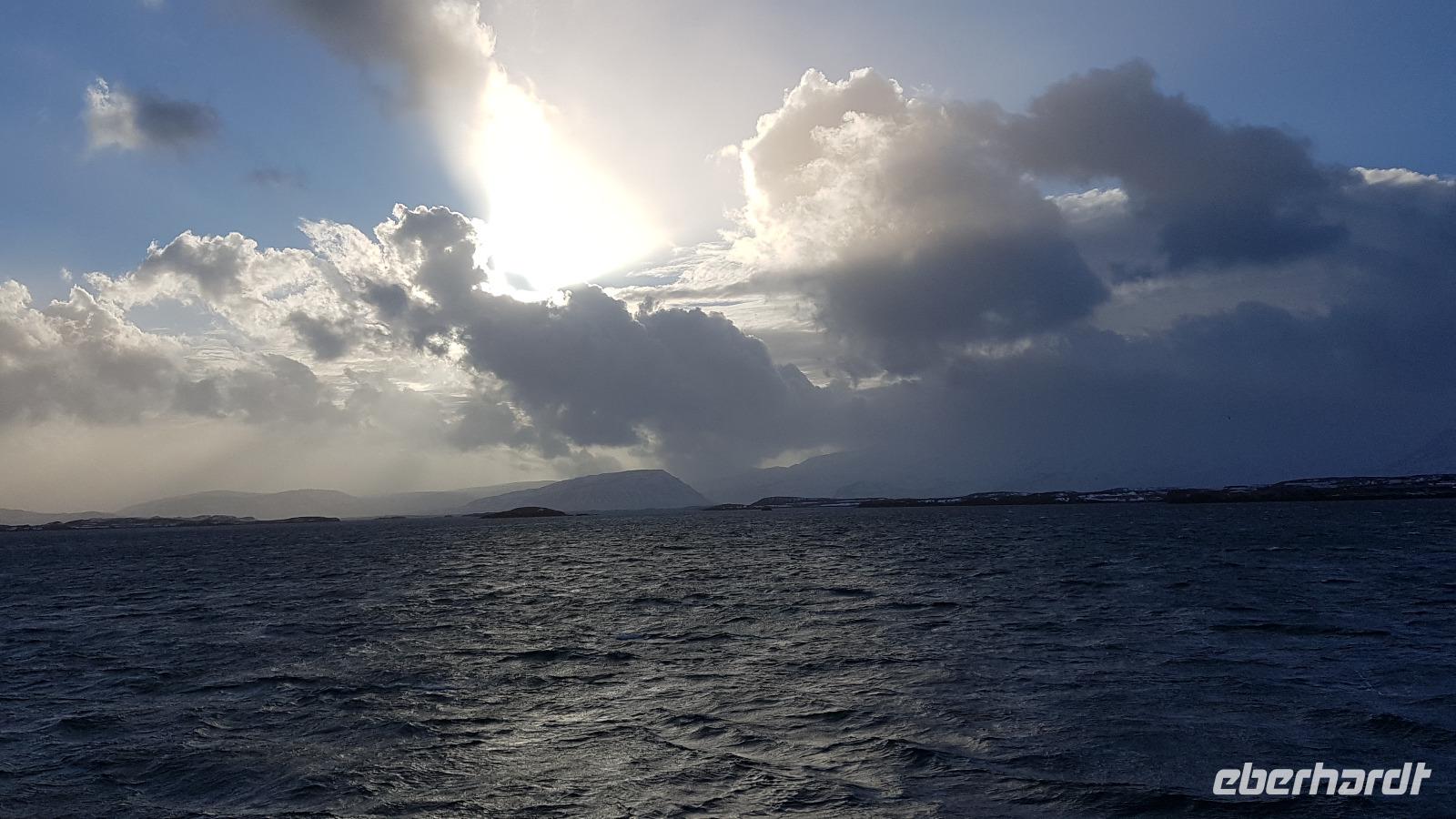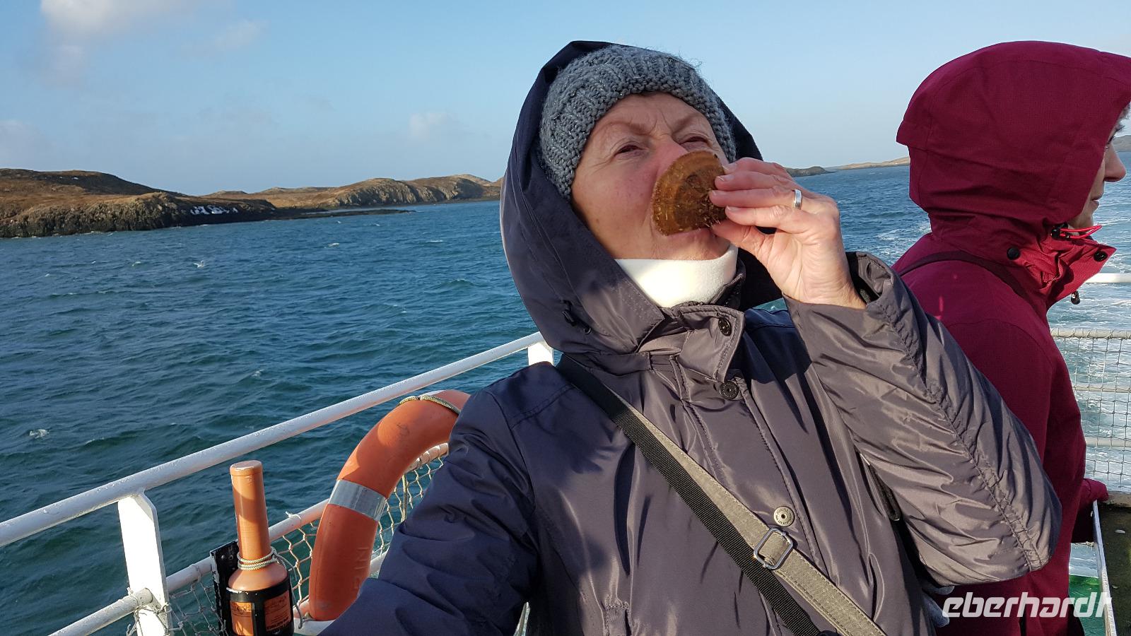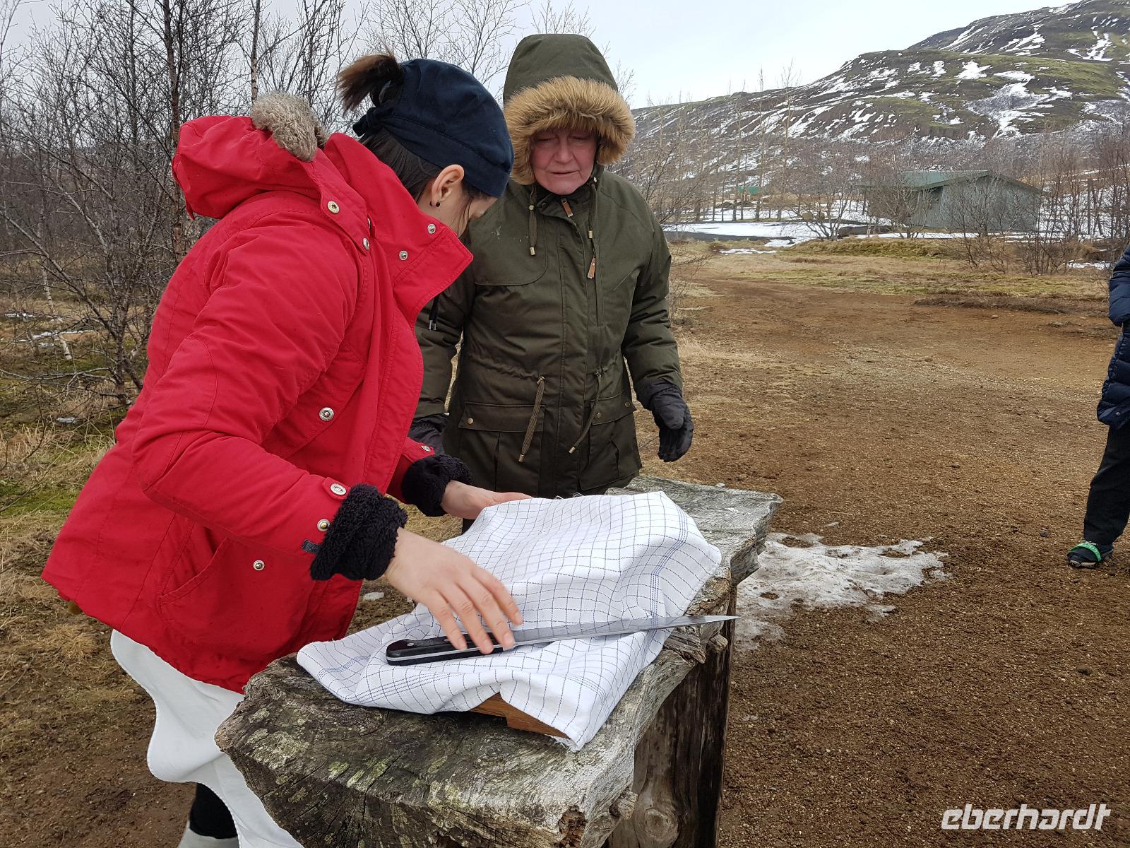 Von 11 bis 13 Uhr gingen wir an Bord eines Schiffes, welches zwischen den Inseln im Breidafjord kreuzte. Es war sehr starker Wind und die Temperaturen so hoch, dass wir uns am Schiff sogar draussen aufhalten konnten. Der Kapitän zeigte uns die Brutplätze der Seevögel aus nächster Nähe und es wurde für uns gefischt. Vor allem die Jacobsmuscheln und Eier der Seesterne waren sehr lecker und konnten ganz frisch von uns verzehrt werden. Ein absoluter Höhepunkt der Kreuzfahrt. Weiter draussen sahen wir dann die starken Strudel, die durch Ebbe und Flut zwischen den Inseln entstehen. Wieder zurück an Land konnten wir uns bei einer sehr wohlschmeckenden Fischsuppe mit Meeresfrüchten stärken und auch wieder aufwärmen. Der Hafen von Stykkisholmur wird von einem hohen Felsen, auf dem der Leuchtturm steht, geschützt und da hinauf machten wir eine Wanderung. Allerdings war der Sturm oben so stark, dass wir uns bei den Händen nahmen und immer nur zu dritt wieder auf den Rückweg machen konnten. Dann fuhren wir weiter nach Bjarnahöfn, wo ein schönes Museum zu besichtigen war und wir fermentierten Hai mit Brot und Brennivin probieren konnten. Die Fahrt nach Grundarfjördur fiel wegen des Sturmes aus. Dafür zeigte uns Anna Lara auf dem Rückweg in Borganes noch einen schönen Garten mit einem berühmten Grab aus der Egils Saga. Am Abend folgte dann das zweite Seminar zu den Nordlichtern und während des Abendessen ging ein starkes Gewitter nieder. Es war seit 10 Jahren das erste Gewitter.