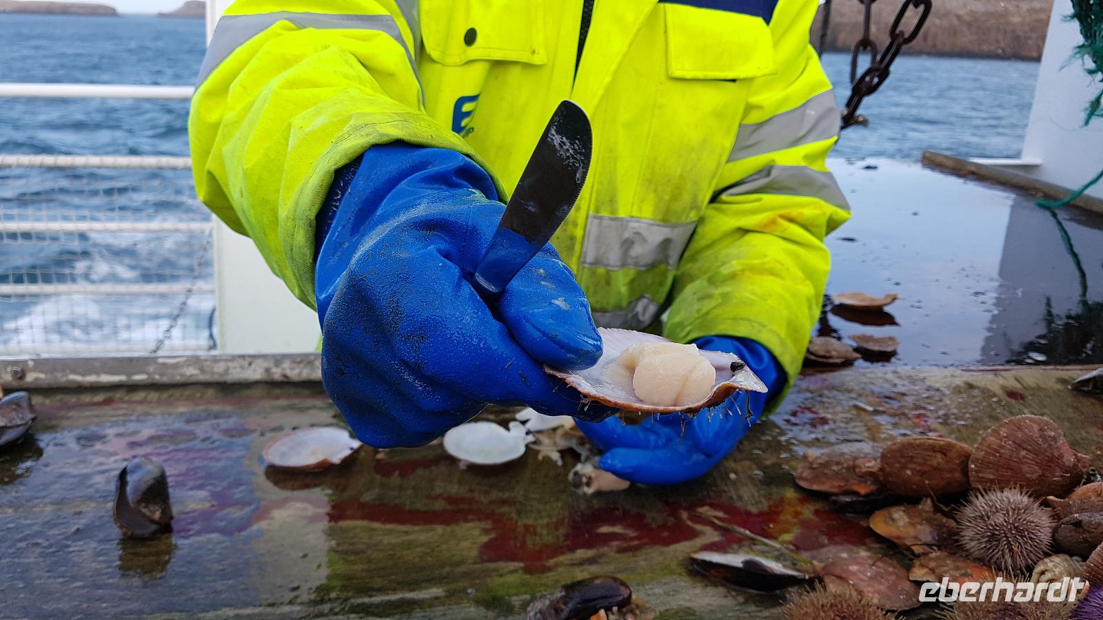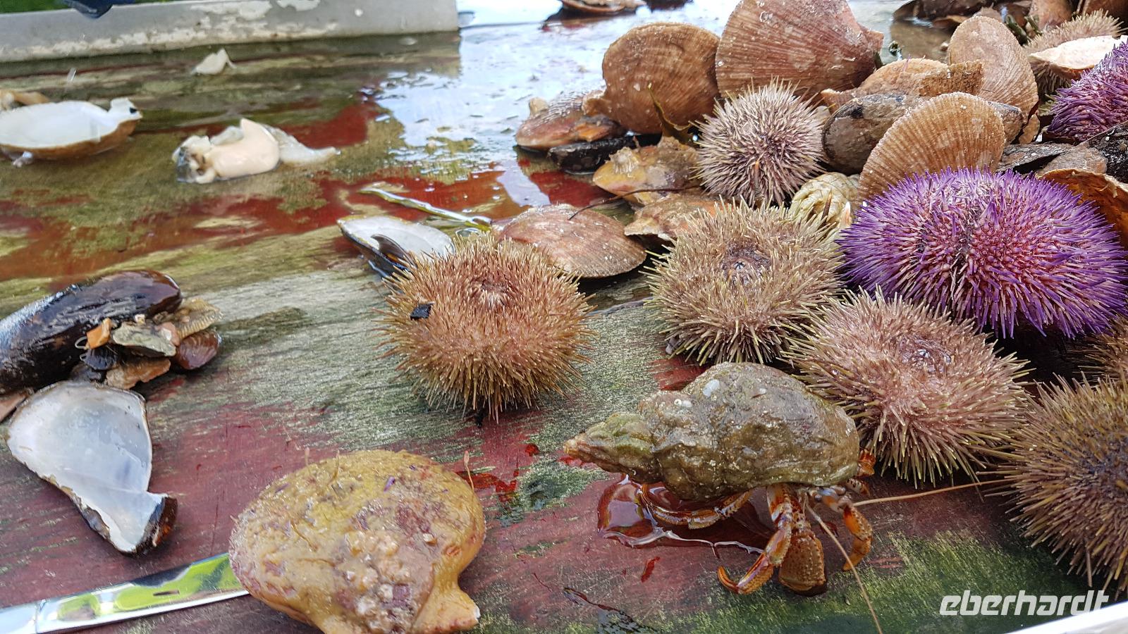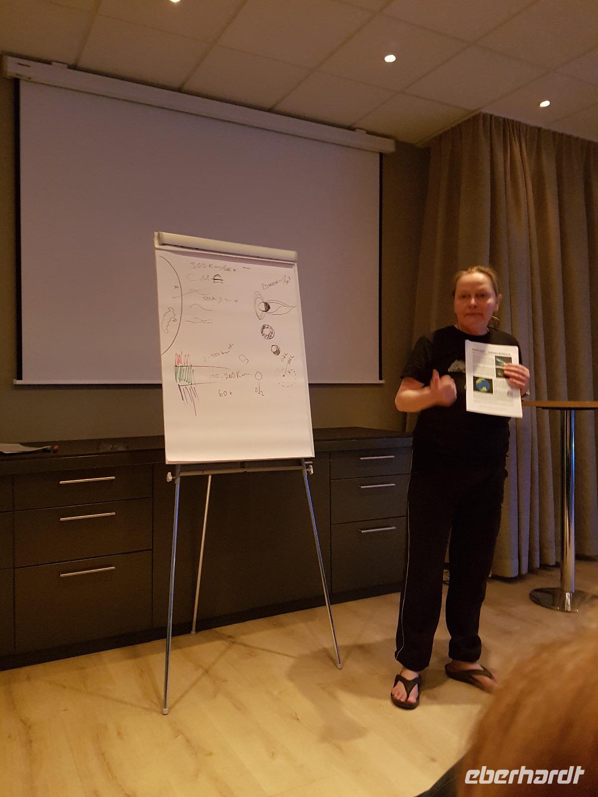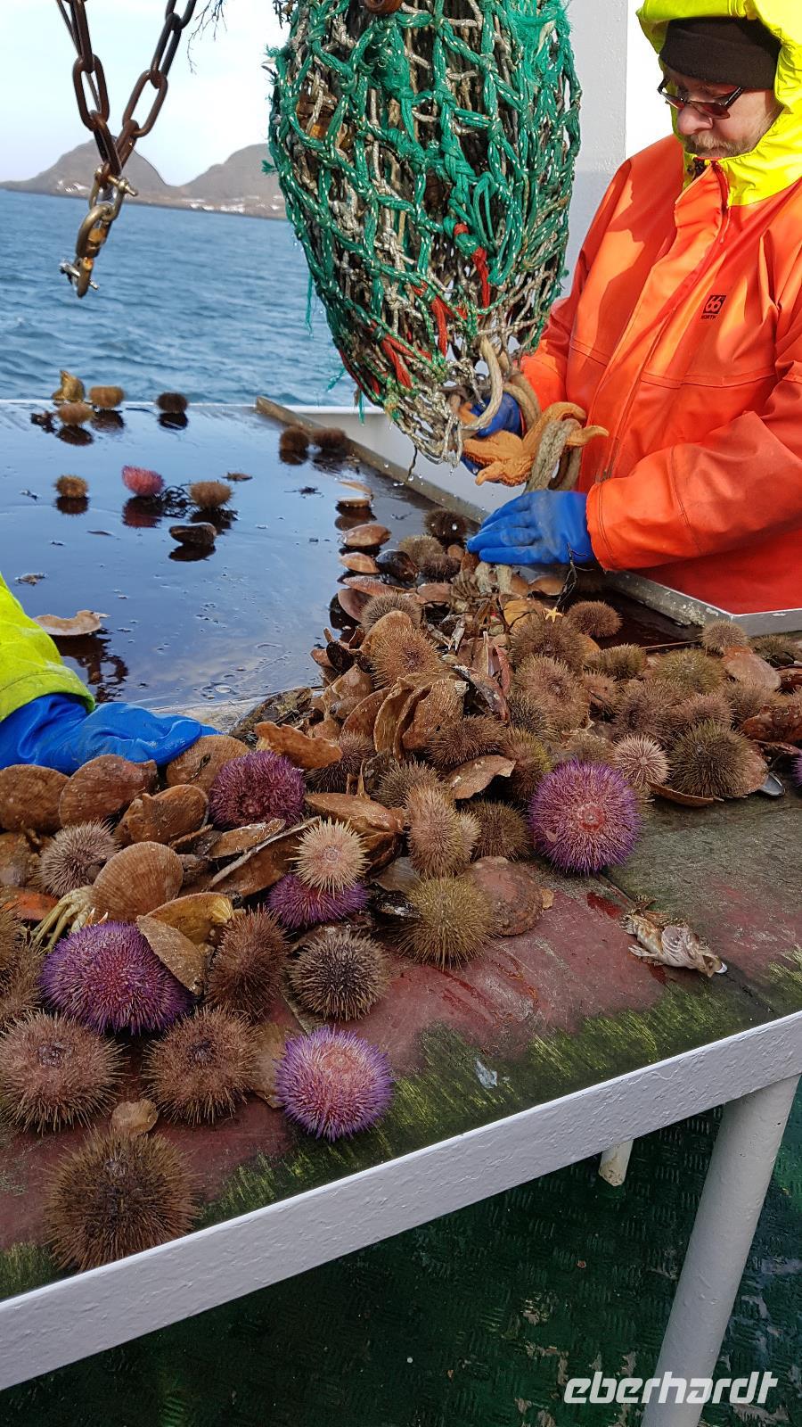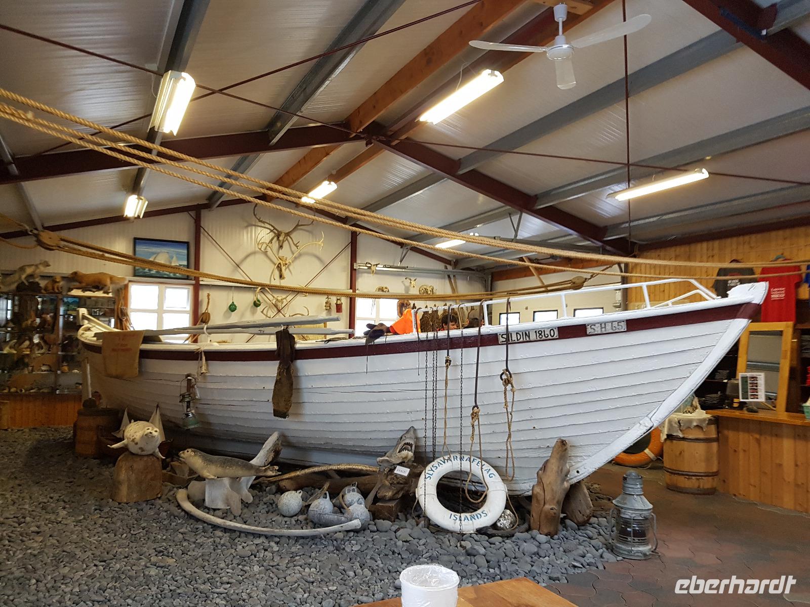 Von 11 bis 13 Uhr gingen wir an Bord eines Schiffes, welches zwischen den Inseln im Breidafjord kreuzte. Es war sehr starker Wind und die Temperaturen so hoch, dass wir uns am Schiff sogar draussen aufhalten konnten. Der Kapitän zeigte uns die Brutplätze der Seevögel aus nächster Nähe und es wurde für uns gefischt. Vor allem die Jacobsmuscheln und Eier der Seesterne waren sehr lecker und konnten ganz frisch von uns verzehrt werden. Ein absoluter Höhepunkt der Kreuzfahrt. Weiter draussen sahen wir dann die starken Strudel, die durch Ebbe und Flut zwischen den Inseln entstehen. Wieder zurück an Land konnten wir uns bei einer sehr wohlschmeckenden Fischsuppe mit Meeresfrüchten stärken und auch wieder aufwärmen. Der Hafen von Stykkisholmur wird von einem hohen Felsen, auf dem der Leuchtturm steht, geschützt und da hinauf machten wir eine Wanderung. Allerdings war der Sturm oben so stark, dass wir uns bei den Händen nahmen und immer nur zu dritt wieder auf den Rückweg machen konnten. Dann fuhren wir weiter nach Bjarnahöfn, wo ein schönes Museum zu besichtigen war und wir fermentierten Hai mit Brot und Brennivin probieren konnten. Die Fahrt nach Grundarfjördur fiel wegen des Sturmes aus. Dafür zeigte uns Anna Lara auf dem Rückweg in Borganes noch einen schönen Garten mit einem berühmten Grab aus der Egils Saga. Am Abend folgte dann das zweite Seminar zu den Nordlichtern und während des Abendessen ging ein starkes Gewitter nieder. Es war seit 10 Jahren das erste Gewitter.