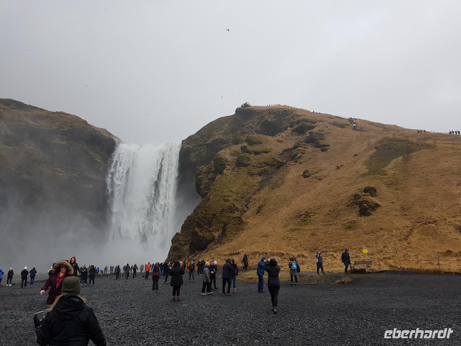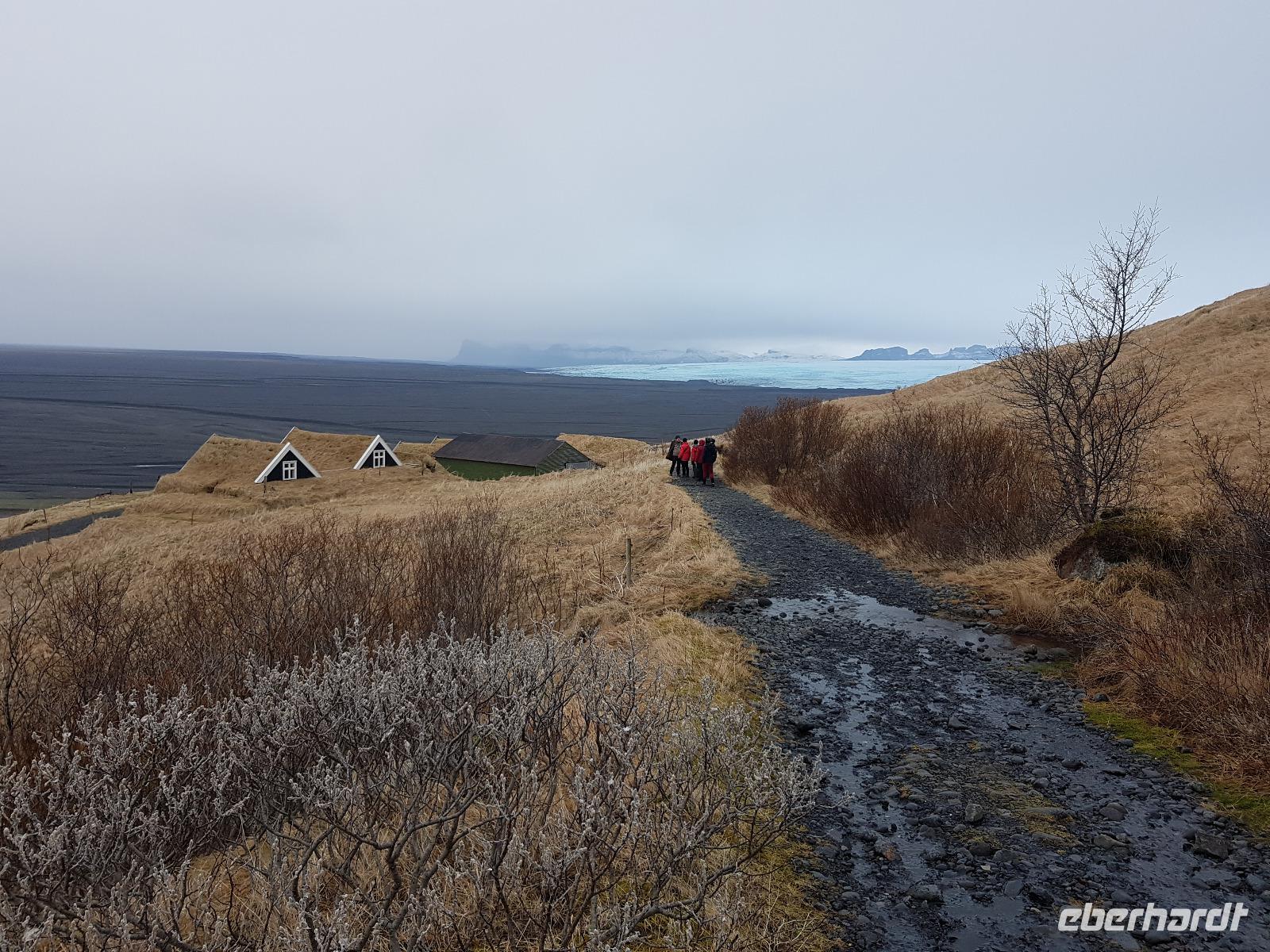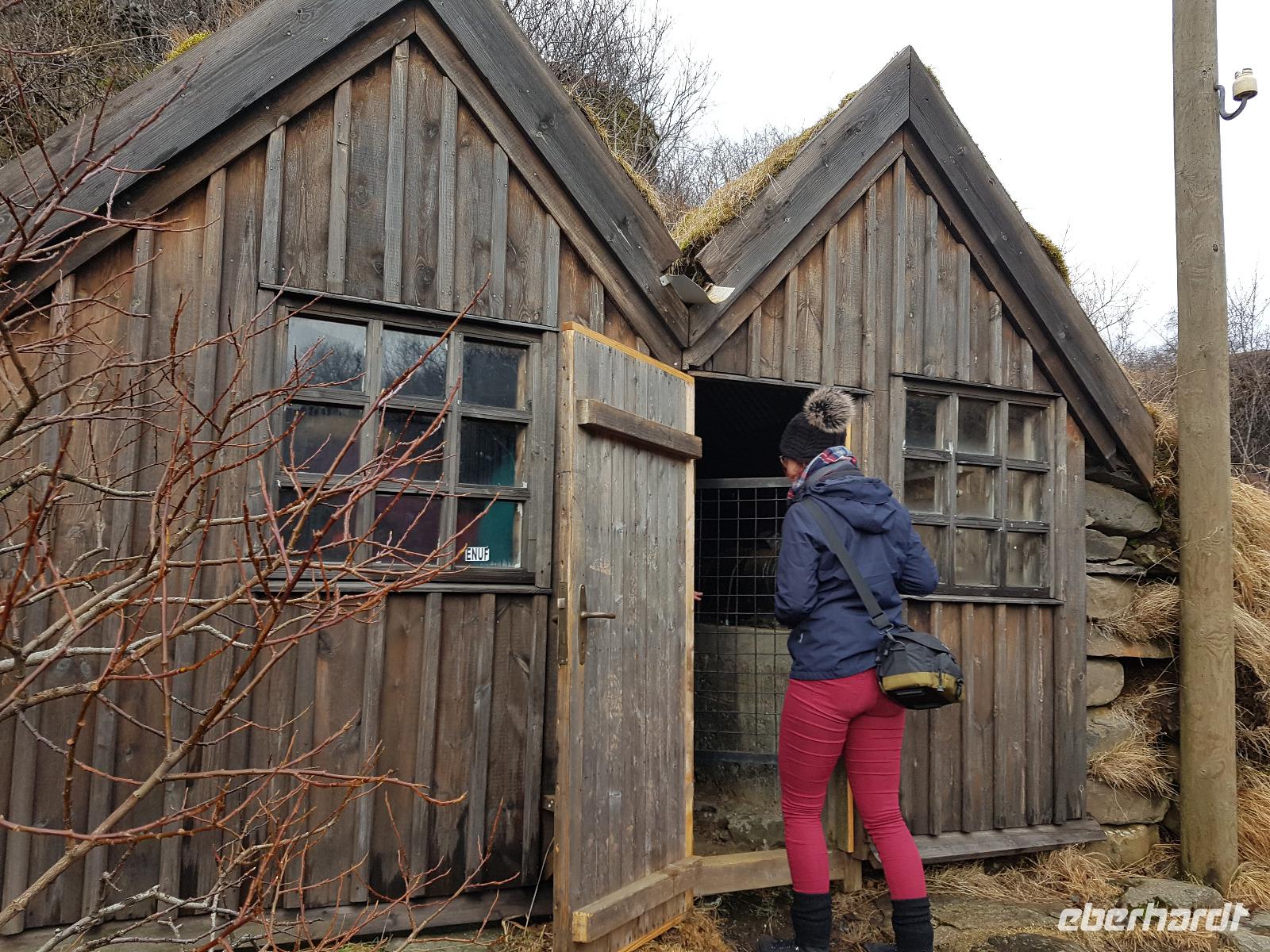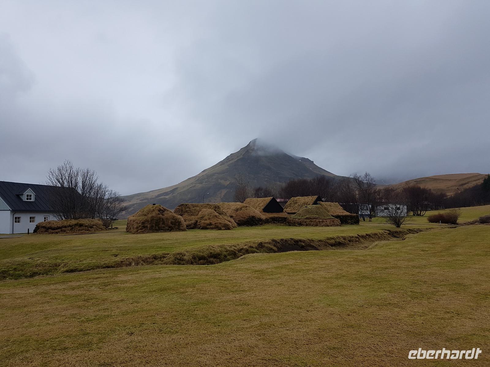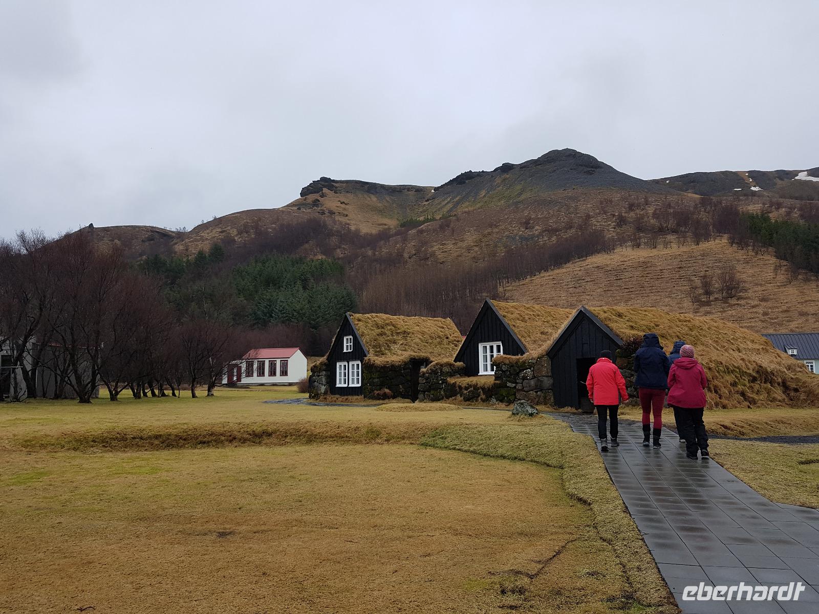 9 Uhr brachen wir wieder auf gen Süden. Unser erster Halt war am Seljalandwasser, hinter dem man im Sommer auch lang laufen kann. Im Winter jetzt war alles vereist und der Weg dahinter gesperrt. Dennoch war es ein feuchtes Vergnügen. Wenig später erreichten wir Skogar und begannen mit der Besichtigung im Museum Skogasafn. Martina führte uns und schilderte sehr anschaulich das schwere Leben auf Island in der Vergangenheit. Unzählige Gegenstände wurden hier von Pordur Tomasson zusammen getragen und sie sind wunderbar präsentiert. Auch die alten Torfhäuser im Freigelände erzählten viel über das entbehrungsreiche Leben der Bevölkerung. Seit 2002 ist noch ein Verkehrs- und Technikmuseum dazu gebaut worden. Leider setzte nun der angekündigte Regen ein und so hielten wir uns am Skogar Wasserfall nur ganz kurz auf für ein Foto und trafen uns dann im nahe gelegenen Bistro bei einer warmen Suppe wieder.