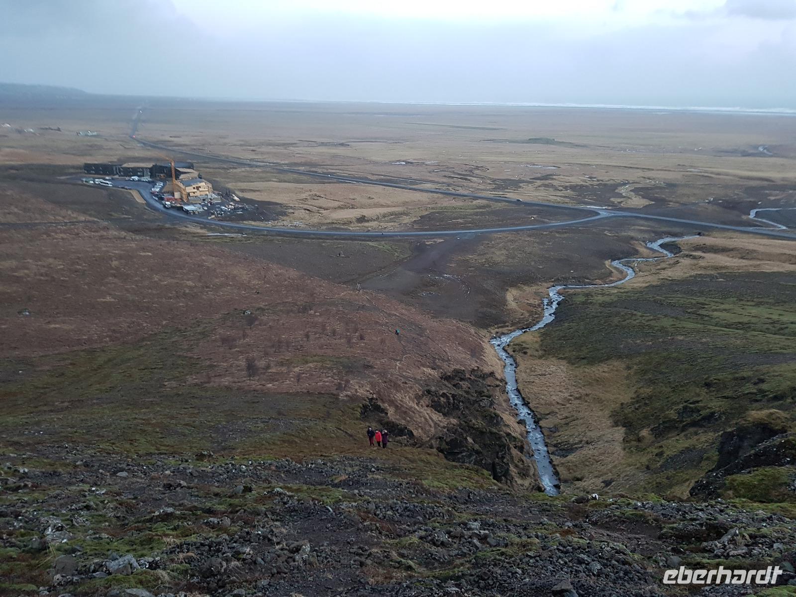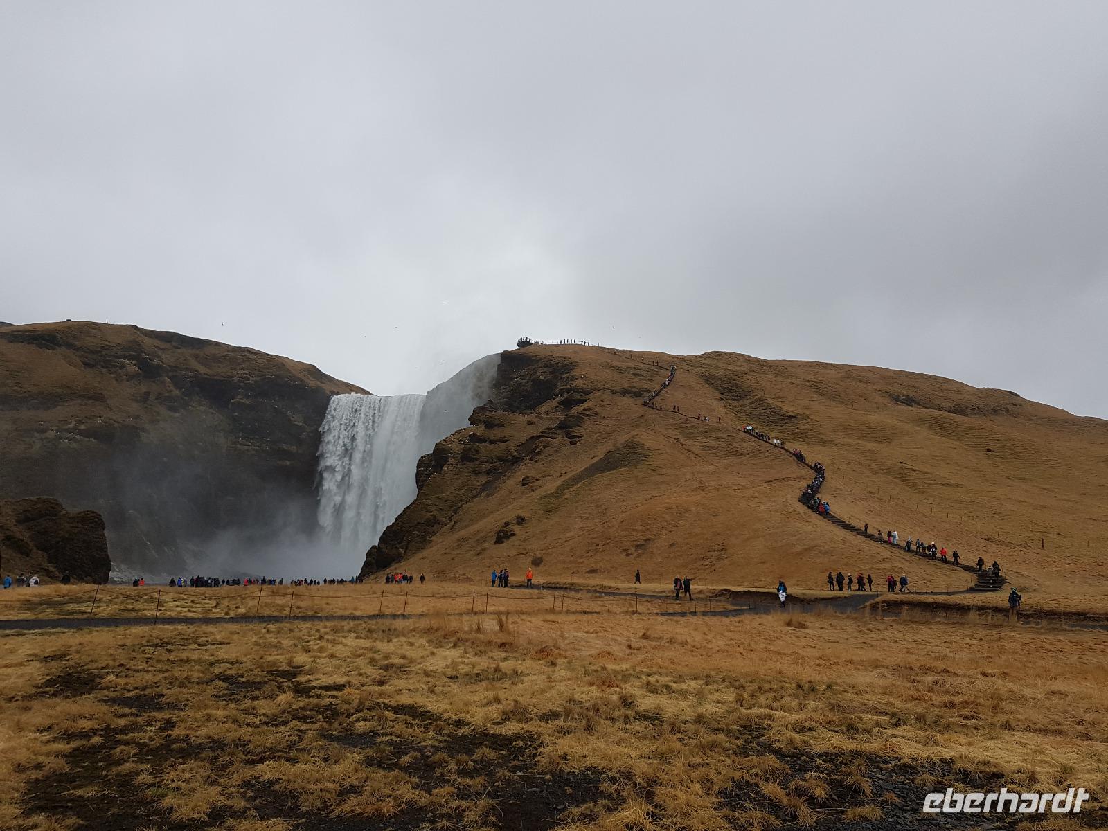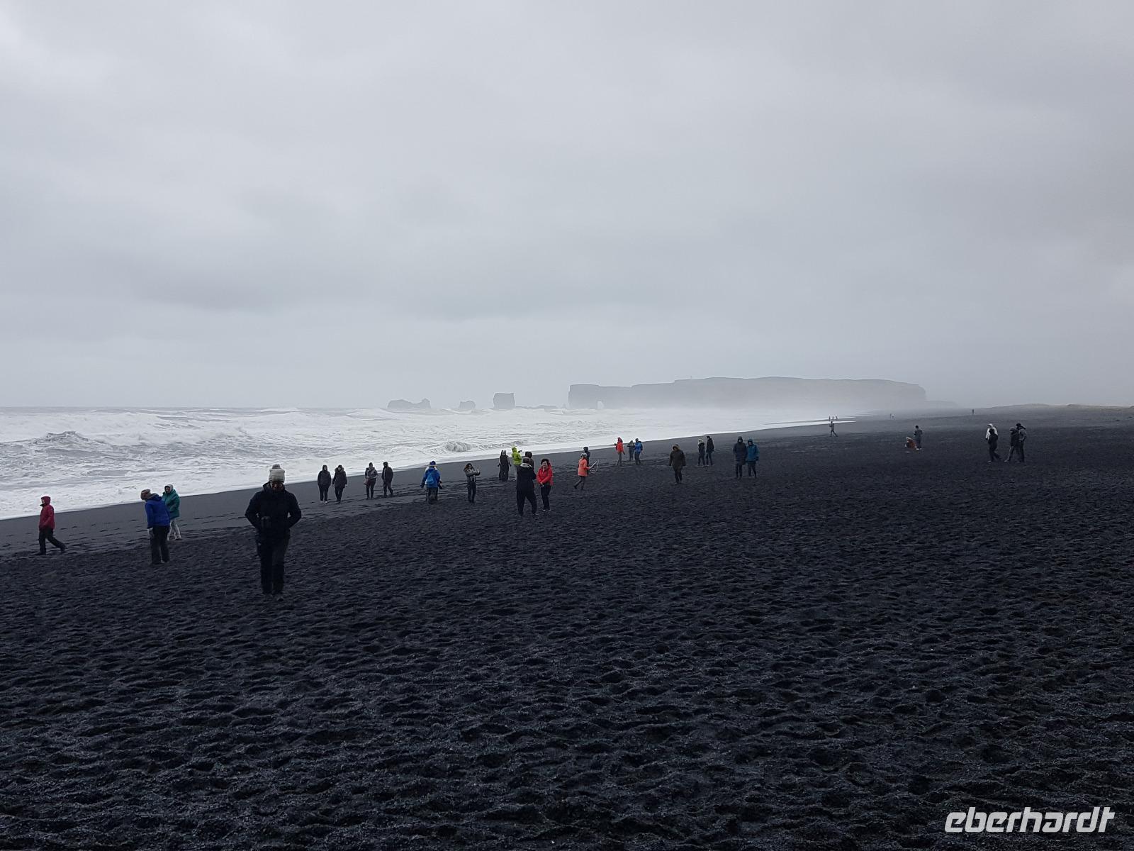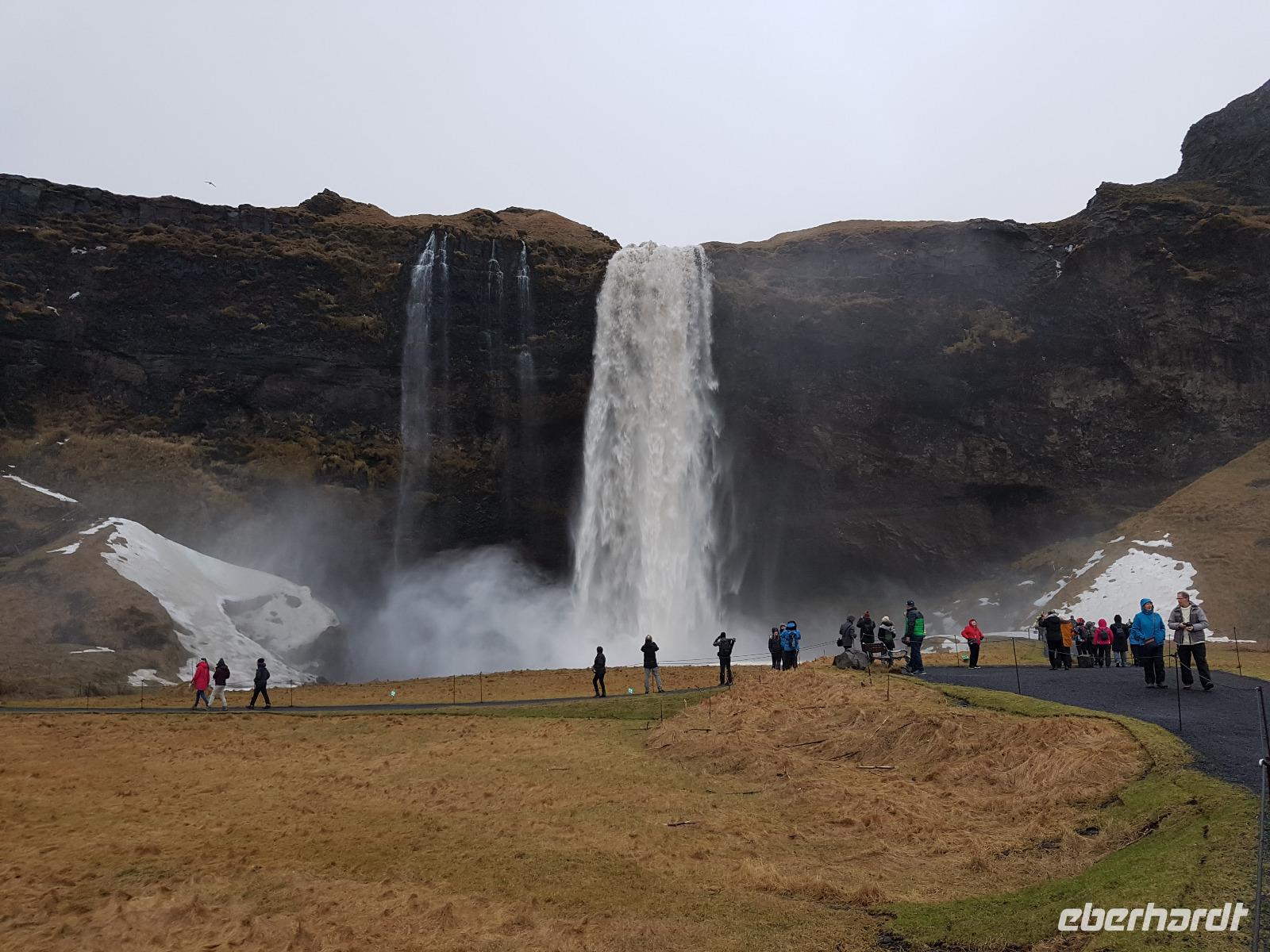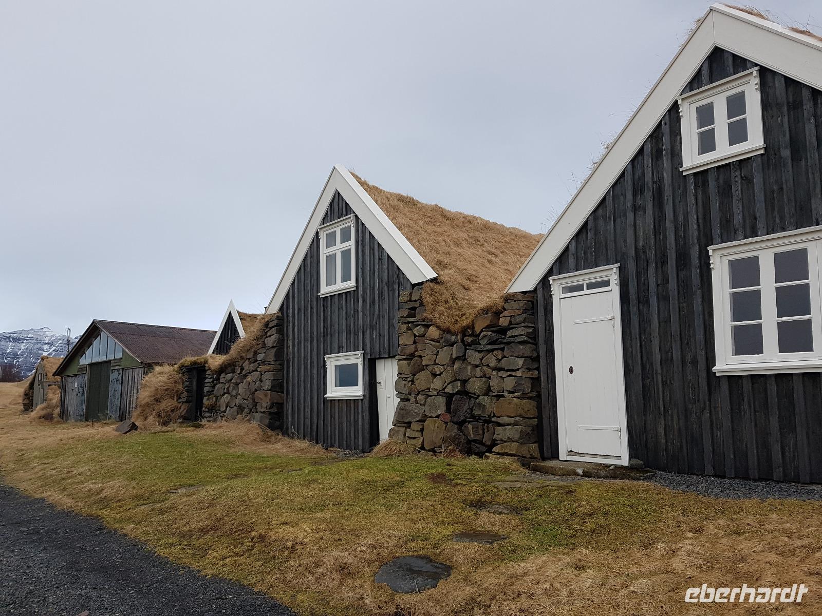 9 Uhr brachen wir wieder auf gen Süden. Unser erster Halt war am Seljalandwasser, hinter dem man im Sommer auch lang laufen kann. Im Winter jetzt war alles vereist und der Weg dahinter gesperrt. Dennoch war es ein feuchtes Vergnügen. Wenig später erreichten wir Skogar und begannen mit der Besichtigung im Museum Skogasafn. Martina führte uns und schilderte sehr anschaulich das schwere Leben auf Island in der Vergangenheit. Unzählige Gegenstände wurden hier von Pordur Tomasson zusammen getragen und sie sind wunderbar präsentiert. Auch die alten Torfhäuser im Freigelände erzählten viel über das entbehrungsreiche Leben der Bevölkerung. Seit 2002 ist noch ein Verkehrs- und Technikmuseum dazu gebaut worden. Leider setzte nun der angekündigte Regen ein und so hielten wir uns am Skogar Wasserfall nur ganz kurz auf für ein Foto und trafen uns dann im nahe gelegenen Bistro bei einer warmen Suppe wieder.