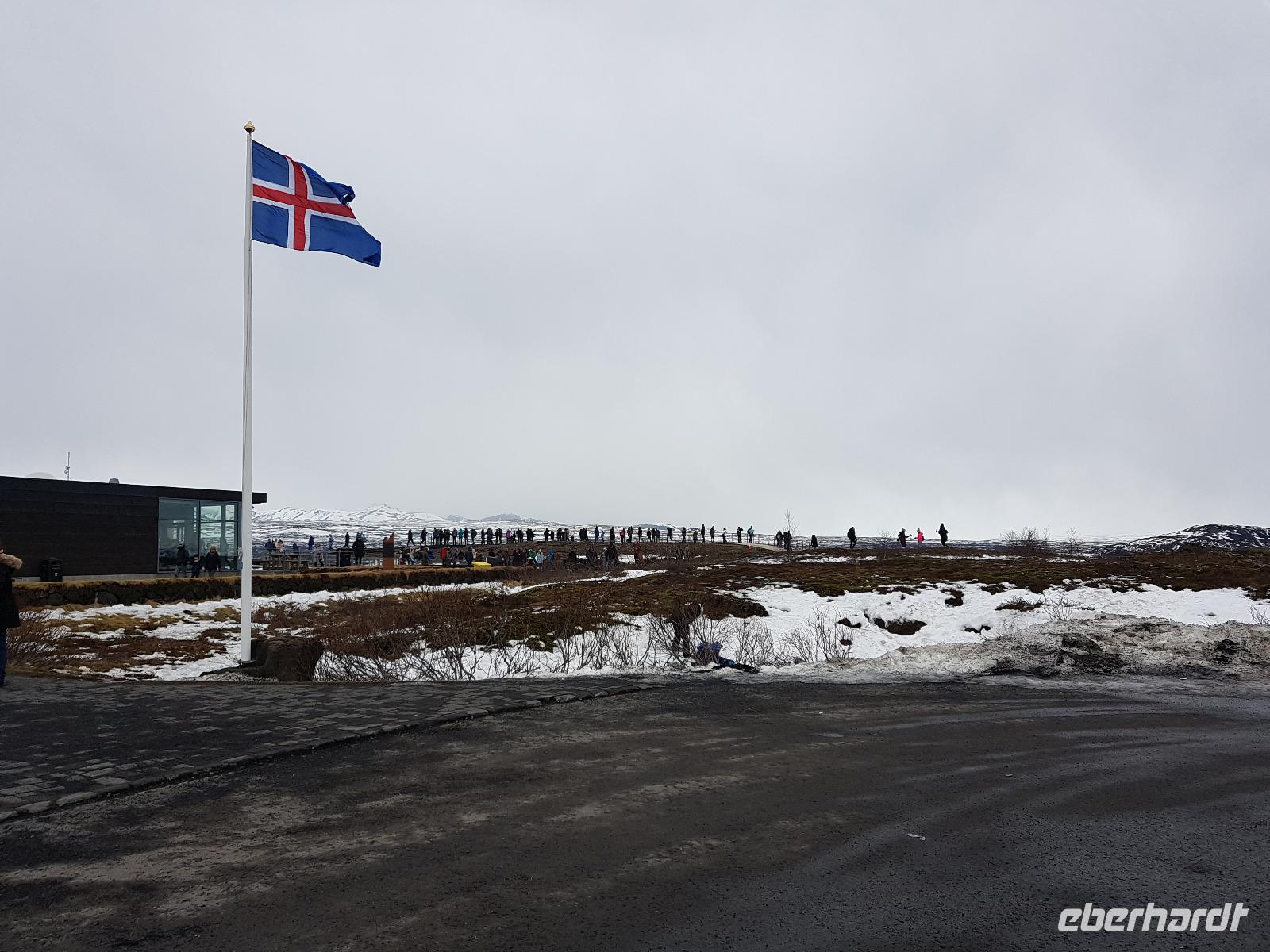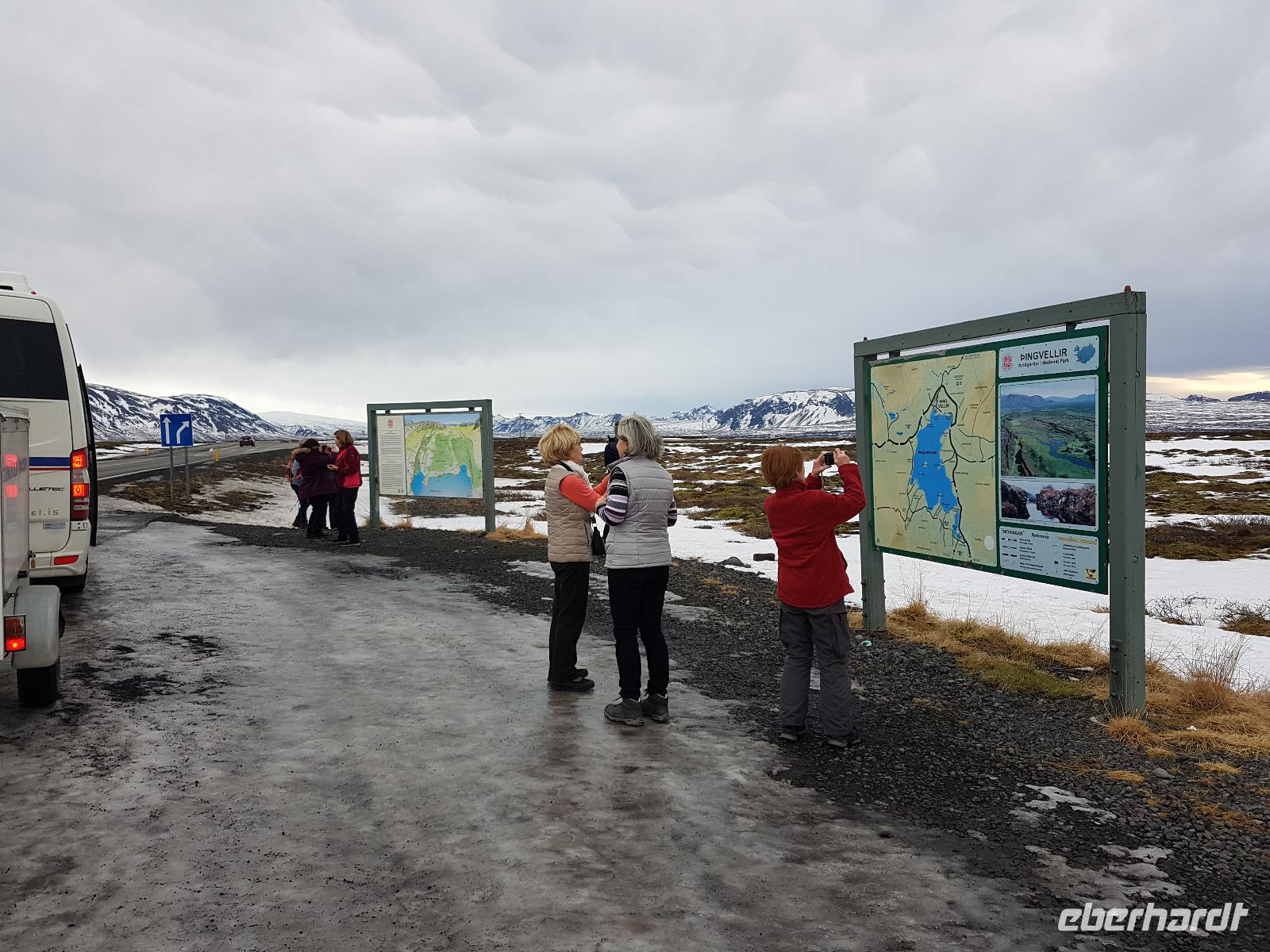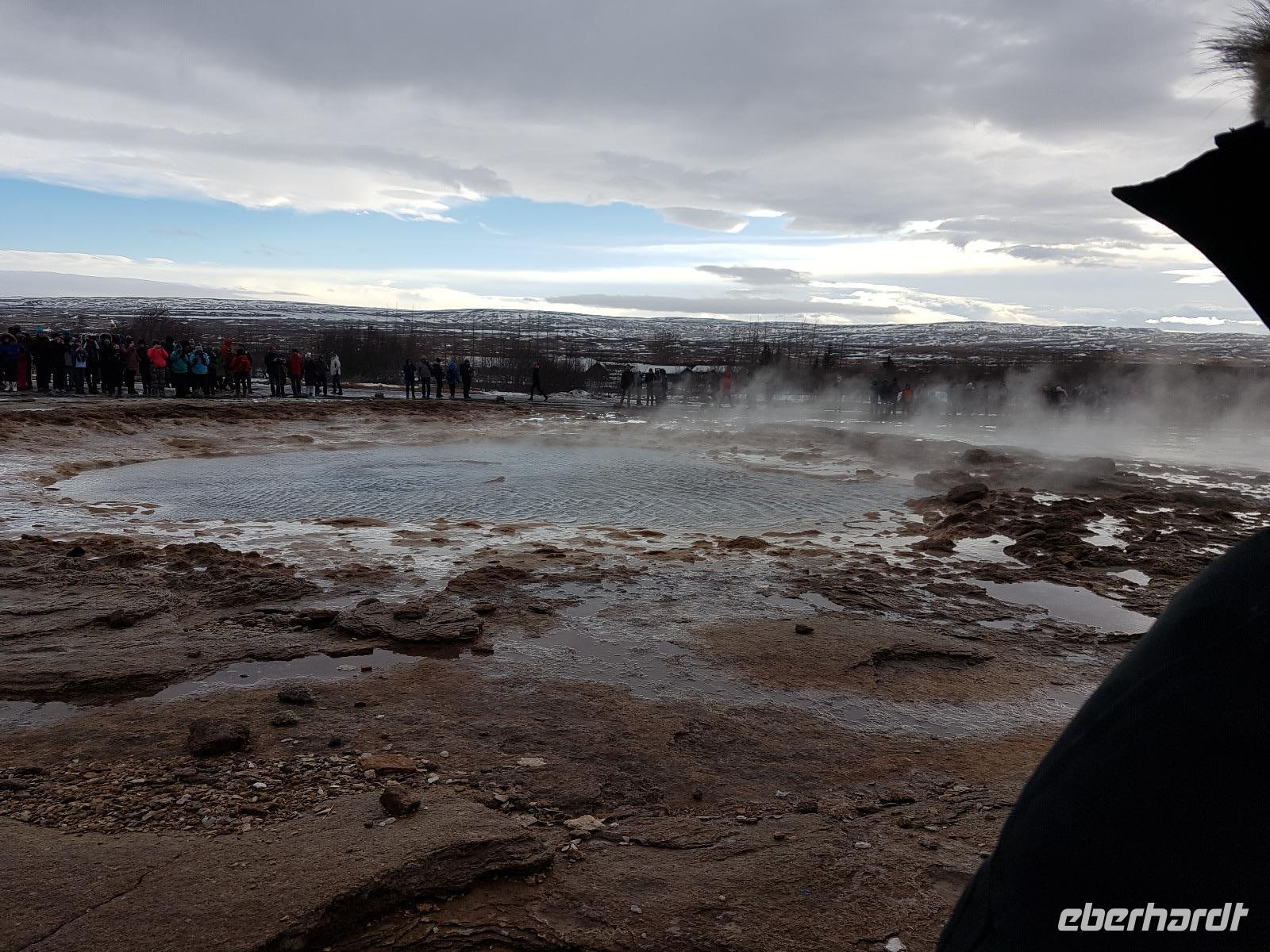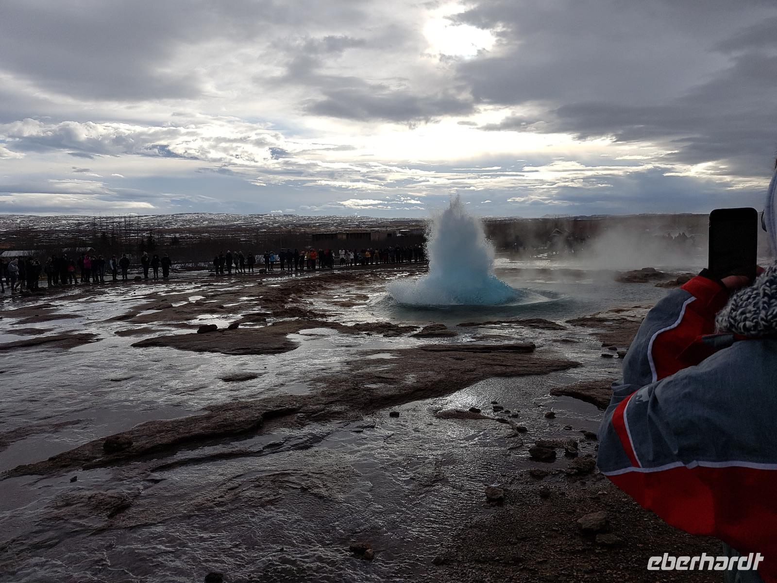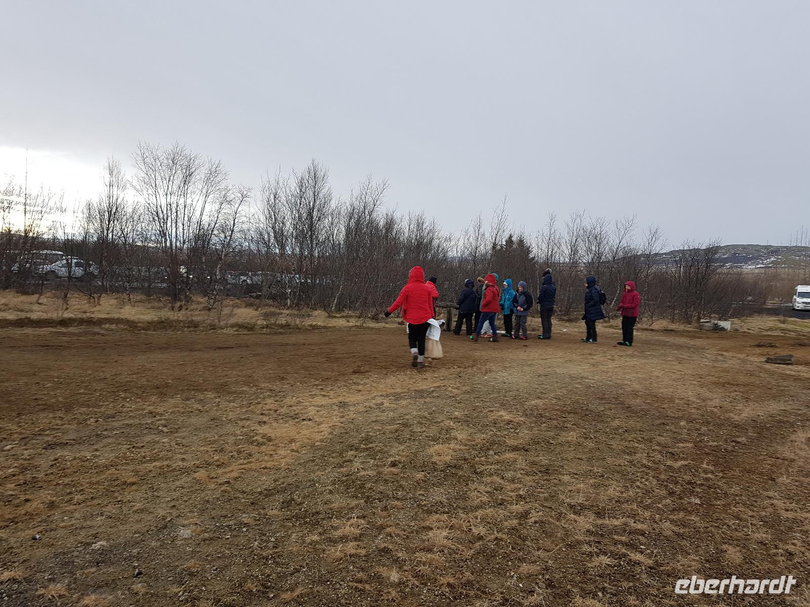 Heute Morgen berichteten alle Zeitungen über das Gewitter vom Vorabend. In Reykjavik hatte man sogar alle Schwimmbäder geschlossen ! Wir fuhren zunächst nach Alafoss und besuchten einen Wollmarkt und den gleichnamigen Wasserfall. Das Geschäft hielt eine aussergewöhnliche Vielfalt an Wollprodukten bereit und so kauften die Singles fleissig ein. Dann ging die Fahrt weiter nach Tingvellir. Dort tagte das älteste Parlament der Welt und der Ort liegt an der Spalte zwischen der amerikanischen und eurasischen Platte. Wir machten einen ausführlichen Spaziergang zum alten Tagungsort. Weiter fuhren wir zum Thermalfeld Haukadalur. Der grosse Geysir Stori ist leider seit 1964 erloschen, aber der kleine Bruder Strokkur- Butterfass - zeigt seine Aktivität aller 5-10 Minuten. Wir standen geduldig, um den Ausbruch auf ein Foto zu bannen. Zuvor aber stärkten wir uns in freier Natur bei einem Picknick, bestehend aus einem Brot, welches 24 Stunden in der heissen Erde gebacken wurde, gekochten Eiern, Butter und Hering. Es war eine aussergewöhnliche Kombination, aber äusserst schmackhaft.