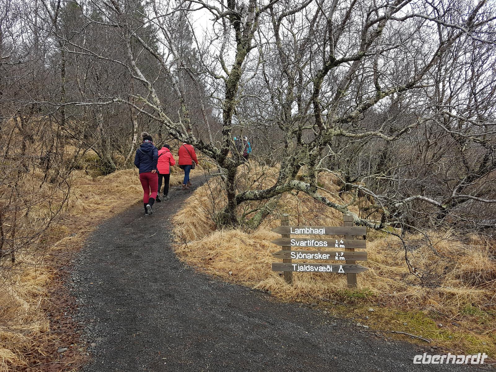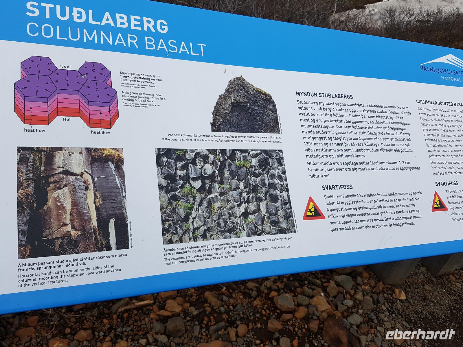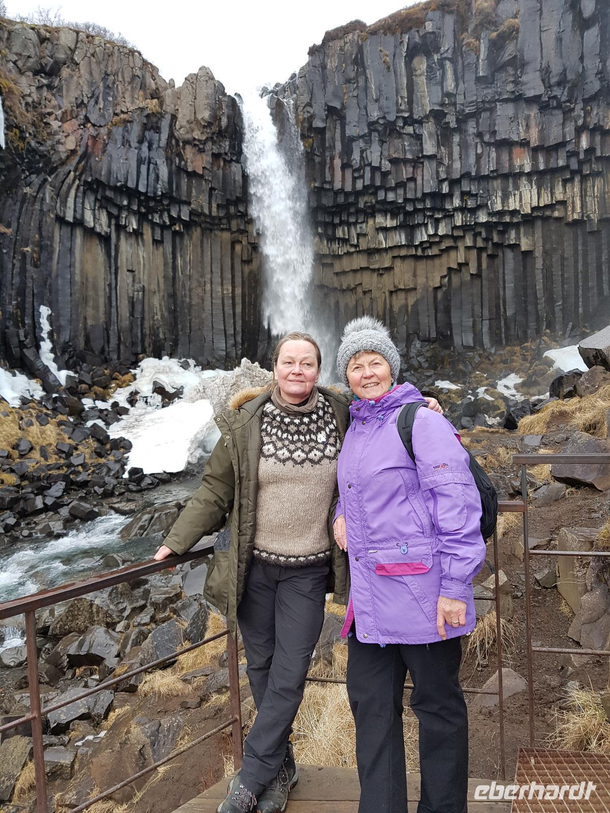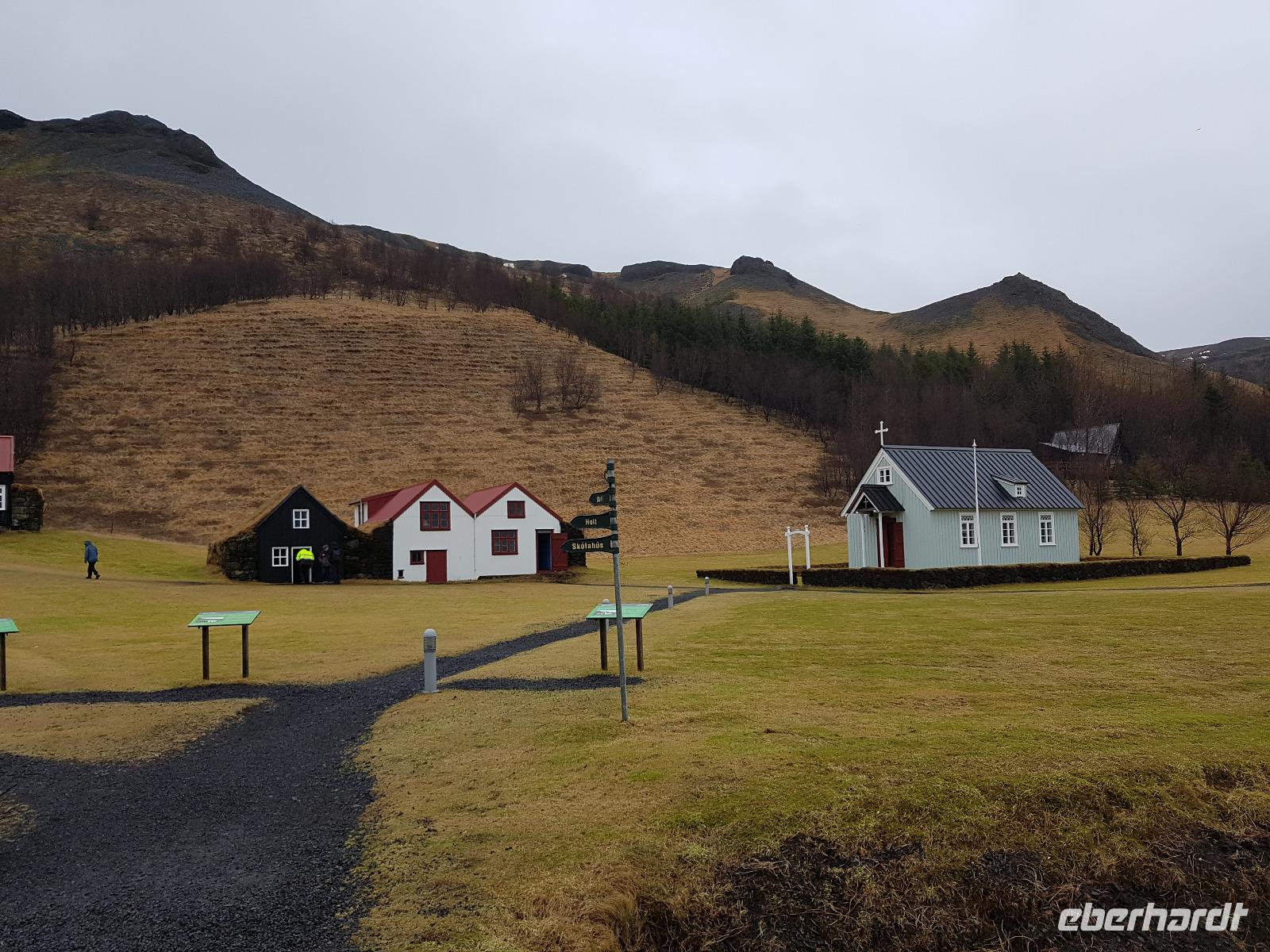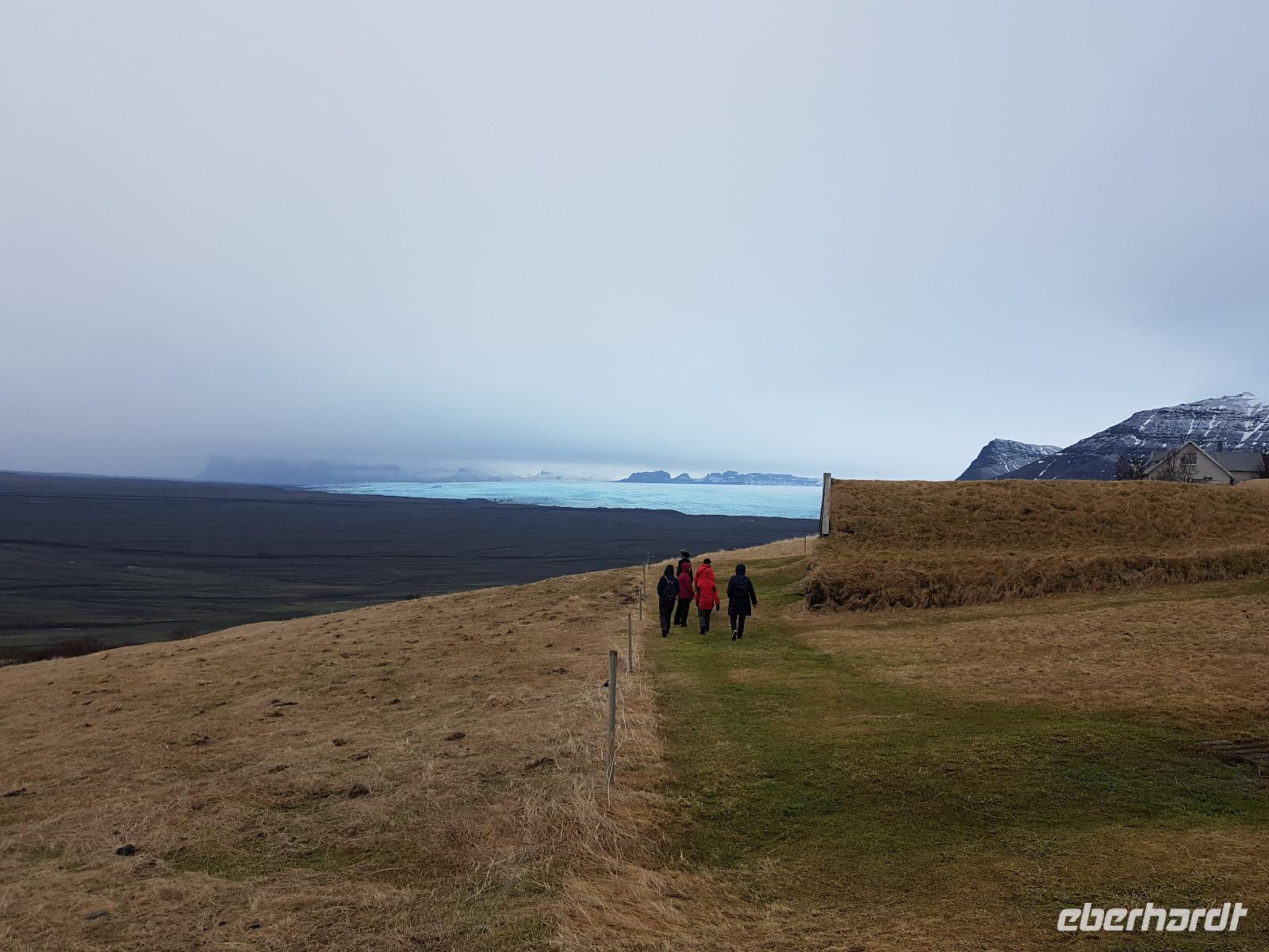 Es war für den späten Nachmittag Regen vorher gesagt und so begaben wir uns gleich auf eine 2stündige Wanderung mit Ziel Svartifoss Wasserfall. Der Weg führte bergan immer parallel zu einem Bach, vorbei an einem Wasserfall und später kamen wir zu einem kleinen Mikrokraftwerk, was aber nicht mehr in Betrieb war. Weiter oben mussten wir den Bach über eine Brücke queren und dann war der Schwarze Wasserfall in der Ferne auch schon zu sehen. Für den vereisten Weg bergab zum Wasserfall nutzten wir die Spiralen an den Schuhen nochmals. Der Wasserfall war von riesigen Basaltsäulen im Halbkreis gesäumt und es wirkte wie eine Bühne im Theater. Auf der anderen Seite ging es wieder steil bergauf und oben waren die umliegenden Berge in der Abendsonne gut zu sehen. Auf dem Rückweg kamen wir an alten Torfhäusern vorbei, die im Sommer offenbar als Unterkünfte für Wanderer dienen. Anna Lara fand eine unverschlossene Tür und so konnten wir auch drin alles anschauen. Wieder unten im Tal fuhren wir ein kurzes Stück bis zum Skaftafell Informationszentrum und schauten dort einen Film über den Nationalpark an. Auf der Rückfahrt zum Hotel stoppten wir kurz an der Torfkirche für ein Foto und im Hotel genossen wir Kaffee und Kuchen sowie die Happy Hour an der Bar. Nach dem Abendessen hiess es wieder Koffer packen.