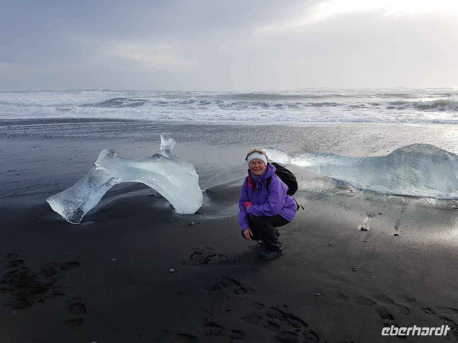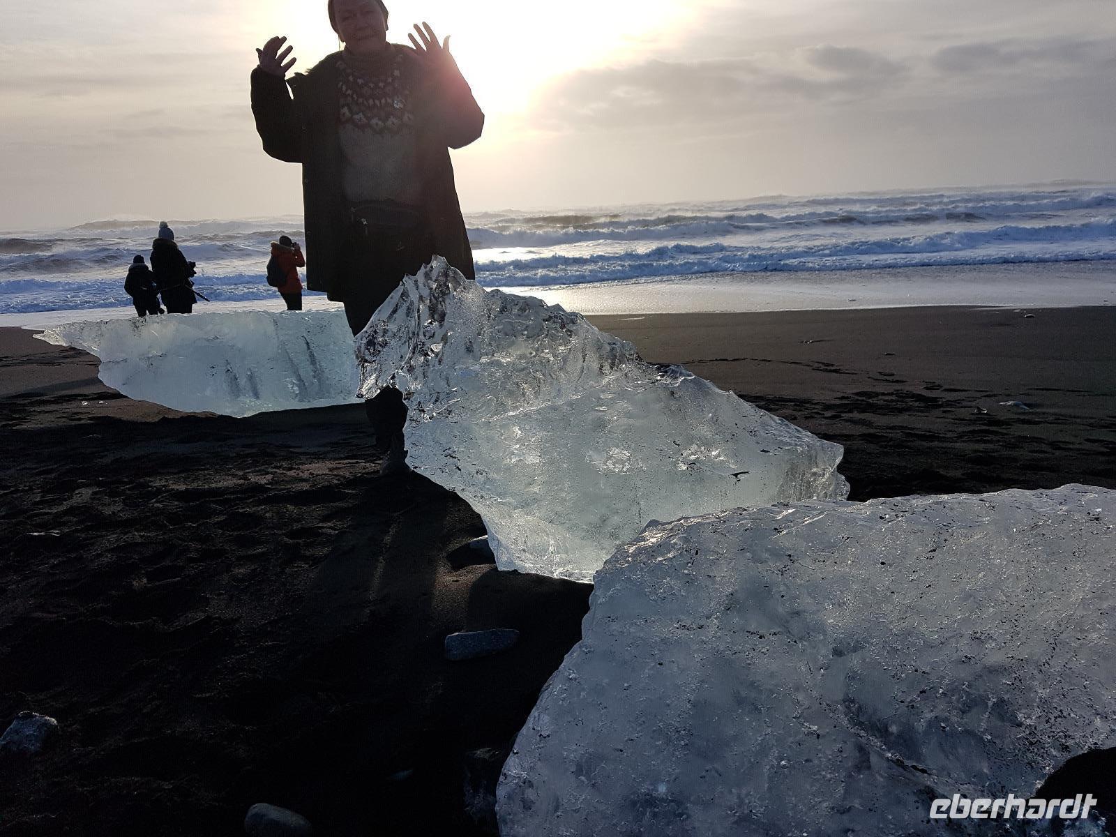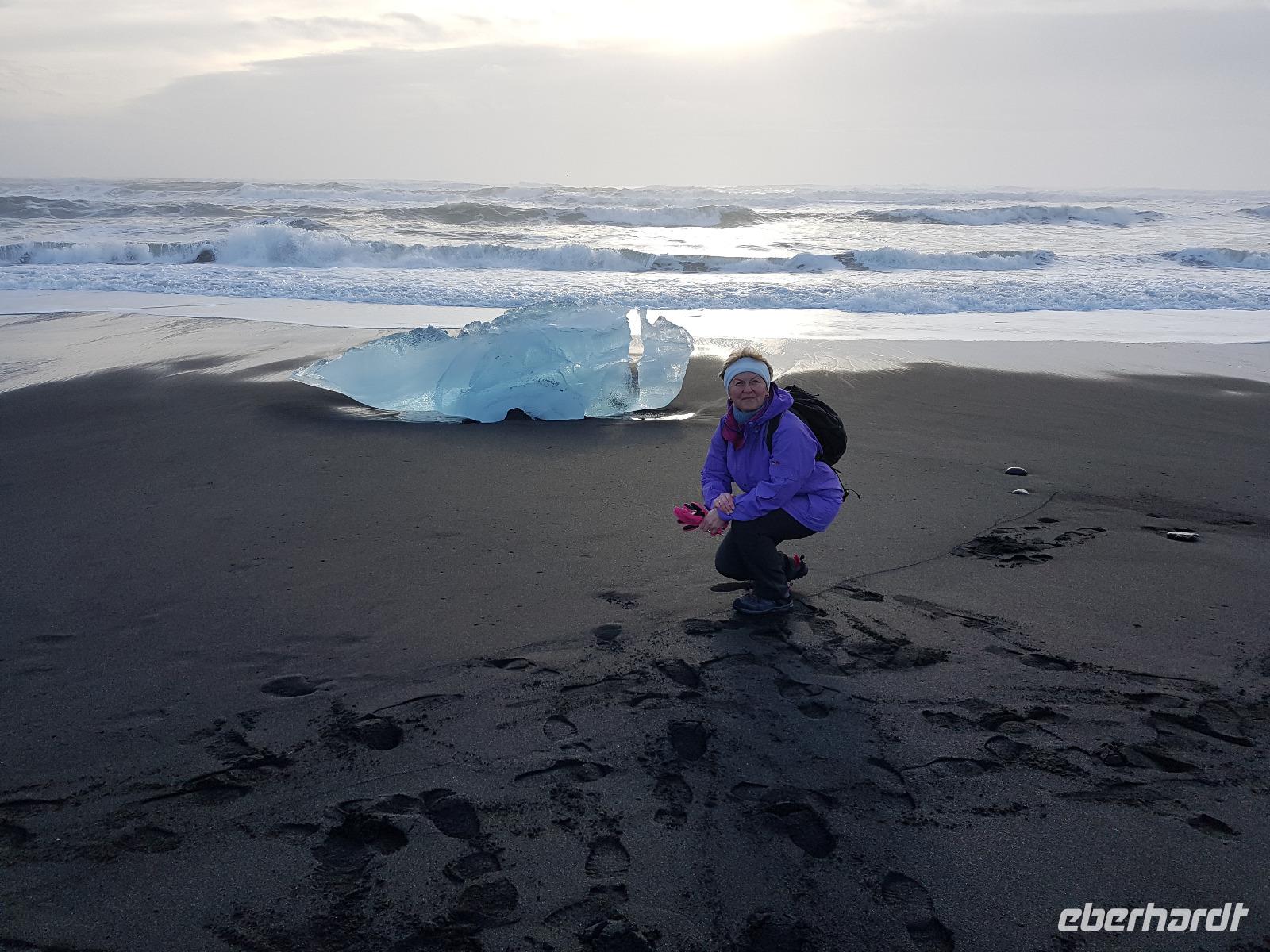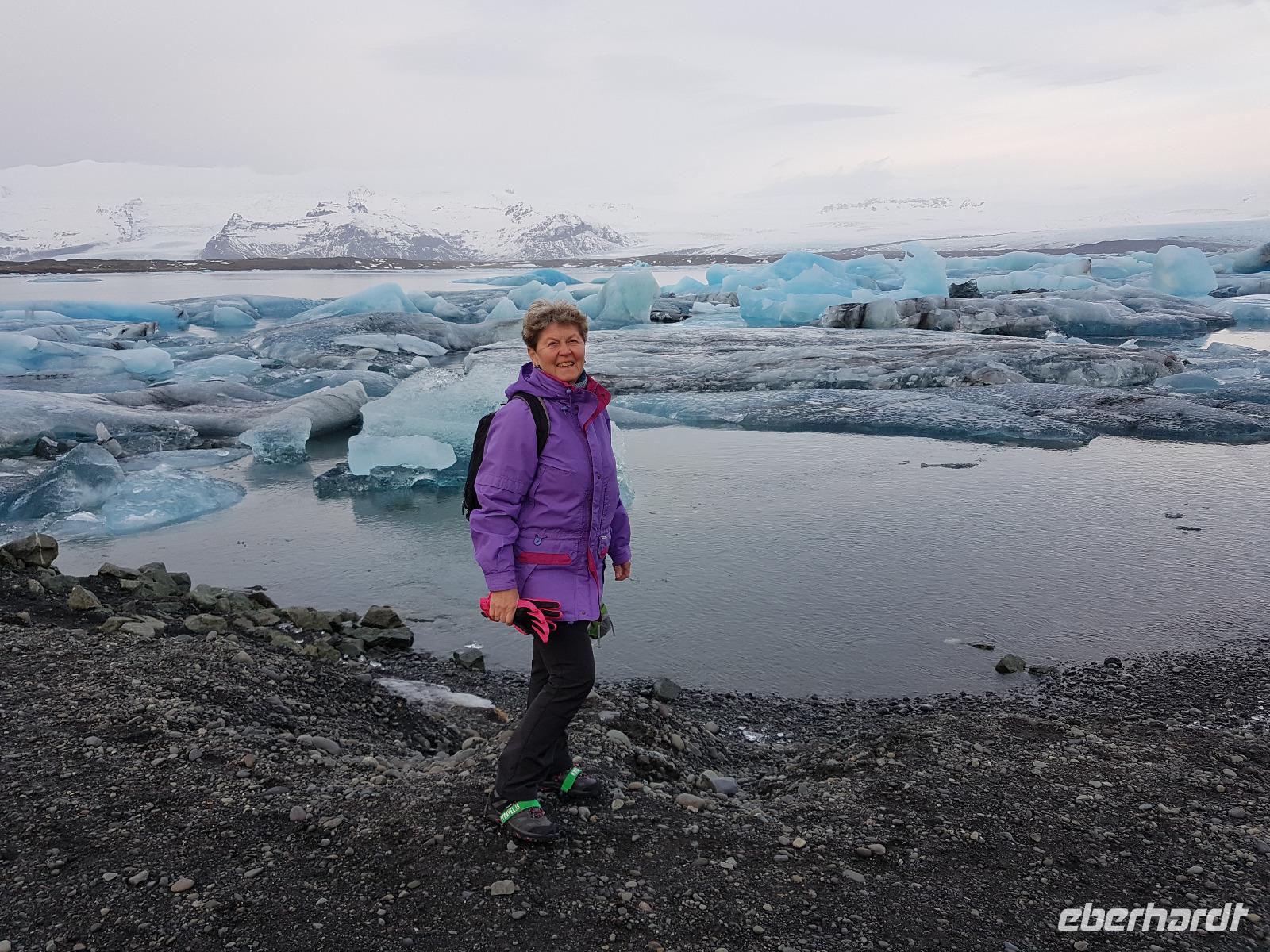 Der heutige Tag sollte der Höhepunkt unserer Reise werden. Wir fuhren am Morgen zur Gletscherlagune Jökulsarlon und bestaunten die schwimmenden Eisberge. Durch Ebbe und Flut werden die Eisberge ins Meer transportiert und dort wieder an den Strand gespült. So glich der schwarze Lavastrand mit dem 1000jährigen klaren oder blauen Eisbergen einem Naturpark. Wir spazierten völlig fasziniert den Strand entlang und fotografierten viel zu viel. Als Überraschung gab es dann einen Brennivin mit 1000jährigem Eis. Beim Ausschenken konnte ich nicht mehr rechtzeitg vor einer herannahenden Welle flüchten und bekam so nasse Hosenbeine und nasse Schuhe. Nicht so schlimm - auf der Rückfahrt stoppten wir kurz beim Hotel und ich zog trockene Sachen an. Unsere Mittagspause machten wir bei einer Tankstelle mit Bistro. Nach dem Essen gingen wir auf einen kleinen Hügel mit wunderbarer Aussicht auf den nahen Gletscher.