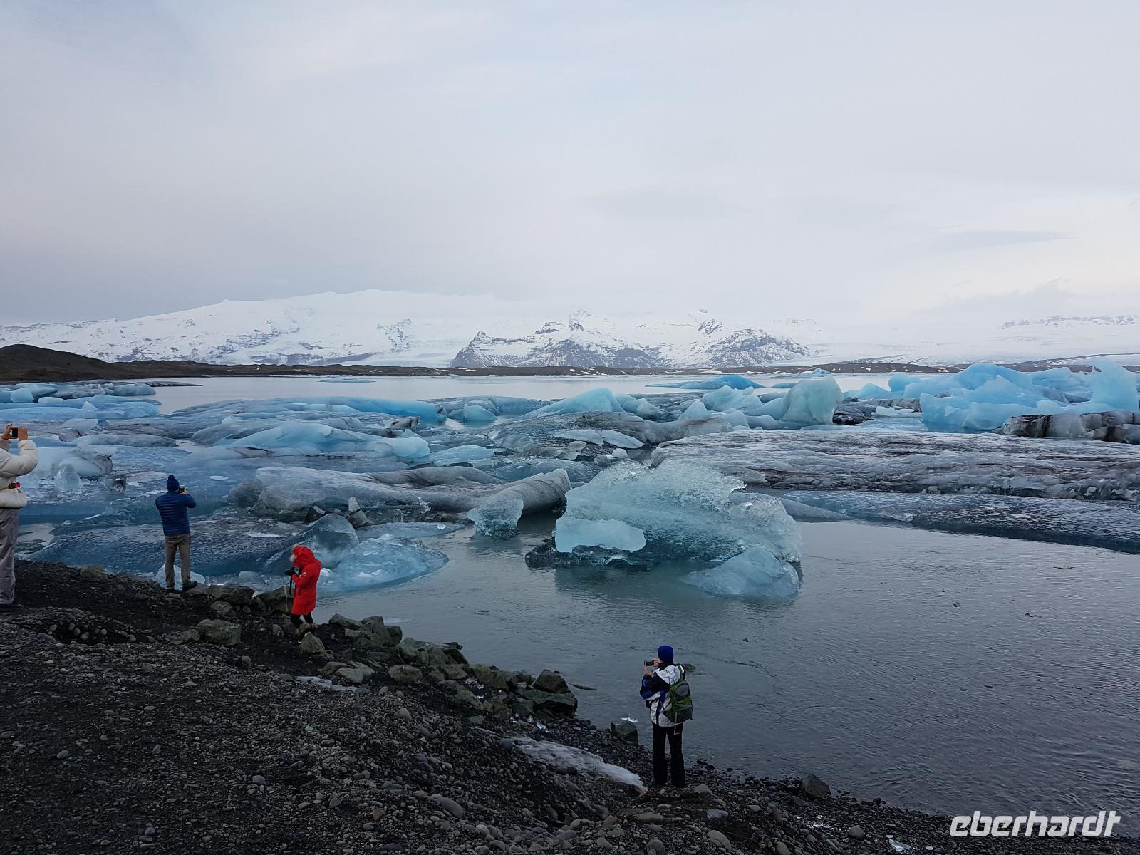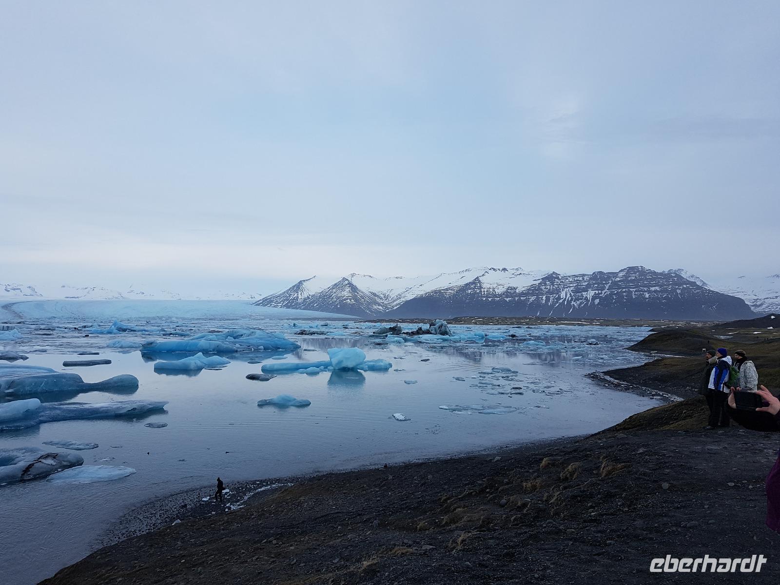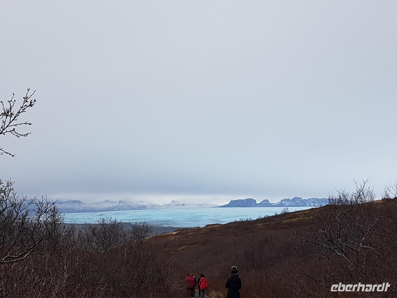 Der heutige Tag sollte der Höhepunkt unserer Reise werden. Wir fuhren am Morgen zur Gletscherlagune Jökulsarlon und bestaunten die schwimmenden Eisberge. Durch Ebbe und Flut werden die Eisberge ins Meer transportiert und dort wieder an den Strand gespült. So glich der schwarze Lavastrand mit dem 1000jährigen klaren oder blauen Eisbergen einem Naturpark. Wir spazierten völlig fasziniert den Strand entlang und fotografierten viel zu viel. Als Überraschung gab es dann einen Brennivin mit 1000jährigem Eis. Beim Ausschenken konnte ich nicht mehr rechtzeitg vor einer herannahenden Welle flüchten und bekam so nasse Hosenbeine und nasse Schuhe. Nicht so schlimm - auf der Rückfahrt stoppten wir kurz beim Hotel und ich zog trockene Sachen an. Unsere Mittagspause machten wir bei einer Tankstelle mit Bistro. Nach dem Essen gingen wir auf einen kleinen Hügel mit wunderbarer Aussicht auf den nahen Gletscher.