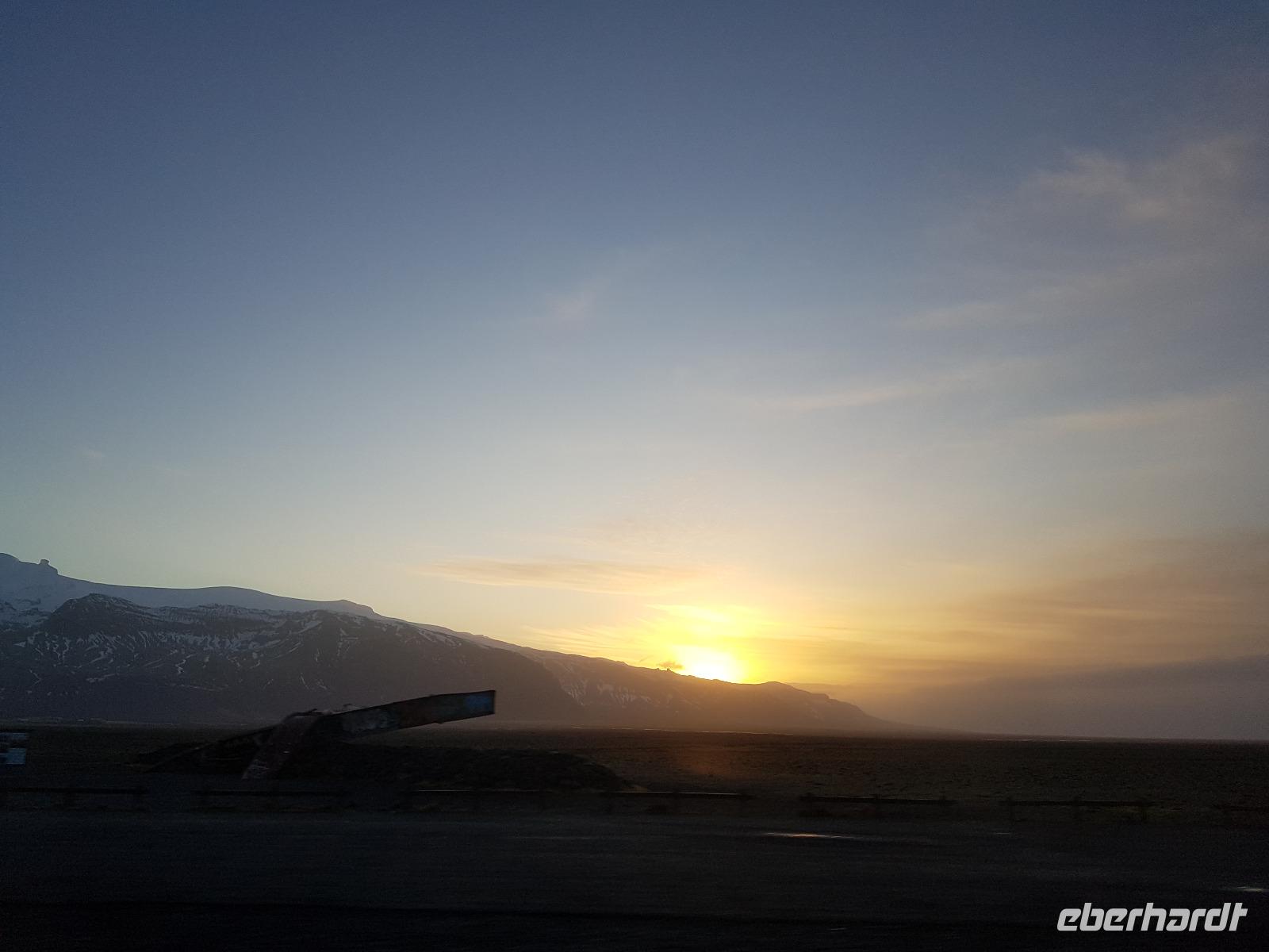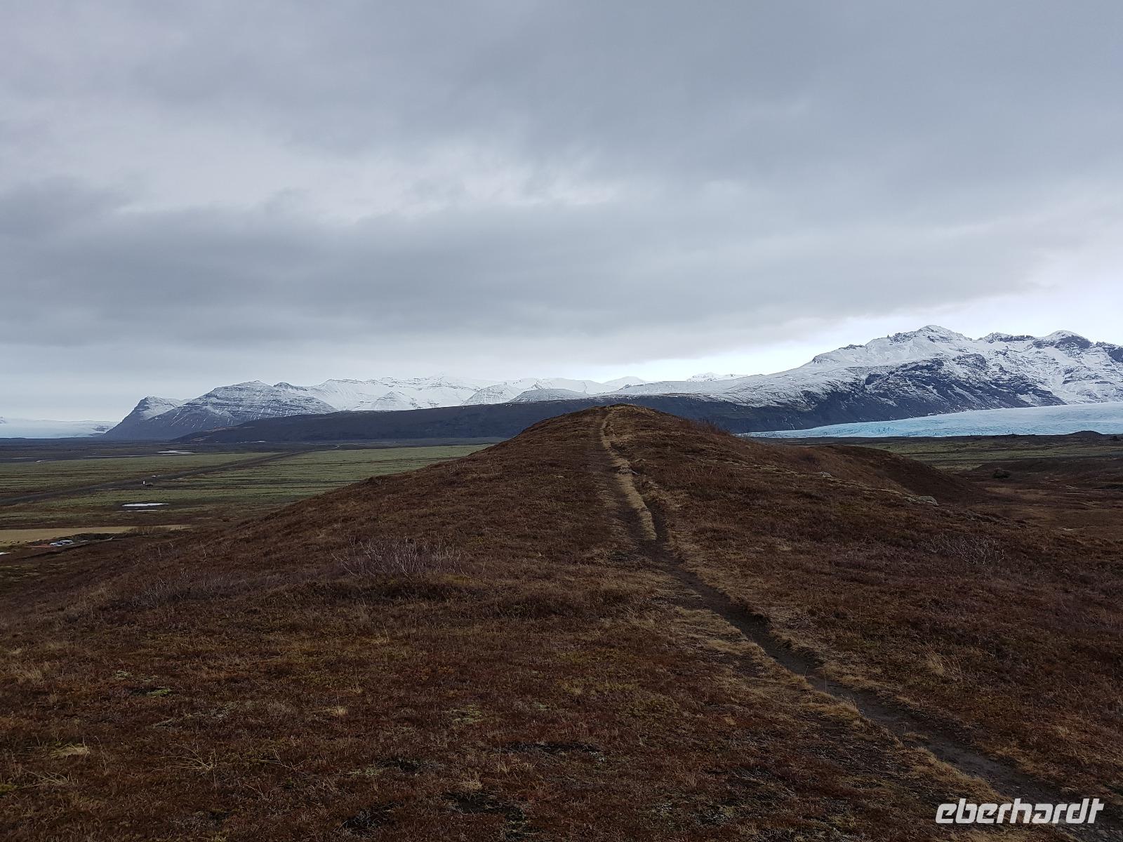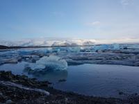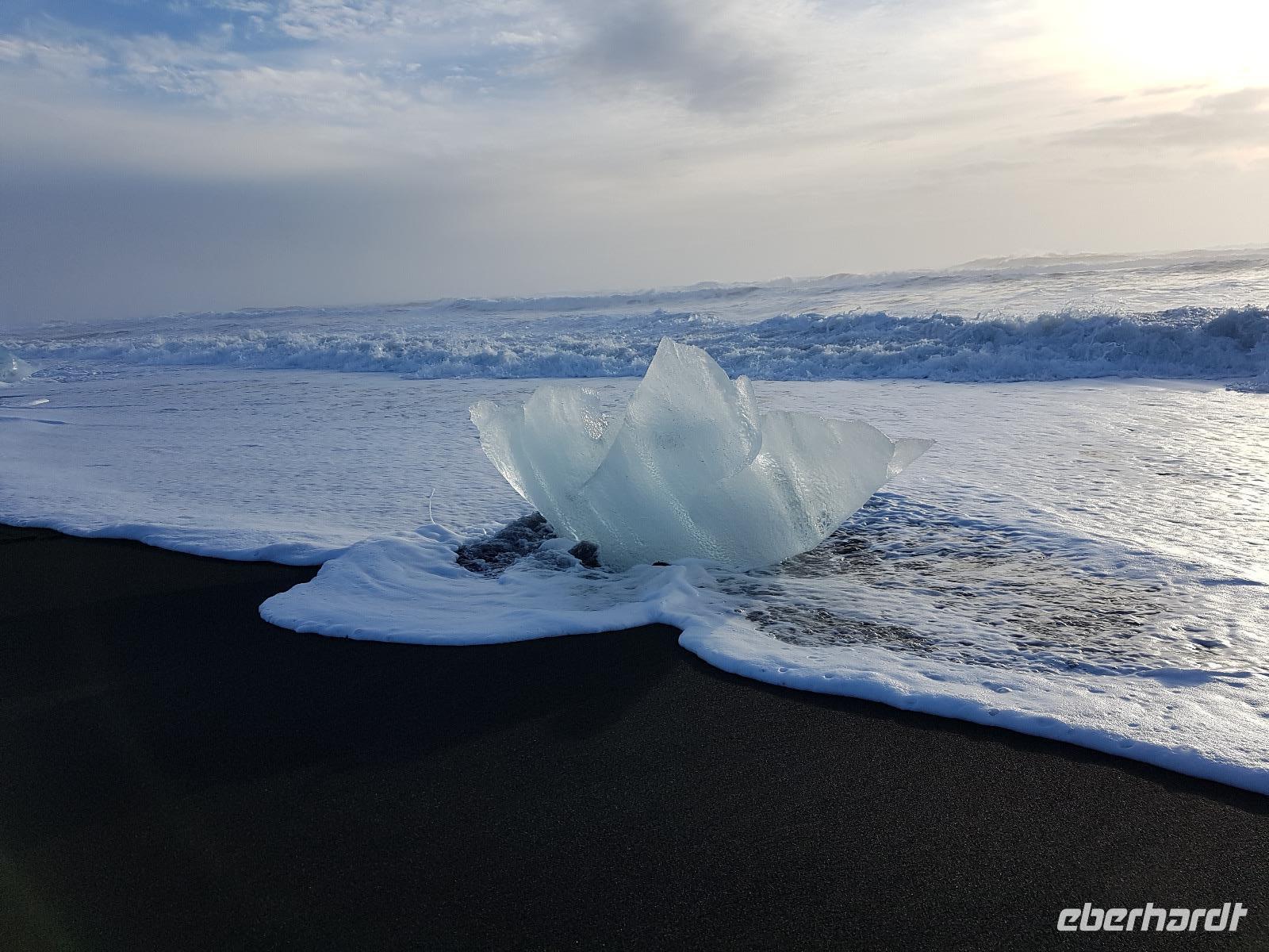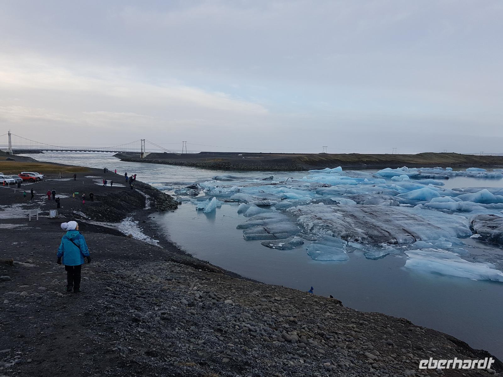 Der heutige Tag sollte der Höhepunkt unserer Reise werden. Wir fuhren am Morgen zur Gletscherlagune Jökulsarlon und bestaunten die schwimmenden Eisberge. Durch Ebbe und Flut werden die Eisberge ins Meer transportiert und dort wieder an den Strand gespült. So glich der schwarze Lavastrand mit dem 1000jährigen klaren oder blauen Eisbergen einem Naturpark. Wir spazierten völlig fasziniert den Strand entlang und fotografierten viel zu viel. Als Überraschung gab es dann einen Brennivin mit 1000jährigem Eis. Beim Ausschenken konnte ich nicht mehr rechtzeitg vor einer herannahenden Welle flüchten und bekam so nasse Hosenbeine und nasse Schuhe. Nicht so schlimm - auf der Rückfahrt stoppten wir kurz beim Hotel und ich zog trockene Sachen an. Unsere Mittagspause machten wir bei einer Tankstelle mit Bistro. Nach dem Essen gingen wir auf einen kleinen Hügel mit wunderbarer Aussicht auf den nahen Gletscher.