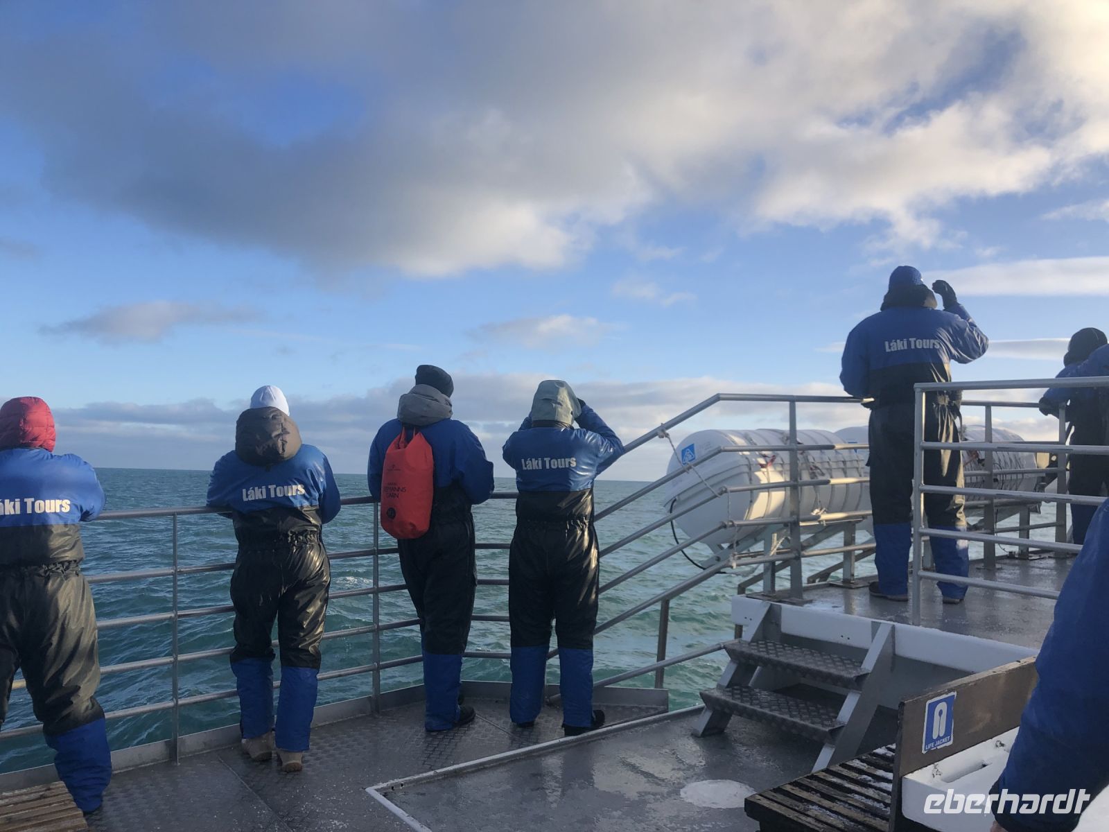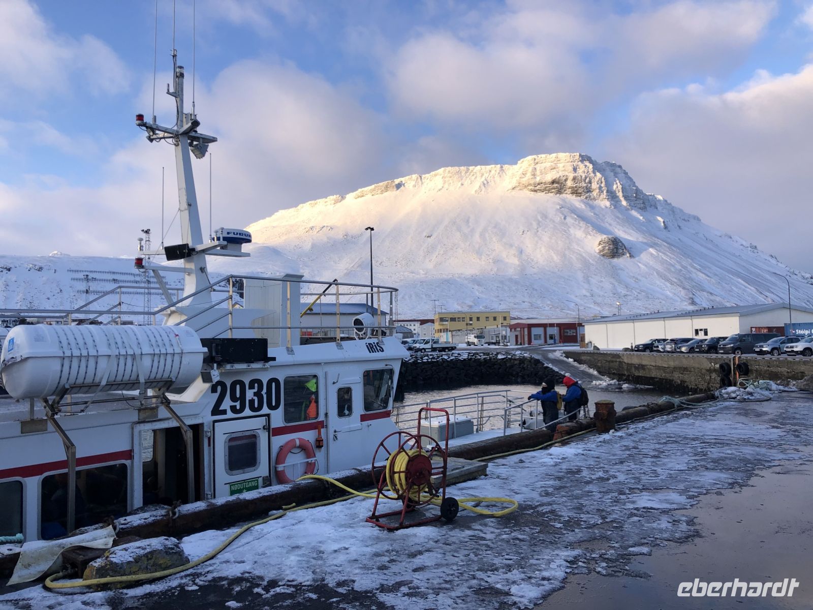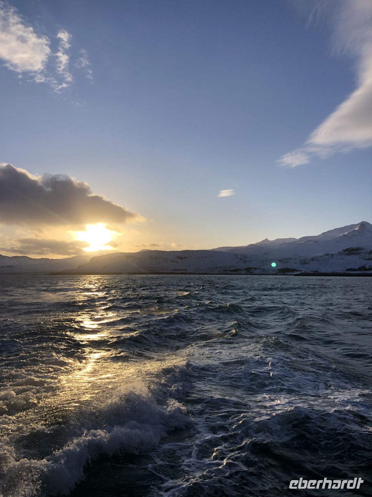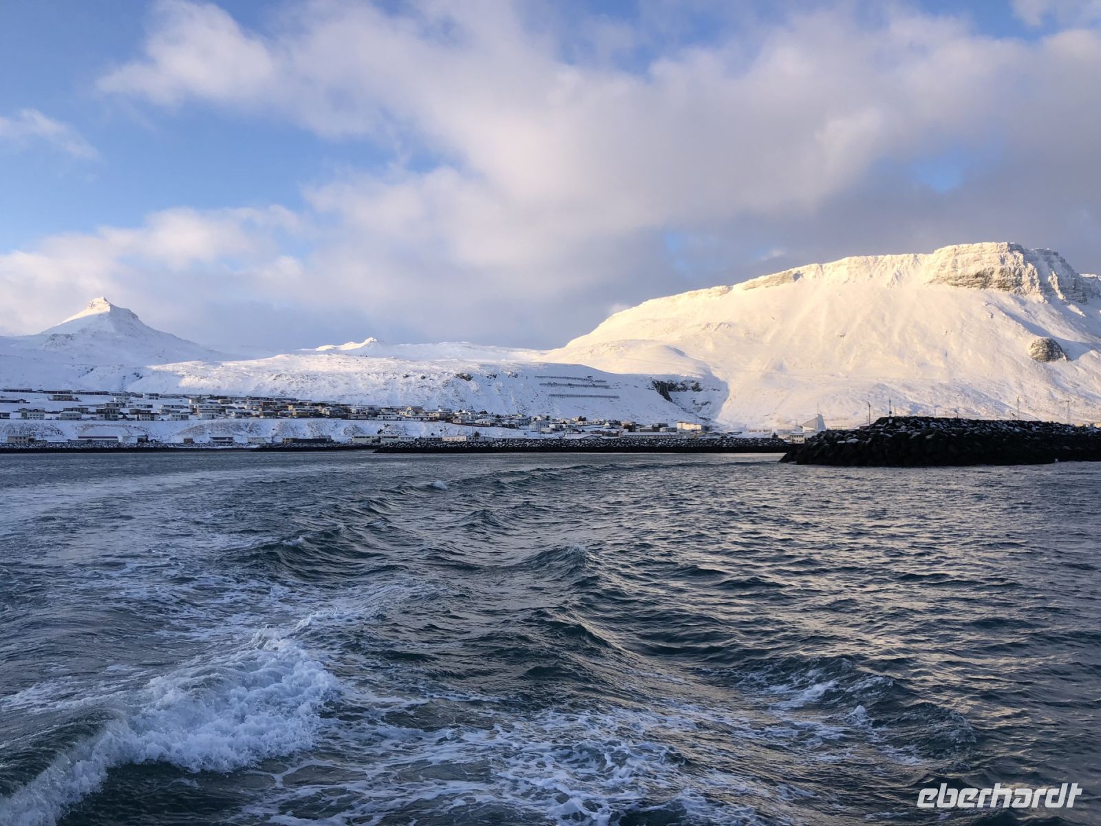 Es steht mal wieder ein aufregender Tag an. Wir machen uns zunächst auf den Weg zur Snæfelssness Halbinsel, die zahlreiche landschaftliche Schönheiten aufzuweisen hat und auch als „Island in Miniatur“ bekannt ist. Im Gegensatz zum gestrigen Tag, haben wir heute traumhaftes Wetter. Wir fahren mit unserem modernen Reisebus durch die endlos weiten, schneebedeckten Landschaften, die wie gemalt aussehen, bis zum kleinen Fischerörtchen Olafsvik. Auf dem Weg müssen wir die perfekte Kulisse um den Mount Kirkjufell noch einmal für einen kurzen Fotostopp ausnutzen. In Olafsvik angekommen werden wir von einer deutschen Mitarbeiterin zunächst mit blauen Overalls ausgestattet, die uns auf dem Boot vor Wind und Wetter schützen sollen. In voller Montur betreten wir das Schiff und verbringen hier die nächsten 3 Stunden. Wir haben Glück und sehen 2 Buckelwale, neben den wahnsinnig schönen Fjordlanschaften, die wir hinter uns lassen. Von einer entspannten Fahrt kann man aber nicht wirklich sprechen, denn der Seegang hatte es ganz schön in sich - so schaukelten wir vor uns hin und haben teilweise etwas mit unserem Magen zu kämpfen - Fischfutter gab es von unserer Gruppe allerdings nicht ;-) Trotz spektakulären Aussichten auf die umliegenden Landschaften freuen wir uns, wieder auf festem Boden zu sein. Im Anschluss an die Schifffahrt umkreisen wir die Halbinsel und unternehmen noch einen erfrischenden Spaziergang zu einem wunderschönen Aussichtspunkt. Da die Hakarl Manufaktur geschlossen hat, besuchen wir zum Abschluss des Tages noch das urige Einsiedlermuseum, wo wir entweder die Geschichte der Siedler Islands nähergebracht bekommen oder die isländische Saga um Egill Skallagrímsson.