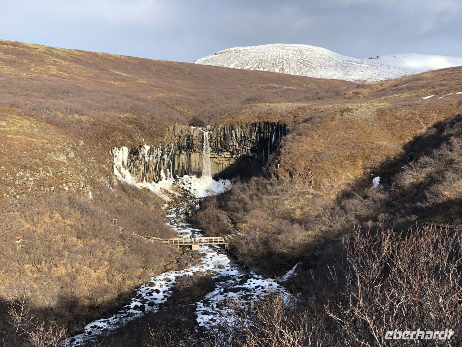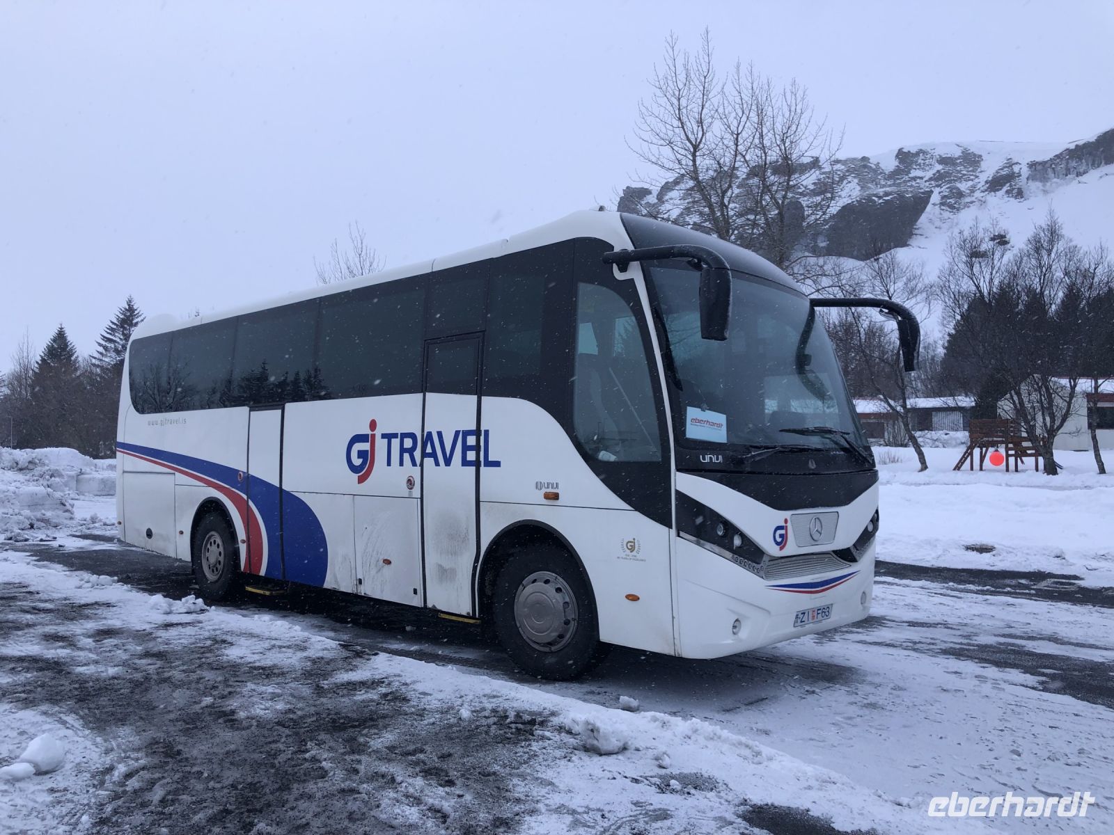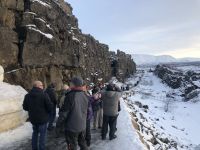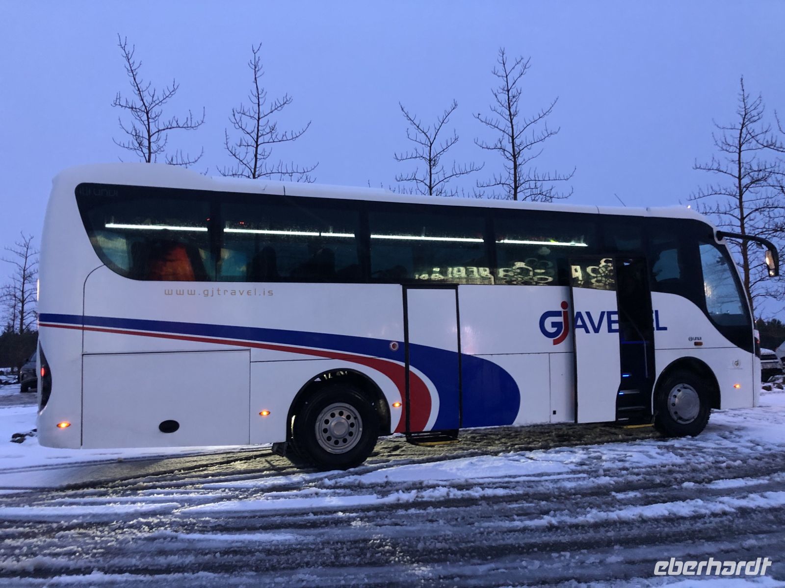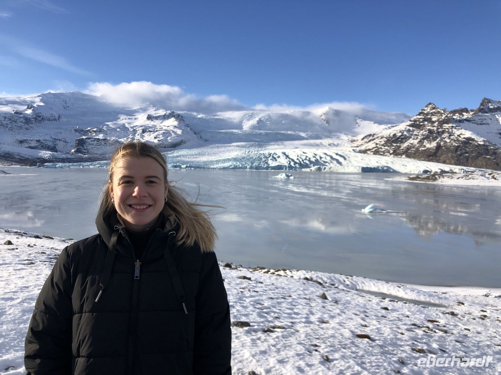 Der heutige Tag steht ganz im Zeichen der Gletscher. Die ca. 1-stündige Fahrt führt uns mit spektakulären Aussichten entlang des Vatnajökull Gletschers bis nach Skaftafell. Mal wieder meint es der Wettergott gut mit uns. In Skaftafell angekommen, gehen wir zunächst in das Infocenter und schauen uns einen Kurzfilm über die Schönheiten und Naturkatastrophen der Region an. Danach unternehmen wir eine kleine Wanderung hoch zum Skaftafell Wasserfall. Der Aufstieg bringt uns in einige Meter Höhe, doch wir werden mit tollen Blicken belohnt. Nach der Wanderung fahren wir zur bekannten Gletscherlagune Jökurlsarlon. Hier erblicken wir ein wahnsinniges Panorama - Schneebedeckte Berge im Hintergrund, danach folgt strahlenblaues Gletscherwasser und im Vordergrund kontrastiert der schwarze Sand. Hier werden wir auch von einer kleinen Robbe begrüßt, die in regelmäßigen Abständen immer mal wieder auftaucht. Trotz des Sonnenscheins ist es hier ganz schön windig - aber das macht uns nichts aus. Am Diamond Beach sind heute leider keine Gletscher gestrandet, aber trotzdem lohnt sich der Besuch. Anna hat noch einen Geheimtipp parat und da wir noch etwas Zeit haben, folgen wir Ihrem Tipp fernab der Touristenmassen und besuchen einen zugefrorenen Gletschersee. Ich merke schon beim Verfassen des Berichts, wie oft ich über die atemberaubenden Ausblicke und Landschaften schreibe, aber ich kann es einfach nicht oft genug wiederholen. Wer schonmal in Island war und dann noch mit so traumhaftem Wetter belohnt wird, kann es sicherlich nachvollziehen. Trotz des vereisten Weges kommen wir alle wieder heil beim Bus an und machen uns wieder auf den Rückweg. Wir treffen uns beim Abendessen wieder und werden zwischen dem Hauptgang und dem Dessert darauf aufmerksam gemacht, dass gerade ein Nordlicht am Himmel erscheint. Dass lassen wir uns natürlich nicht zwei Mal sagen und flitzen hinaus in die Dunkelheit – Das Dessert muss warten! Schon wieder haben wir Glück und sehen ein strahlend grünes, tanzendes Polarlicht. Natürlich haben wir alle unserer Handys und Kameras in der Hand, um das Naturspektakel festzuhalten und Gast aus unserer Gruppe macht sich den Spaß, uns dabei zu fotografieren, wie wir wie die Hühner an der Stange, voll fokussiert die Nordlichter einfangen wollen. Die Lichter schwinden langsam und wir können beruhigt zurück ins Restaurant gehen und unseren Käsekuchen genießen.