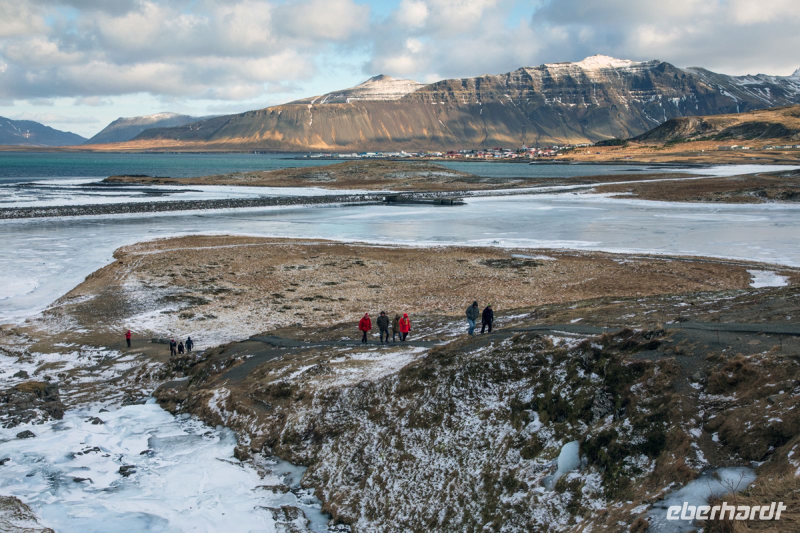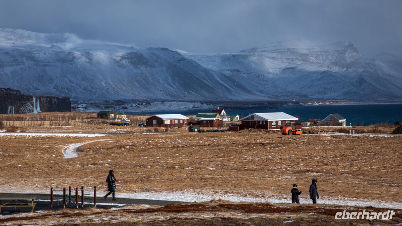 dem Airport von Reyjkavik, ca. 30km vom Ballungszentrum der Insel entfernt. Fast 70% der 370.000 Isländer leben hier. Eisiger Wind mit sonnigen Wetter erwartet uns. Die Frankfurter landen etwa 30 Minuten nach den Berlinern. Das Eberhardt Schild am Ausgang ist nicht zu übersehen und schnell sind wir vollständig. Im Anflug auf KEF ein Tipp: rechts sitzen auf den F- Fensterplätzen bringt einen tollen Blick auf die Insel im Anflug. Wir sehen die "Blaue Lagune" bereits rauchen, wo wir zum Ende der Reise unsere Erlebnis "gestressten" Körper erholen lassen. Die Boeing 737 Max 8 der Icelandair zieht trotz des heftigen Sturmes, in ruhiger Gelassenheit ihre Runde zur Landebahn. Unser Bus, welcher die Rundreise ebenso gut meistert, bringt die Gruppe zum Fosshotel Raudara direkt im Zentrum. Wir nutzen die Happy hour für einen Begrüßungsdrink an der Bar um uns etwas näher kennenzulernen. Danach sucht sich jeder ein gemütliches Restaurant für den ersten Abend, welche alle in fussläufiger Entfernung liegen. Im Hafen erscheinen trotz Beleuchtung die ersten Polarlichter. Auf dieser tollen Reise hat jeder, trotz straffen Programms um so viel wie möglich zu sehen in 8 Tagen, jeder Zeit für sich- die Fotografen tun es, ebenso wie alle Genießer. Dazu haben wir am ersten Tag eine Whattsup Gruppe eingerichtet um schnell Bilder auszutauschen.