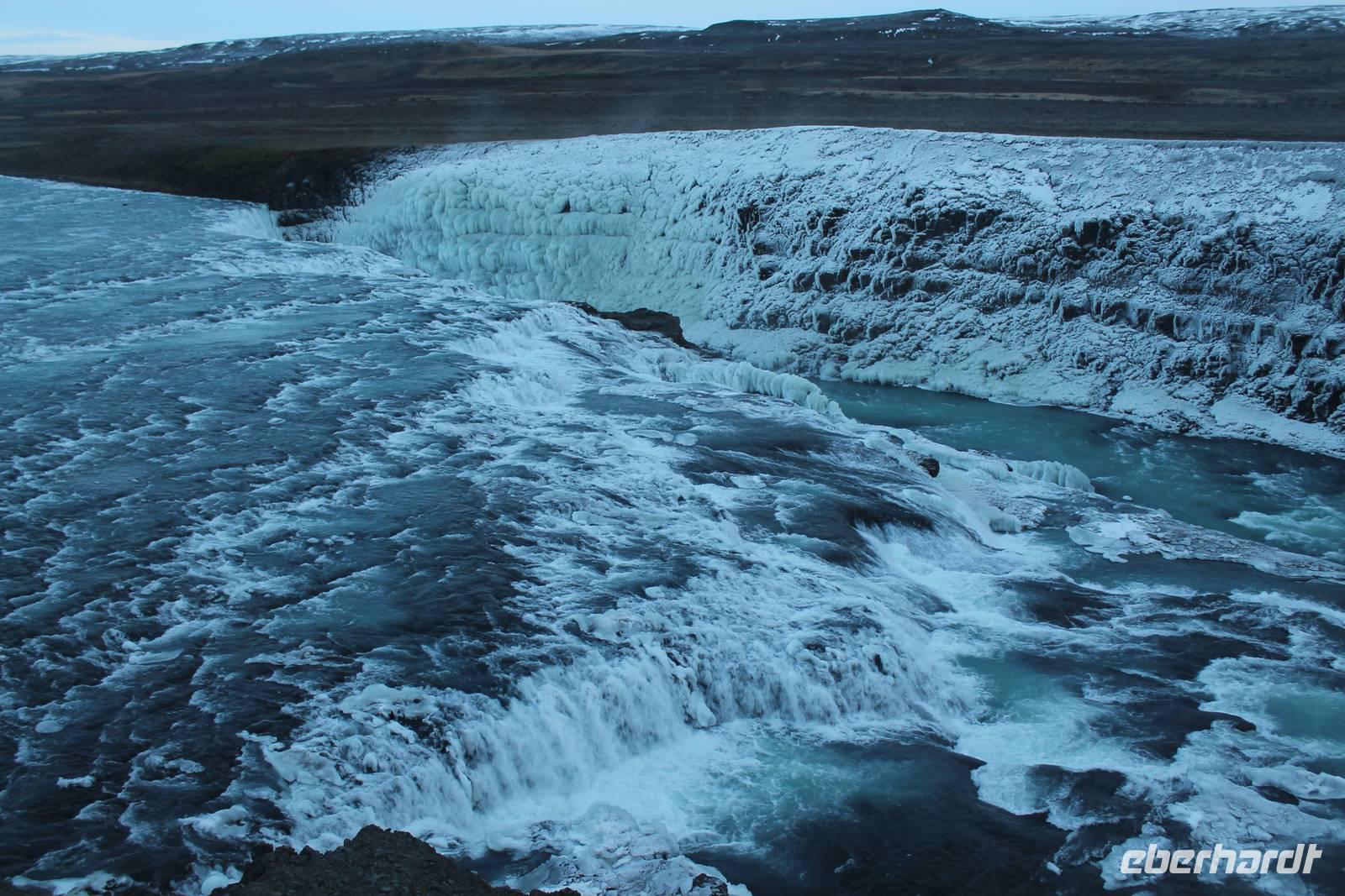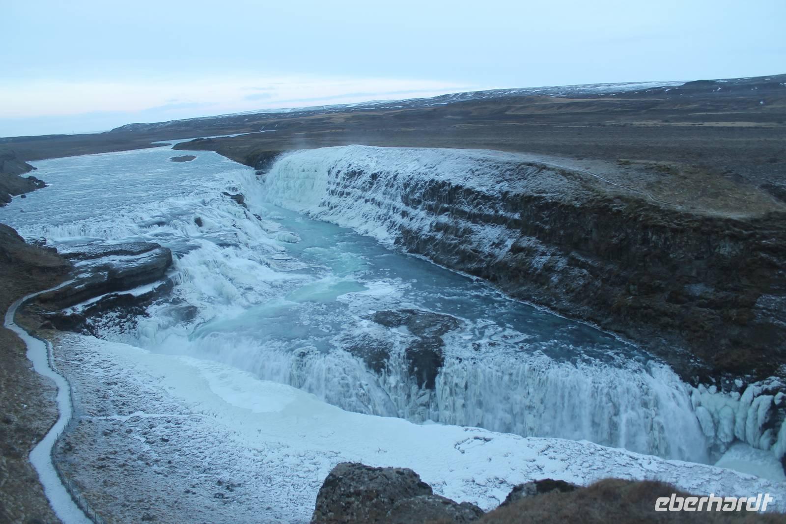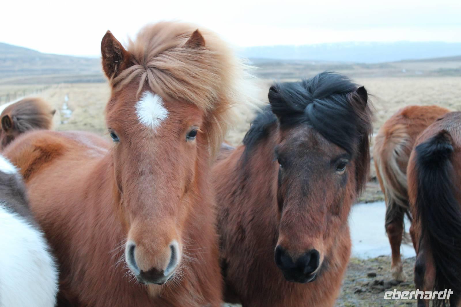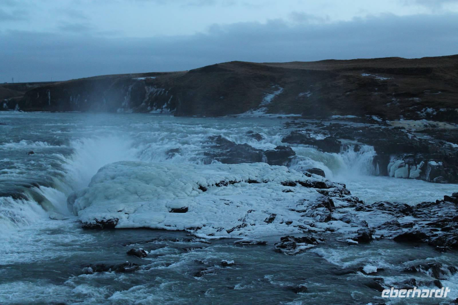 Noch nie sind wir so spät auf einer Eberhardt-Reise ins Tagesprogramm gestartet - Abfahrt 10.00 Uhr. Aber eher macht auch definitiv keinen Sinn, denn wir staunen alle über die Finsternis am Vormittag... Klar, von Dunkelheit ist immer die Rede, aber bei einem Sonnenaufgang um 11.15 Uhr haben wir wirklich in tiefster Finsternis gefrühstückt - übrigens ein super Buffett - und auch die Abfahrt erfolgte in Dunkelheit. Erste Station waren die Lava-Wasserfälle von Hraunfossar und der Barnafoss, der Kinder-Wasserfall. Hier im Bereich des Flusses Hvítá dringen lauter kleine Wasserquellen durch das Lava-Gestein und geben bei traumhaftem blauen Wasser - teils vereist, teils frei - ein wunderbares erstes Motiv unserer Island-Reise ab. Auch der tosende Barnafoss - der Legende nach ein Unglücksort, an dem zwei Kinder ertranken - fordert die ersten Fotos von uns. Nach den ersten Natureindrücken wartet Kultur auf uns. Wir besuchen den ehemaligen Bischofssitz Reykholt, im 13. Jahrhundert Heimat des berühmtesten isländischen Schriftstellers und Politikers Snorri Sturluson. Er verfasste die berühmte Snorri-Edda und galt zu der Zeit als angesehenster Dichter in Skandinavien. Wir sehen Snorris Sitzbad, ein von Gustav Vigeland geschaffenes Denkmal, das Grab und besuchen die alte Kirche des Ortes. Hier überrascht uns unser lebender Snorri mit einem Ständchen in der Kirche. Eine alte isländische Volksweise von einem ehemaligen Chorsänger dargeboten, passt in dem Moment hervorragend zur Stimmung. Anschließend geht es weiter zu Deildartunguhver, der wasserreichsten Thermalquelle Europas. Hier strömen jede Sekunde 180 Liter 100 Grad heißes Wasser an die Oberfläche, was für die Versorgung der Orte Akranes, Borgarnes und Hvanneyri mit warmem Wasser genutzt wird. Inzwischen haben wir den höchsten Stand der Sonne und langsam geht es bereits wieder in Richtung Dämmerung. Wenigstens blieben wir bisher von Niederschlag verschont, aber die Ausläufer des extremen Sturmgebiets merken auch wir. Bevor wir unsere Mittagspause in Borgarnes verbringen, stoppen wir noch für ein paar Fotos von recht zutraulichen Island-Pferden, die übrigens den gesamten Winter im Freien verbringen. Für den Nachmittag steht Wahl-Programm an: Freizeit im Hotel, Besuch eines sehr gelungenen Heimatmuseums zur Besiedlung Islands und der berühmten Egils-Saga oder schwimmen mit Snorri im öffentlichen FREIbad. Richtig gelesen, FREIbad. Das bedeutet viel Aufenthalt in den heißen Bassins und schnelle Spurts im Freien... Am Abend erwartet uns dann wieder ein leckeres Menü mit Lachsforelle, Hühnchen und Käsekuchen.