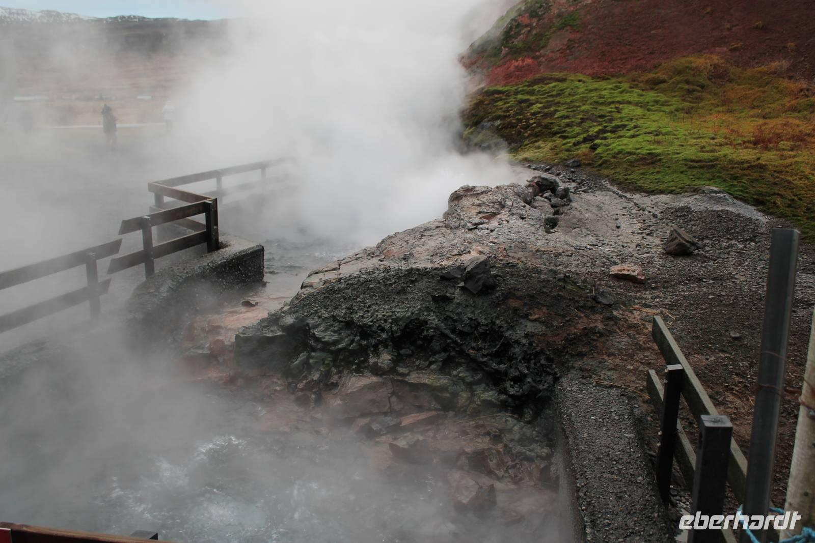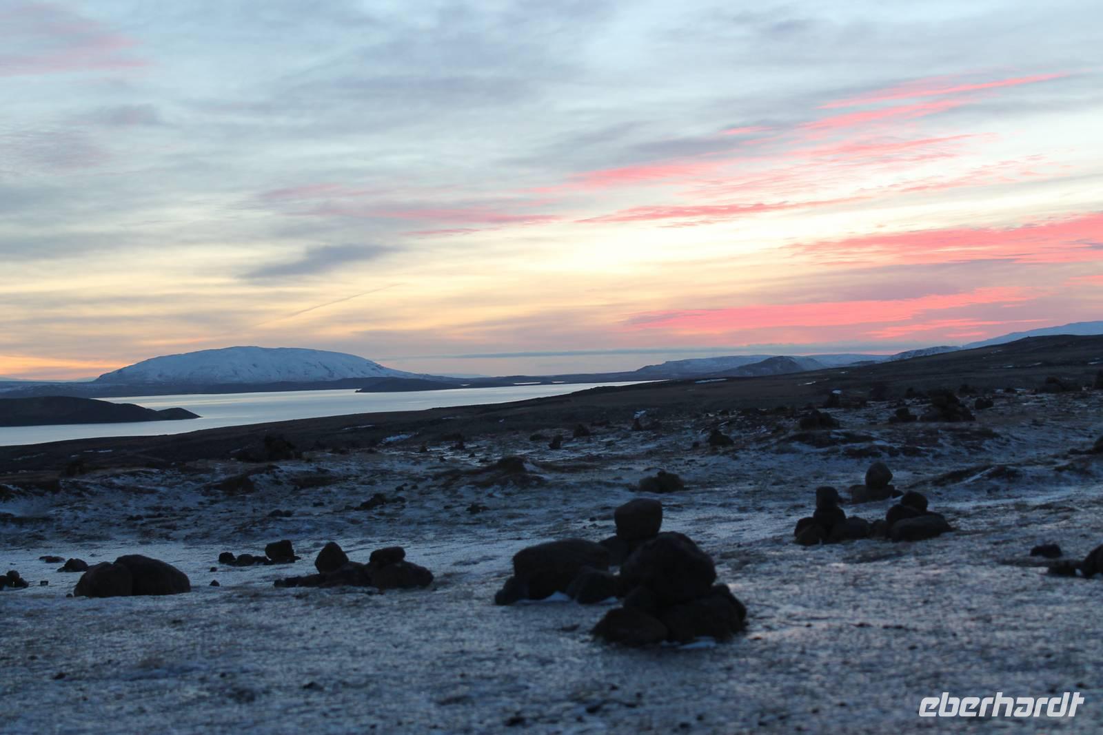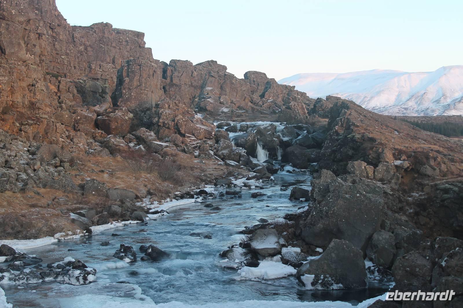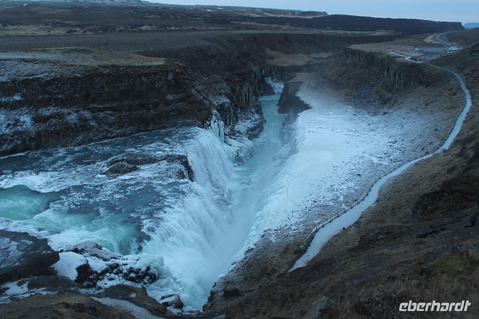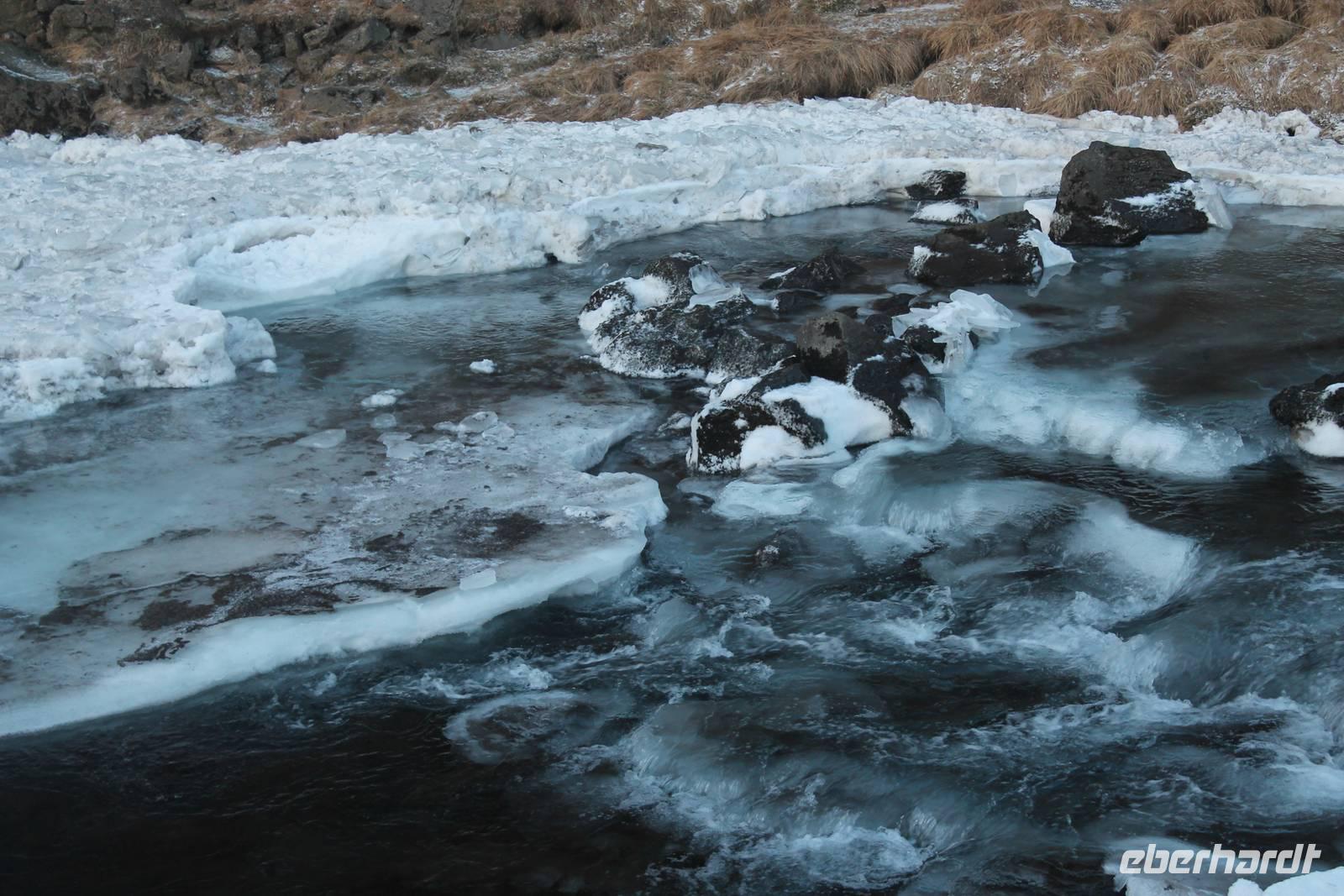 Noch nie sind wir so spät auf einer Eberhardt-Reise ins Tagesprogramm gestartet - Abfahrt 10.00 Uhr. Aber eher macht auch definitiv keinen Sinn, denn wir staunen alle über die Finsternis am Vormittag... Klar, von Dunkelheit ist immer die Rede, aber bei einem Sonnenaufgang um 11.15 Uhr haben wir wirklich in tiefster Finsternis gefrühstückt - übrigens ein super Buffett - und auch die Abfahrt erfolgte in Dunkelheit. Erste Station waren die Lava-Wasserfälle von Hraunfossar und der Barnafoss, der Kinder-Wasserfall. Hier im Bereich des Flusses Hvítá dringen lauter kleine Wasserquellen durch das Lava-Gestein und geben bei traumhaftem blauen Wasser - teils vereist, teils frei - ein wunderbares erstes Motiv unserer Island-Reise ab. Auch der tosende Barnafoss - der Legende nach ein Unglücksort, an dem zwei Kinder ertranken - fordert die ersten Fotos von uns. Nach den ersten Natureindrücken wartet Kultur auf uns. Wir besuchen den ehemaligen Bischofssitz Reykholt, im 13. Jahrhundert Heimat des berühmtesten isländischen Schriftstellers und Politikers Snorri Sturluson. Er verfasste die berühmte Snorri-Edda und galt zu der Zeit als angesehenster Dichter in Skandinavien. Wir sehen Snorris Sitzbad, ein von Gustav Vigeland geschaffenes Denkmal, das Grab und besuchen die alte Kirche des Ortes. Hier überrascht uns unser lebender Snorri mit einem Ständchen in der Kirche. Eine alte isländische Volksweise von einem ehemaligen Chorsänger dargeboten, passt in dem Moment hervorragend zur Stimmung. Anschließend geht es weiter zu Deildartunguhver, der wasserreichsten Thermalquelle Europas. Hier strömen jede Sekunde 180 Liter 100 Grad heißes Wasser an die Oberfläche, was für die Versorgung der Orte Akranes, Borgarnes und Hvanneyri mit warmem Wasser genutzt wird. Inzwischen haben wir den höchsten Stand der Sonne und langsam geht es bereits wieder in Richtung Dämmerung. Wenigstens blieben wir bisher von Niederschlag verschont, aber die Ausläufer des extremen Sturmgebiets merken auch wir. Bevor wir unsere Mittagspause in Borgarnes verbringen, stoppen wir noch für ein paar Fotos von recht zutraulichen Island-Pferden, die übrigens den gesamten Winter im Freien verbringen. Für den Nachmittag steht Wahl-Programm an: Freizeit im Hotel, Besuch eines sehr gelungenen Heimatmuseums zur Besiedlung Islands und der berühmten Egils-Saga oder schwimmen mit Snorri im öffentlichen FREIbad. Richtig gelesen, FREIbad. Das bedeutet viel Aufenthalt in den heißen Bassins und schnelle Spurts im Freien... Am Abend erwartet uns dann wieder ein leckeres Menü mit Lachsforelle, Hühnchen und Käsekuchen.