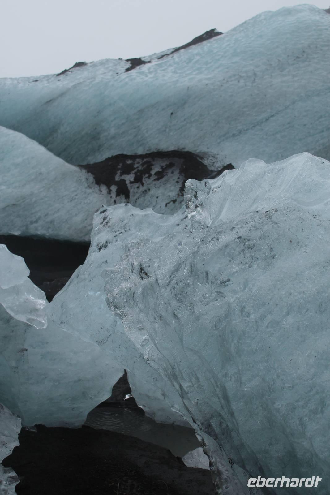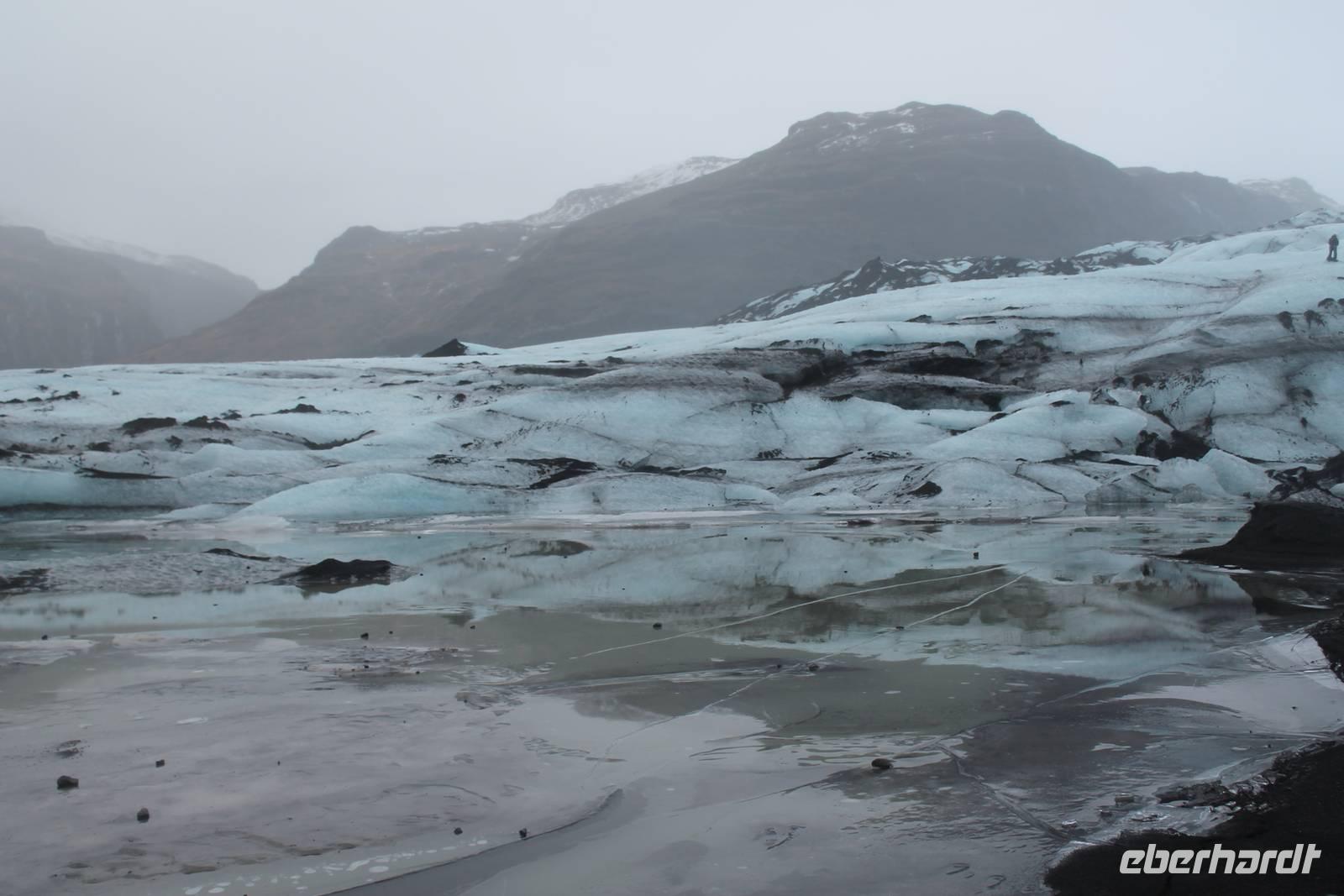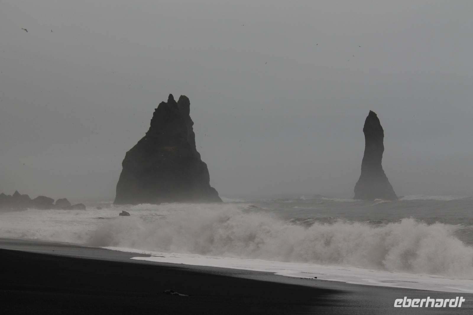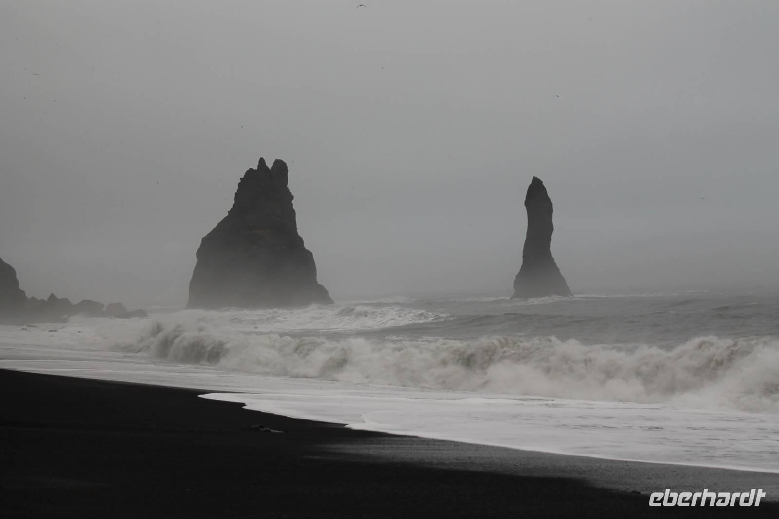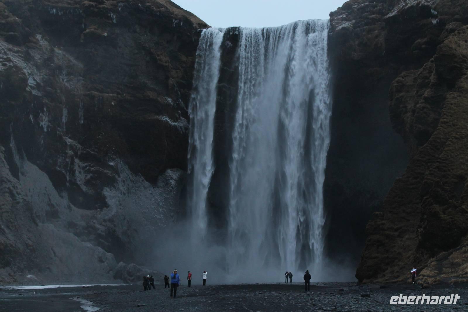 Nach dem Frühstück starten wir heute unser Abenteuer Südküste. Wasserfälle, Gletscher, Vulkanfelder erwarten uns. Kurz nach dem Start erreichen wir schon den ersten sehenswerten Wasserfall, den Seljalandsfoss. Das besondere hier ist ein Weg, auf dem man hinter dem Wasserfall lang gehen kann. Dieser ist aber wegen der starken Vereisung in den Wintermonaten gesperrt. Apropos Vereisung: direkt am Ausfluss des Wasserfalls steht am Vormittag auch die auf meinen Reisen obligatorische Wasser-Challenge an. Dabei wird zumindest mit den Füßen ein eiskaltes Gewässer getestet. Tilo und Steffen sind dabei und so holen wir uns im ca. 5 Grad kalten Wasser richtige Eisfüße. Weiter geht's zum nächsten Wasserfall, dem 62 Meter hohen Skogarfoss. Wir fahren heute im Schatten des inzwischen berühmten Bergmassivs Eyafjall. Der gleichnamige Vulkan Eyafjallajökull (sprich: Eja-Fjattla-Jökuttl) legte 2010 im April weltweit den Flugverkehr nach seinem Ascheausbruch lahm. Wir aber wollen ein weiteres isländisches Naturphänomen kennenlernen und so bringt uns Snorri als Überraschung außerhalb des Programms an den Sólheimajökull. Wir laufen bis an die Gletscherzunge hinan und können neben beeindruckenden Bildern auch ein paar Gehversuche auf einem Gletscher unternehmen. Sehr beeindruckend so nah an den Eismassen zu stehen. Einige Tagesausflügler aus Reykjavik scheinen auch unseren Besichtigungsplan zu haben und so versuchen wir immer vor denen an den Stationen zu sein - die nächste heißt Mittagessen und Souvenirkauf in Vík, dem südlichsten Dorf Islands. Inzwischen begleitet uns bei höheren Temperaturen als die letzten Tage ein unangenehmer Nieselregen. Nach der Mittagspause fahren wir an den Vulkanstrand von Reynarhvis. Hier toben die Wellen und brechen atemberaubend an den tief schwarzen Strand. Einige Fotografen müssen auch die Beine in die Hand nehmen, um den Ausläufern zu entkommen. Fast allen gelingt das... Die faszinierenden Basaltsäulen und die Felsnadeln Reynisdrangar, die mystisch im Nebel liegen, ziehen uns in ihren Bann, nur das Felsenloch am Cap Dyrholaey bekommen wir nicht zu Gesicht. Nach diesem erfrischenden Stopp geht es bereits wieder in Richtung Hotel zurück und wir stoppen unterwegs nochmals in Skogar, wo wir das fantastische Heimatmuseum besuchen. Hier hat der inzwischen fast 92-jährige Thordur Tomasson seit seinem 14. Lebensjahr Gegenstände des isländischen Lebens gesammelt und in einem Museum ausgestellt. Der Gründer selbst spielt uns eine kleine Weise auf einem uralten isländischen Instrument, während uns Emma charmant und kurzweilig verschiedenste Exponate erklärt. Die Zeit ist etwas kurz um alles genau zu betrachten, aber einen sehr guten Eindruck des damaligen Lebens erhalten wir trotzdem. Zum Abschluss des heutigen Tages lade ich alle Gäste noch zu einem Besuch im Besucherzentrum von Thorvaldseyri ein. Hier erfährt man Wissenswertes zum Vulkanausbruch des Eyafjallajökull am Beispiel einer Landwirtfamilie, die bei der Katastrophe beinahe ihre gesamte Existenz verloren hätte, inzwischen aber wieder anbaut und erntet. Ein sehr interessanter Film untermalt das Ganze. Inzwischen ist es auch wieder stockfinster und wir fahren zurück ins Hotel, wo einige zum letzten Mal den Hot Tub nutzen und alle ein 3-Gänge-Menü (Pilzsuppe, Lachs und Skyrdessert) genießen. Mit den Nordlichtern wird es wohl dieses Jahr nichts mehr werden, auch wenn wir uns wieder auf die Liste für's Wecken in der Nacht bei eventuellen Aktionen setzen lassen. Das Wetter spielt einfach nicht mit, zu viel Bewölkung...